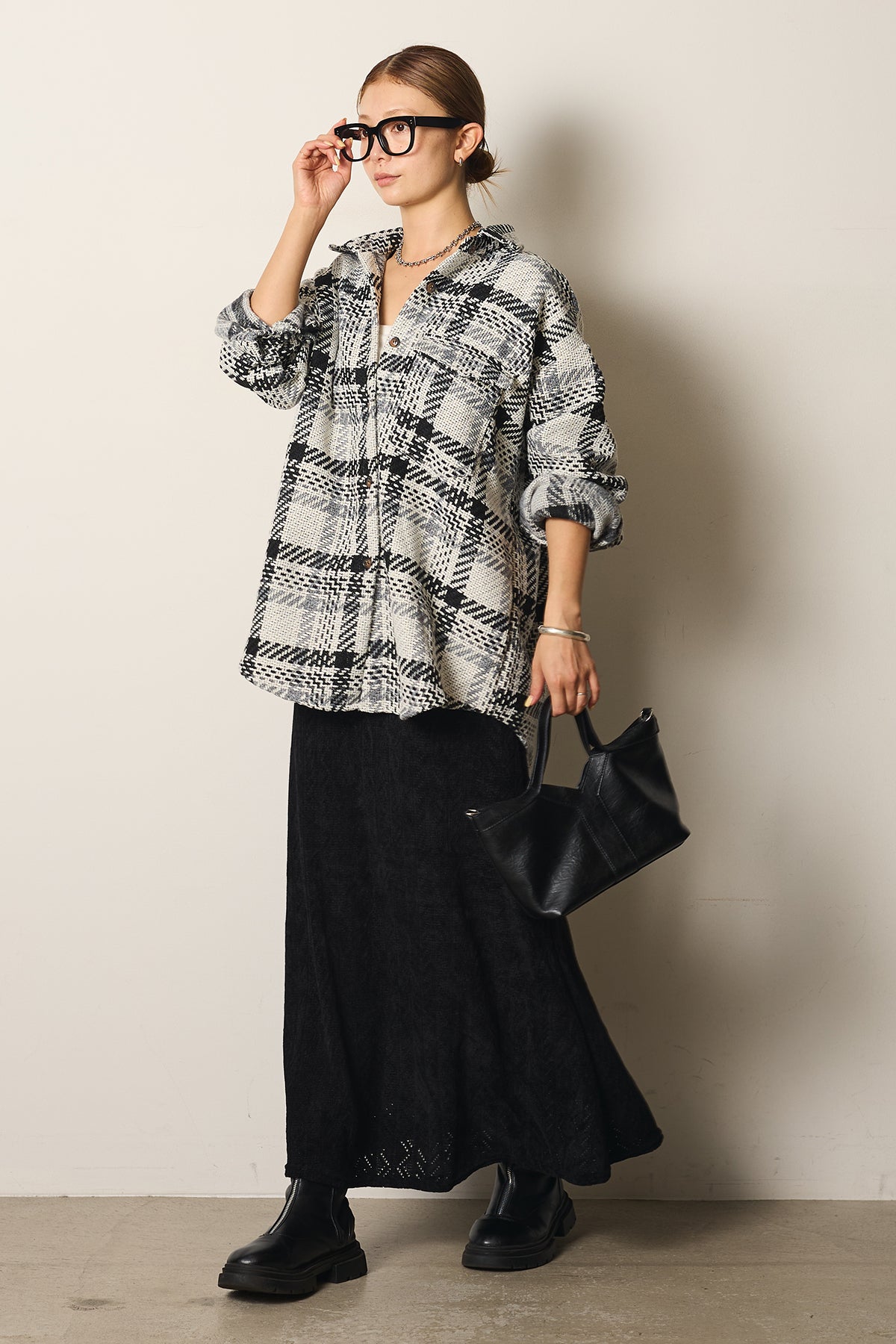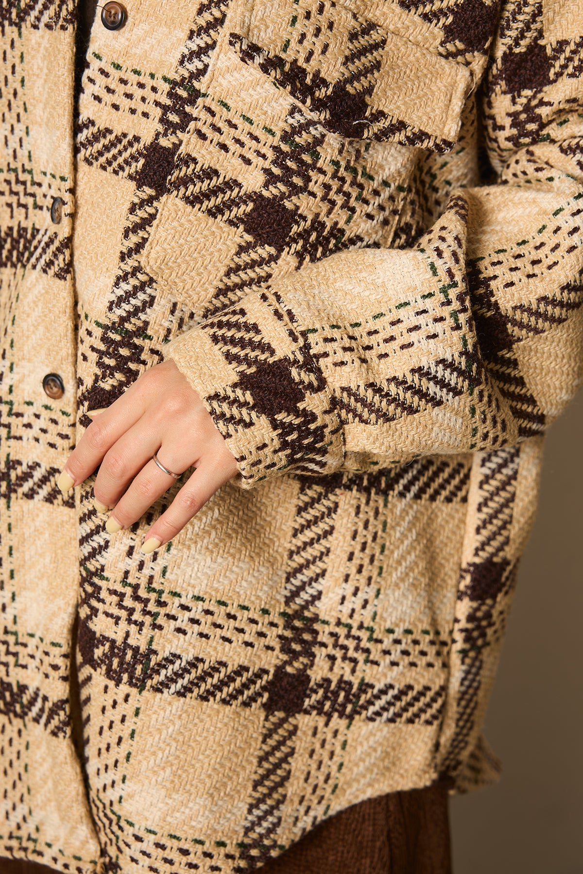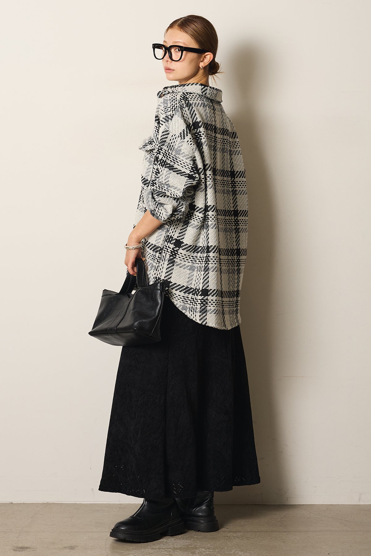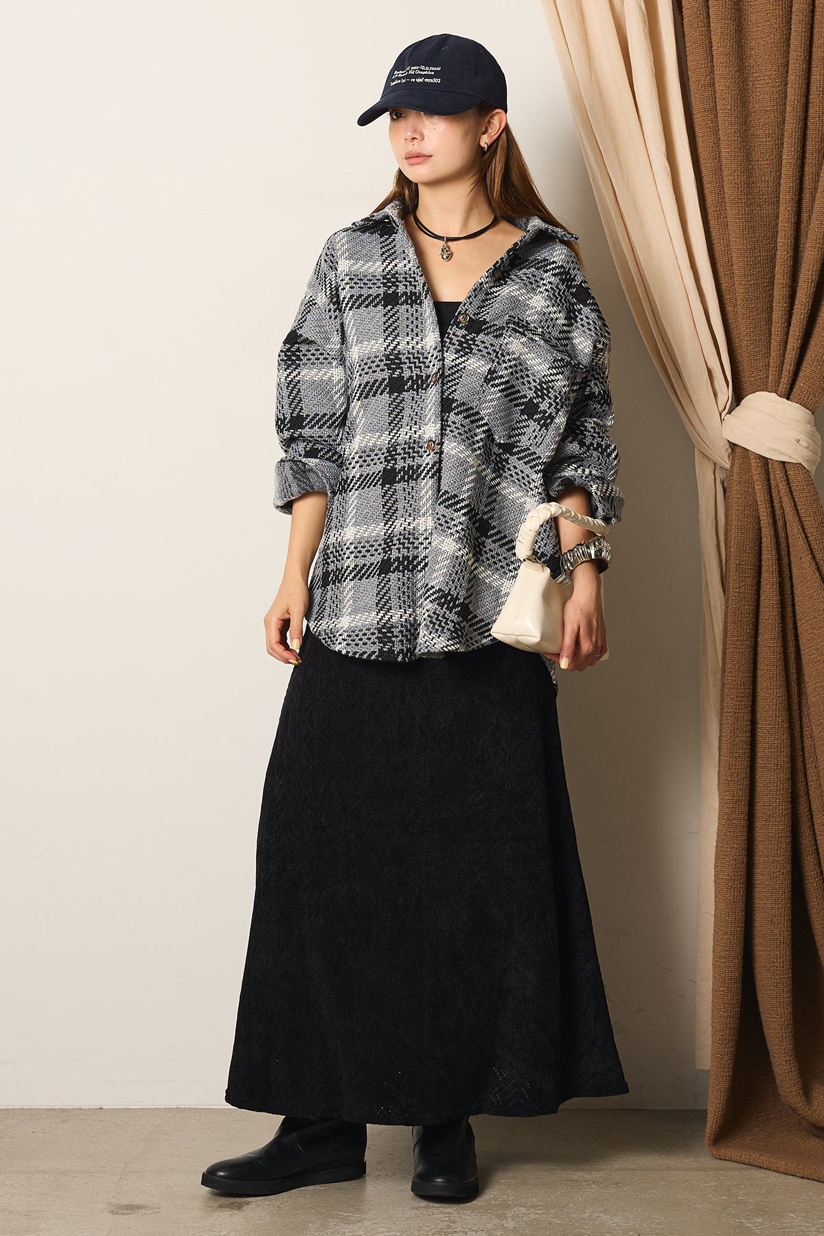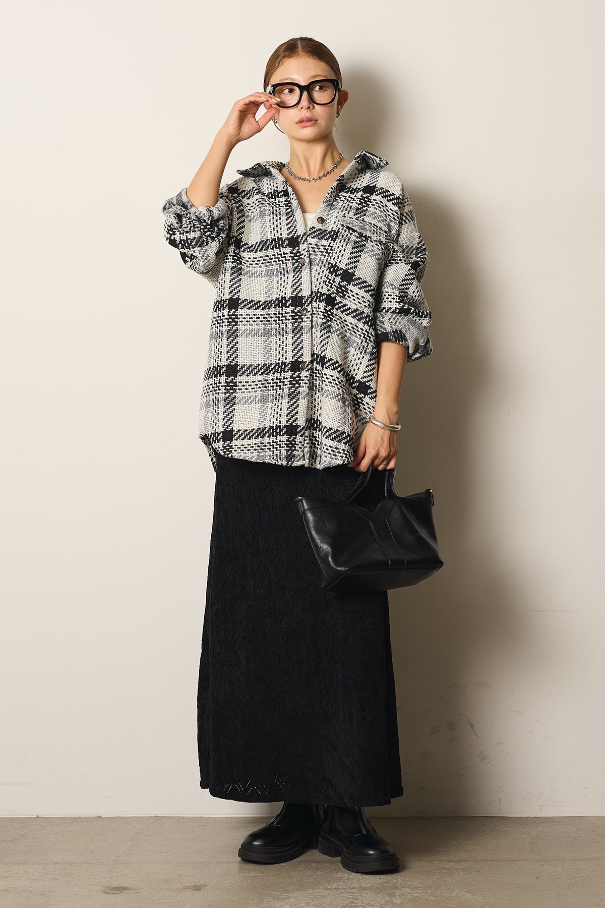 存在感のあるチェック柄が目を引くツイードジャケット。起毛感のある柔らかな風合いで、シーズンらしい温もりをプラスします。ゆとりのあるシルエットに大きめのポケットをあしらい、実用性とデザイン性を兼ね備えた一枚。羽織るだけでコーディネートが華やぐアイテムです。
