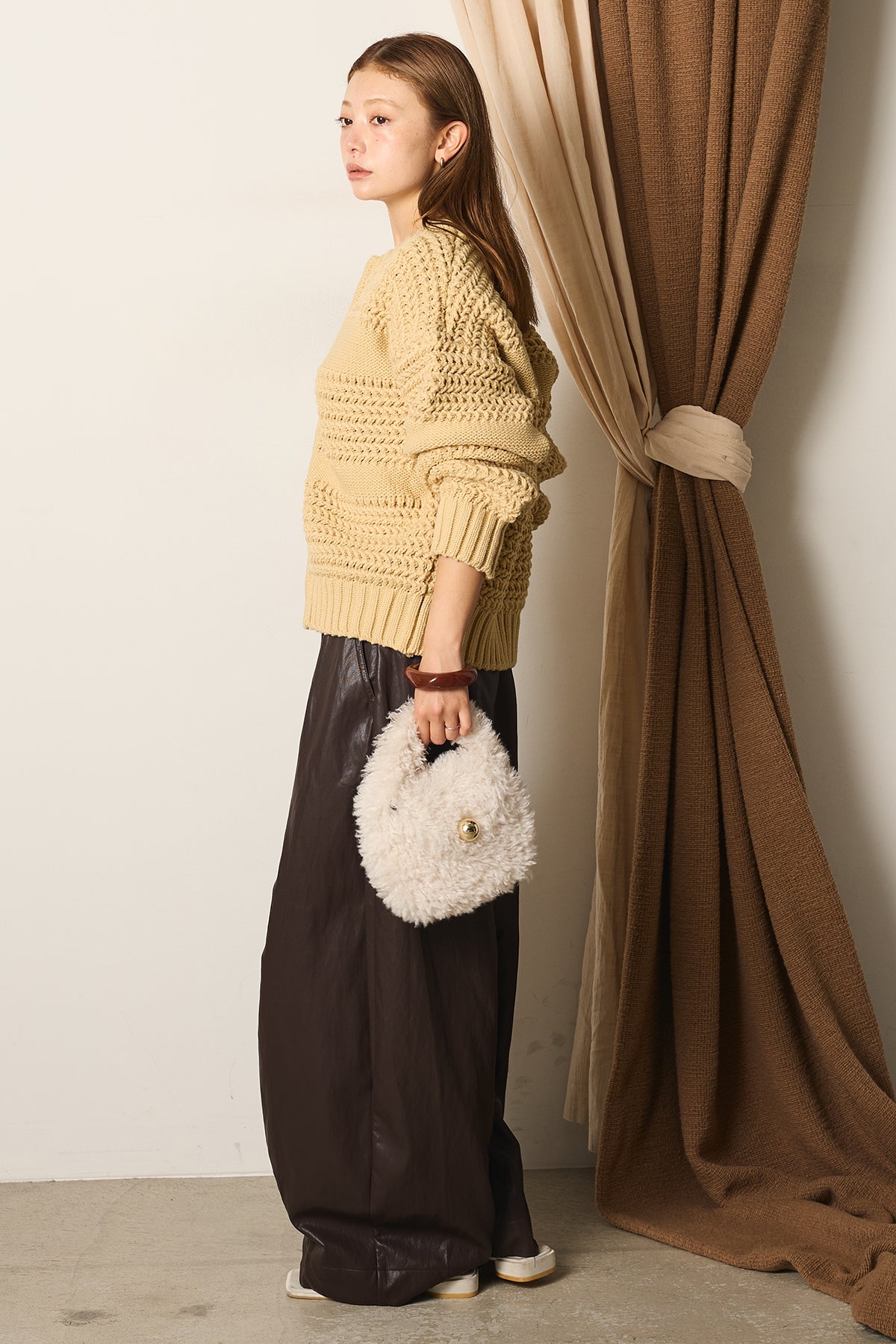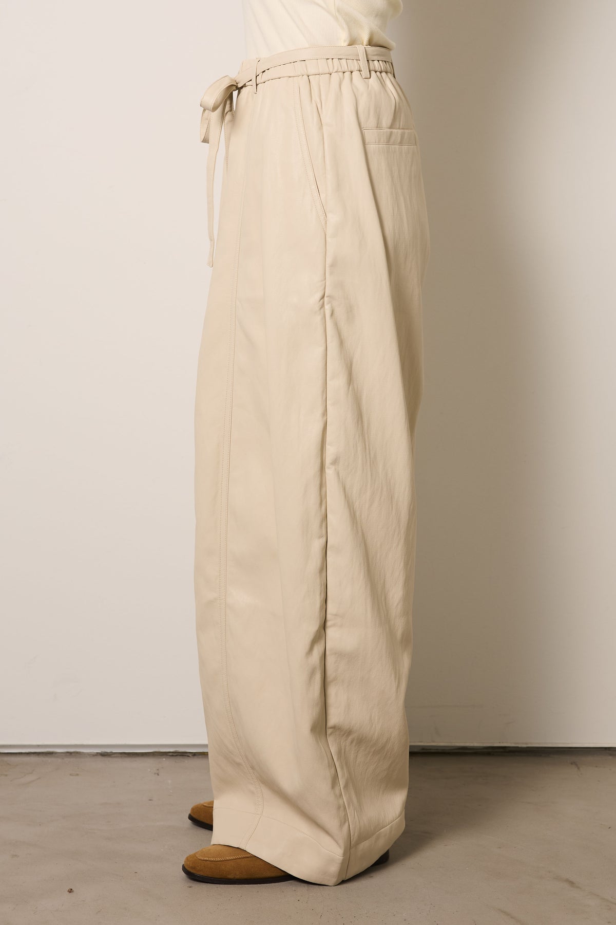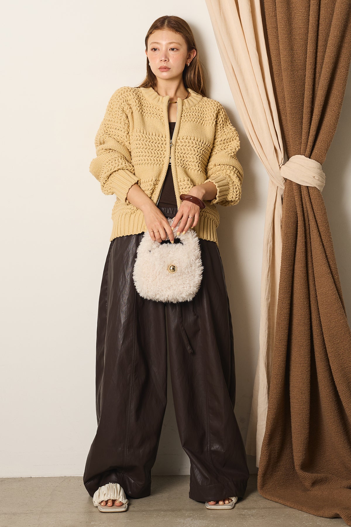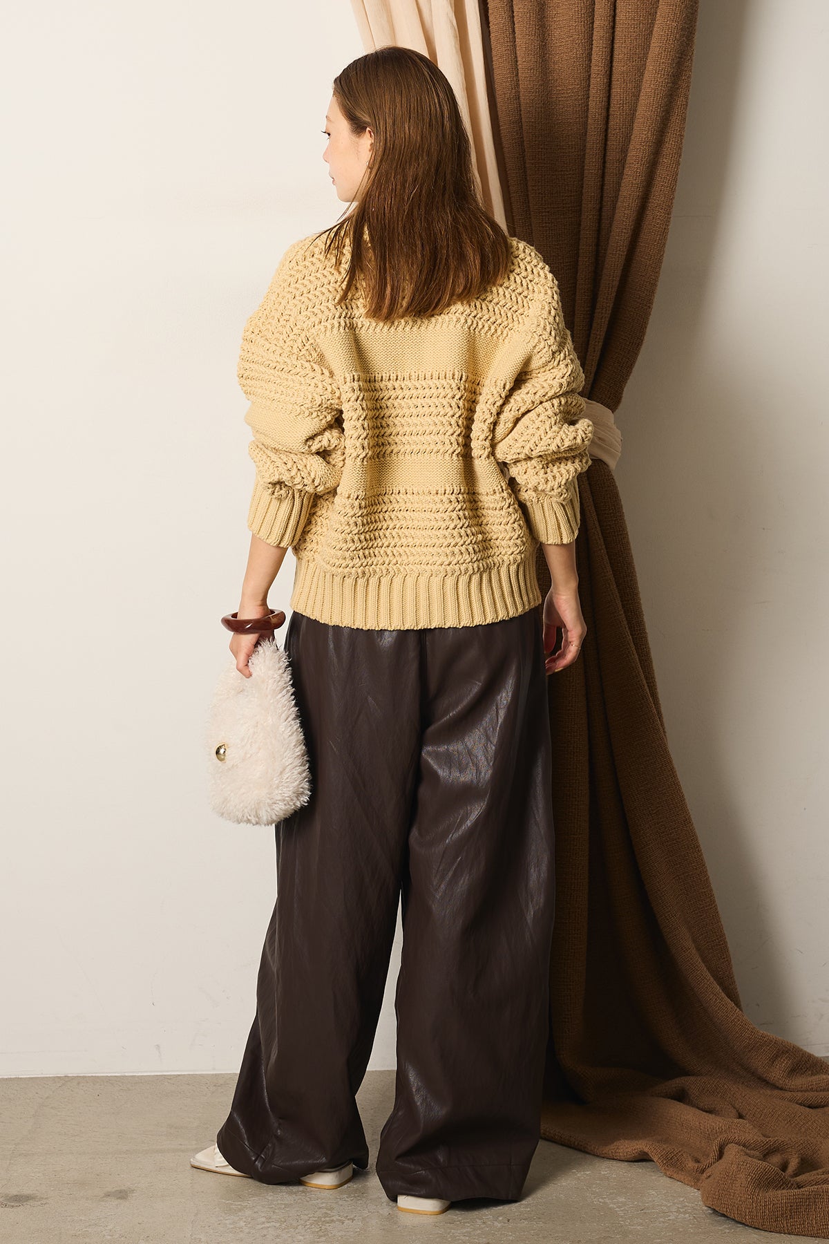 艶感のあるフェイクレザーで仕上げたカーブワイドパンツ。ゆとりのあるシルエットに丸みを持たせたデザインが、モードな雰囲気を漂わせます。ウエストはゴム仕様でリラックスした穿き心地ながら、コーディネートに取り入れるだけで存在感のあるスタイルが完成する一本です。