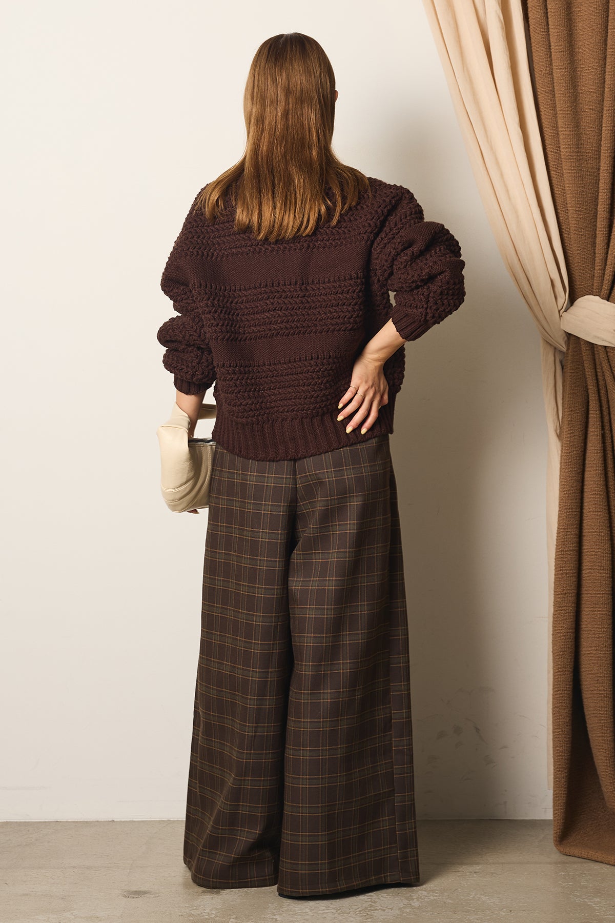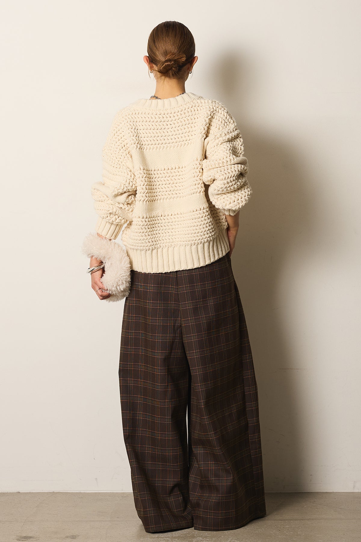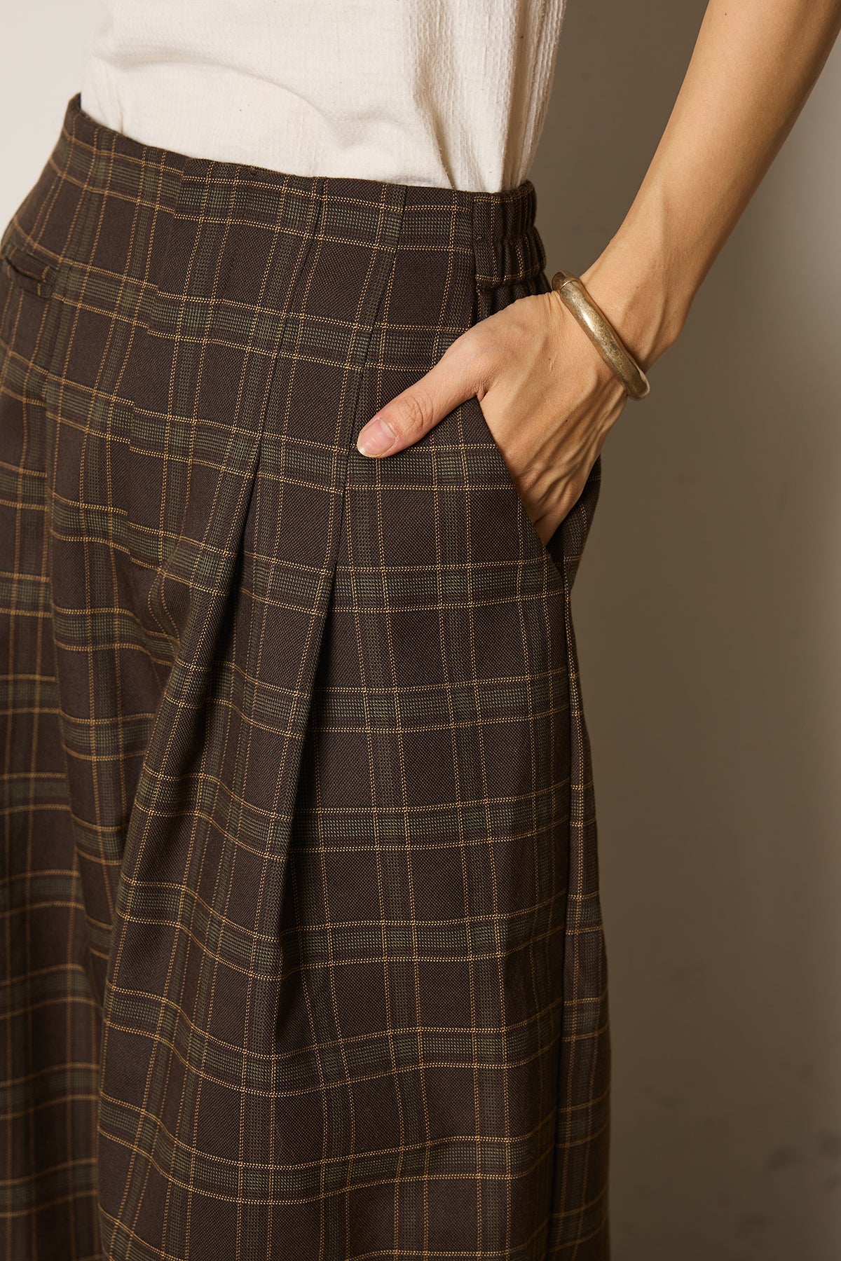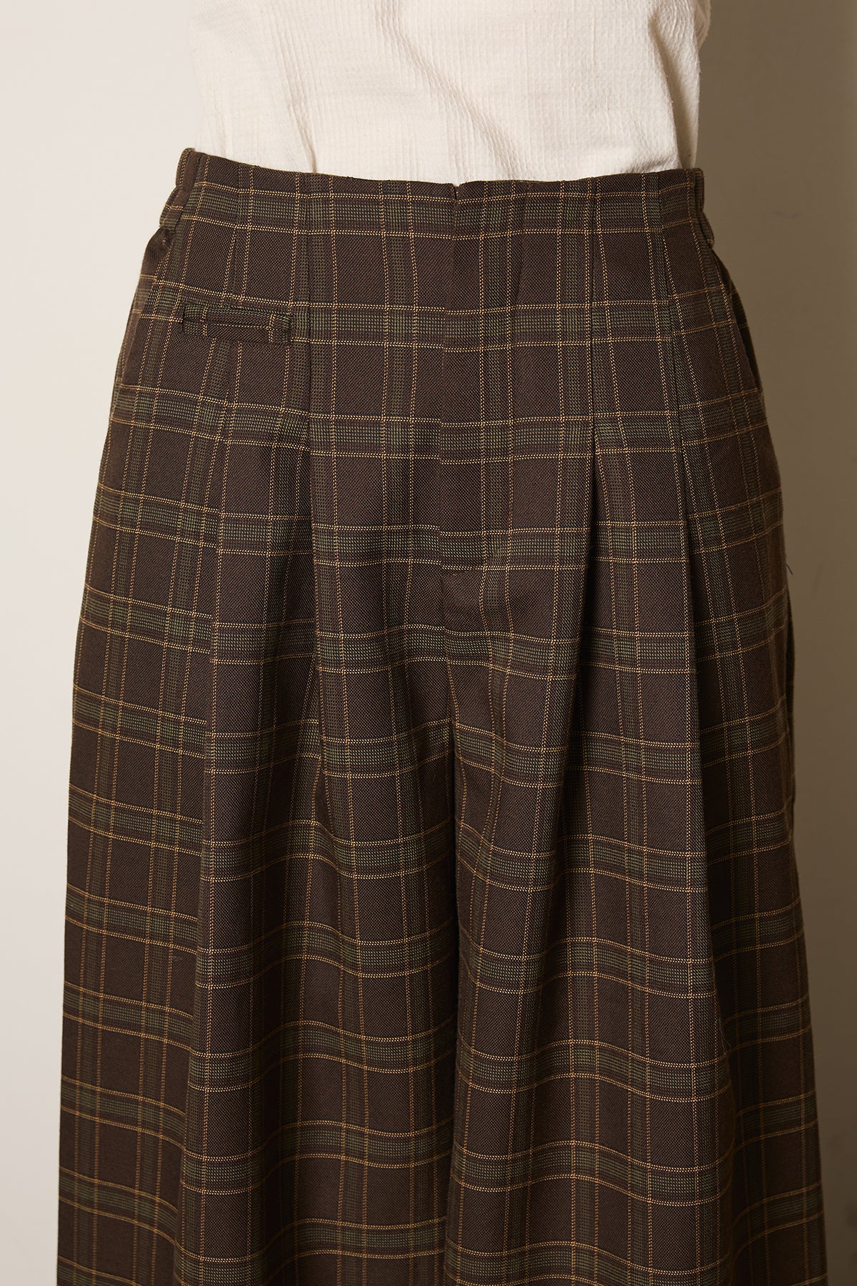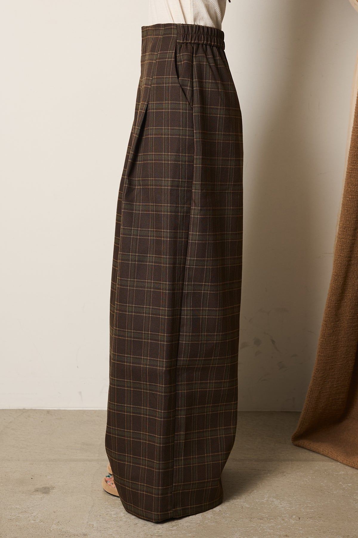 落ち着いた色味のタータンチェックが印象的なくすみワイドパンツ。深めのタックが立体感を生み、動きに合わせて美しいシルエットを描きます。ゆとりのある履き心地ながらも上品さを備え、シンプルなトップスを合わせるだけでシーズンムード漂うスタイルが完成する一本です。