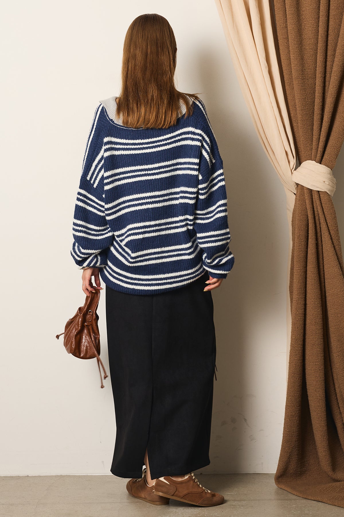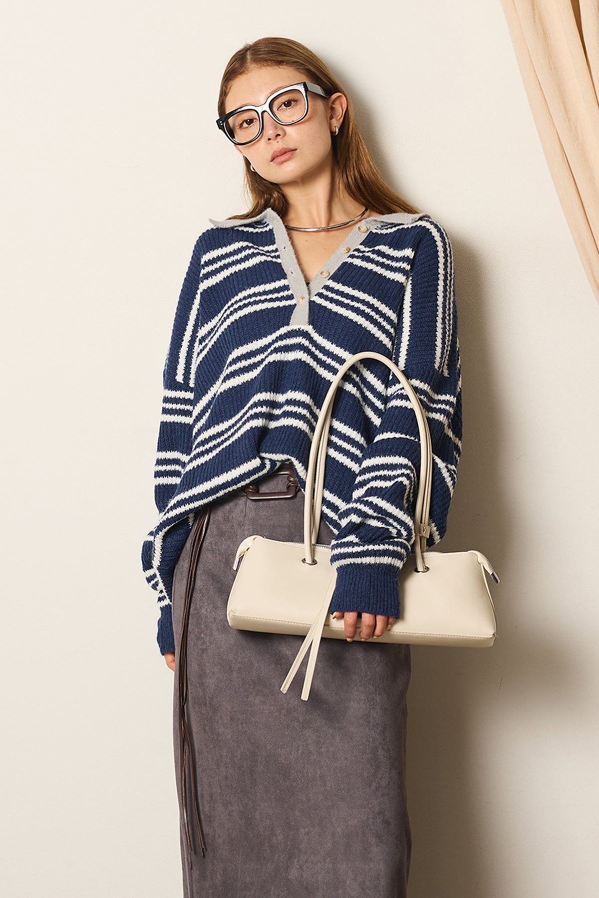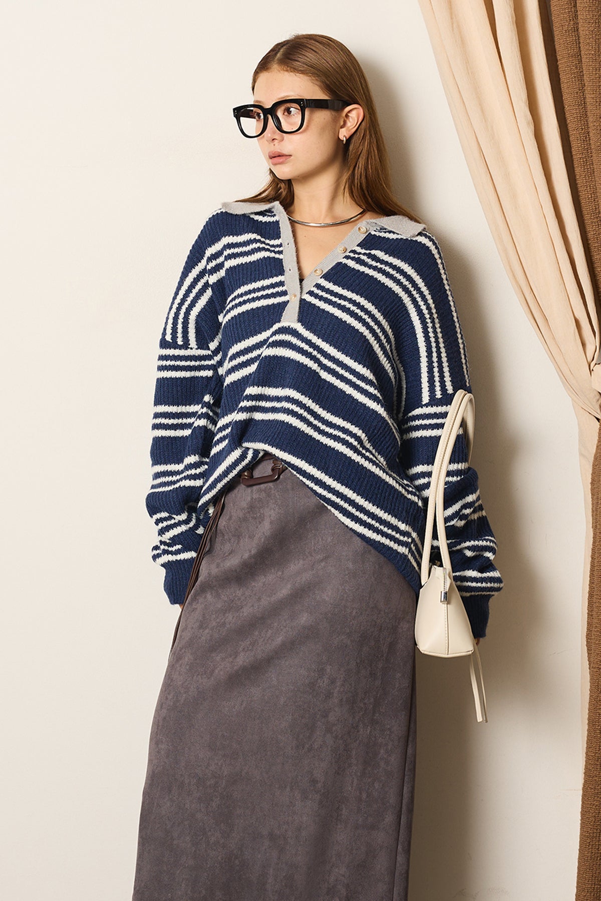 大胆なマルチボーダーが目を引くニットポロトップス。ほどよい深さのネックラインが抜け感を与え、ゆとりのあるシルエットでリラックス感のある着こなしを叶えます。カジュアルな中にも洗練された雰囲気が漂い、デニムからスカートまで幅広いスタイリングに活躍する一枚です。