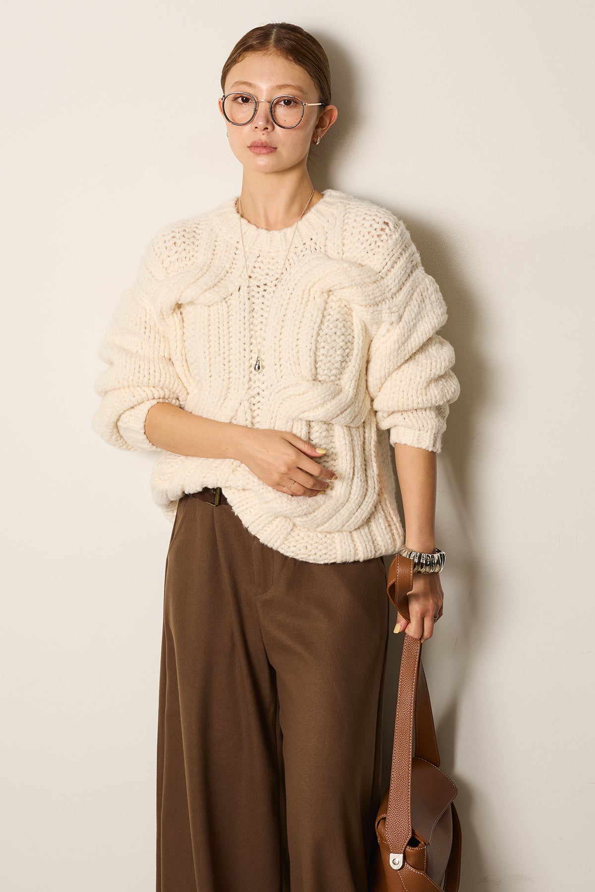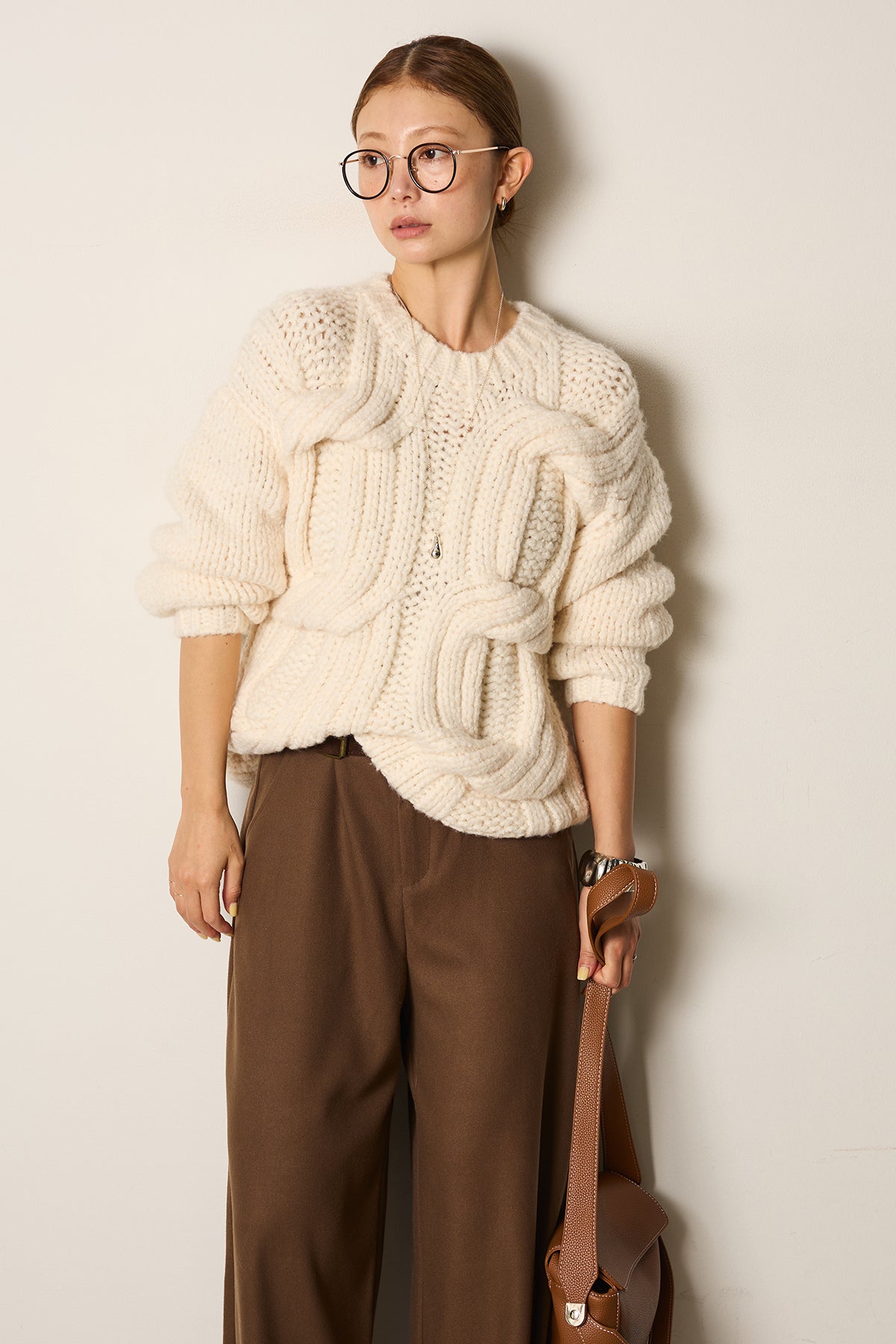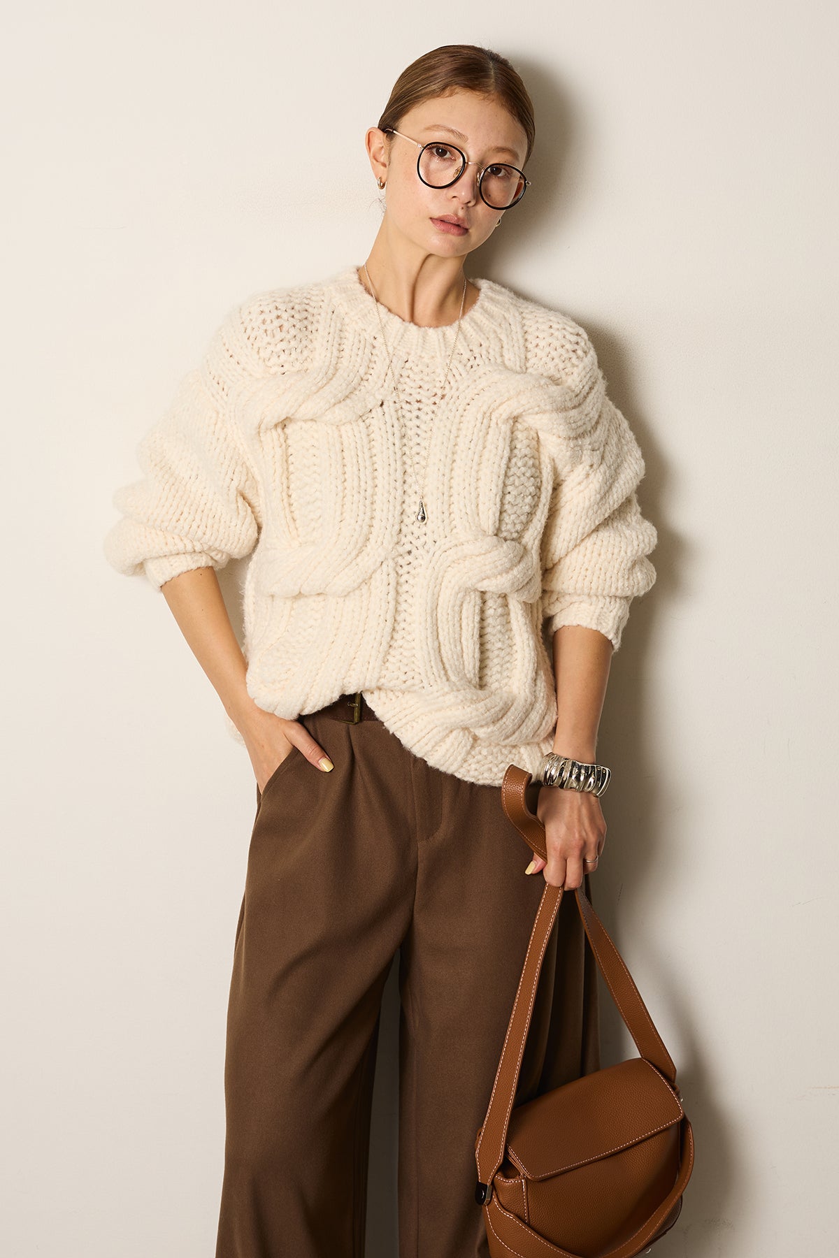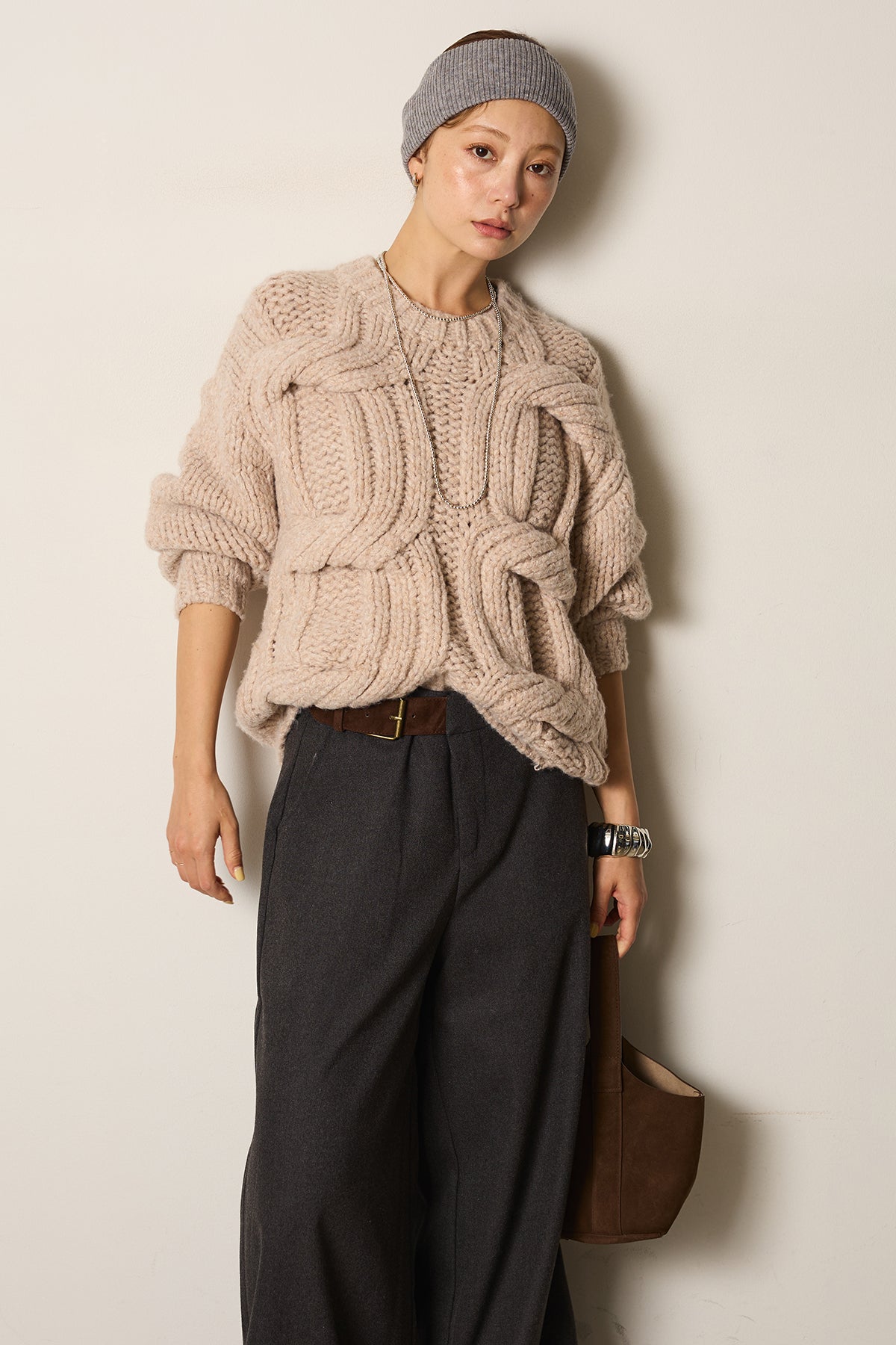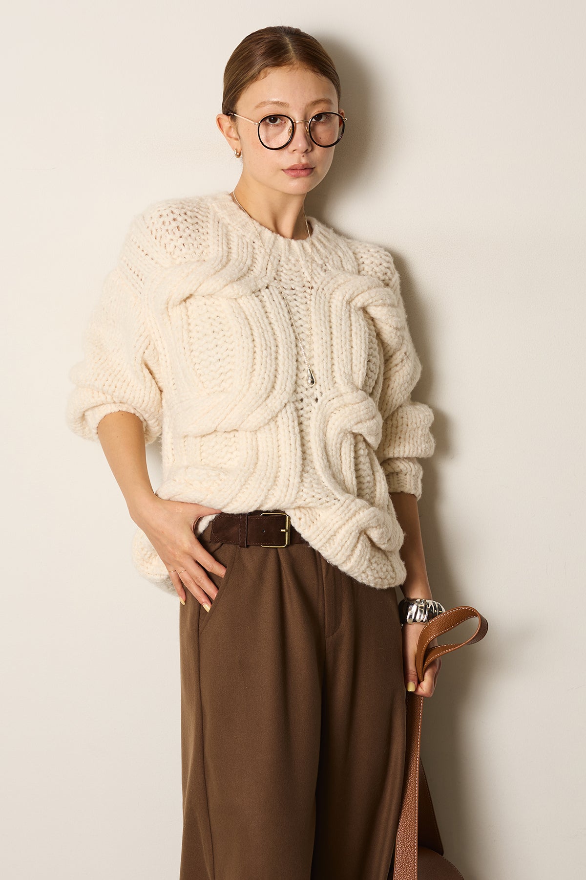存在感のある立体的なケーブル編みが特徴のニットトップス。ふんわりとしたボリューム感がシーズンムードを高め、シンプルなスタイリングに加えるだけで華やかな印象に。柔らかな素材で着心地も良く、デイリーから冬のお出かけまで幅広く活躍する一枚です。