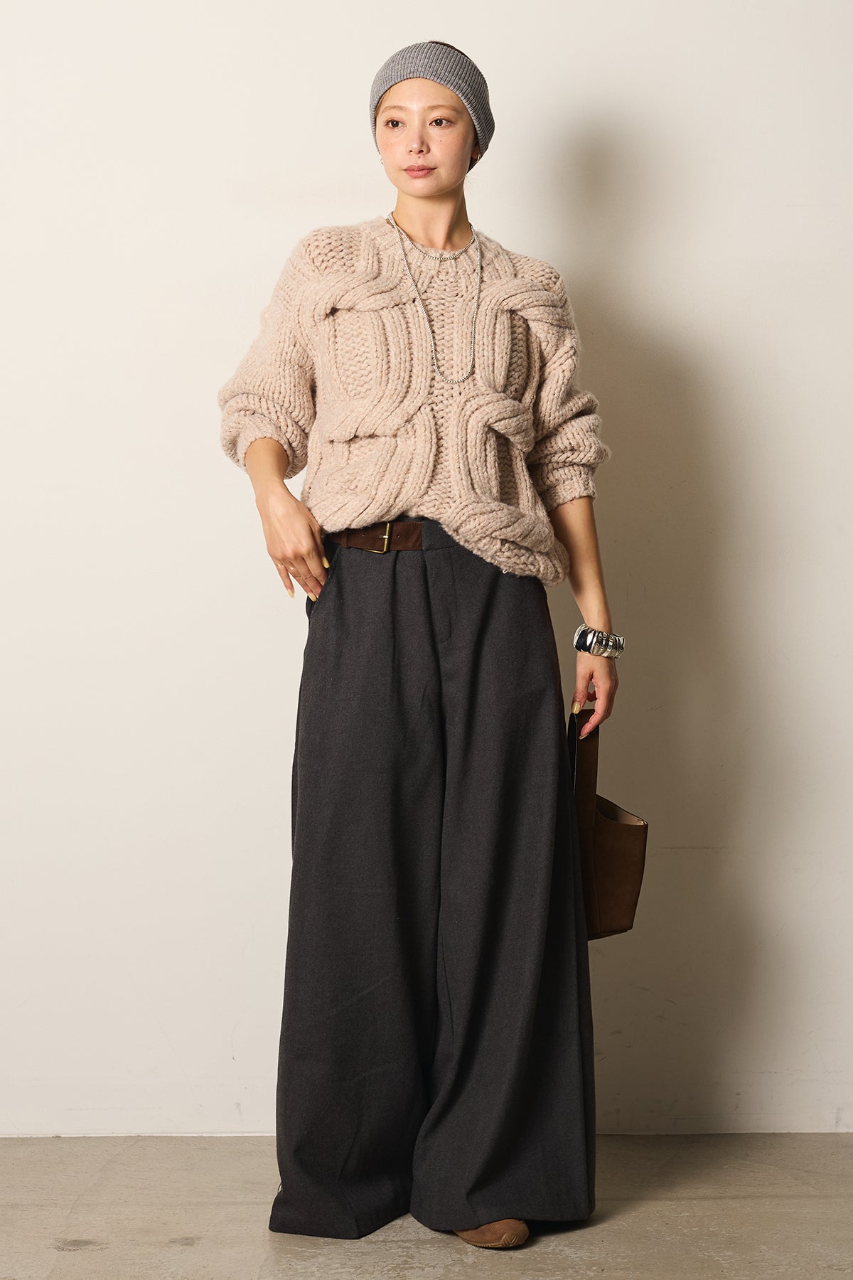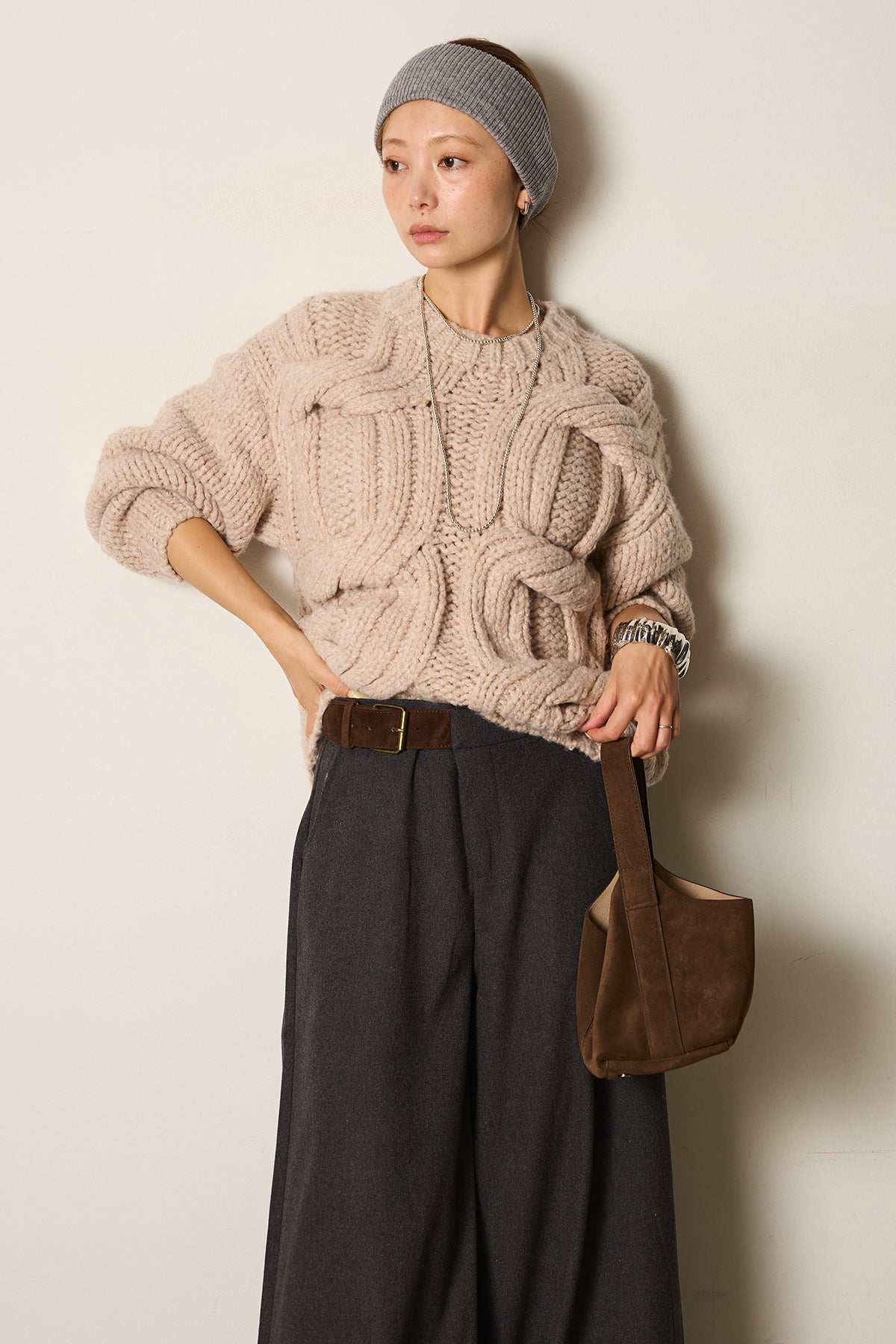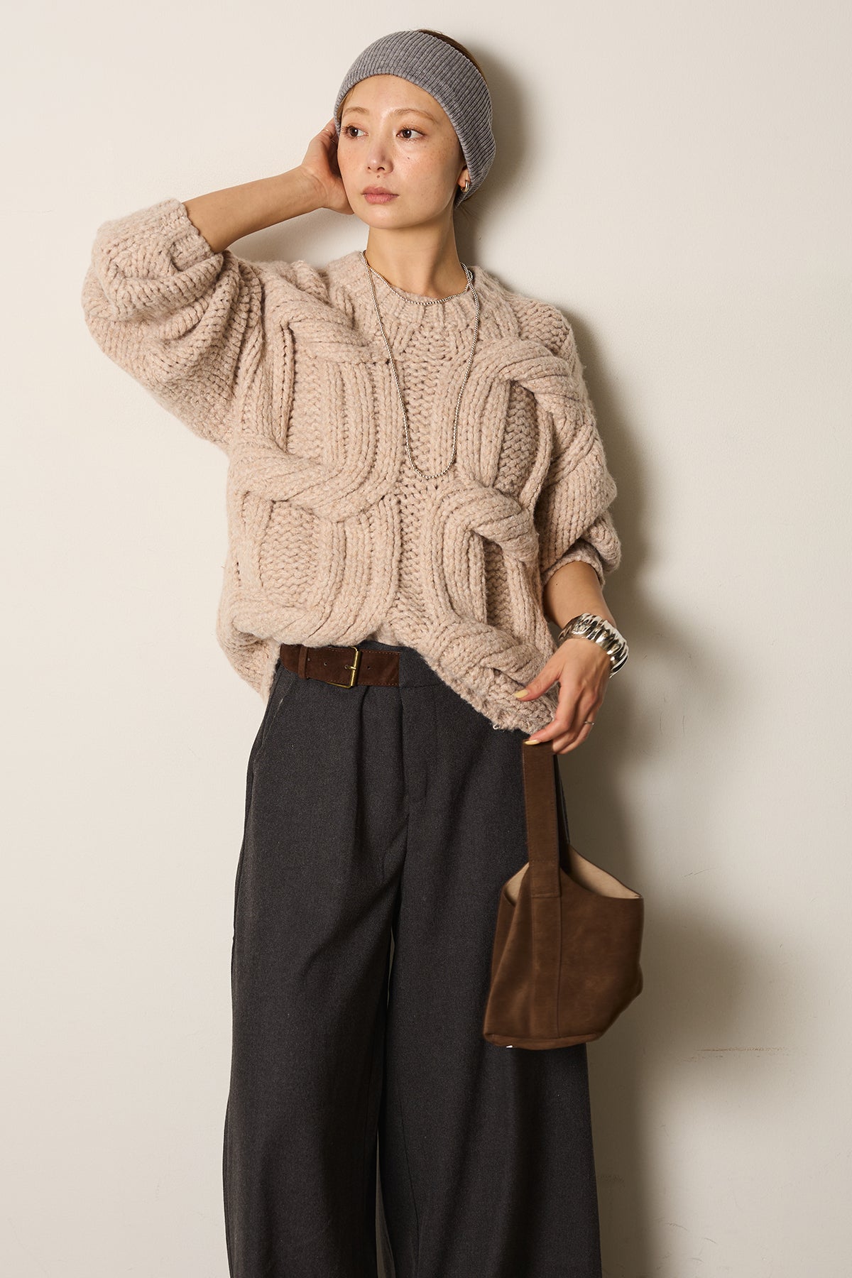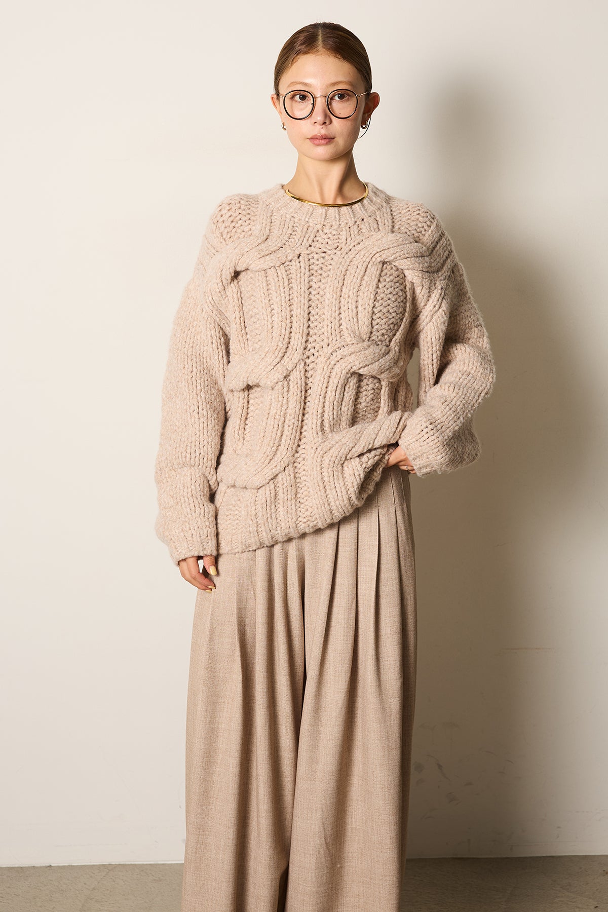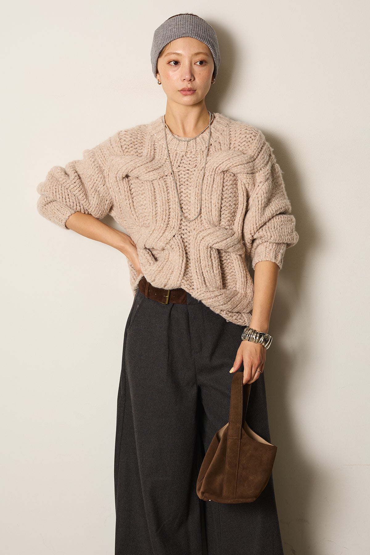 存在感のある立体的なケーブル編みが特徴のニットトップス。ふんわりとしたボリューム感がシーズンムードを高め、シンプルなスタイリングに加えるだけで華やかな印象に。柔らかな素材で着心地も良く、デイリーから冬のお出かけまで幅広く活躍する一枚です。