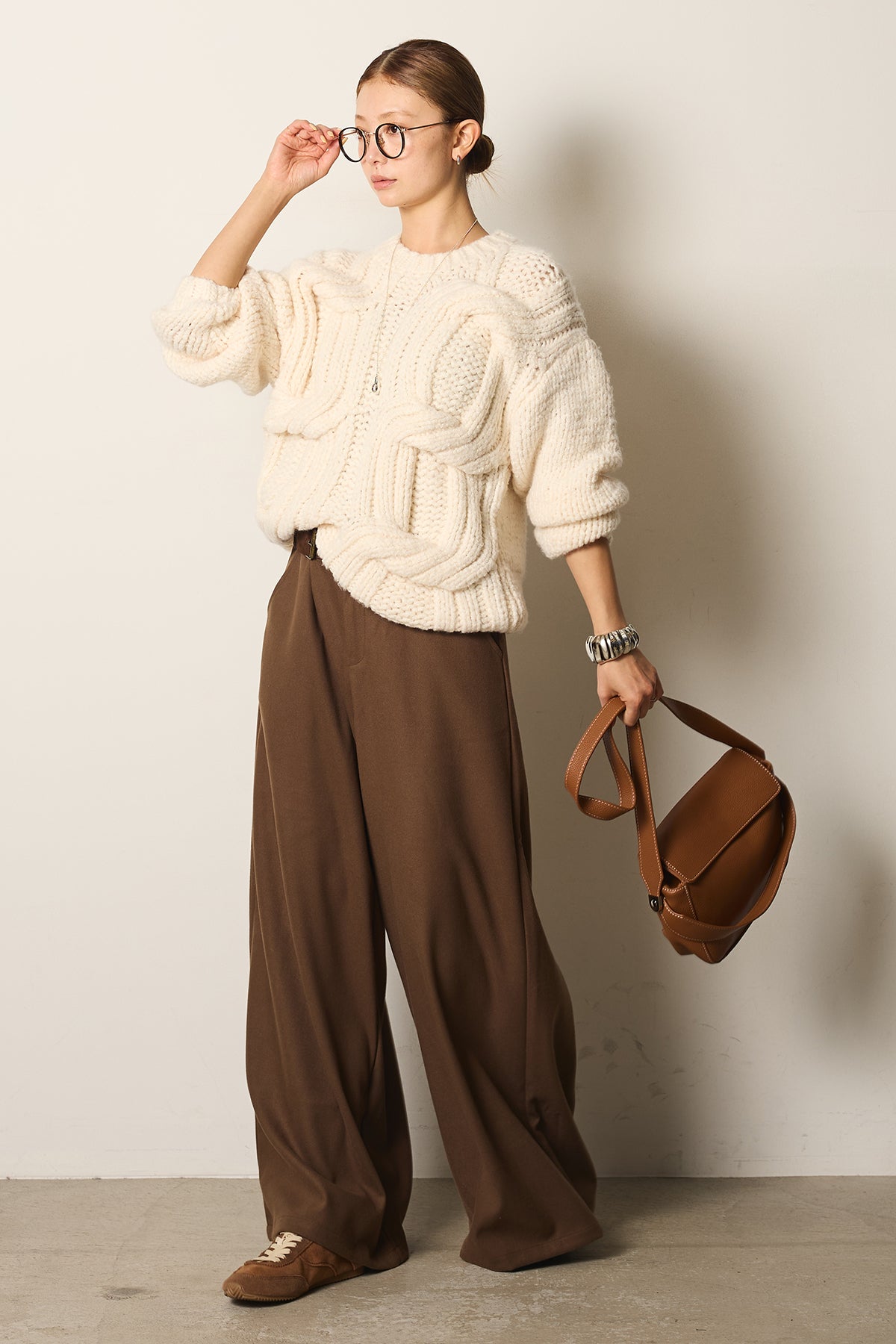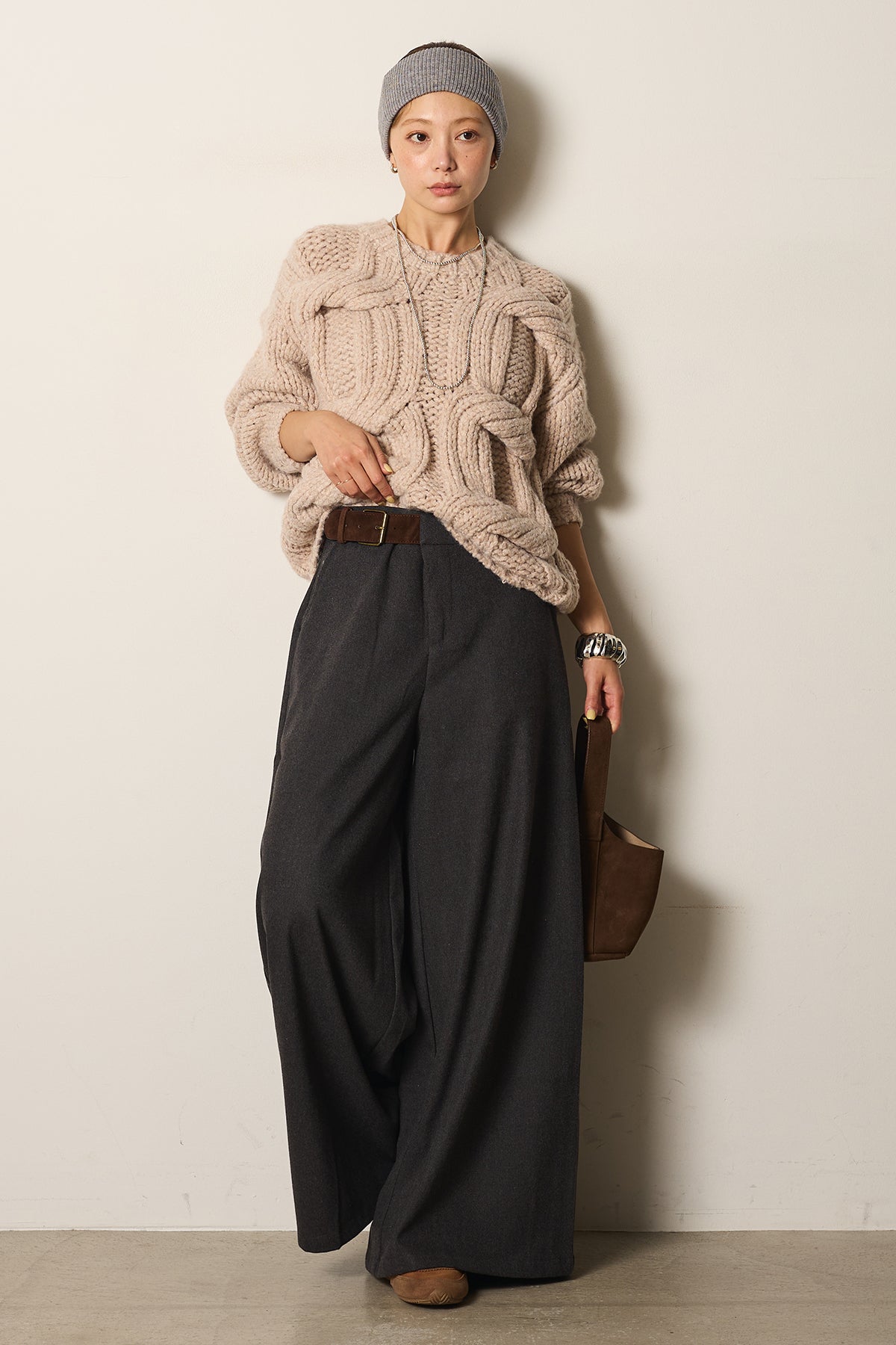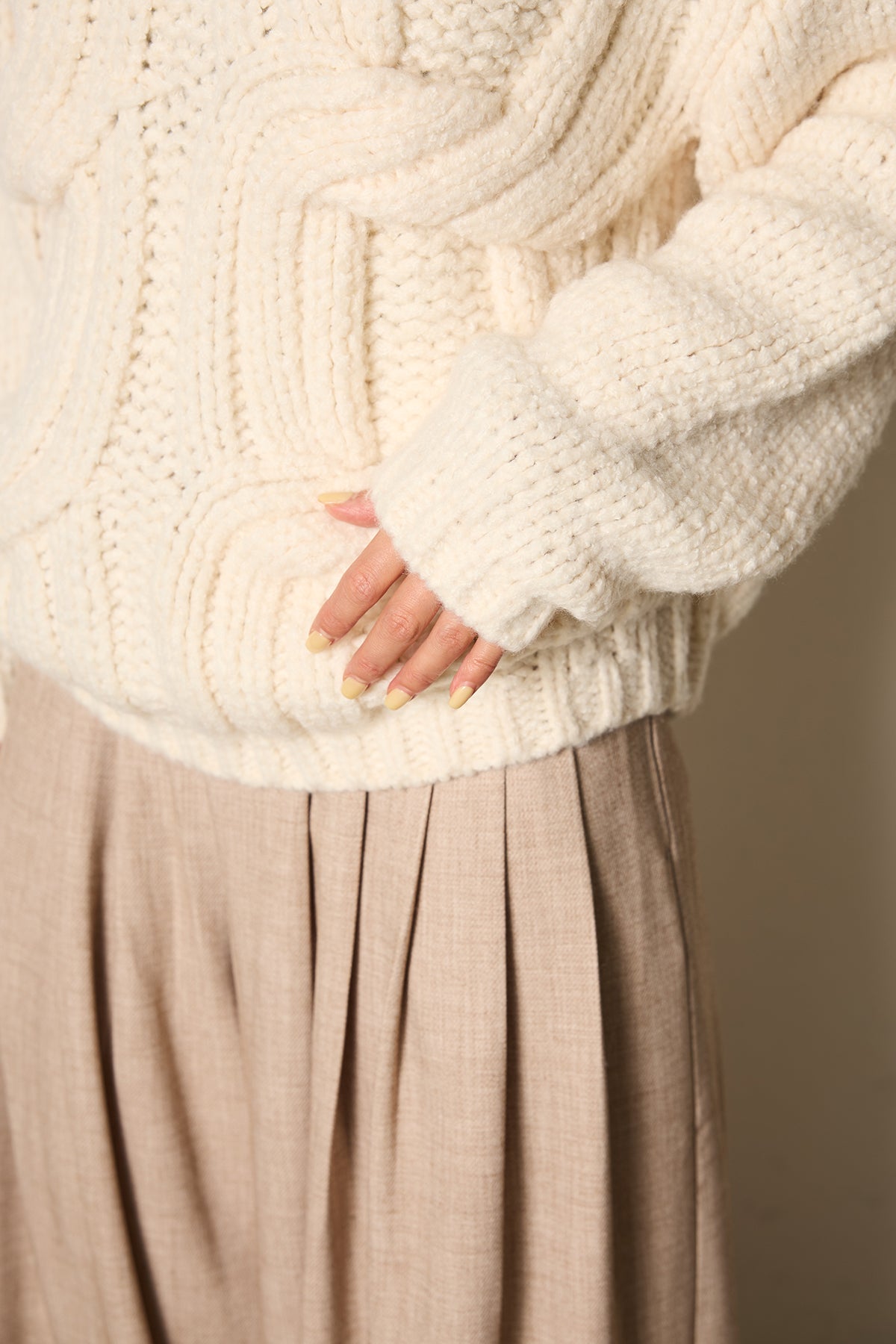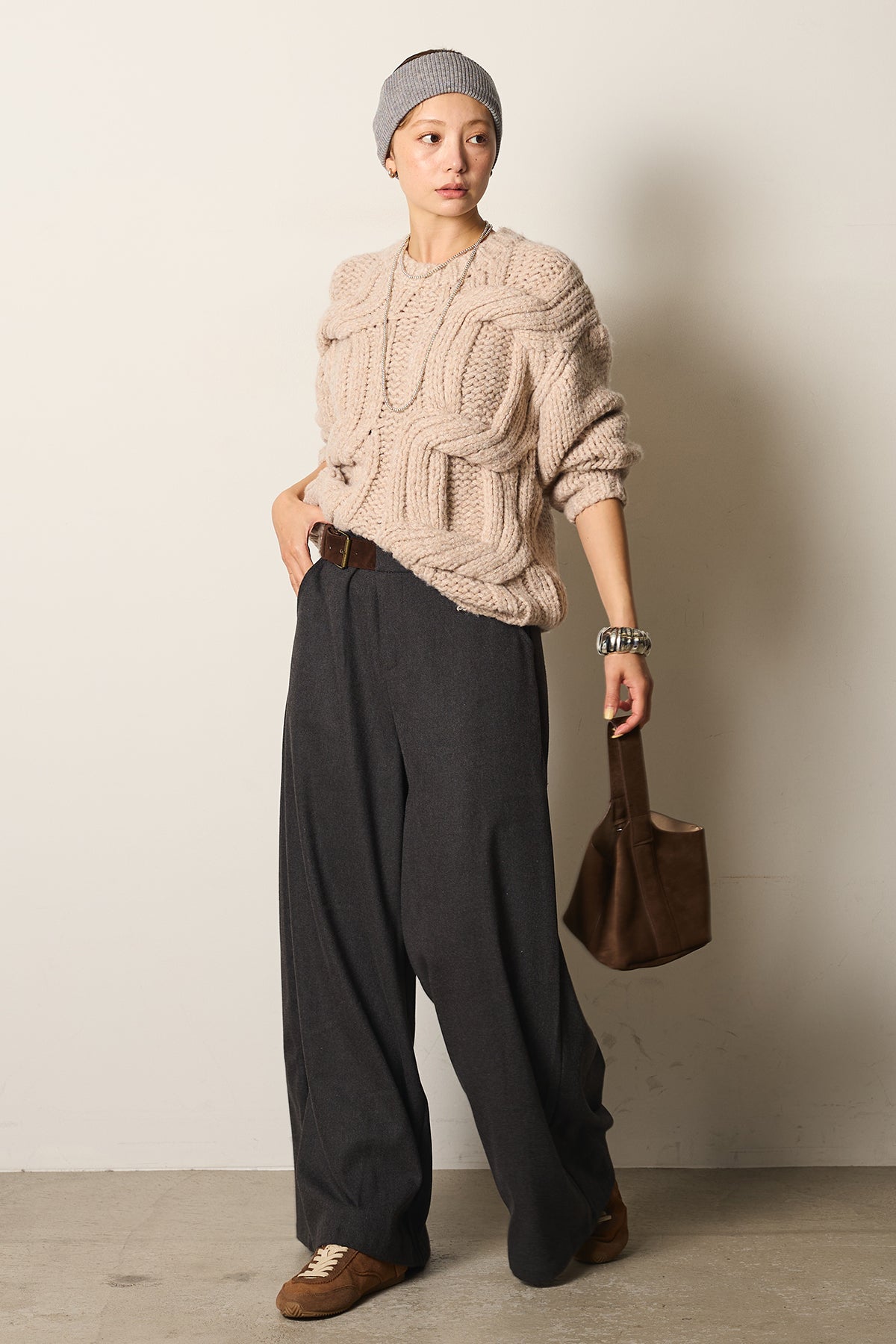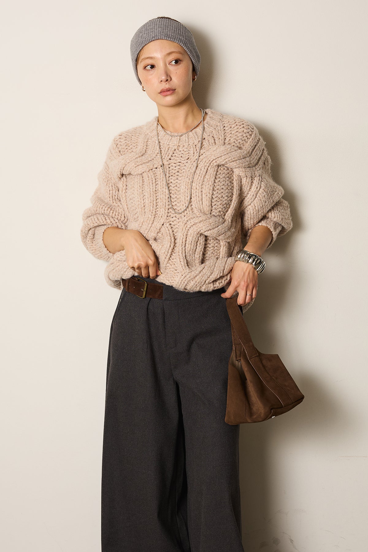存在感のある立体的なケーブル編みが特徴のニットトップス。ふんわりとしたボリューム感がシーズンムードを高め、シンプルなスタイリングに加えるだけで華やかな印象に。柔らかな素材で着心地も良く、デイリーから冬のお出かけまで幅広く活躍する一枚です。