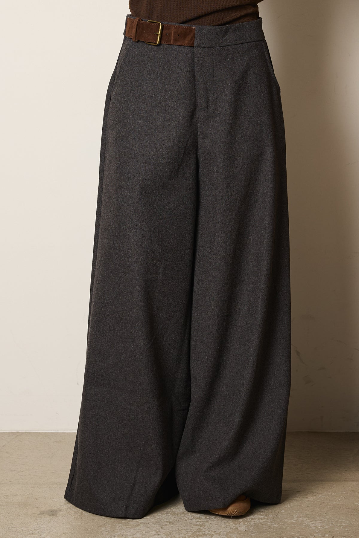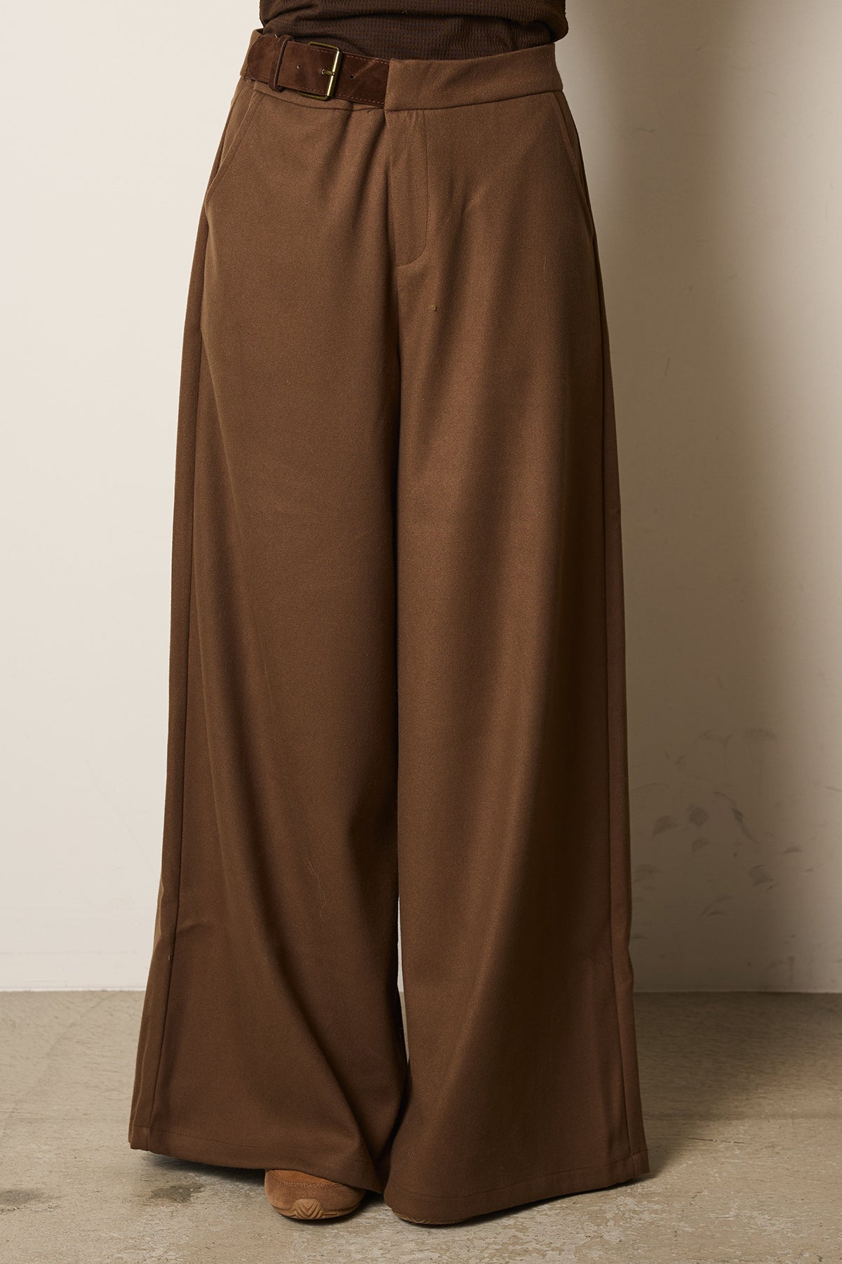サイドにフェイクレザーベルトをあしらったワイドパンツ。ハリ感のある素材がシルエットを美しく保ち、落ち感のあるラインが脚をすらりと見せてくれます。シンプルながらもモードなアクセントを効かせたデザインで、デイリーからきれいめスタイルまで幅広く活躍する一本です。