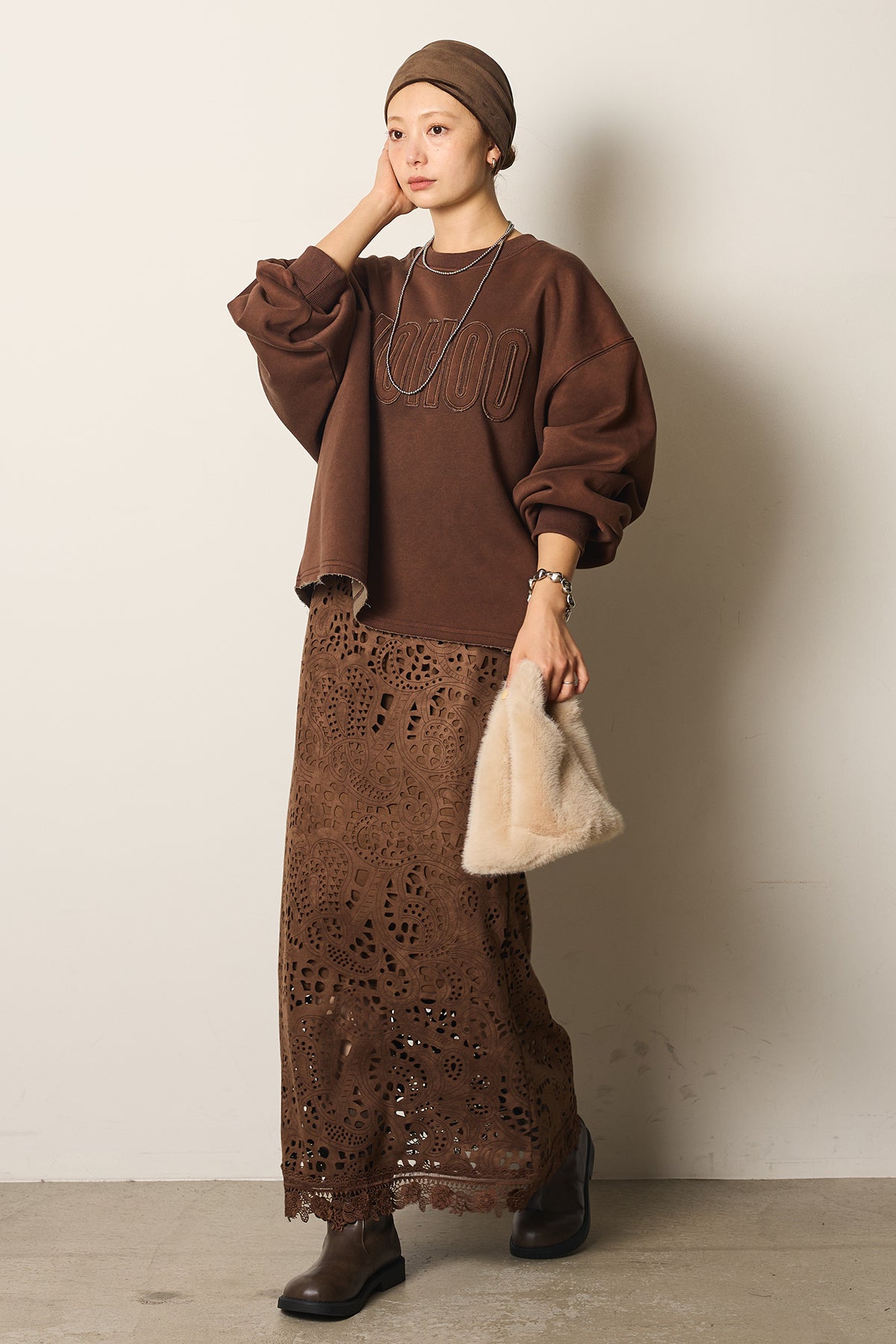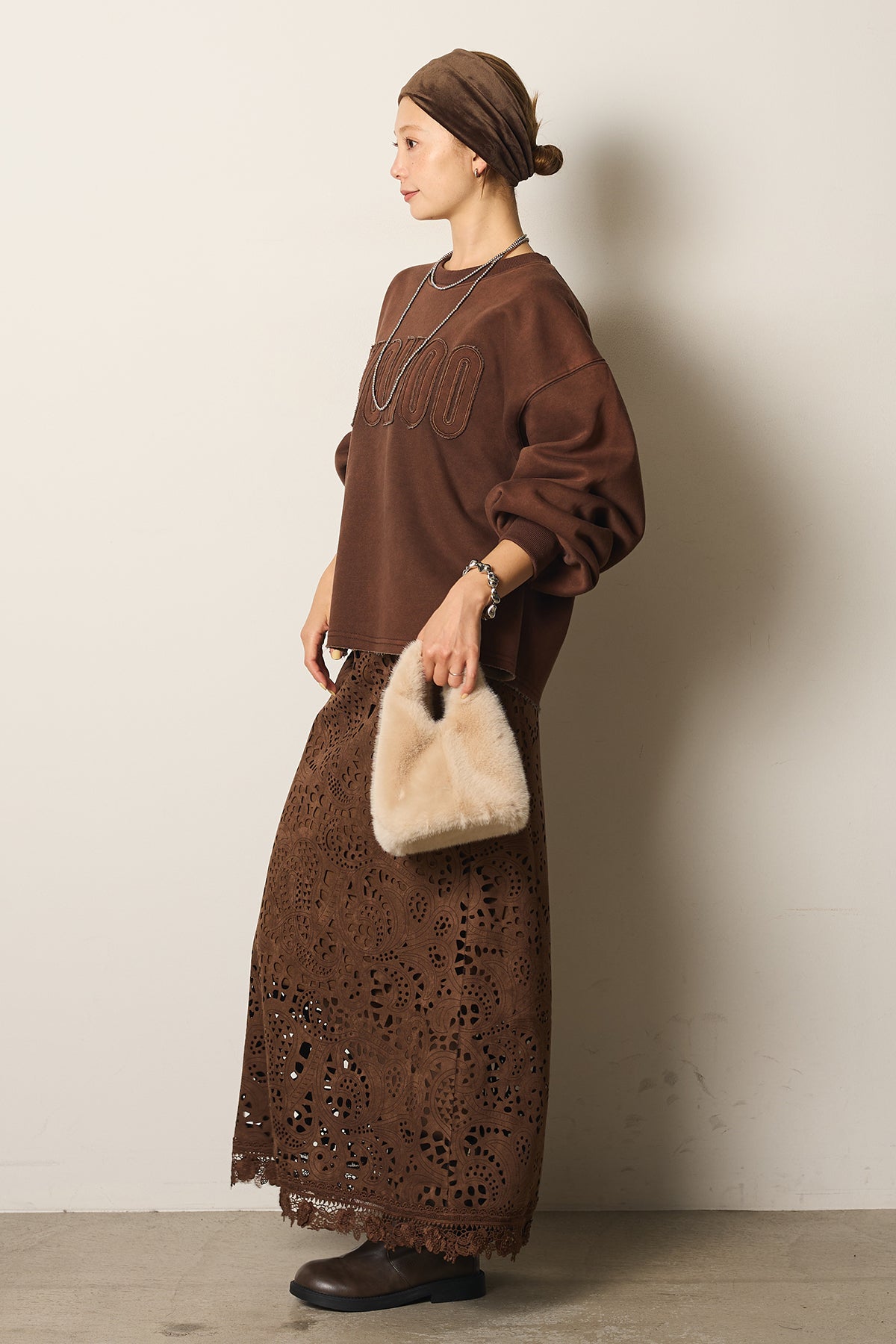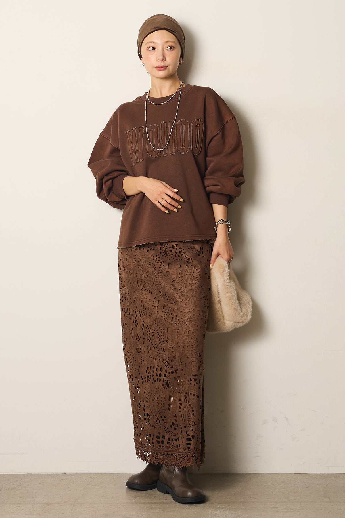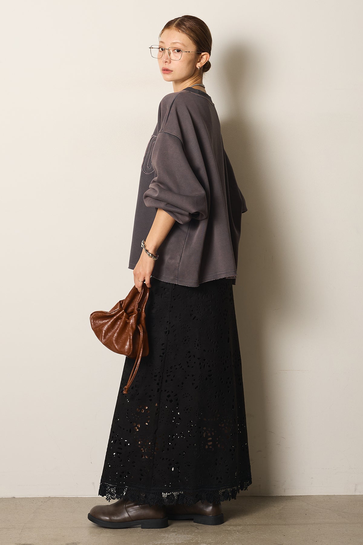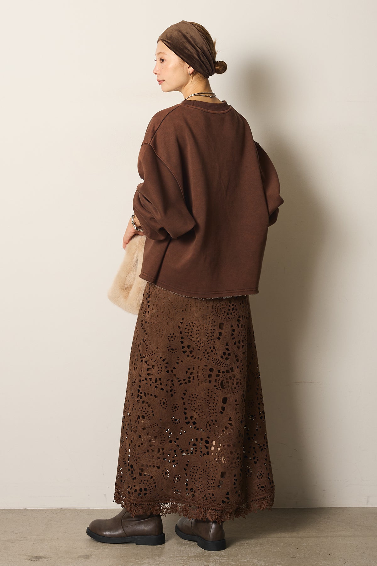 存在感のあるランダム柄が印象的なワイドスカート。レース調の透かし模様が軽やかな抜け感を生み、動くたびに表情豊かなスタイルを演出します。落ち着いたカラーで取り入れやすく、シンプルなトップスと合わせるだけでシーズンらしいコーディネートが完成する一枚です。