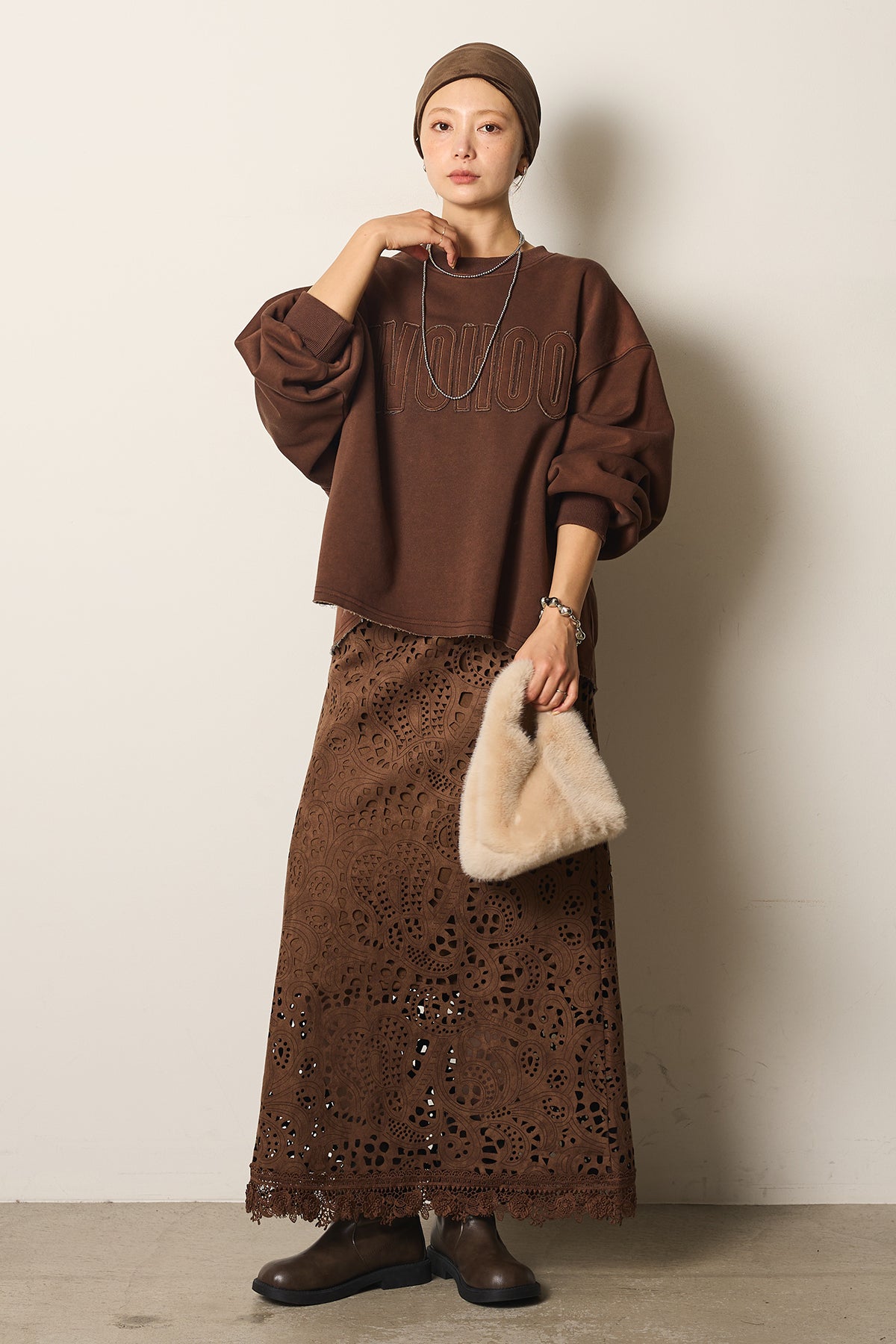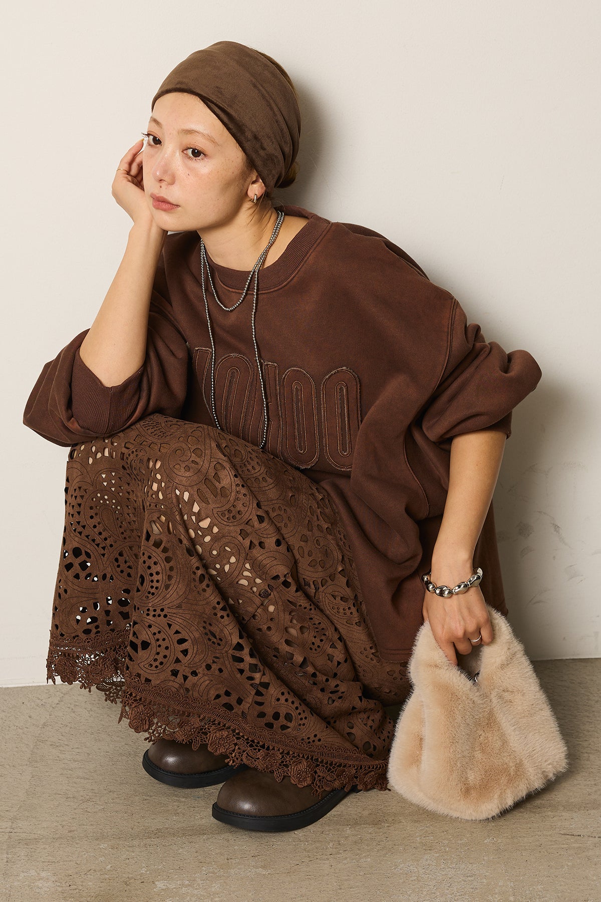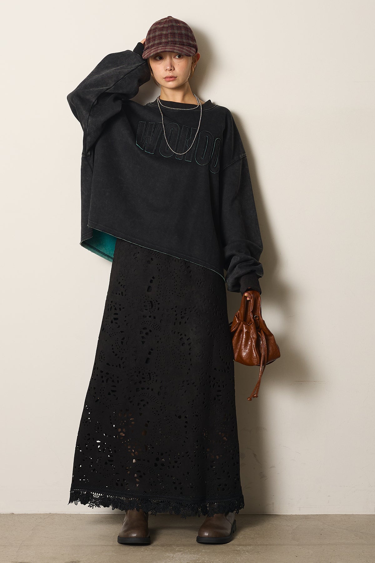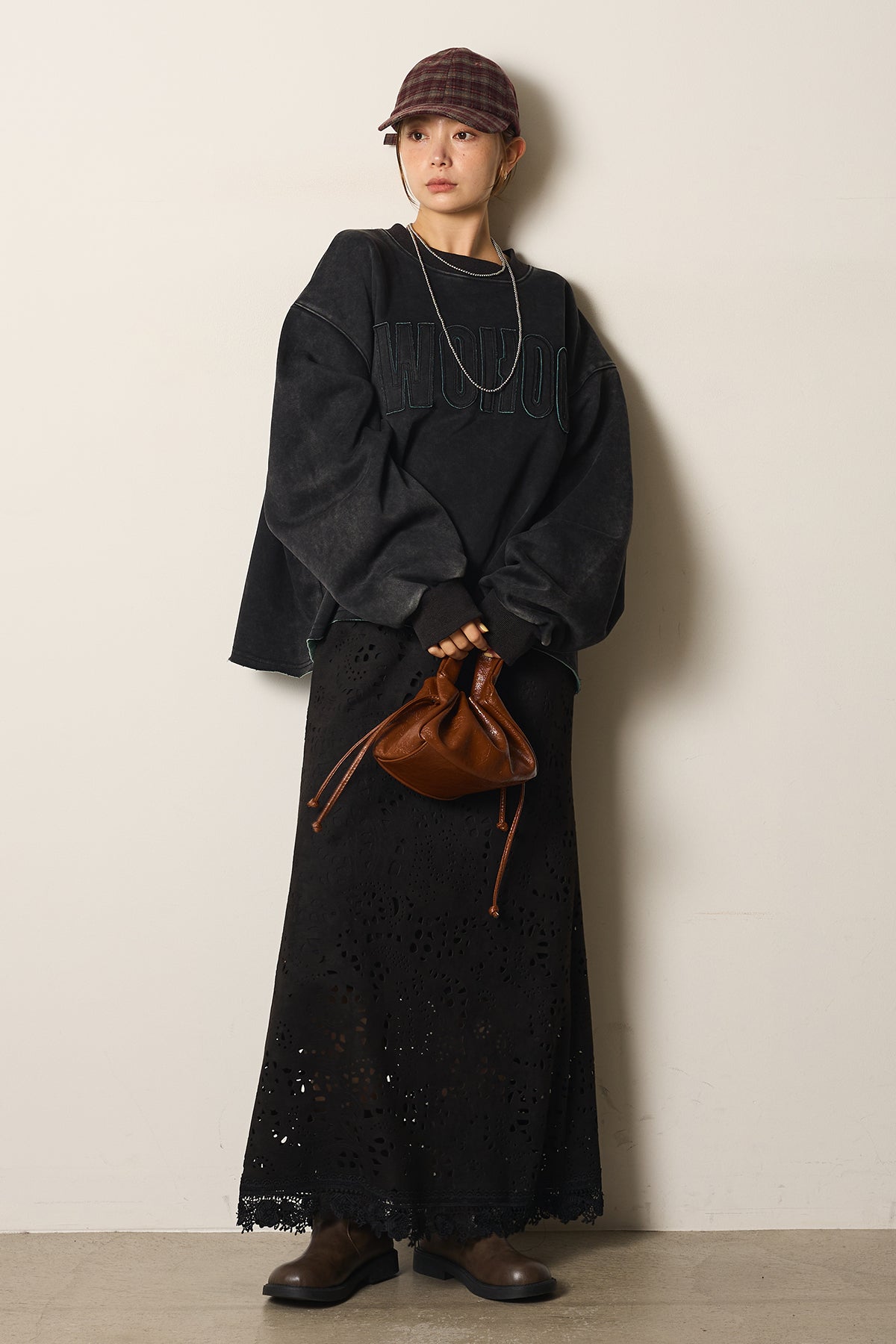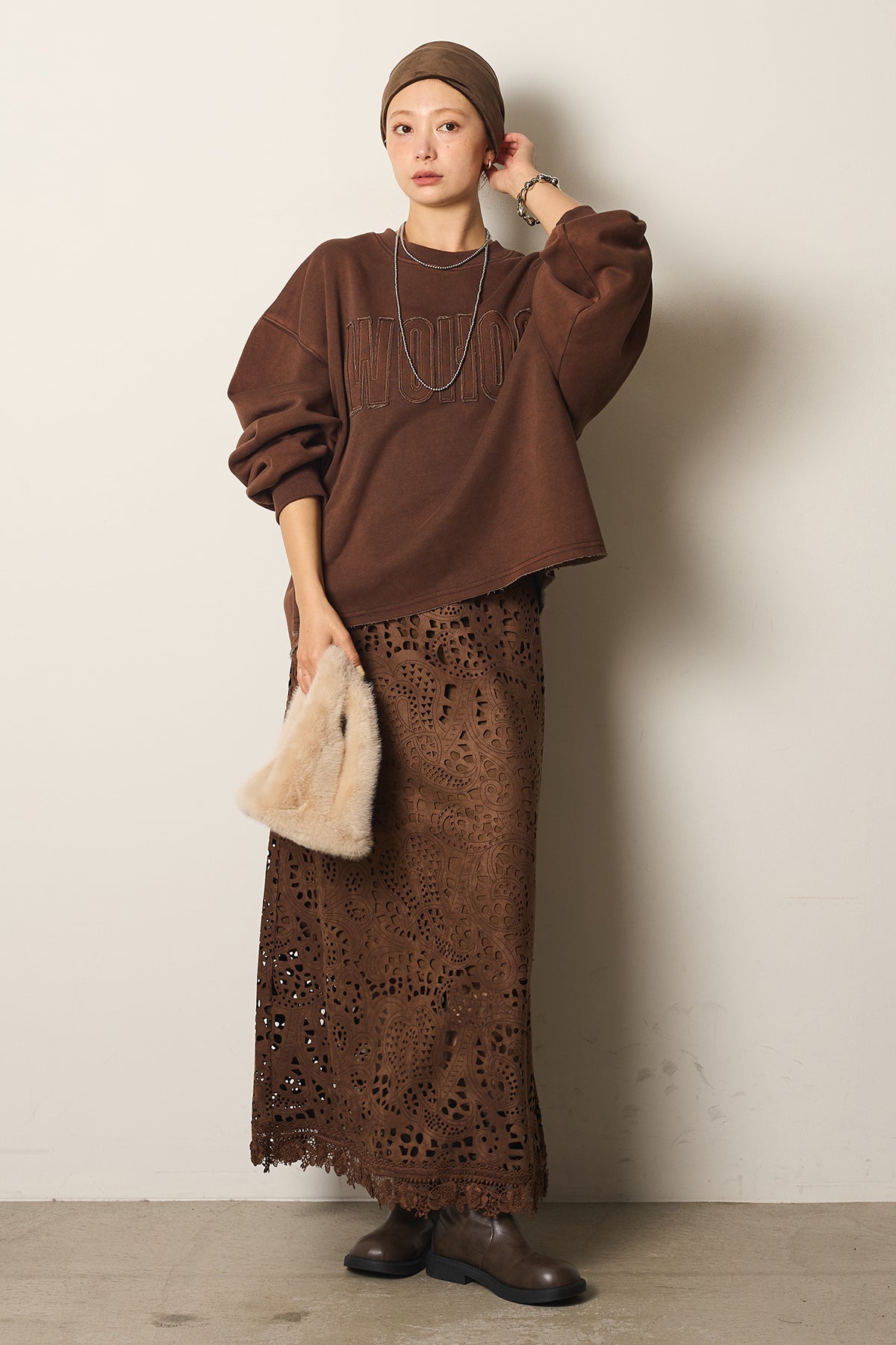 存在感のあるランダム柄が印象的なワイドスカート。レース調の透かし模様が軽やかな抜け感を生み、動くたびに表情豊かなスタイルを演出します。落ち着いたカラーで取り入れやすく、シンプルなトップスと合わせるだけでシーズンらしいコーディネートが完成する一枚です。