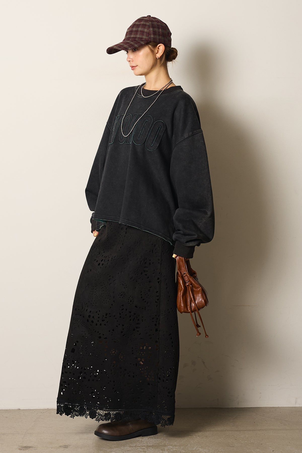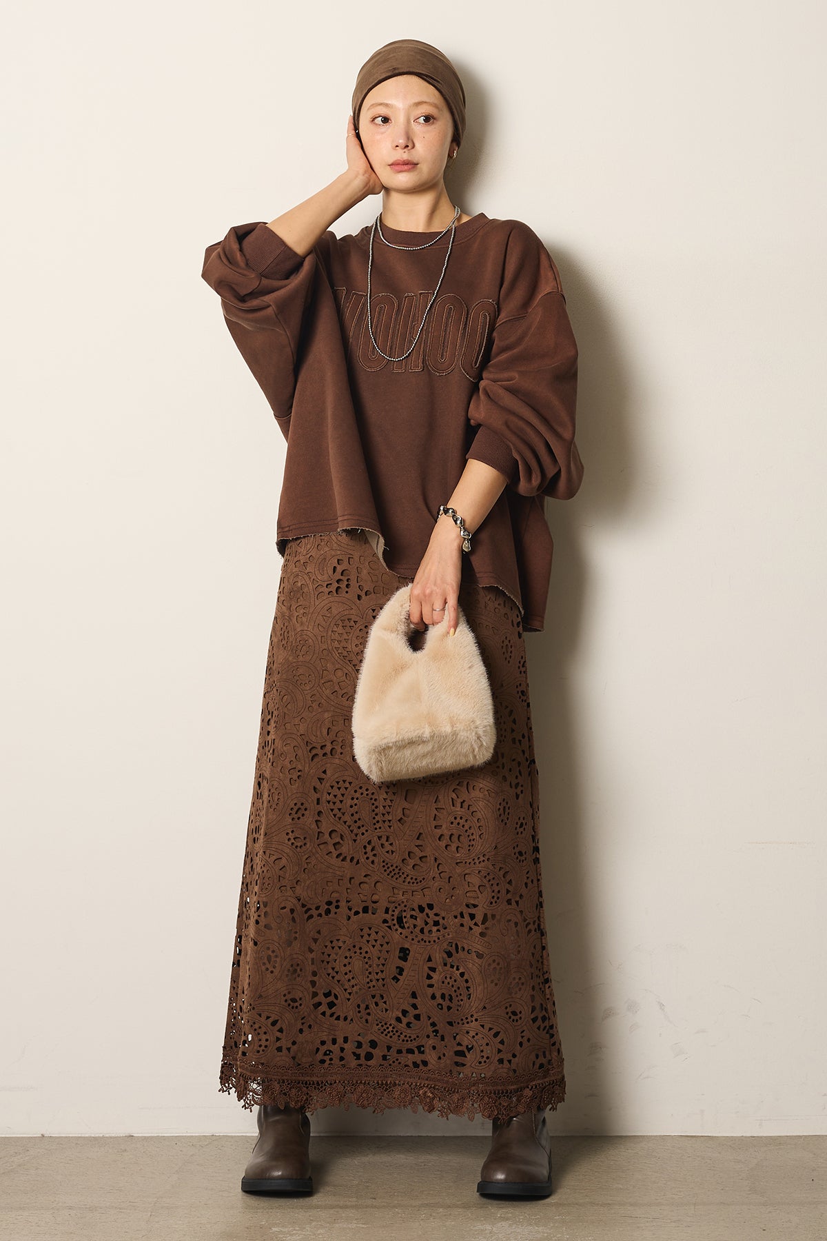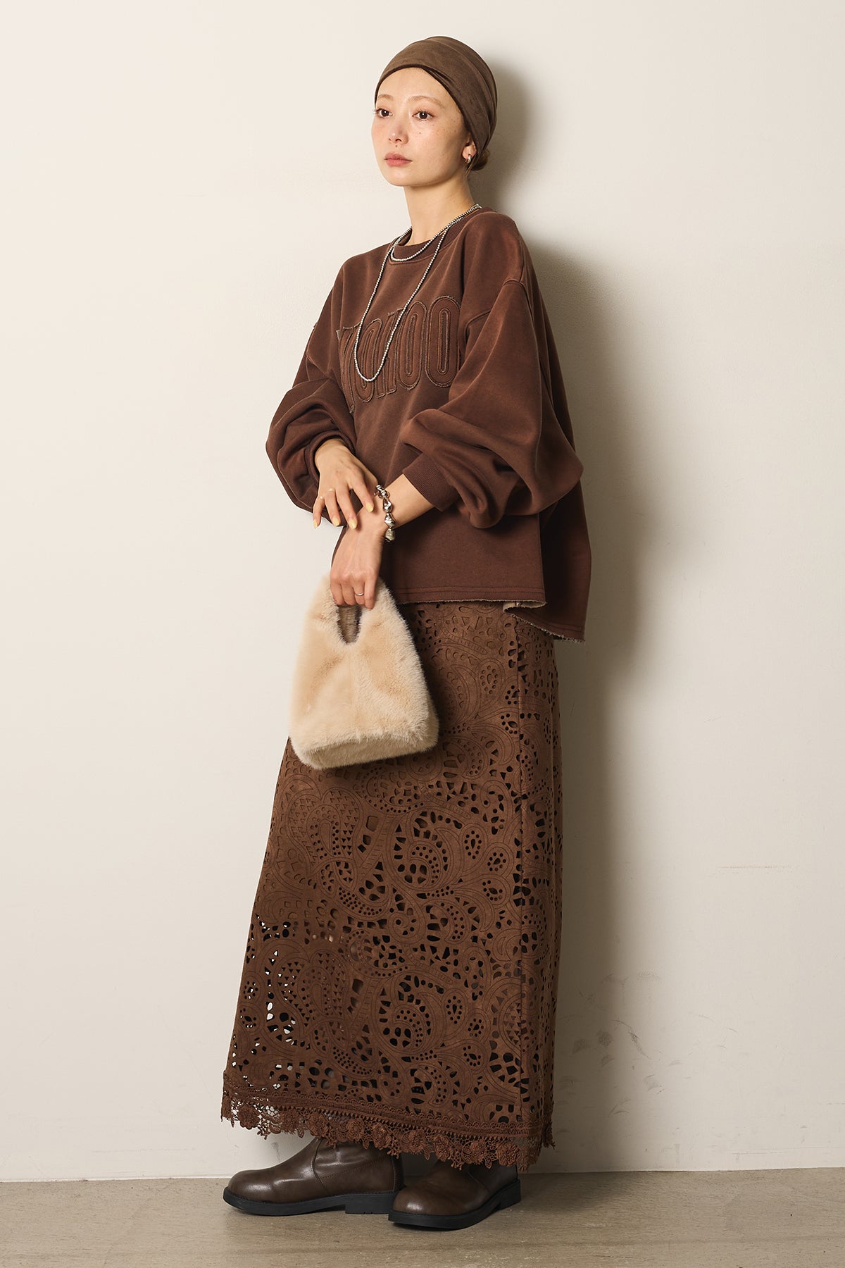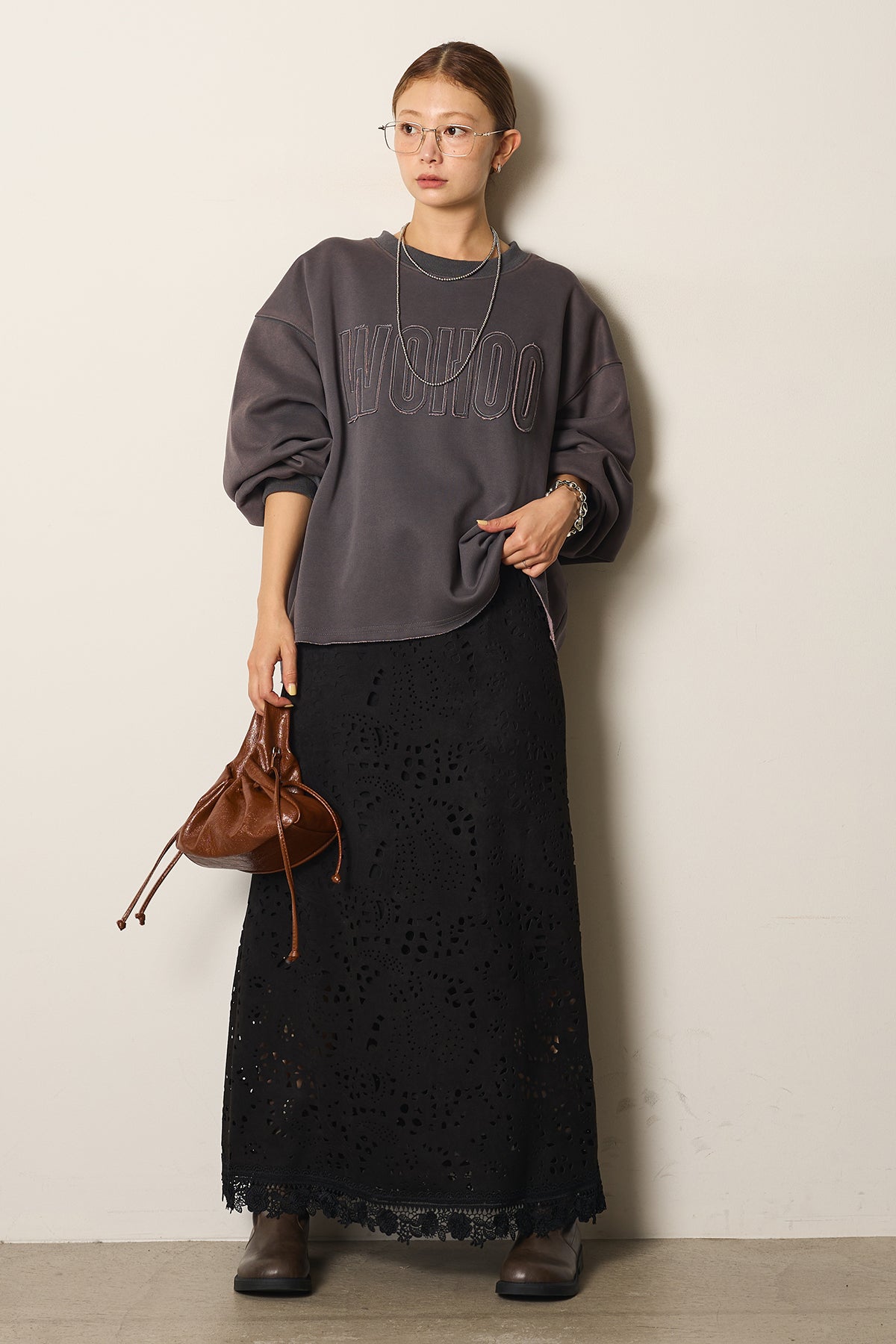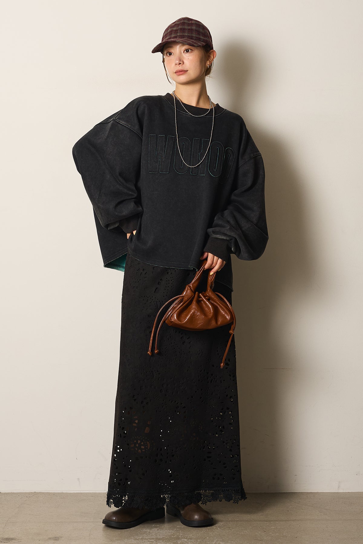 存在感のあるランダム柄が印象的なワイドスカート。レース調の透かし模様が軽やかな抜け感を生み、動くたびに表情豊かなスタイルを演出します。落ち着いたカラーで取り入れやすく、シンプルなトップスと合わせるだけでシーズンらしいコーディネートが完成する一枚です。