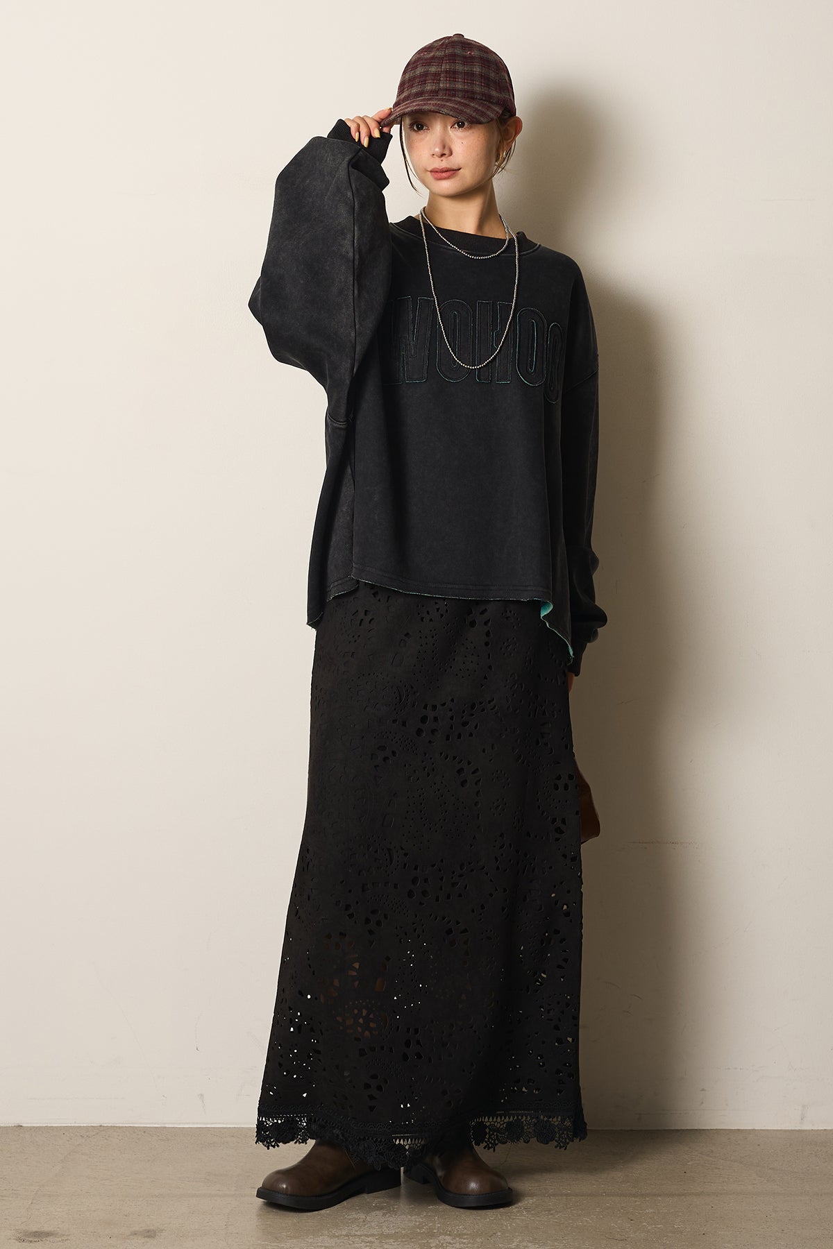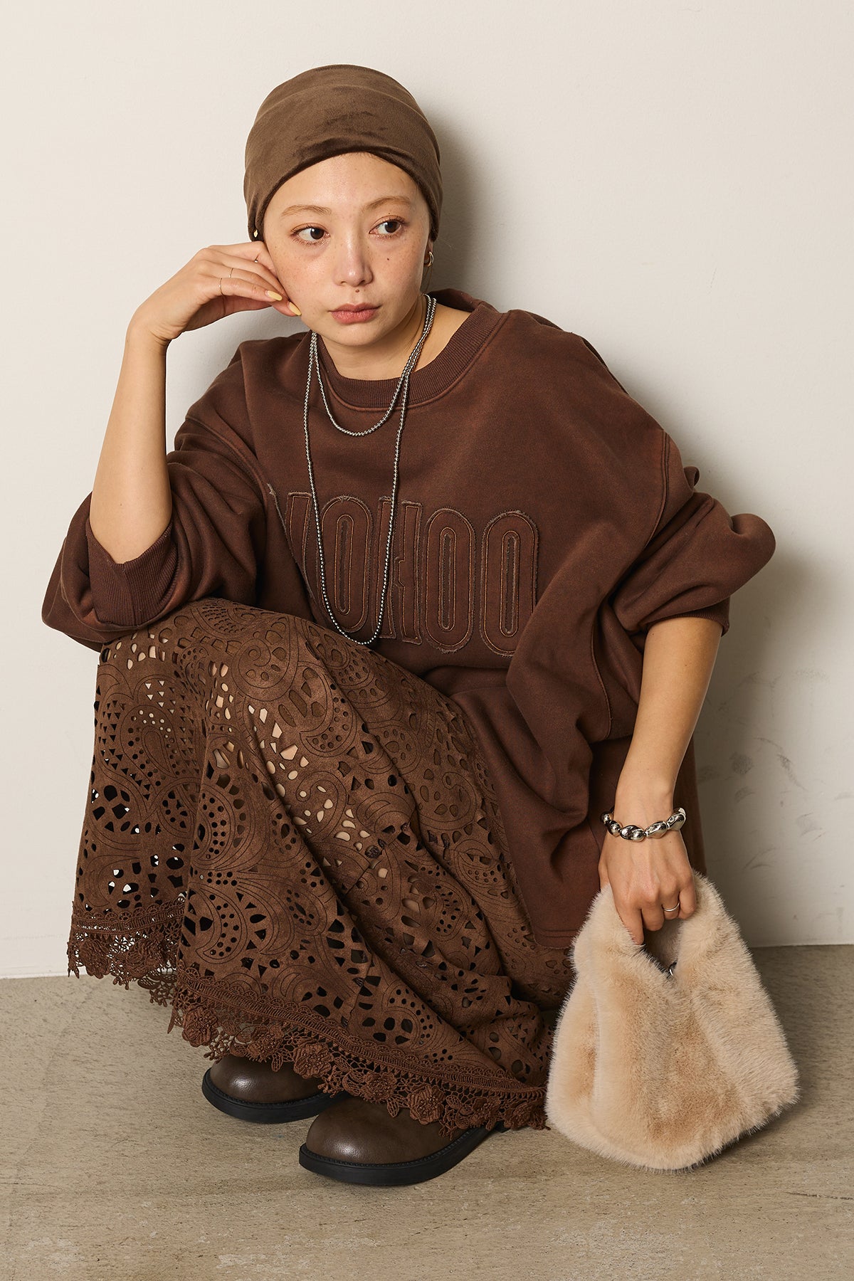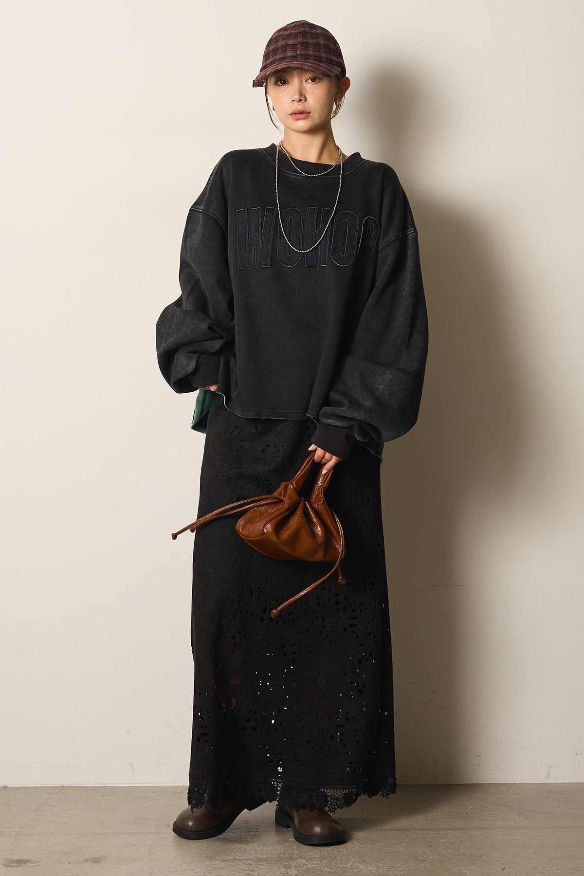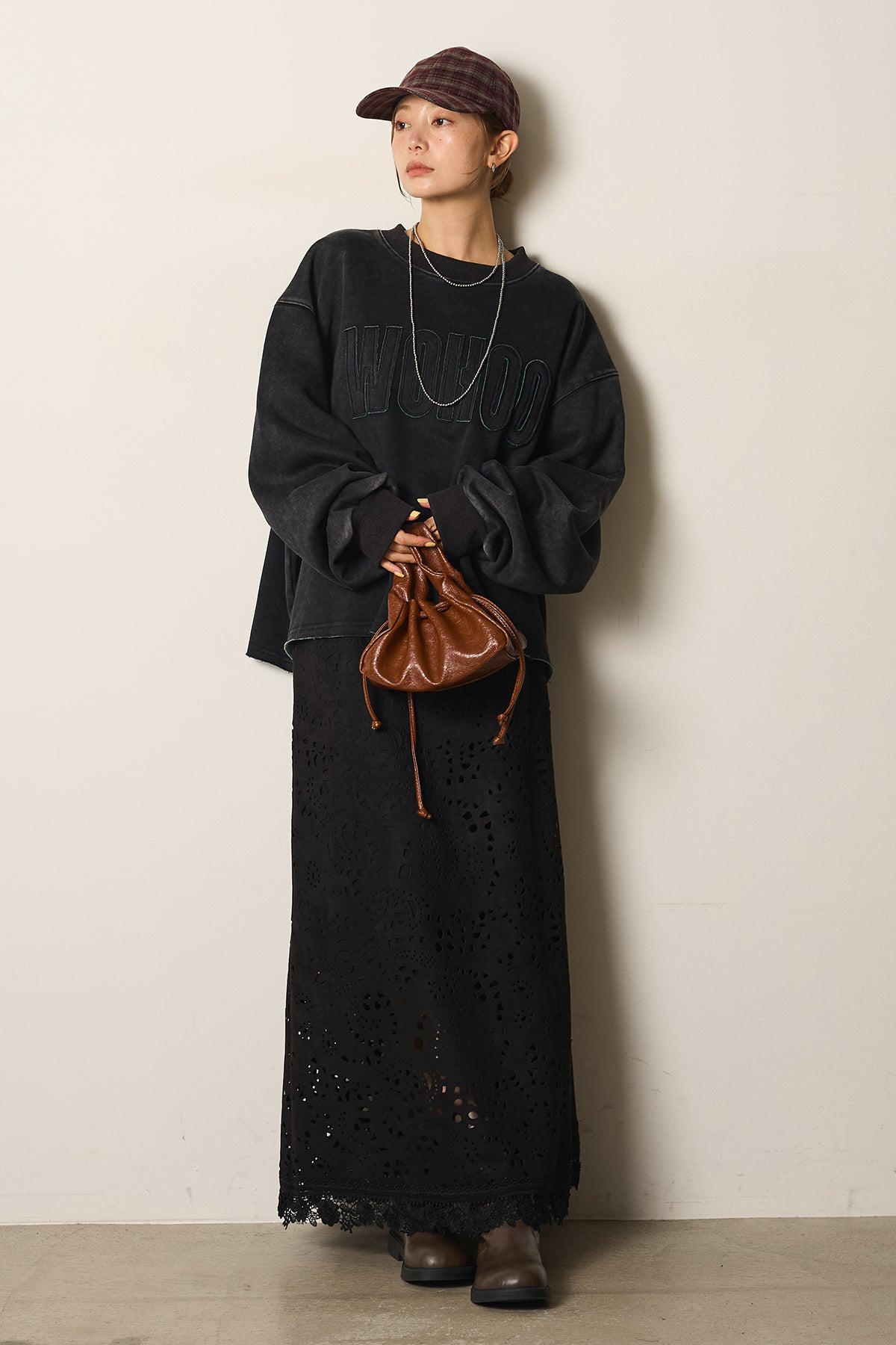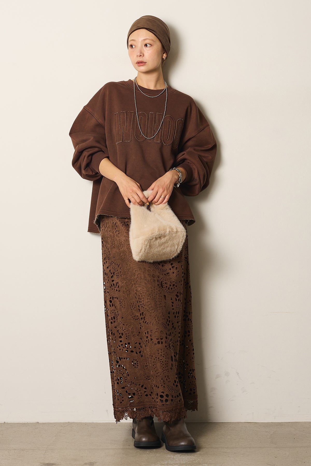 存在感のあるランダム柄が印象的なワイドスカート。レース調の透かし模様が軽やかな抜け感を生み、動くたびに表情豊かなスタイルを演出します。落ち着いたカラーで取り入れやすく、シンプルなトップスと合わせるだけでシーズンらしいコーディネートが完成する一枚です。
