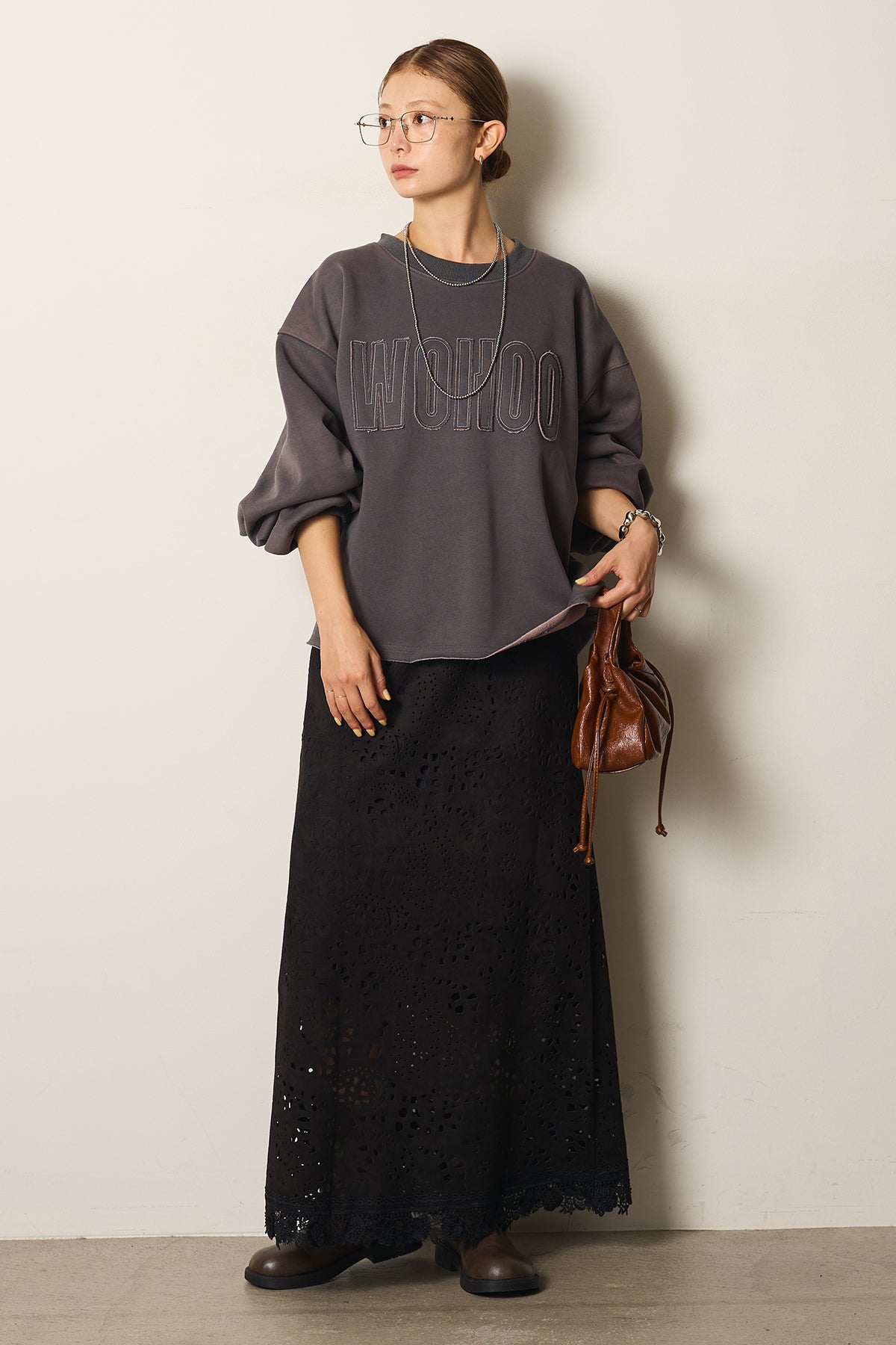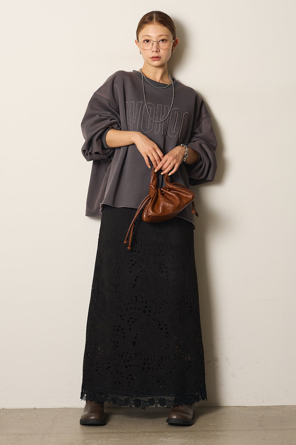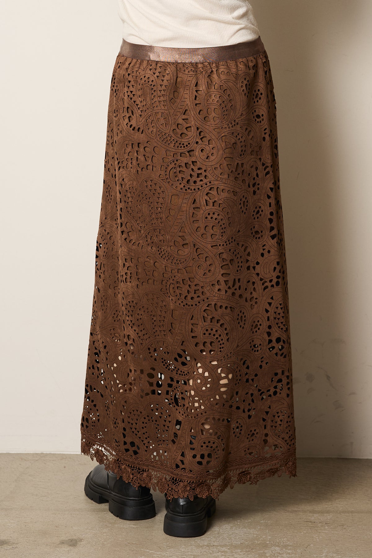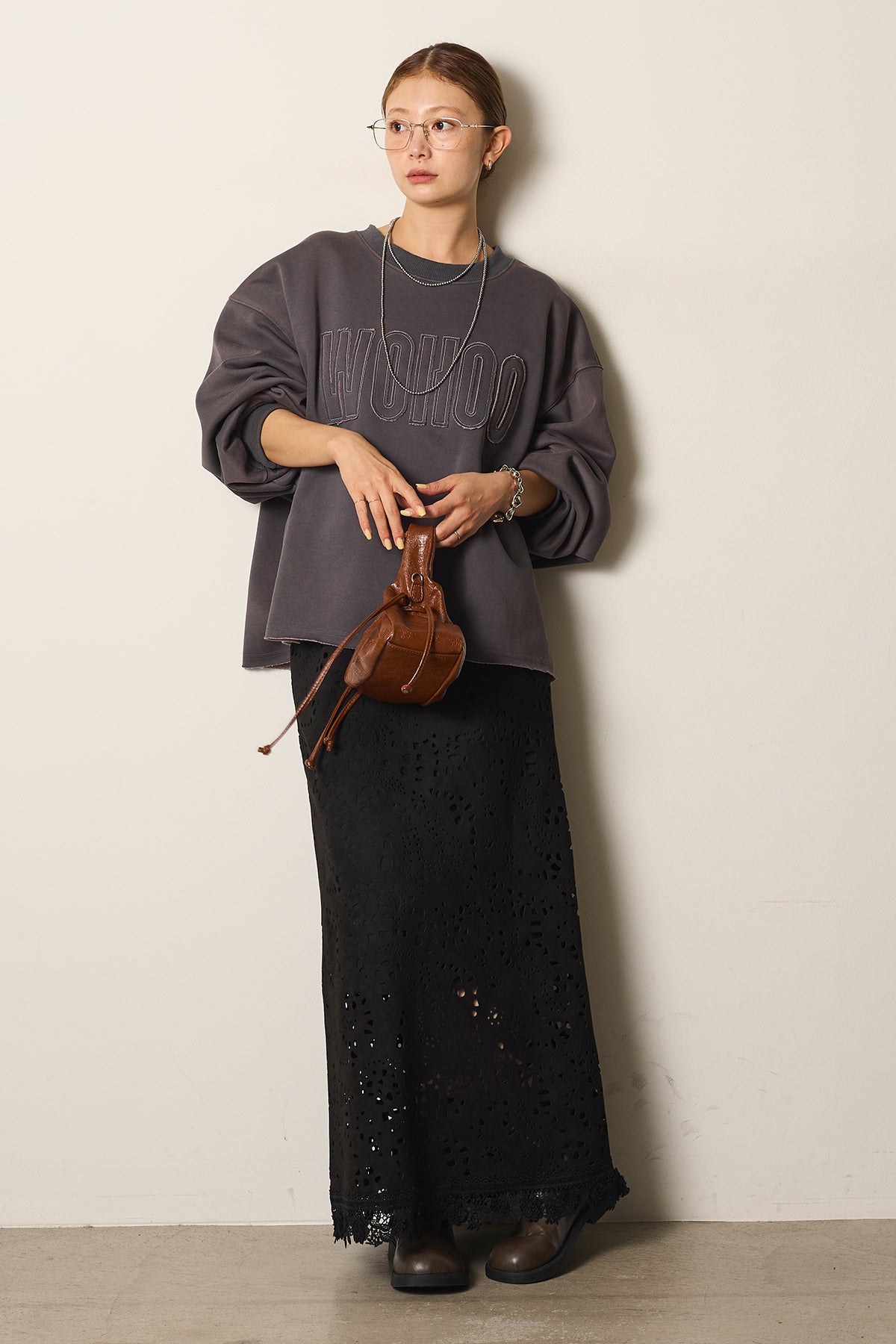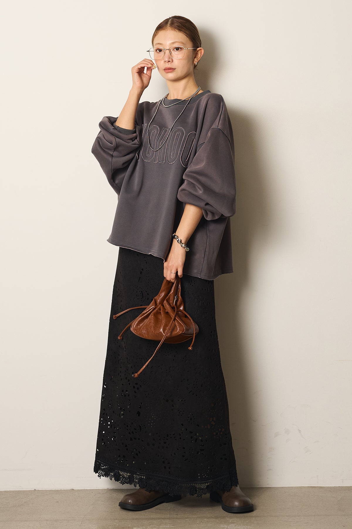 存在感のあるランダム柄が印象的なワイドスカート。レース調の透かし模様が軽やかな抜け感を生み、動くたびに表情豊かなスタイルを演出します。落ち着いたカラーで取り入れやすく、シンプルなトップスと合わせるだけでシーズンらしいコーディネートが完成する一枚です。
