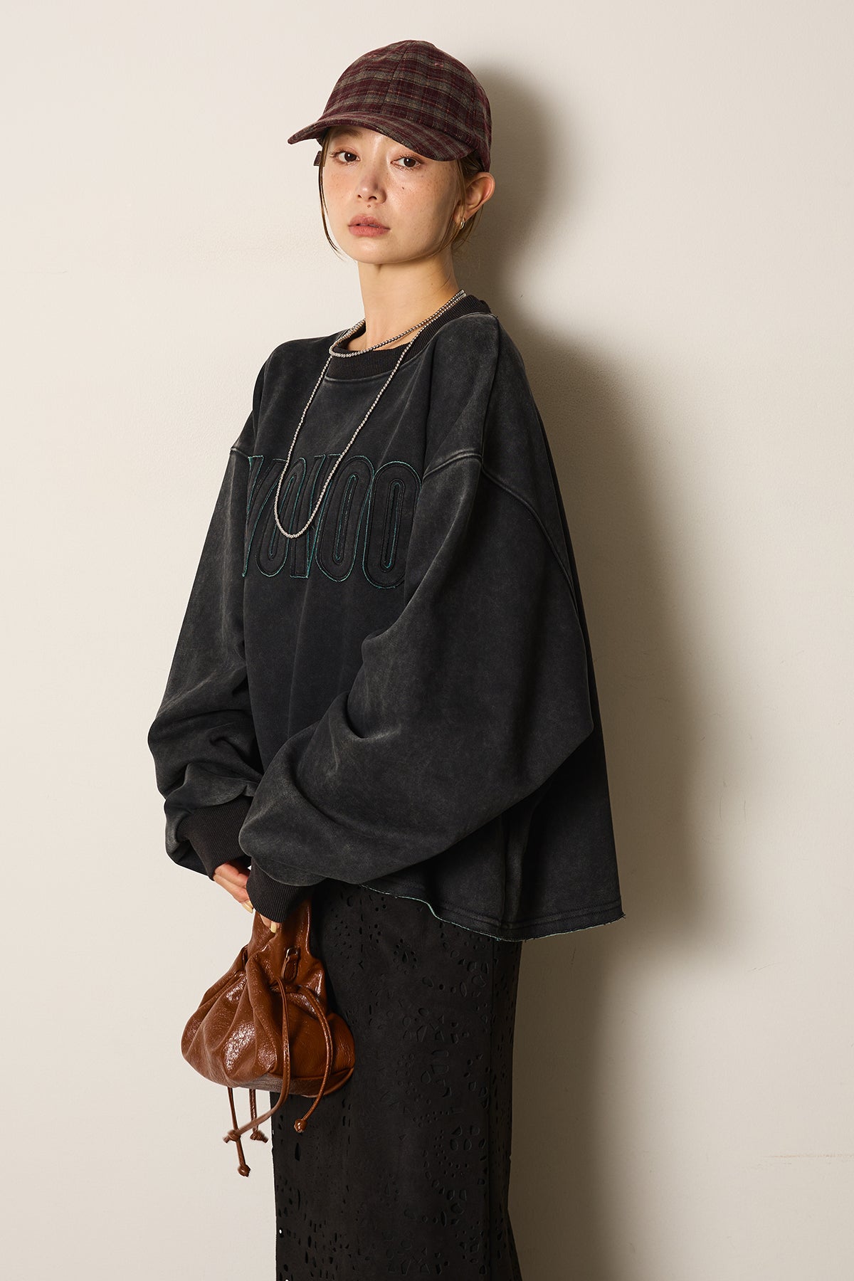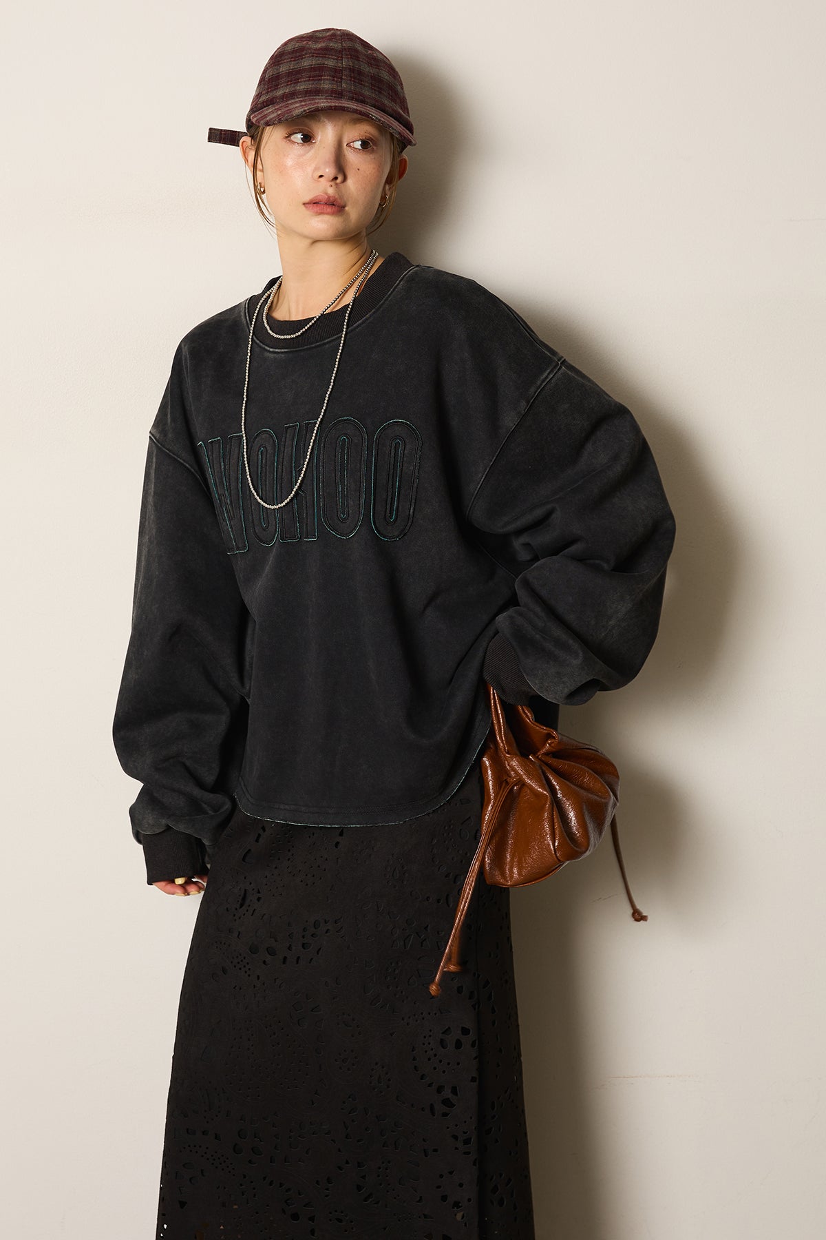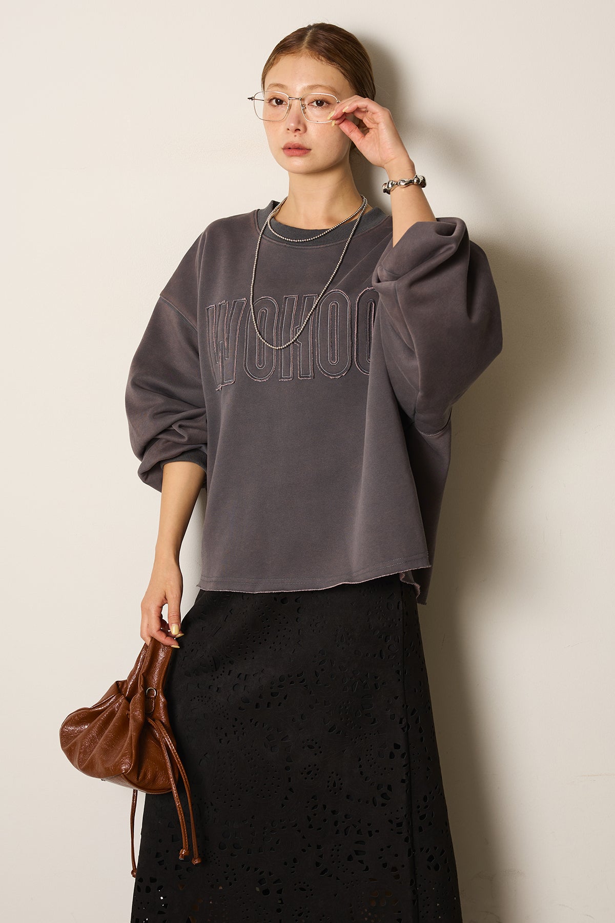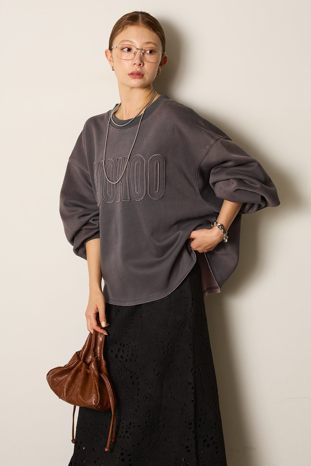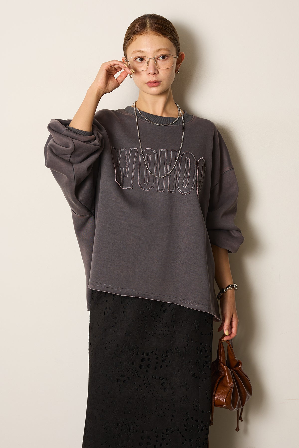 ヴィンテージ感漂うピグメント加工を施したロゴスウェット。立体的な配色ロゴがアクセントとなり、カジュアルスタイルを格上げします。ゆったりとしたシルエットでリラックス感があり、デニムやスカートなど幅広いアイテムと相性抜群の一枚です。