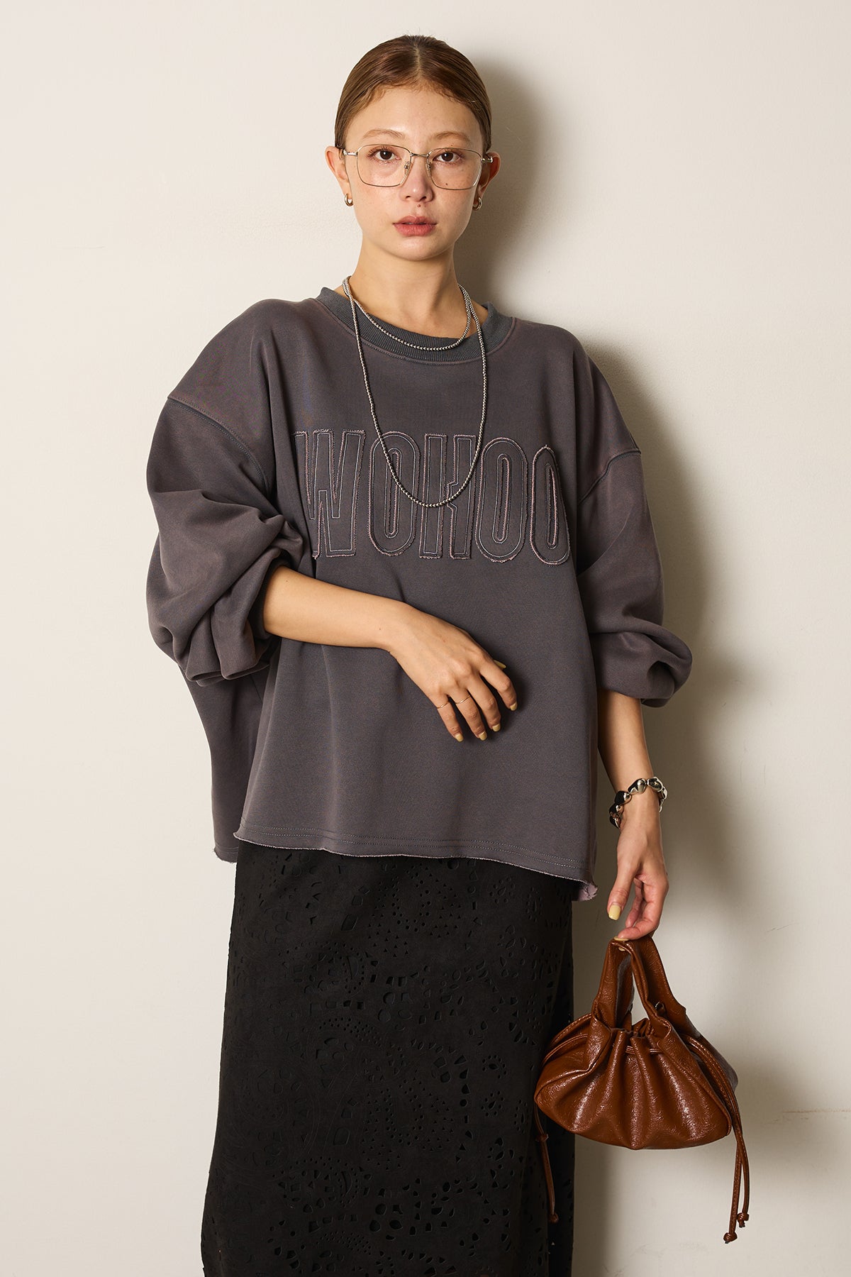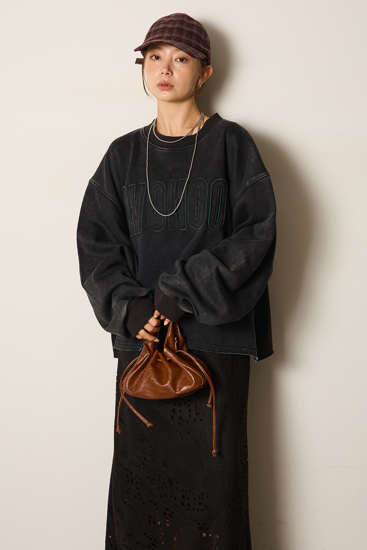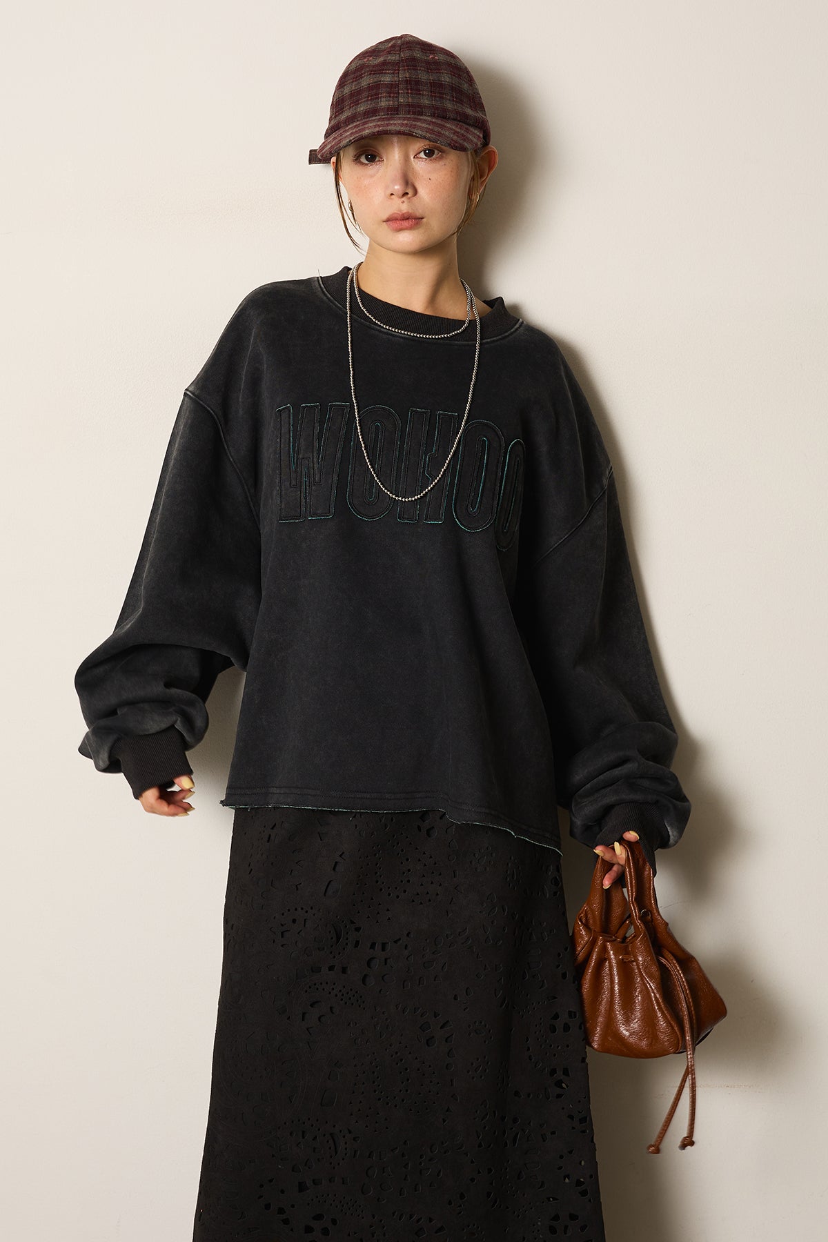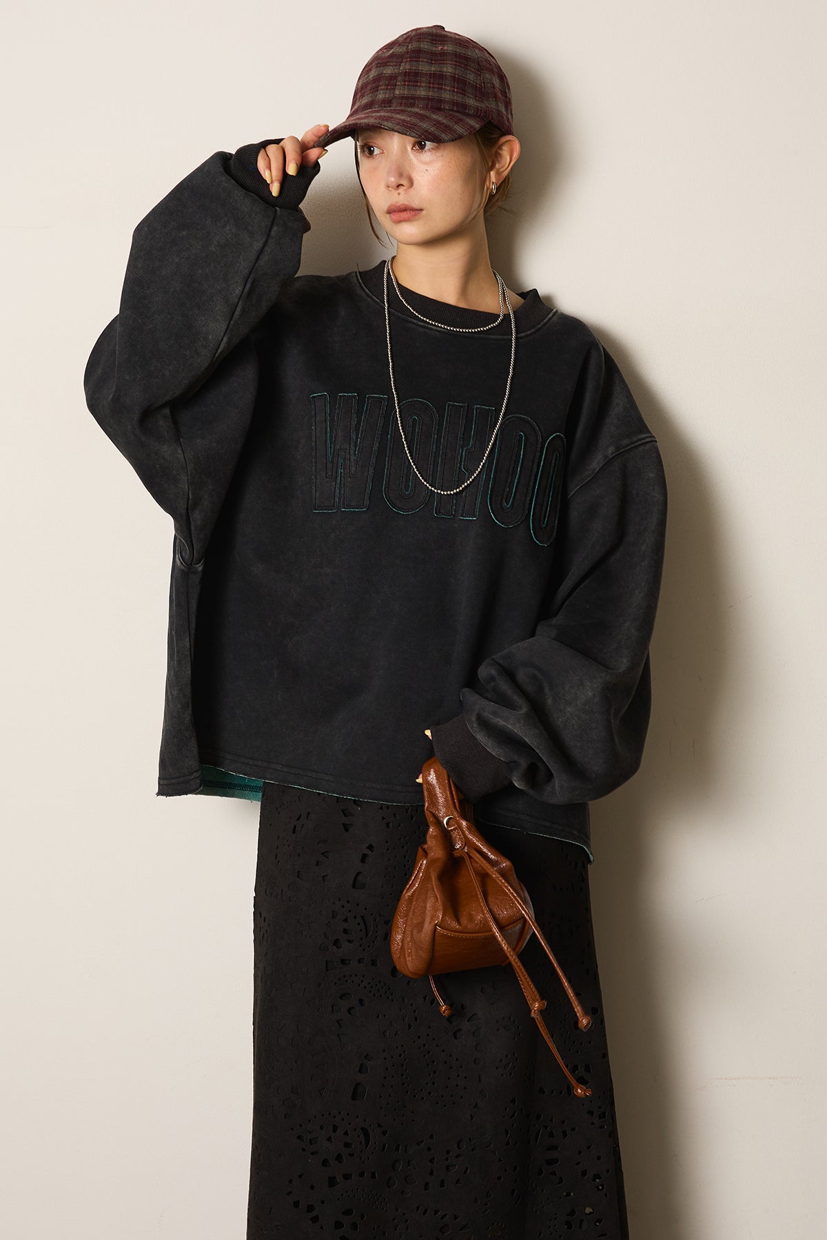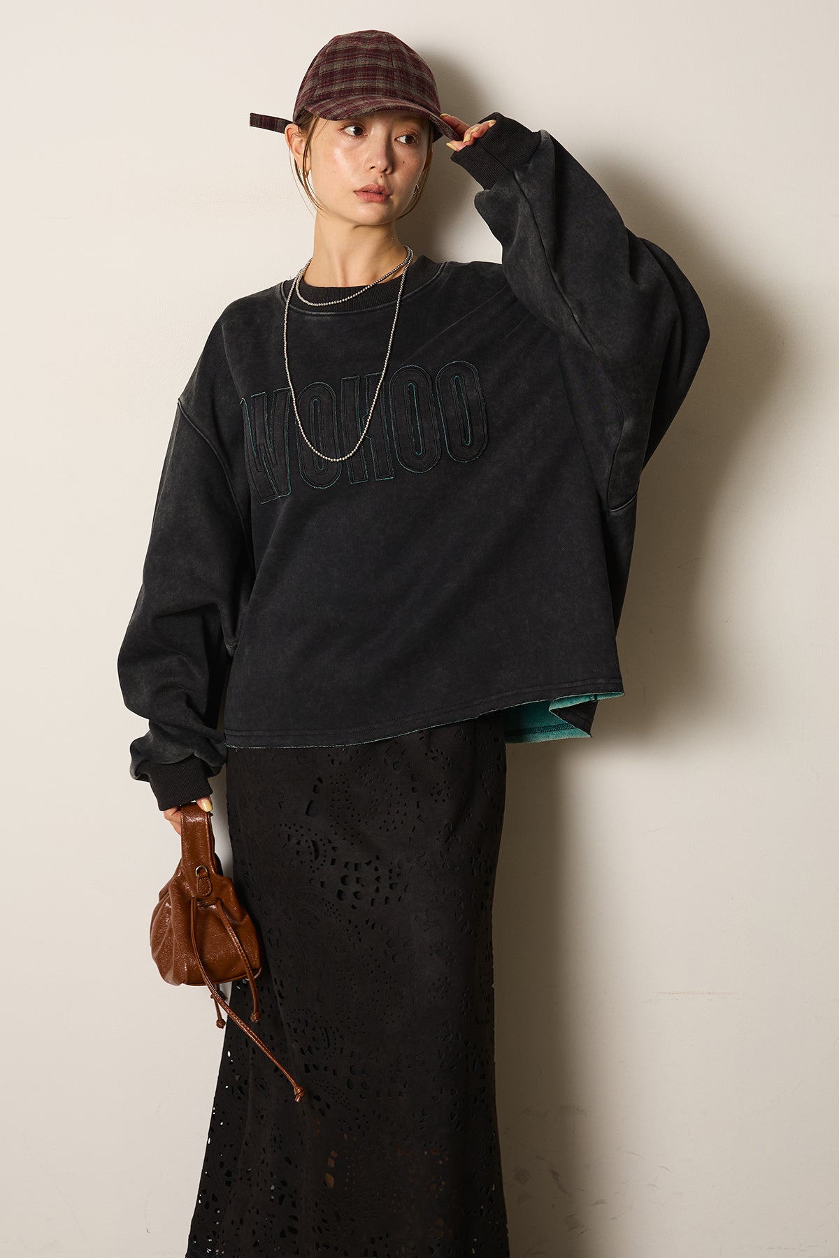 ヴィンテージ感漂うピグメント加工を施したロゴスウェット。立体的な配色ロゴがアクセントとなり、カジュアルスタイルを格上げします。ゆったりとしたシルエットでリラックス感があり、デニムやスカートなど幅広いアイテムと相性抜群の一枚です。