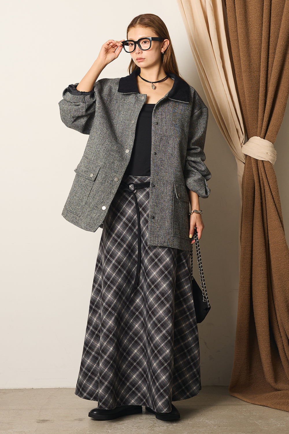 [SET]襟コーデュロイツイードカバーオール+ベルト付きタータンチェック柄スカート(2set)