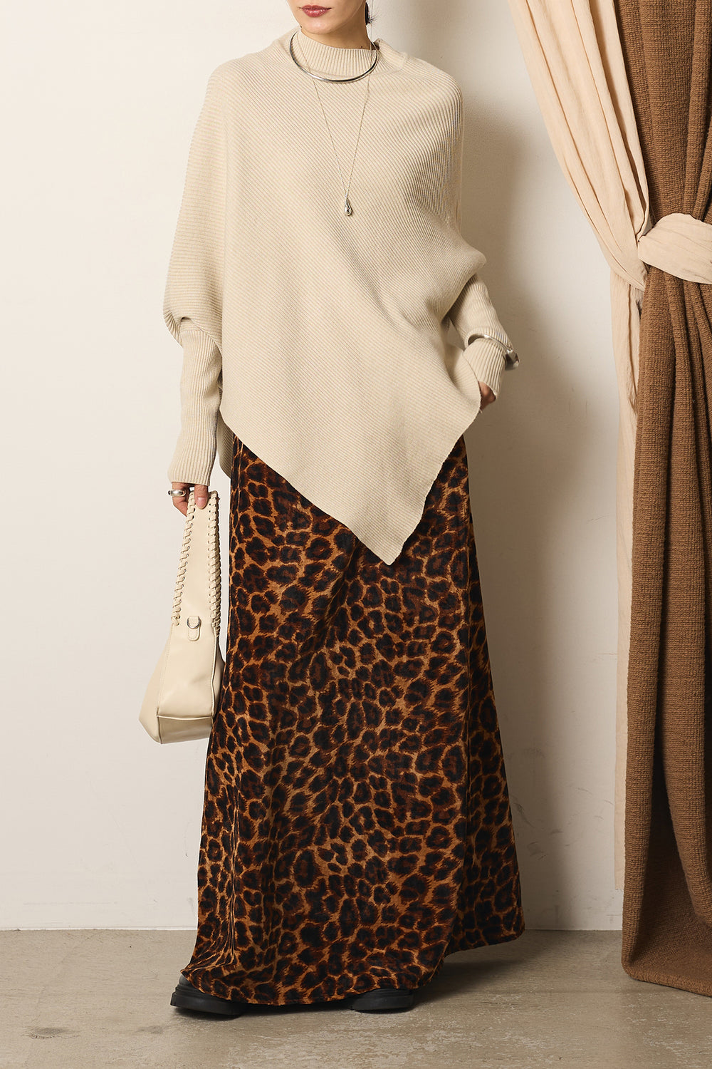 [SET]裾アシメデザインニットトップス+レオパード柄ワイドスカート(2set)