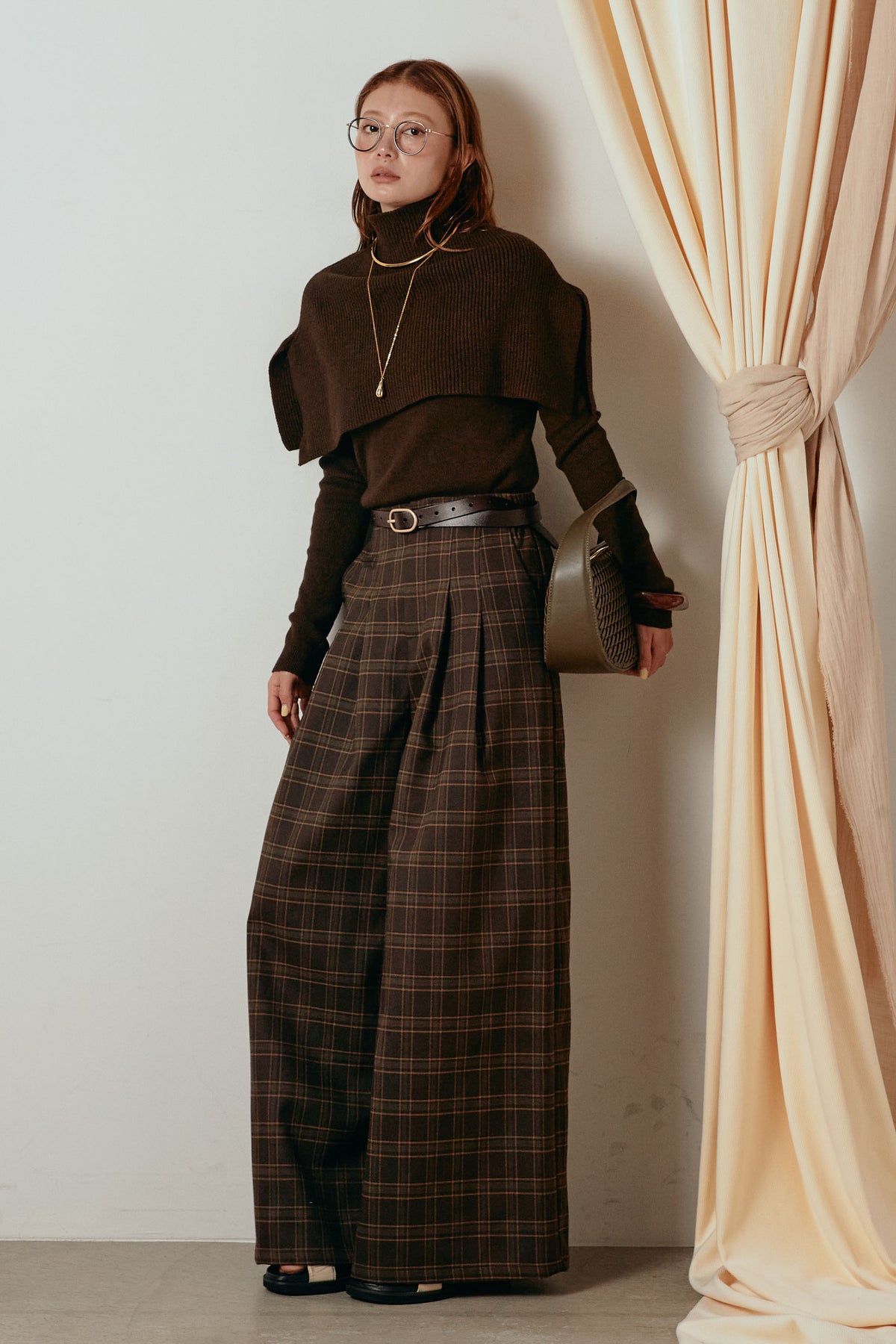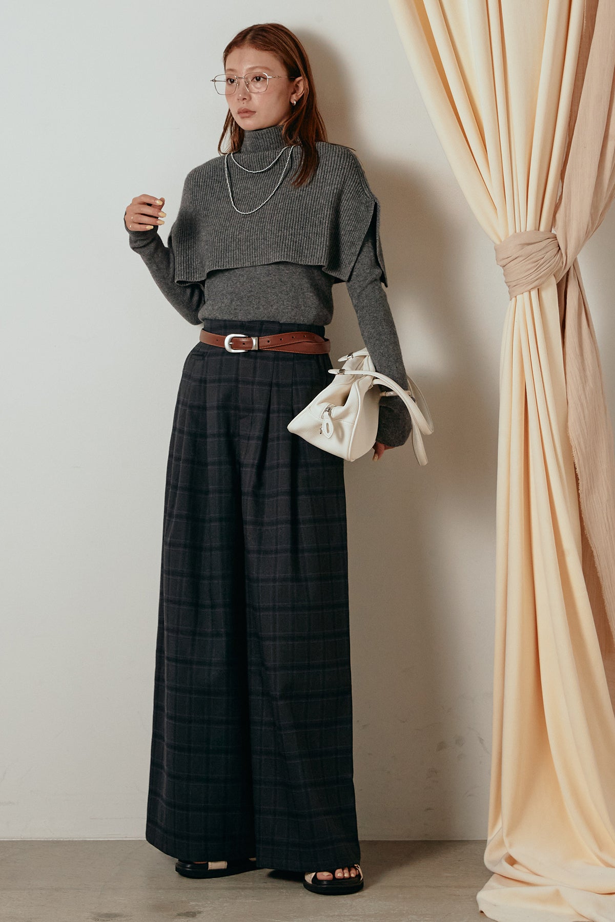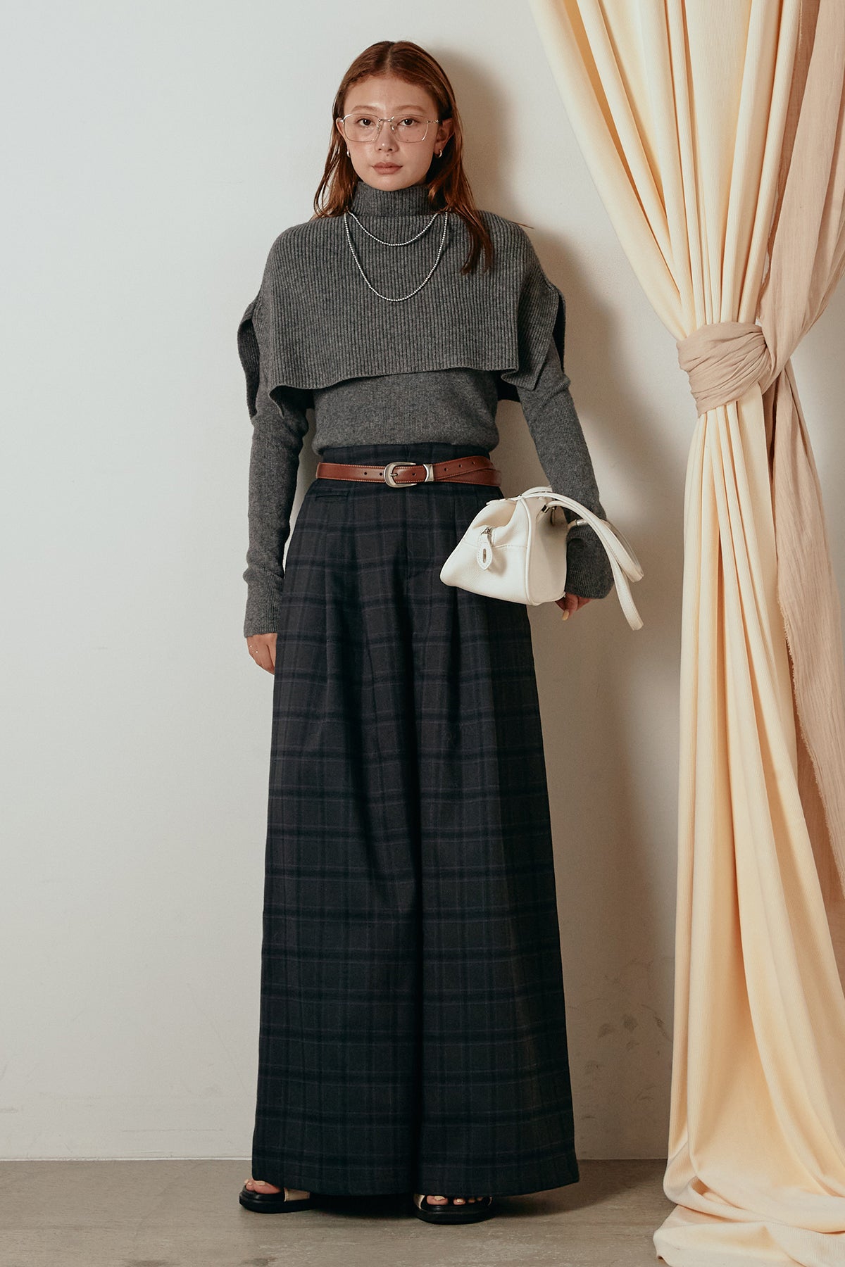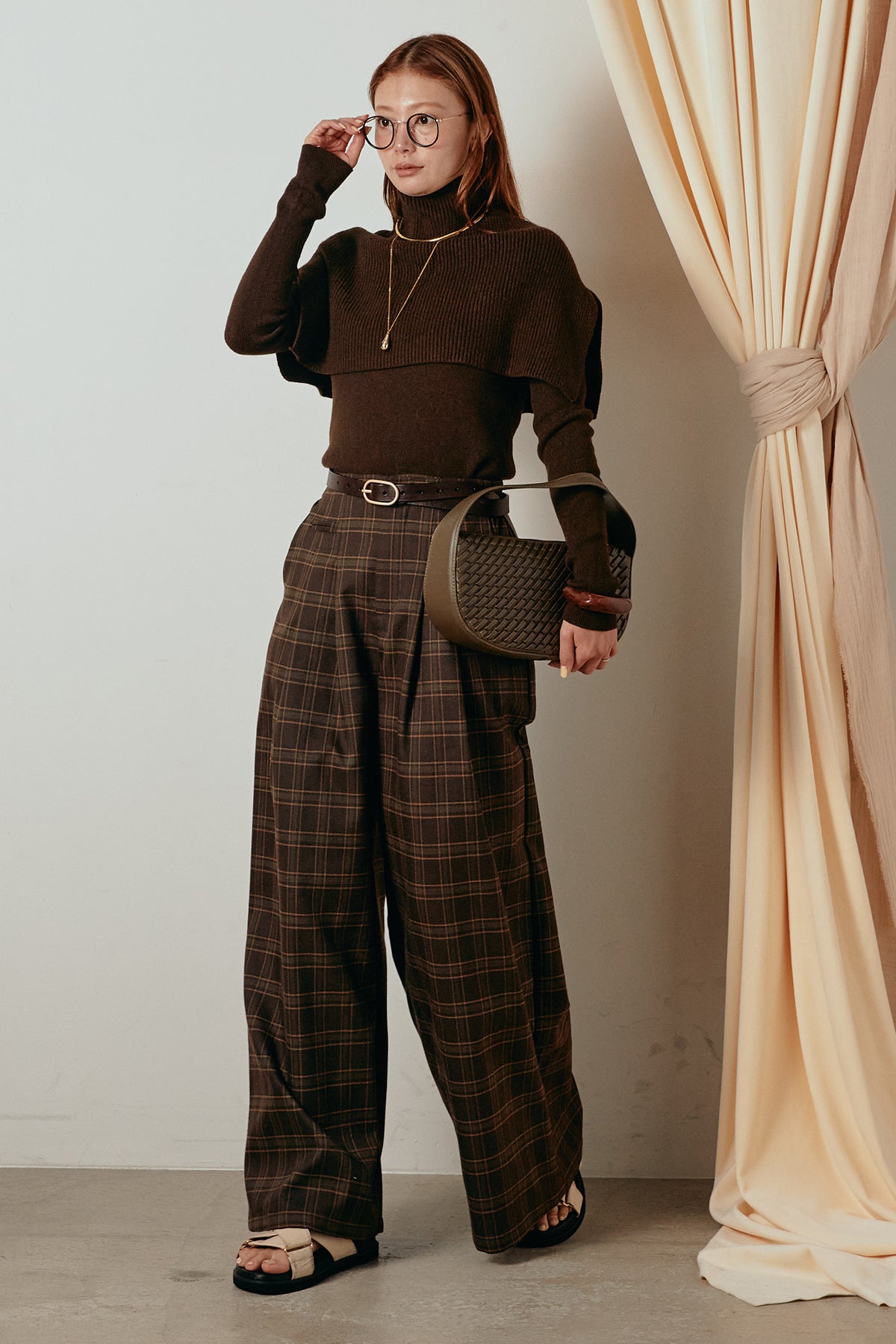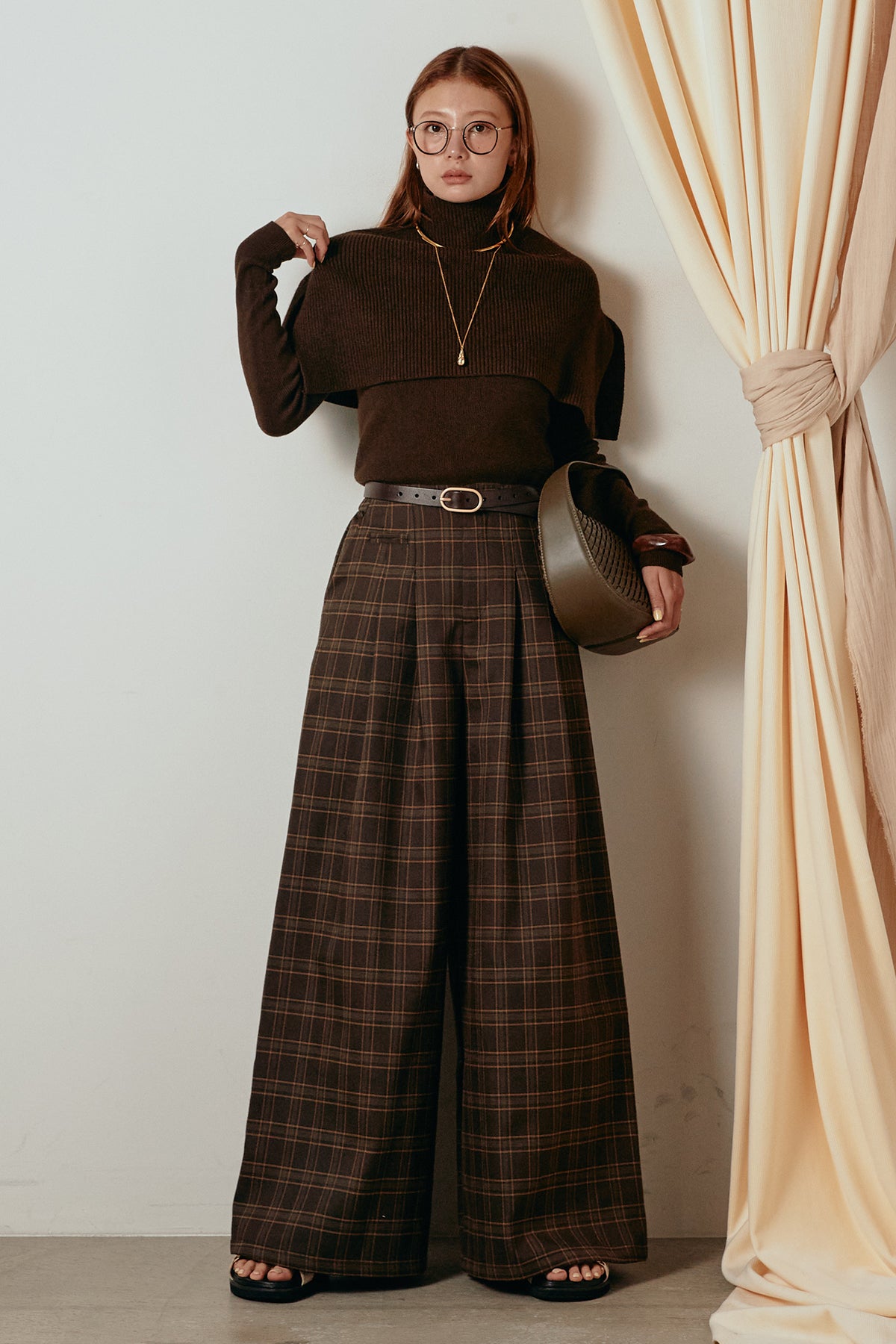 [SET]ケープデザインニットトップス+タータンチェック柄くすみワイドパンツ(2set)