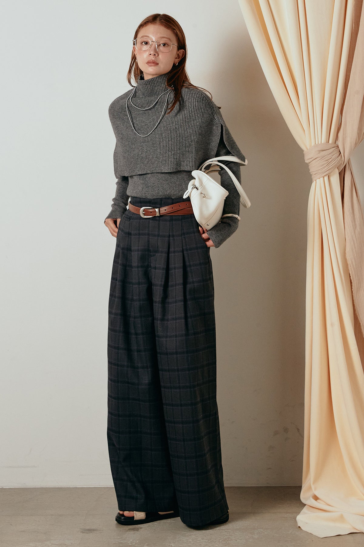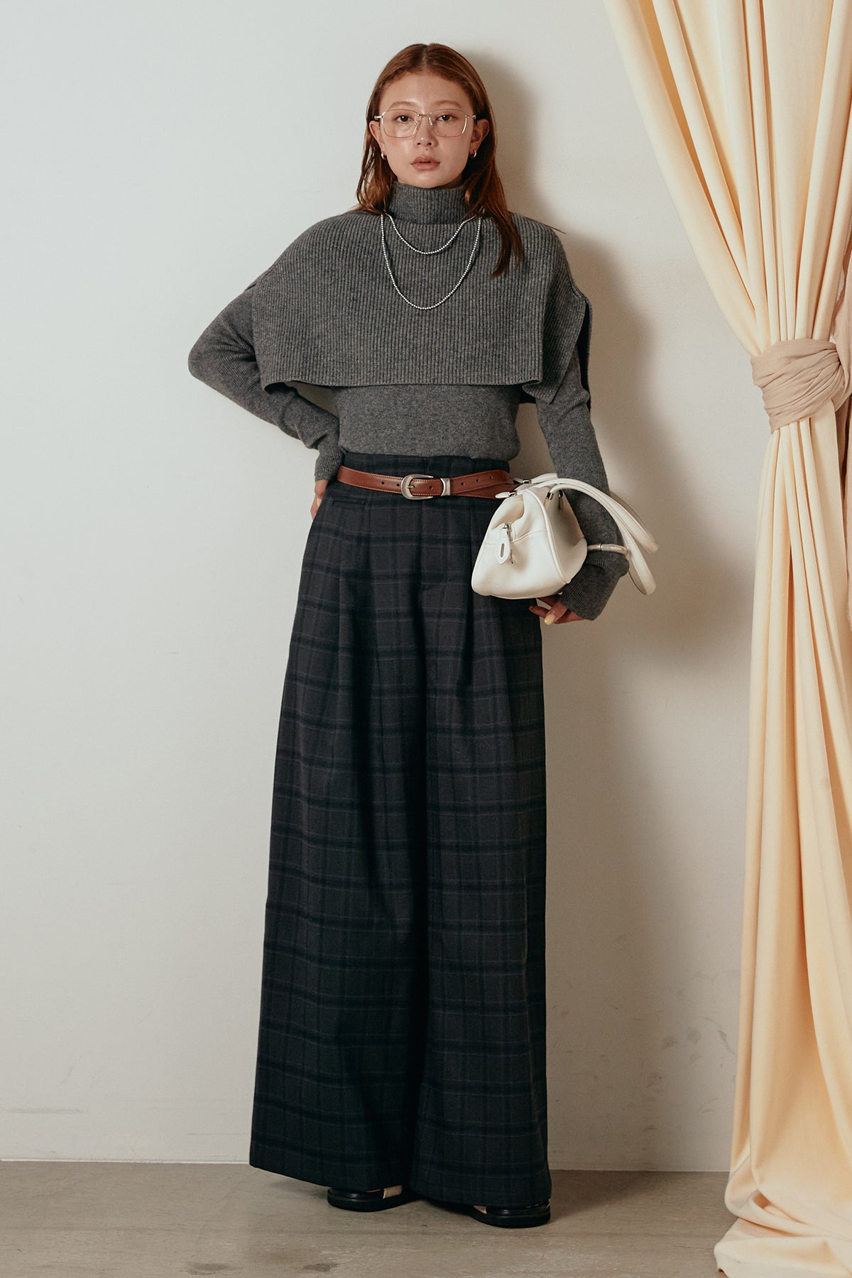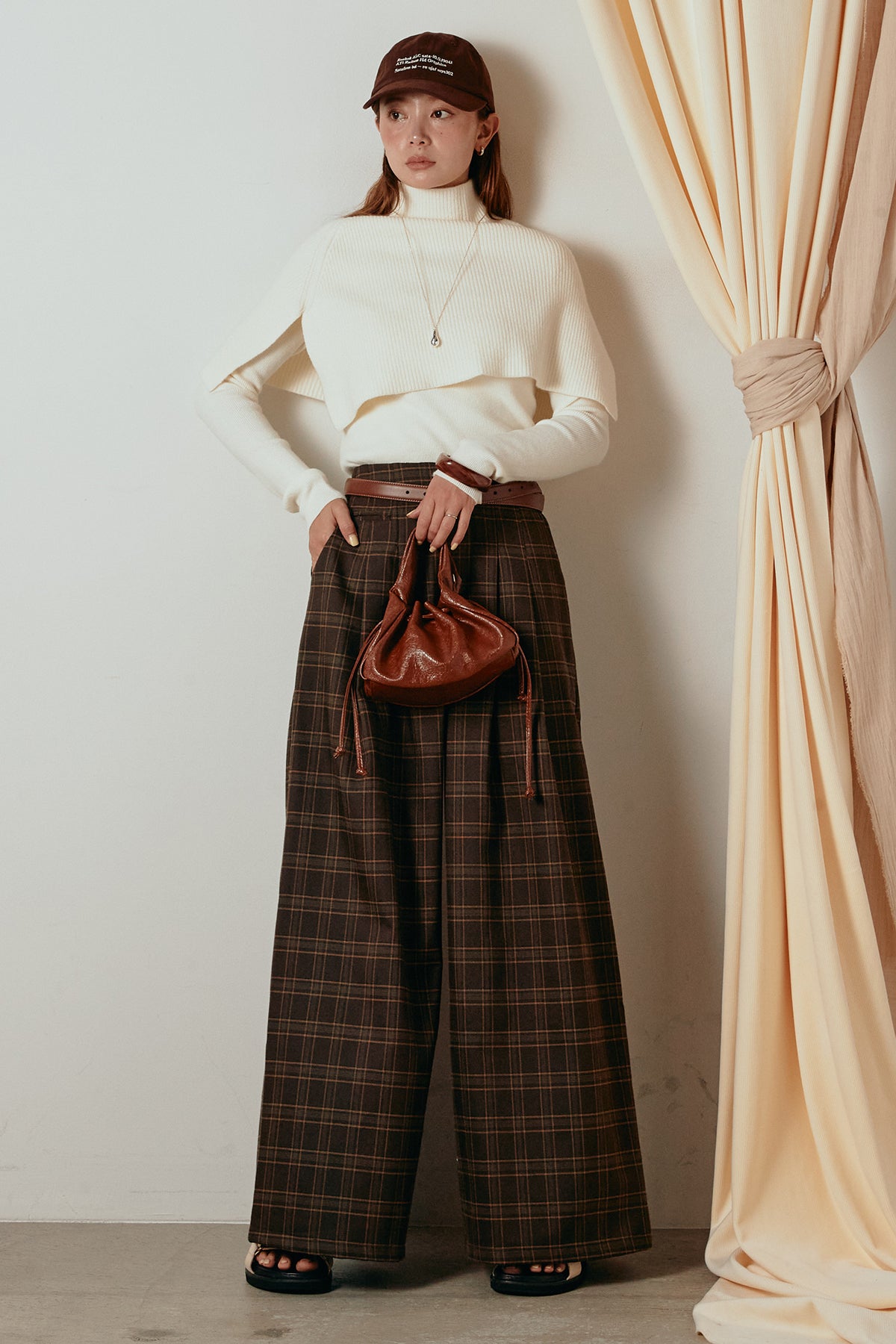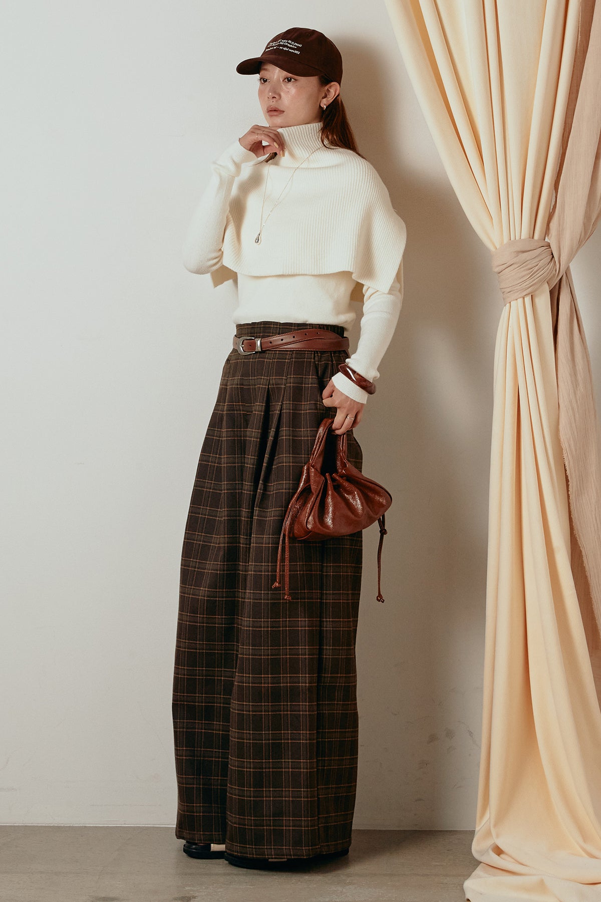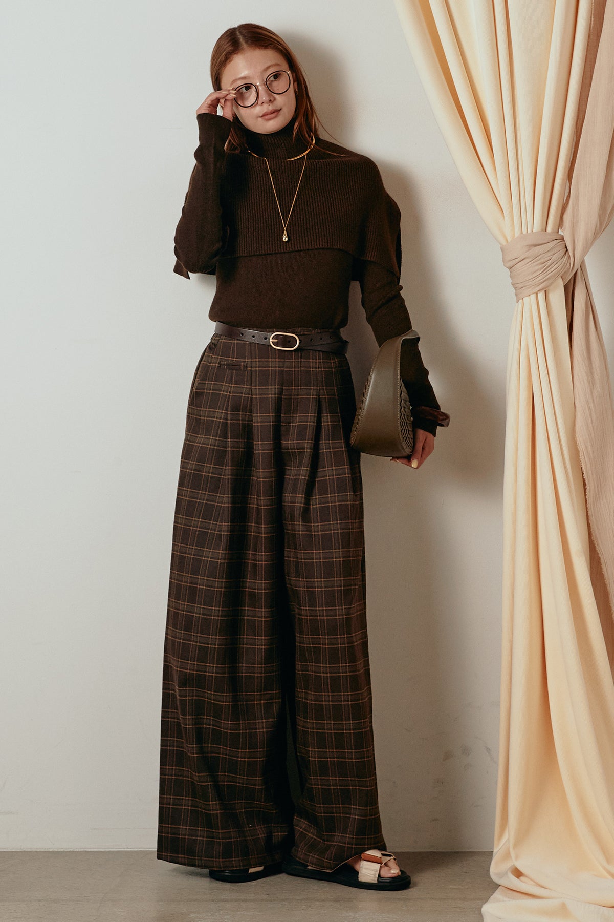 [SET]ケープデザインニットトップス+タータンチェック柄くすみワイドパンツ(2set)