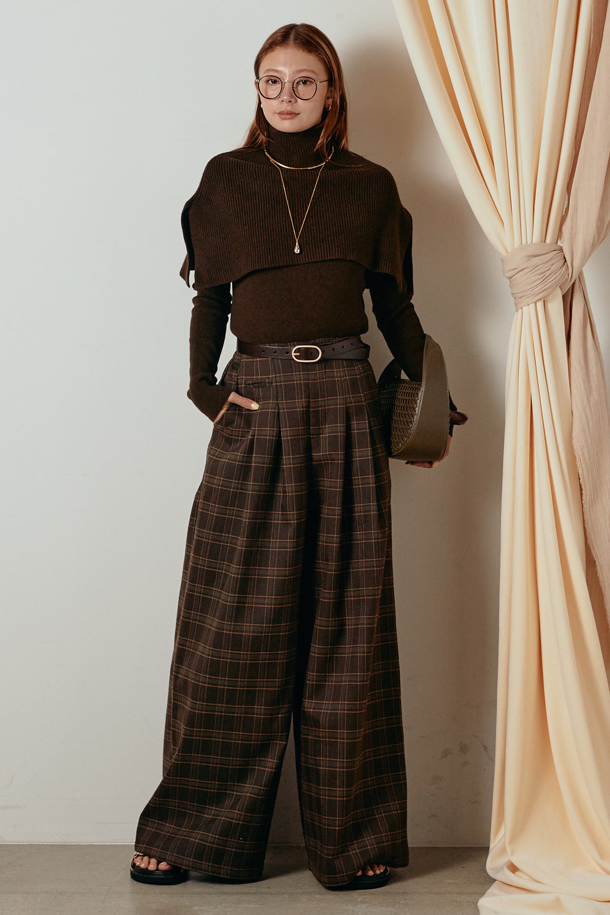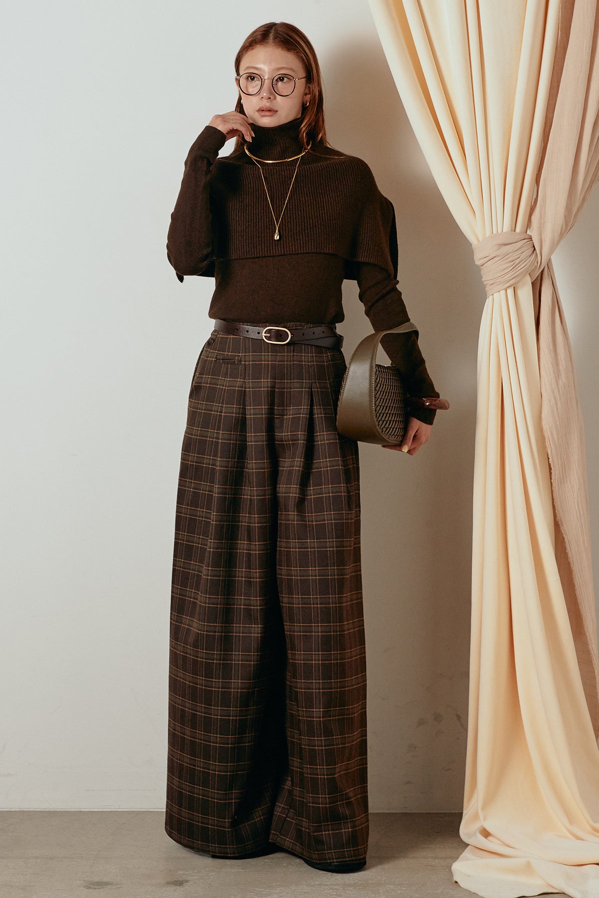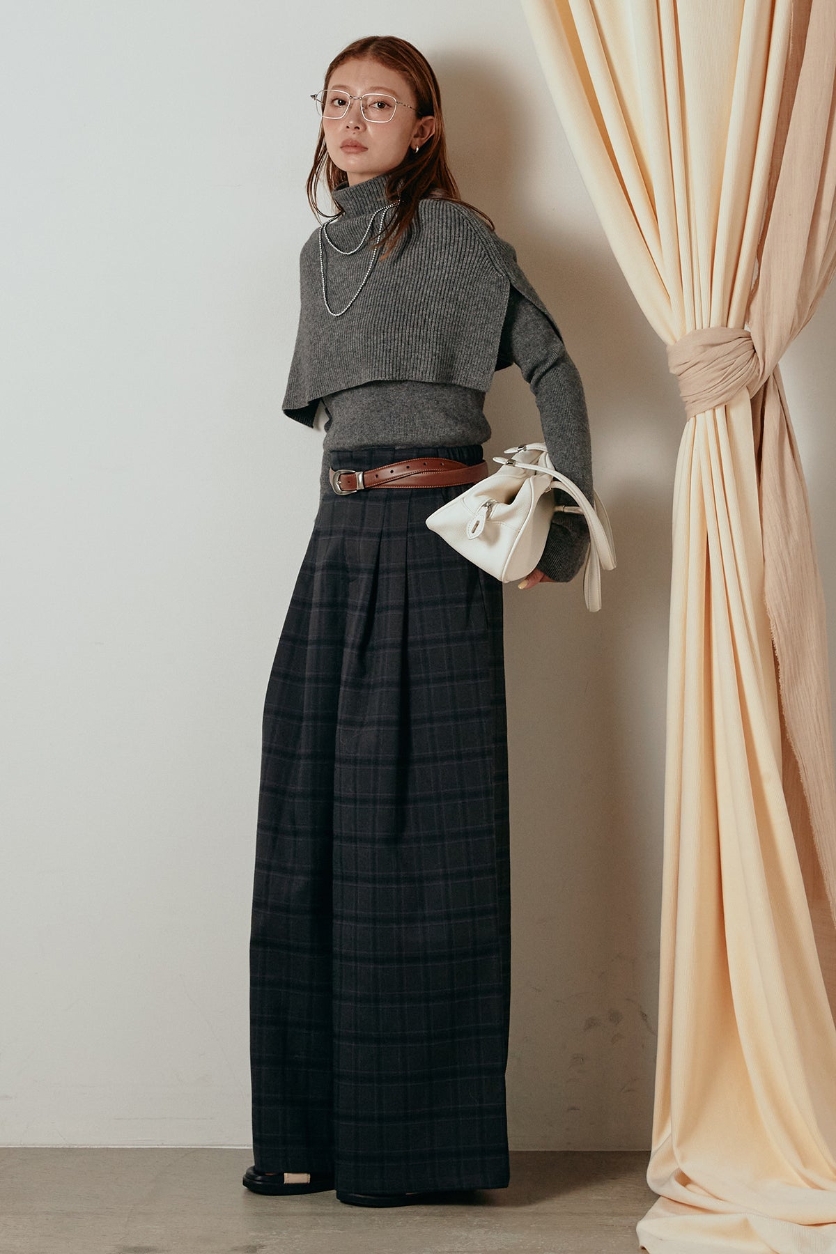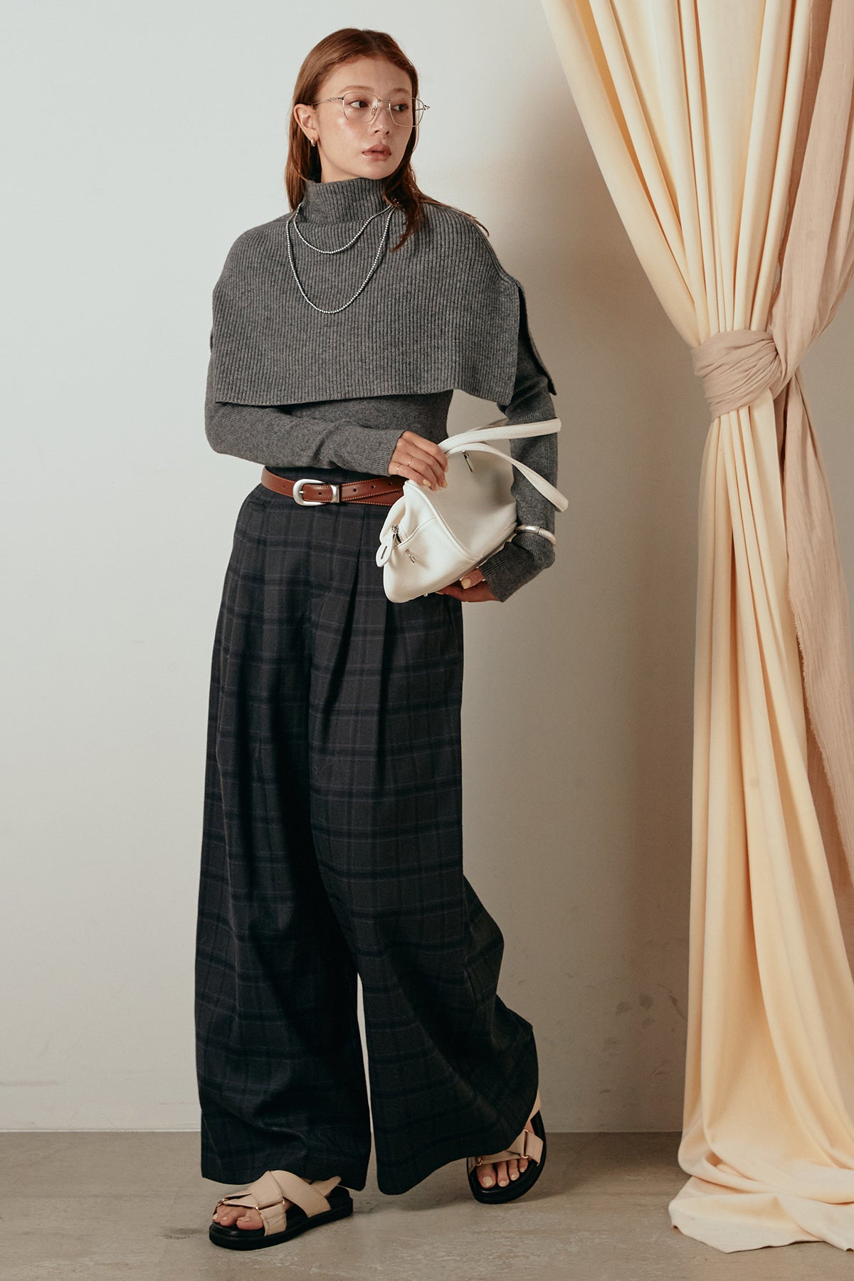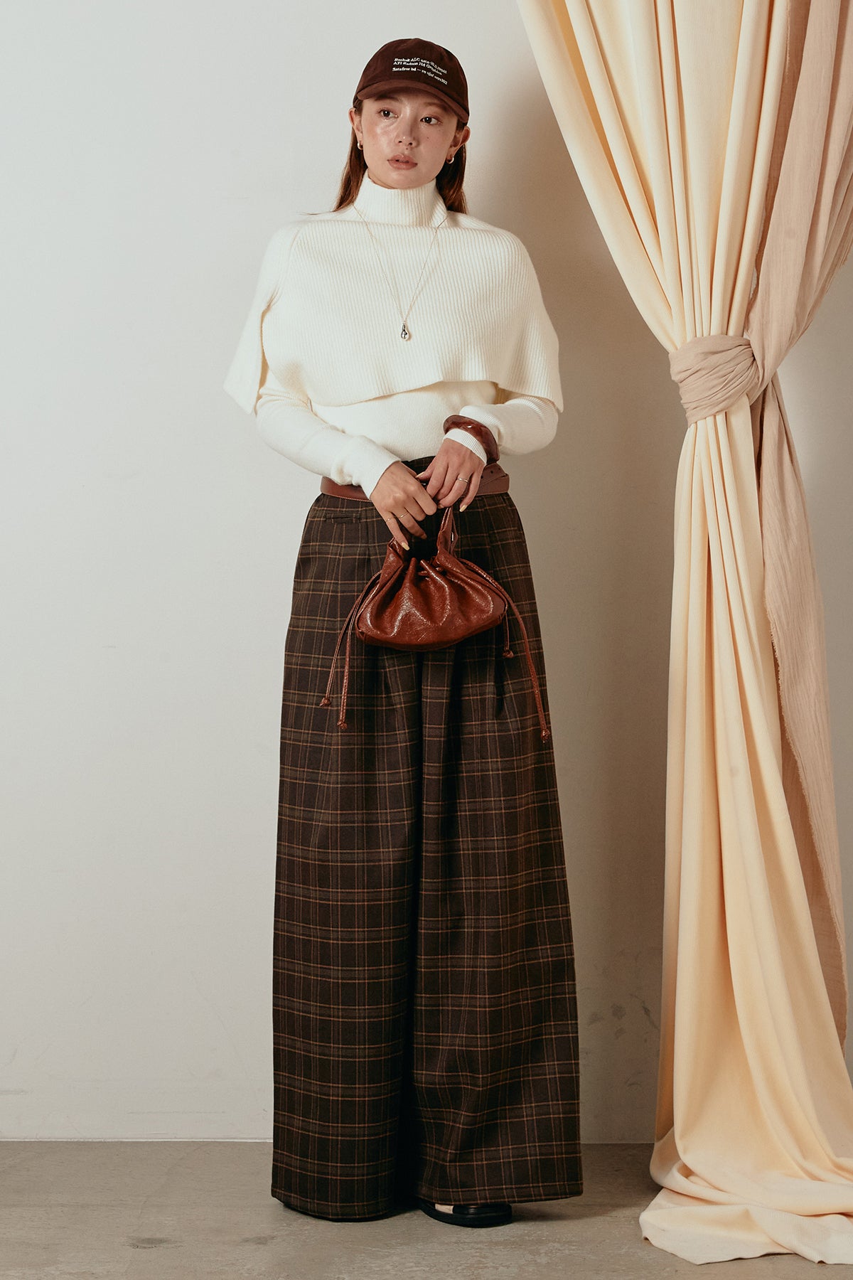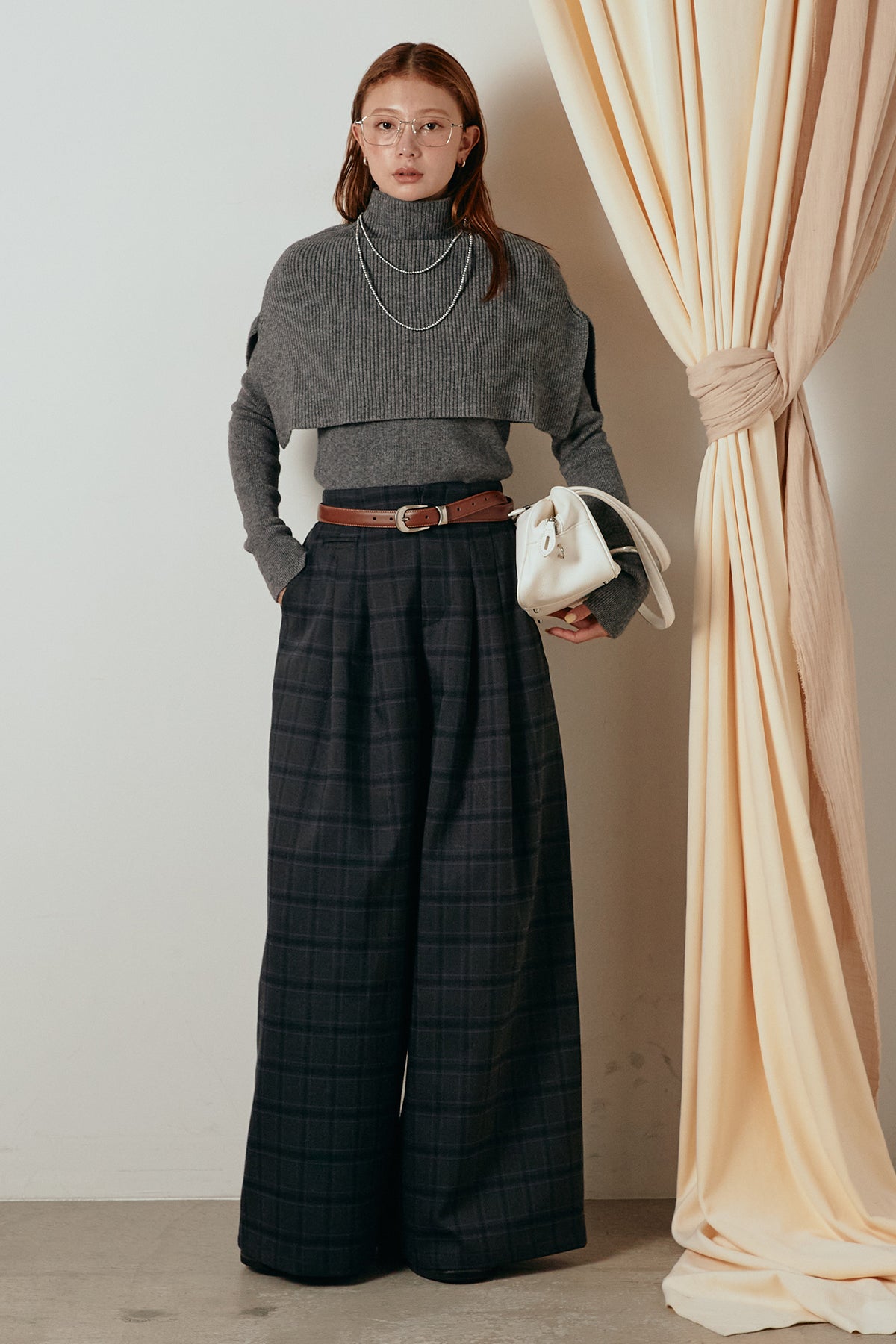 [SET]ケープデザインニットトップス+タータンチェック柄くすみワイドパンツ(2set)