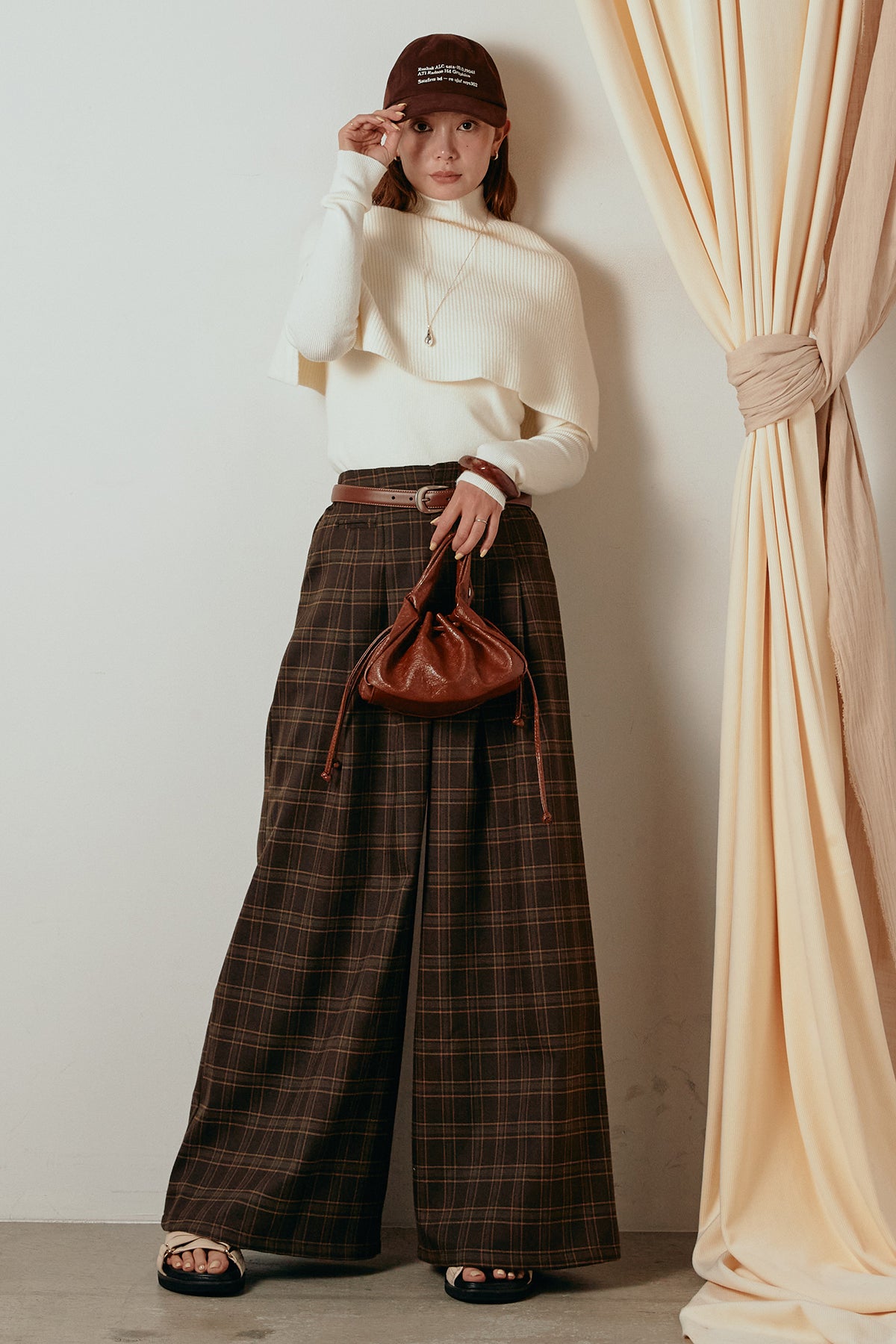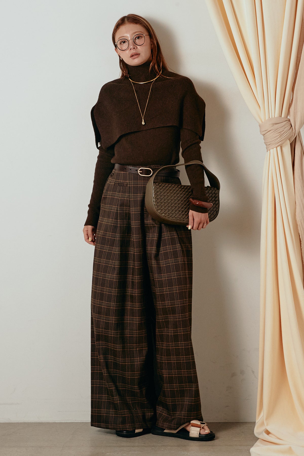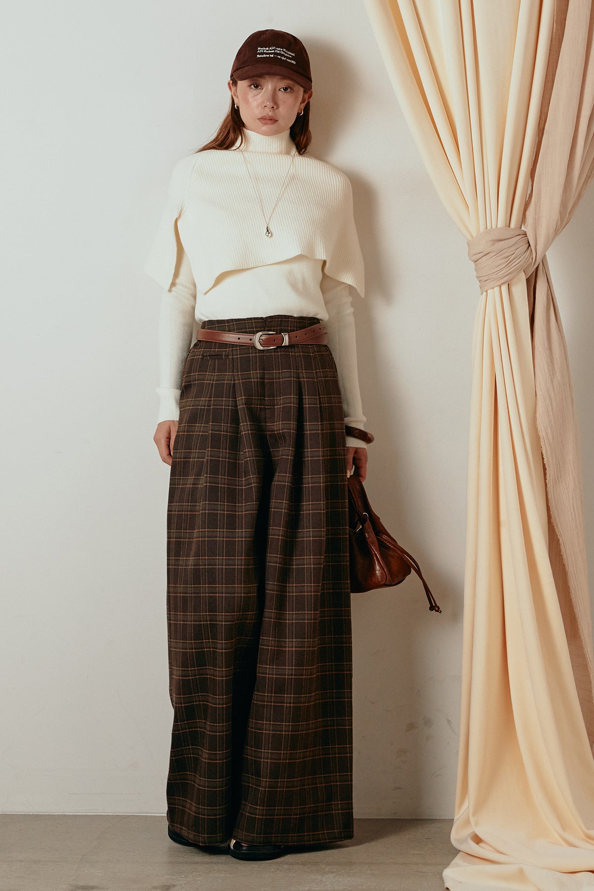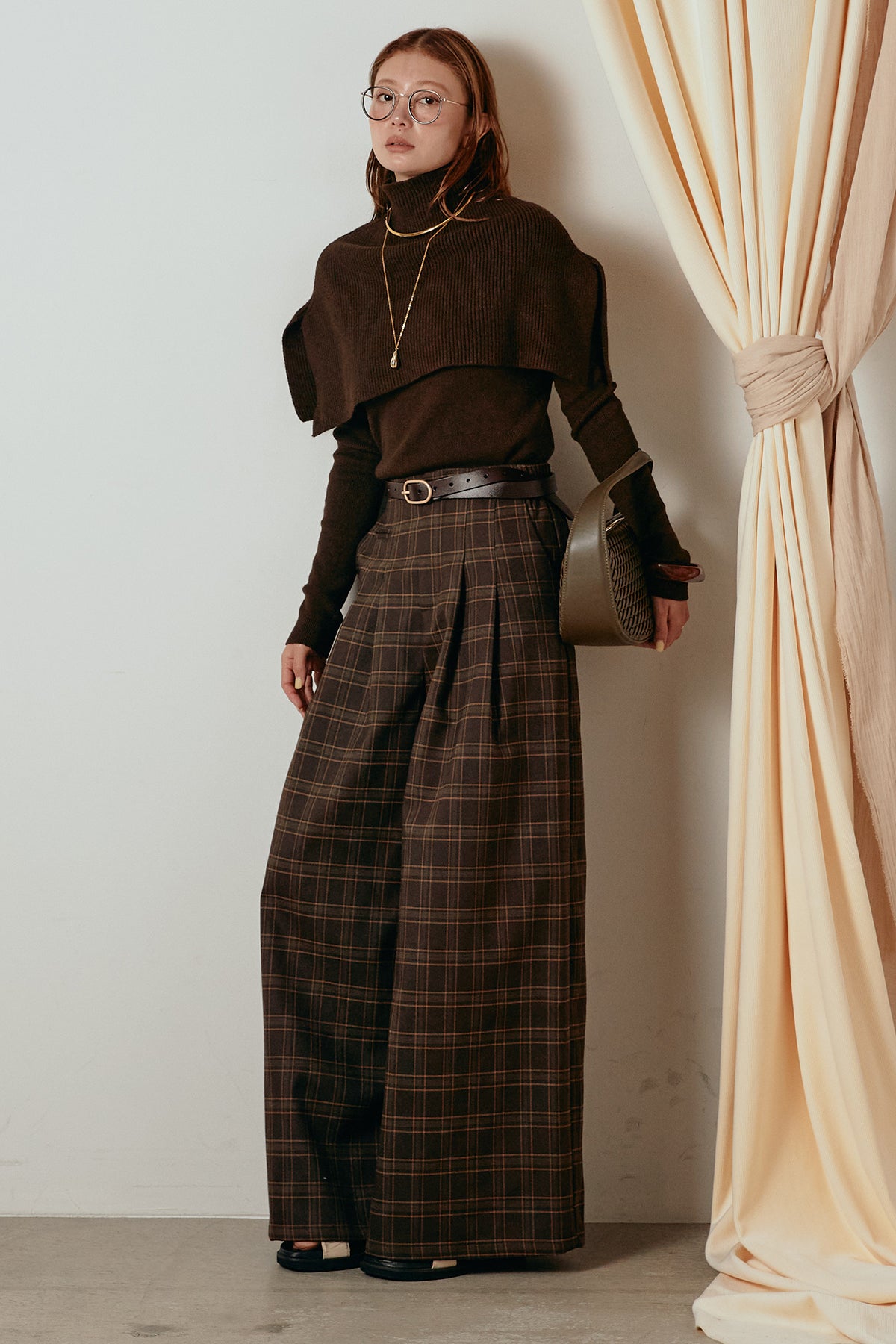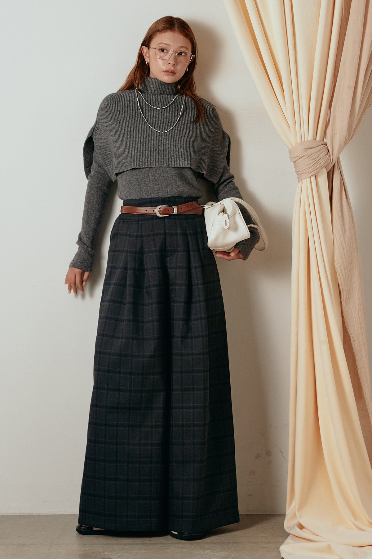 [SET]ケープデザインニットトップス+タータンチェック柄くすみワイドパンツ(2set)