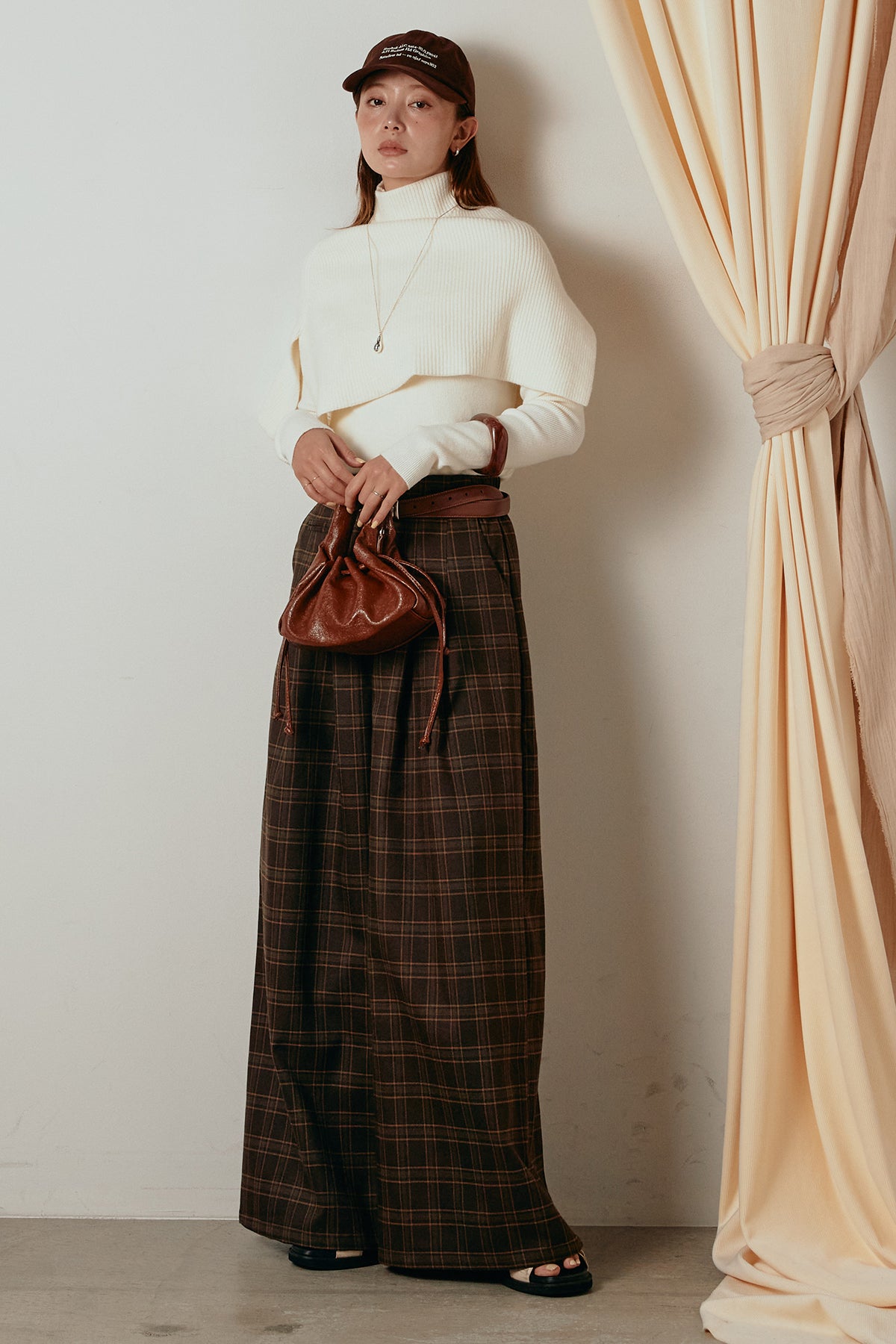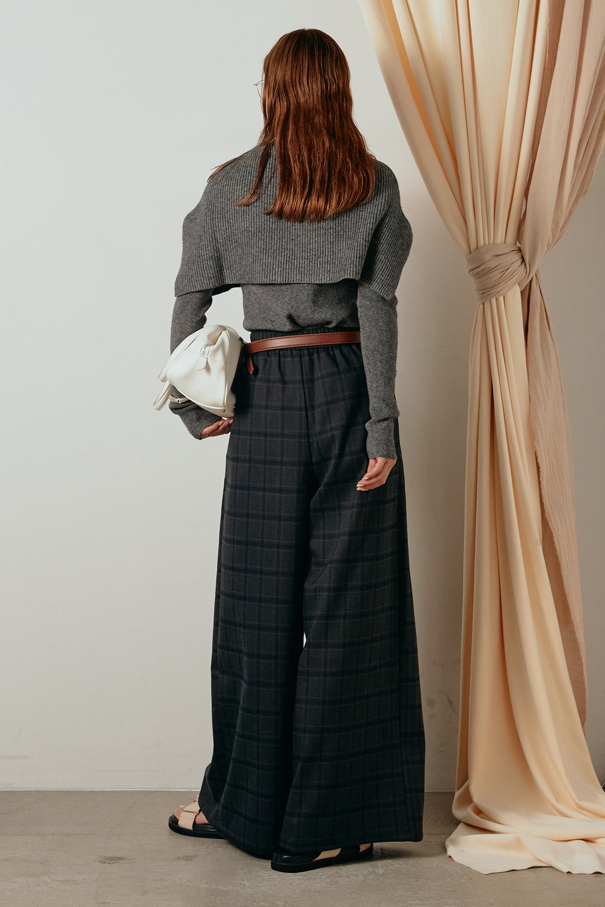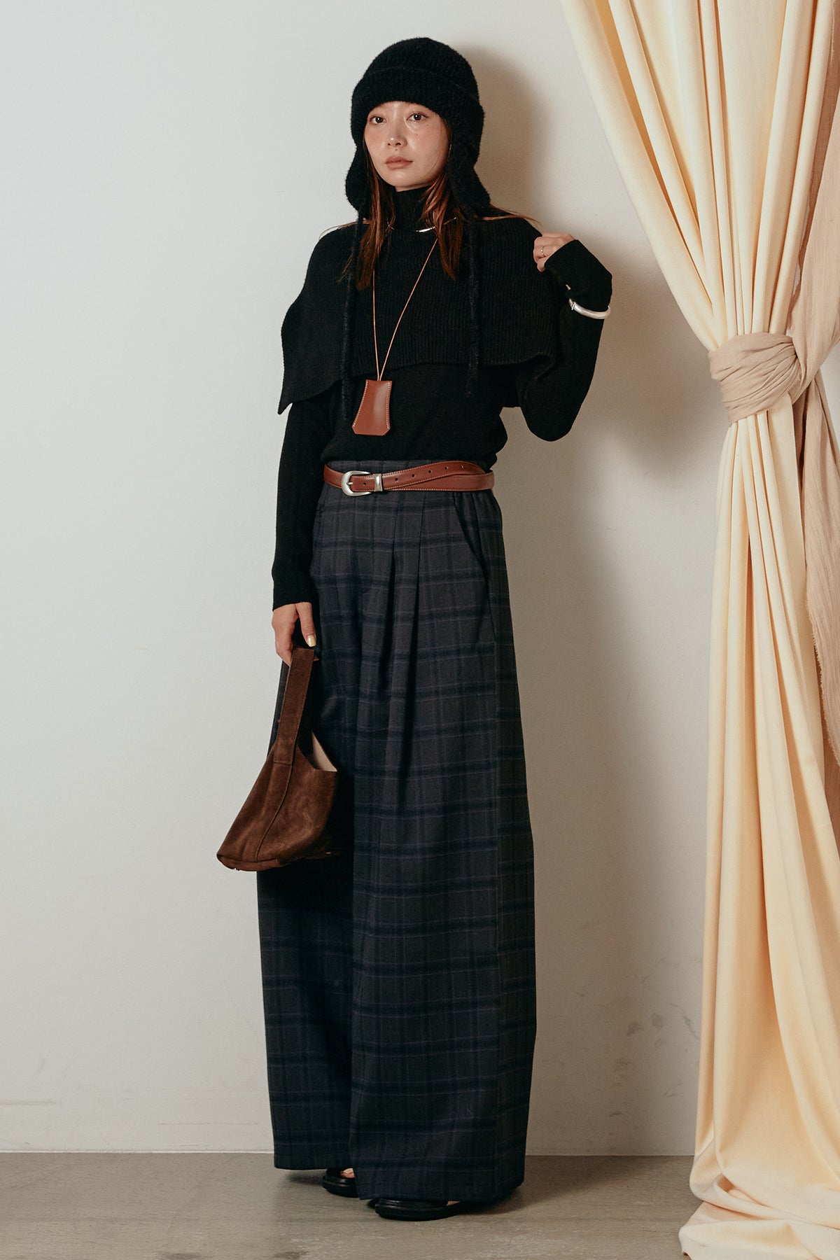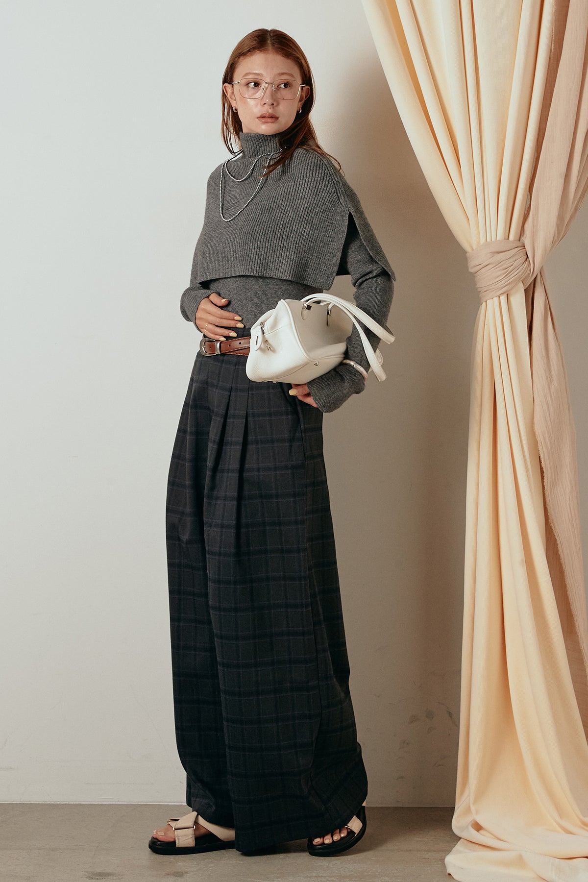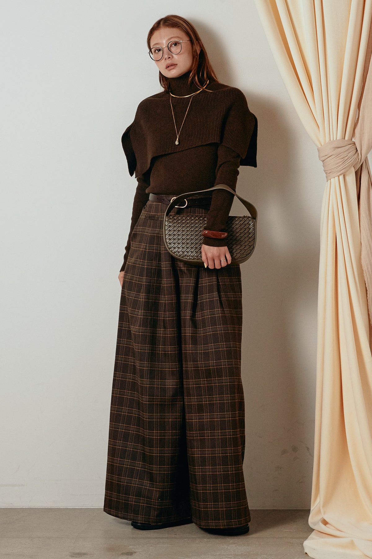 [SET]ケープデザインニットトップス+タータンチェック柄くすみワイドパンツ(2set)