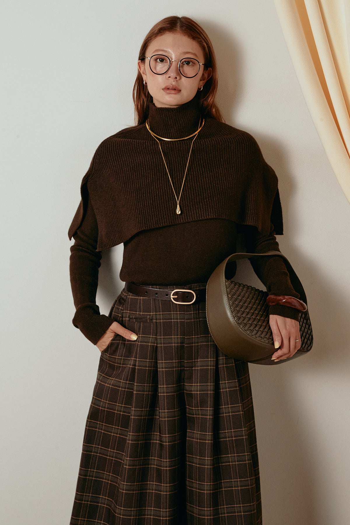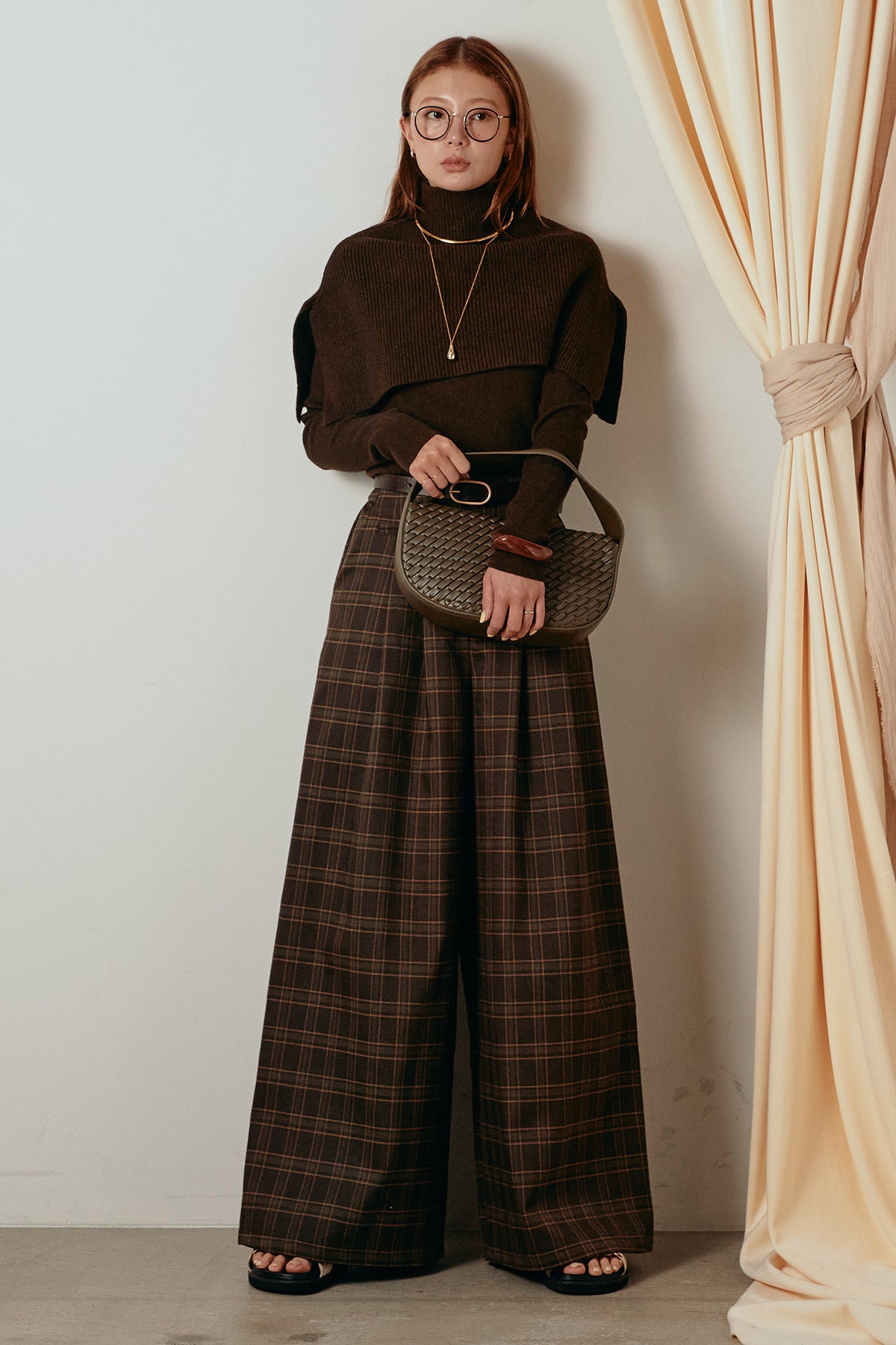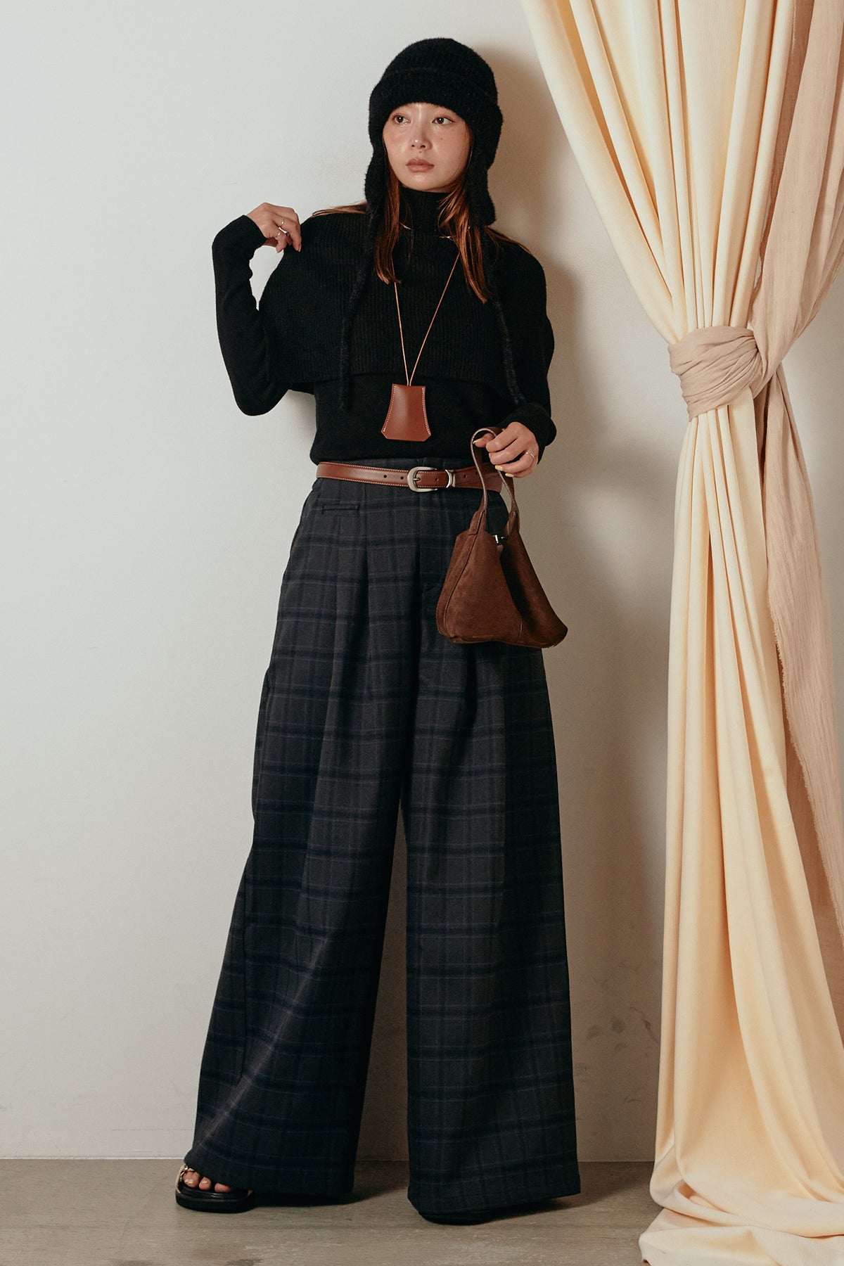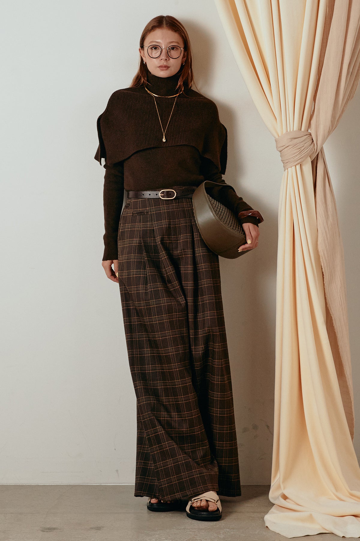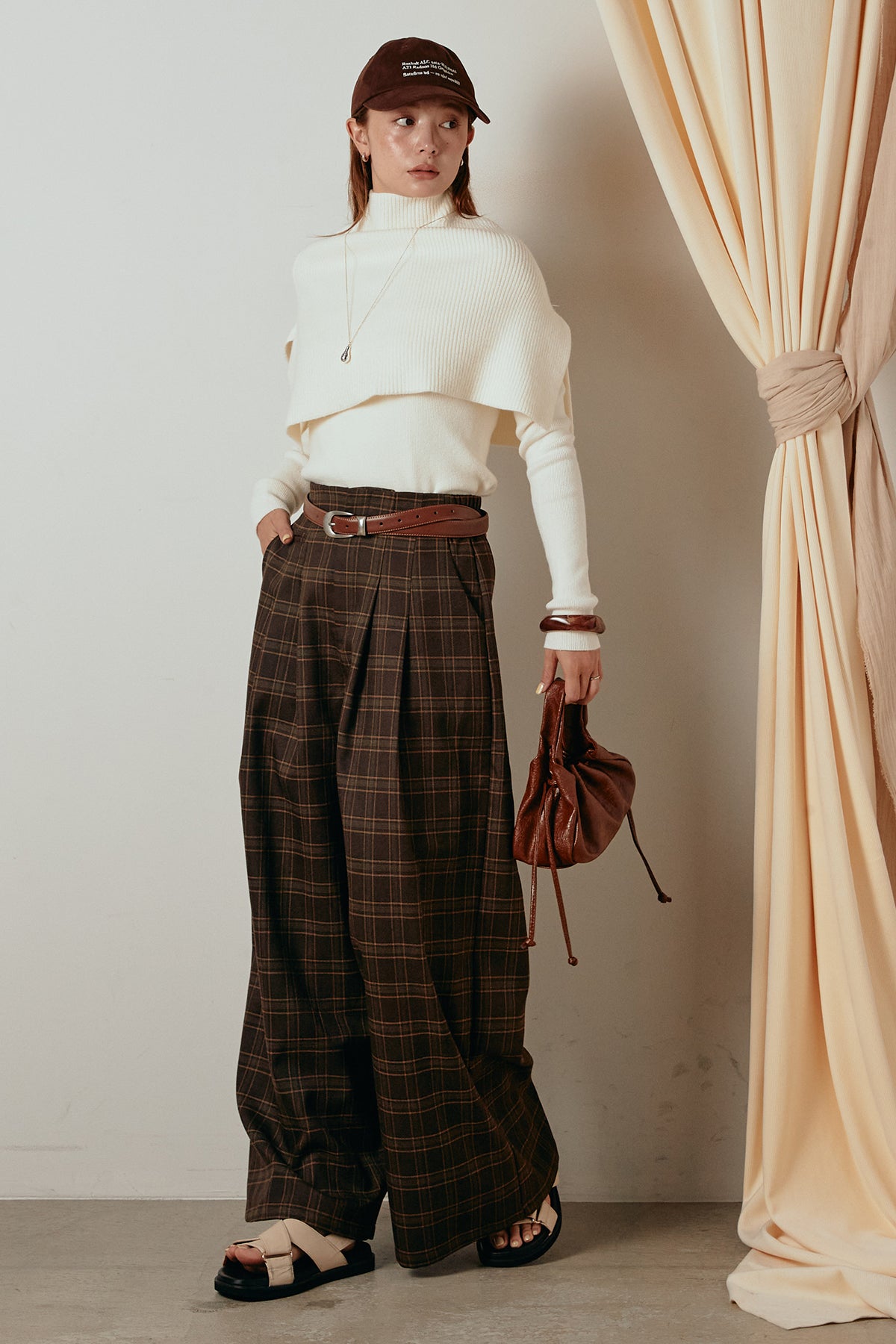 [SET]ケープデザインニットトップス+タータンチェック柄くすみワイドパンツ(2set)