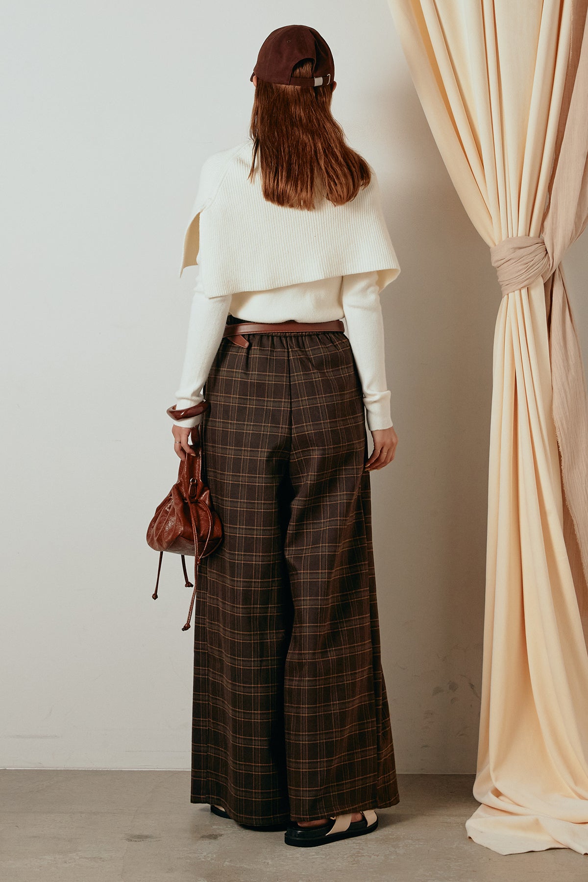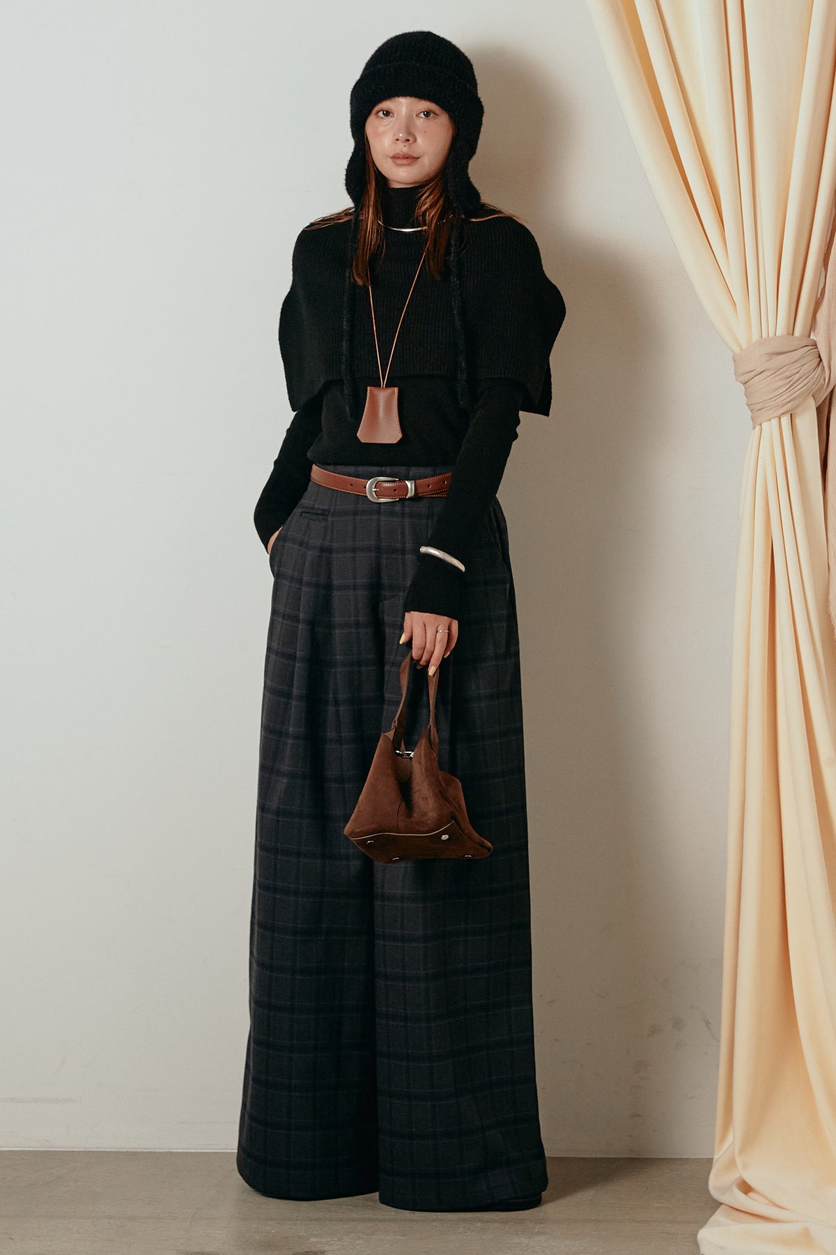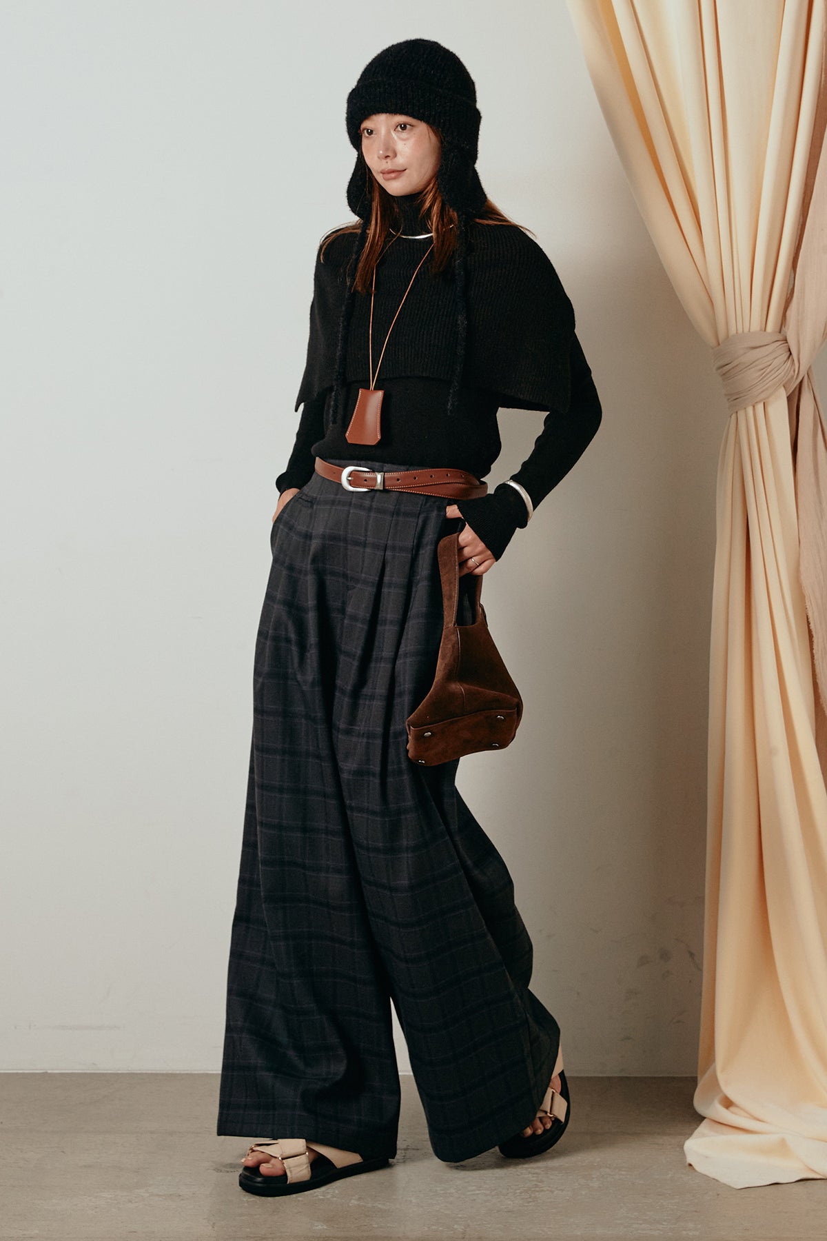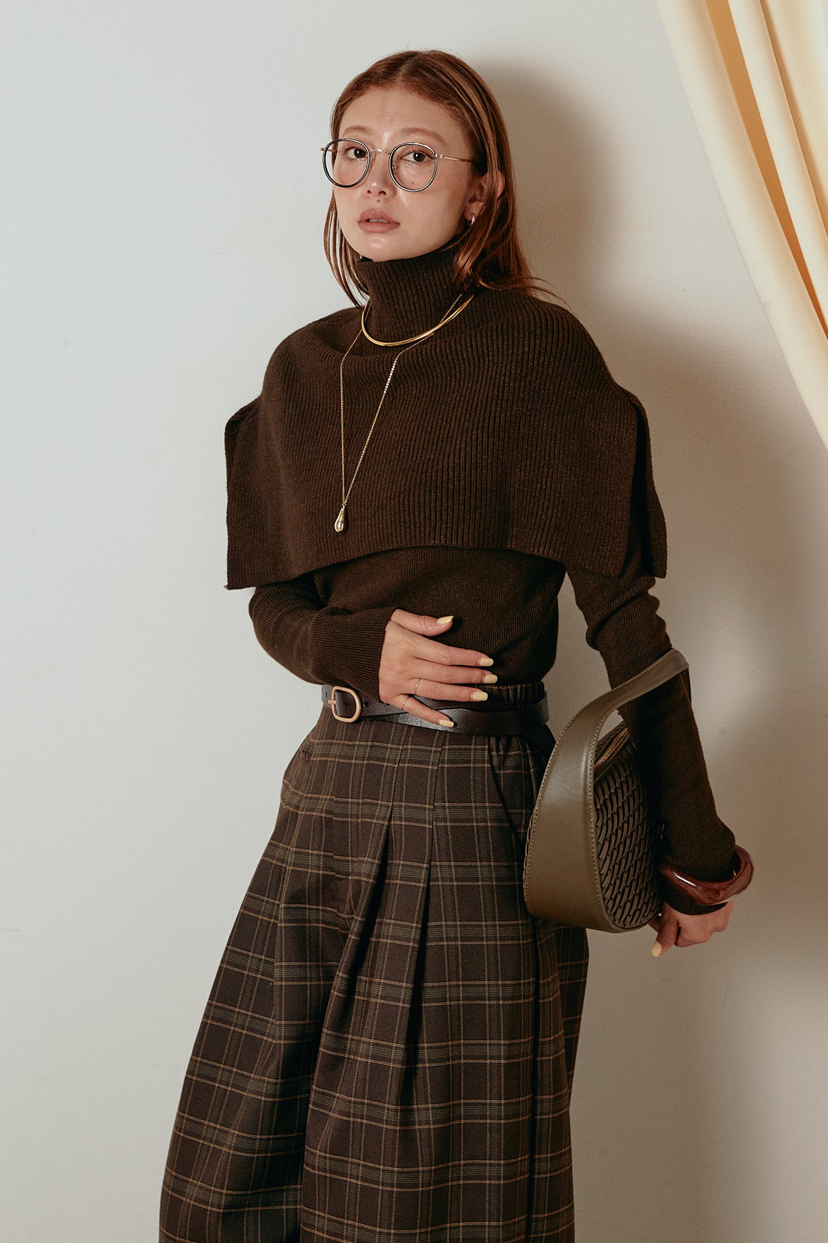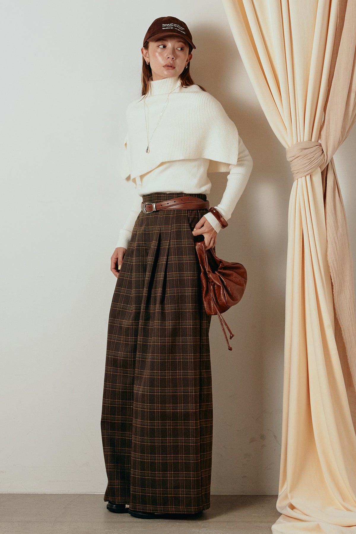 [SET]ケープデザインニットトップス+タータンチェック柄くすみワイドパンツ(2set)