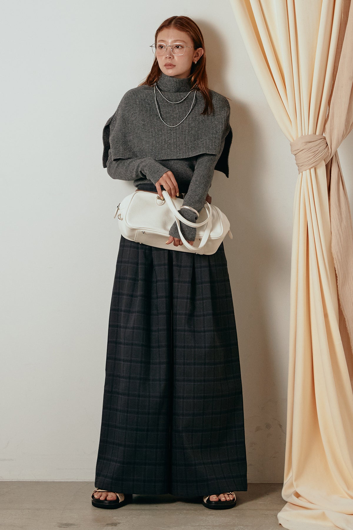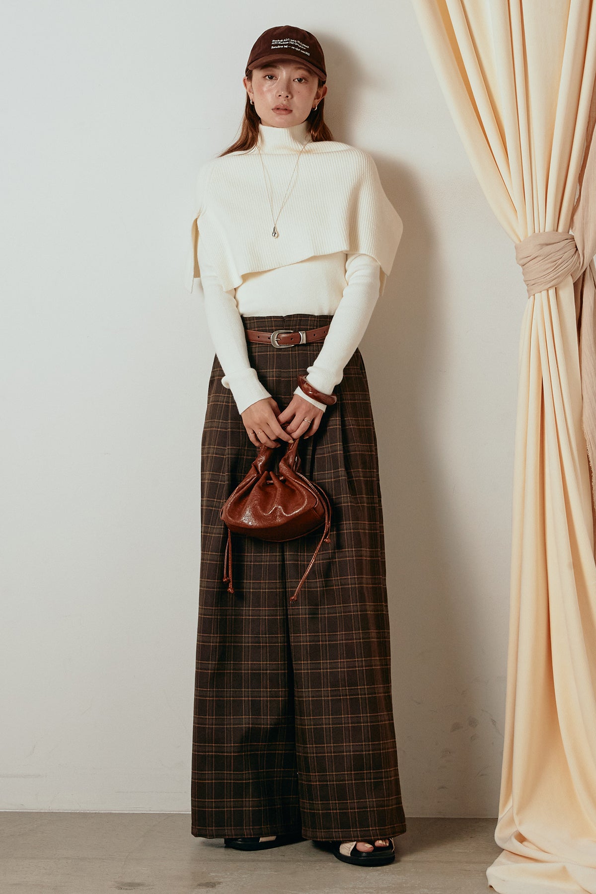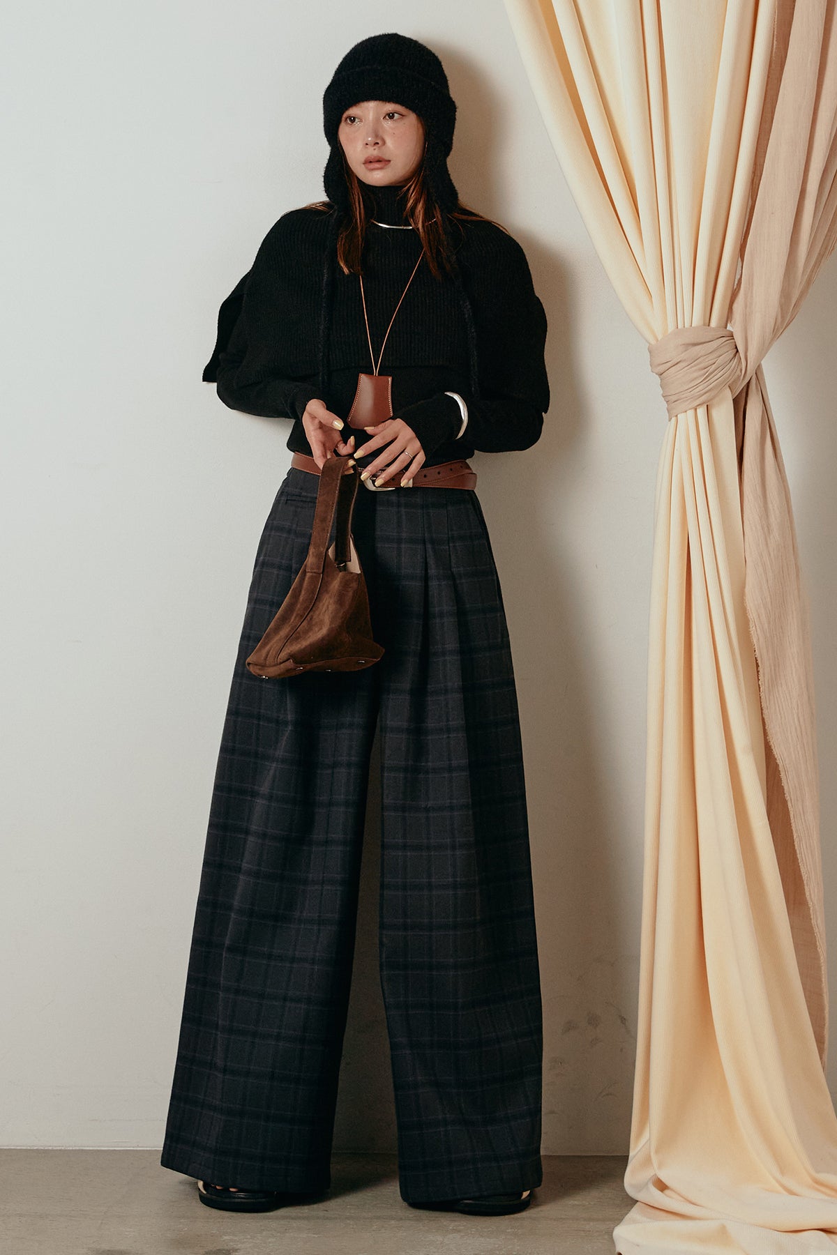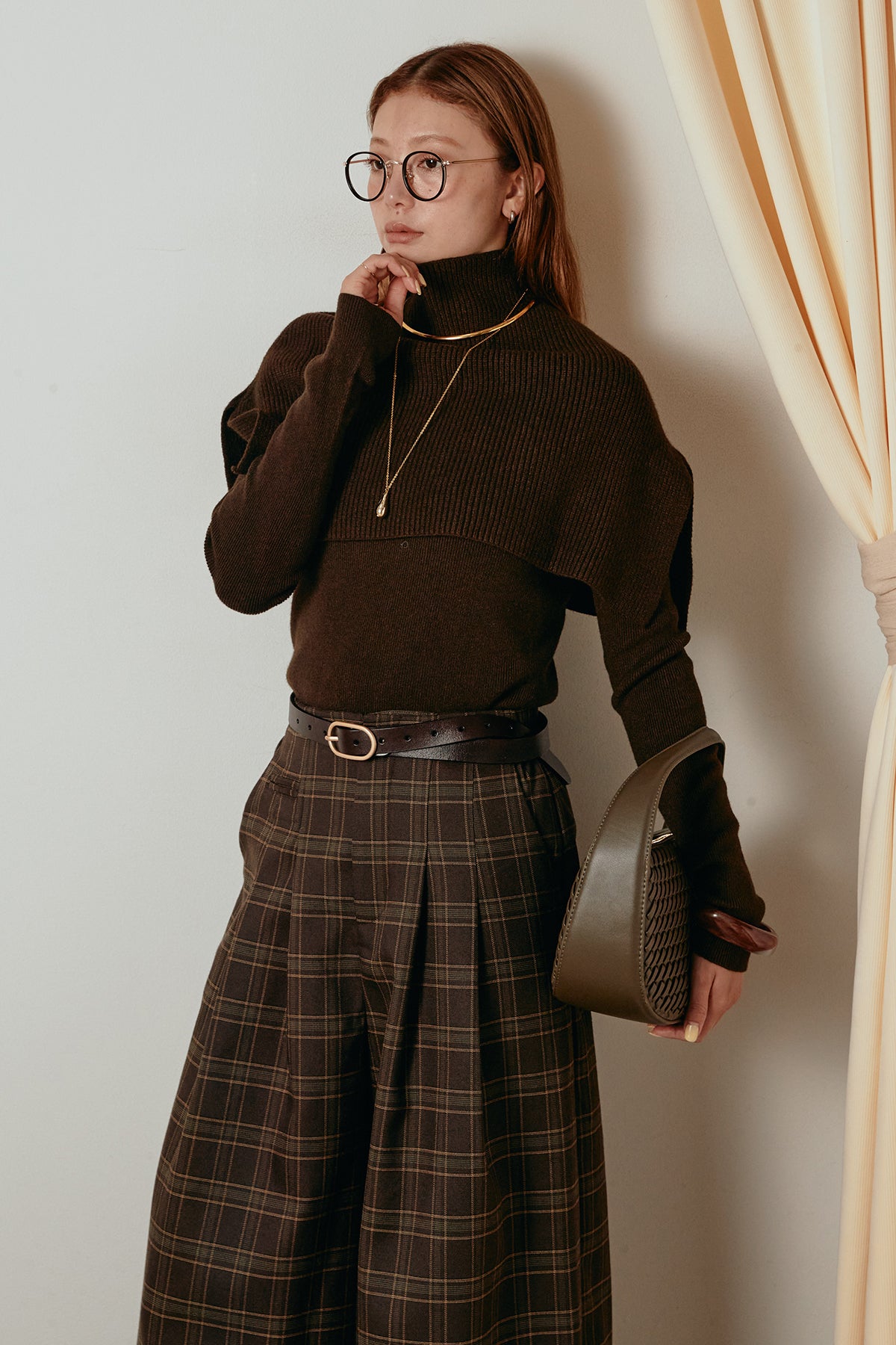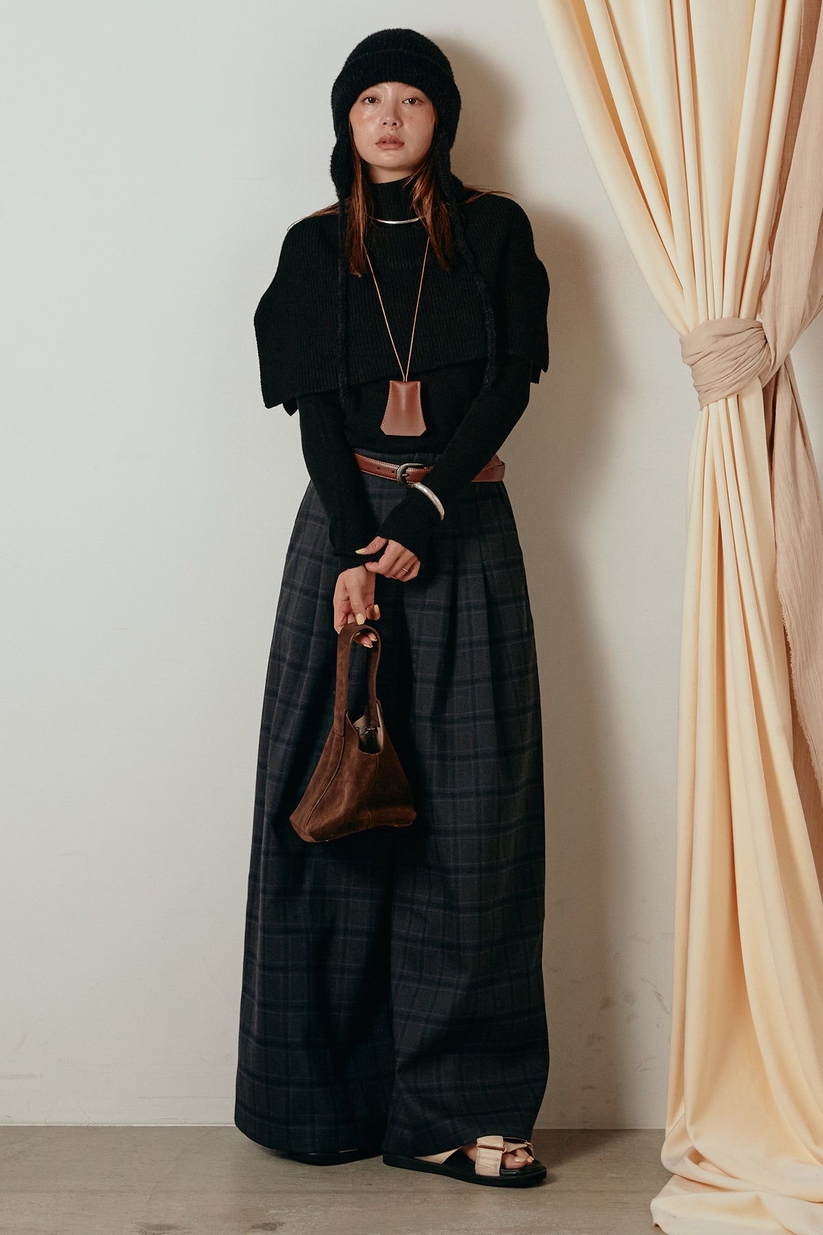 [SET]ケープデザインニットトップス+タータンチェック柄くすみワイドパンツ(2set)