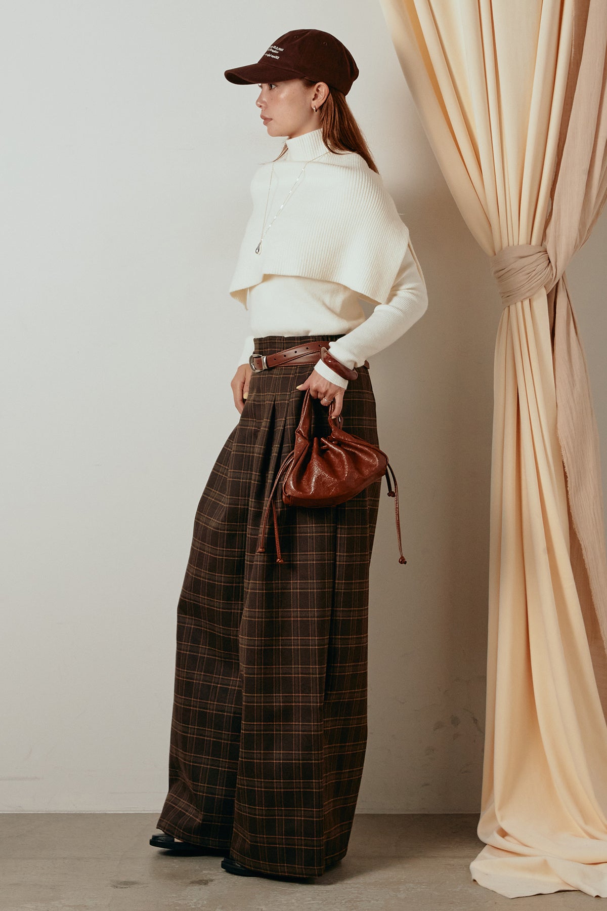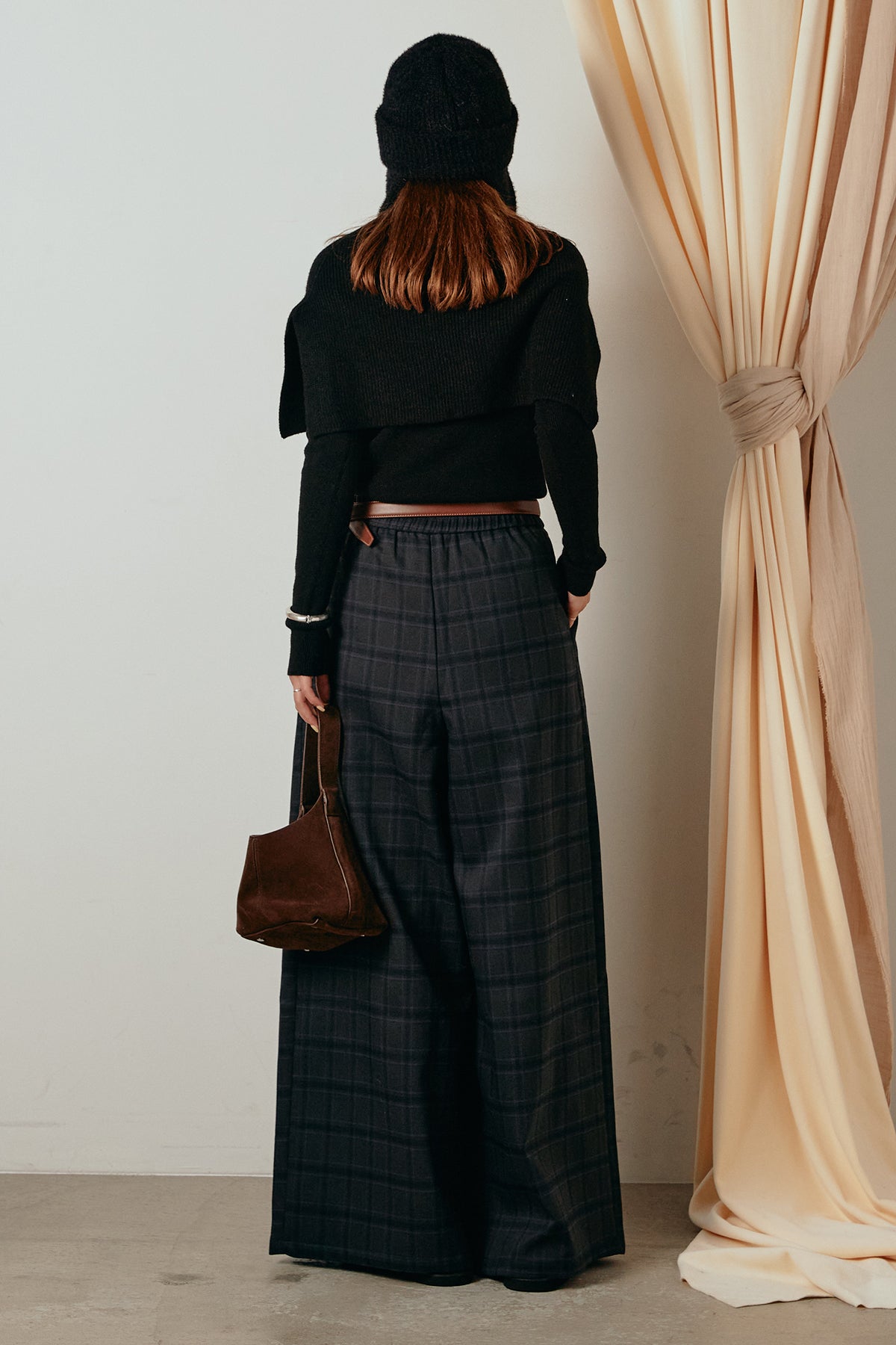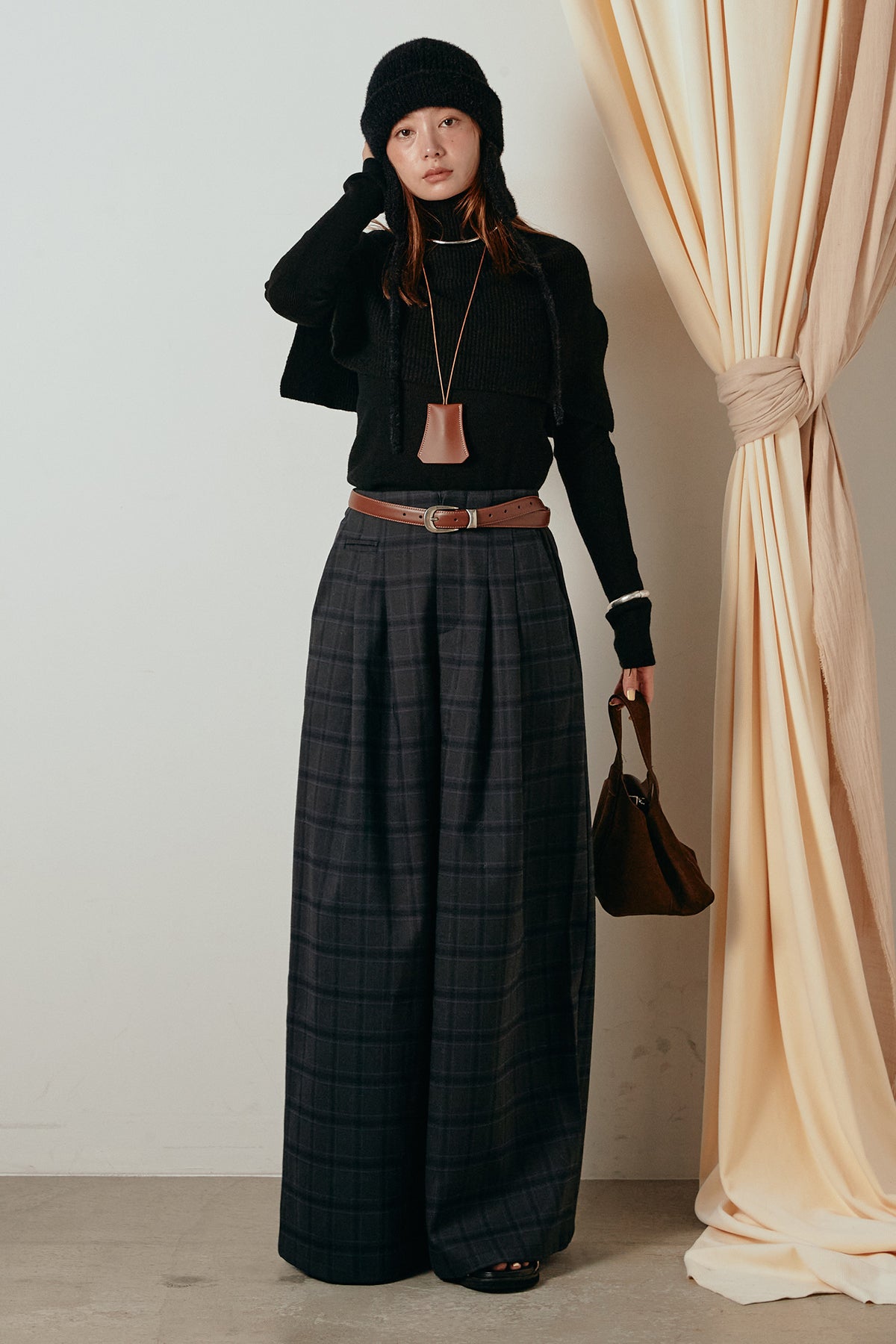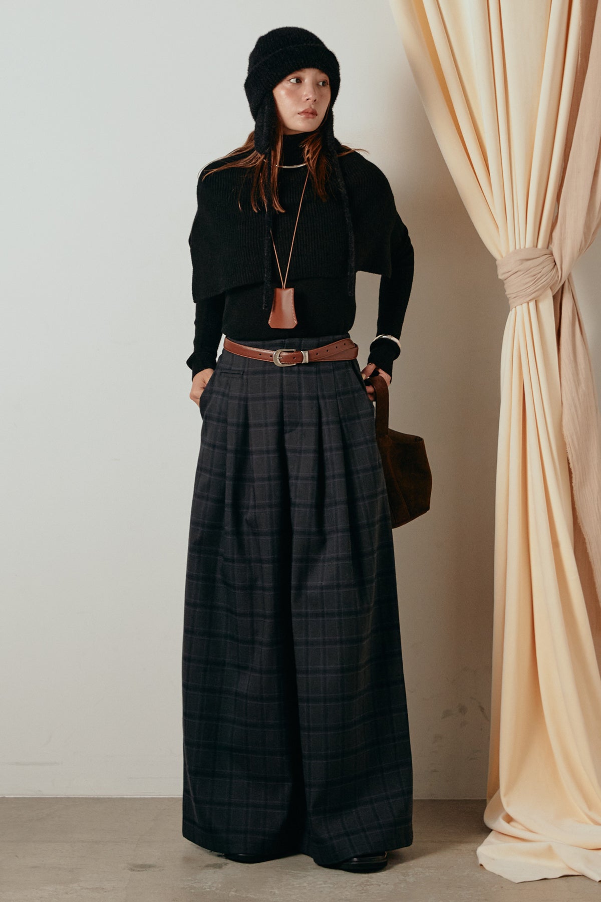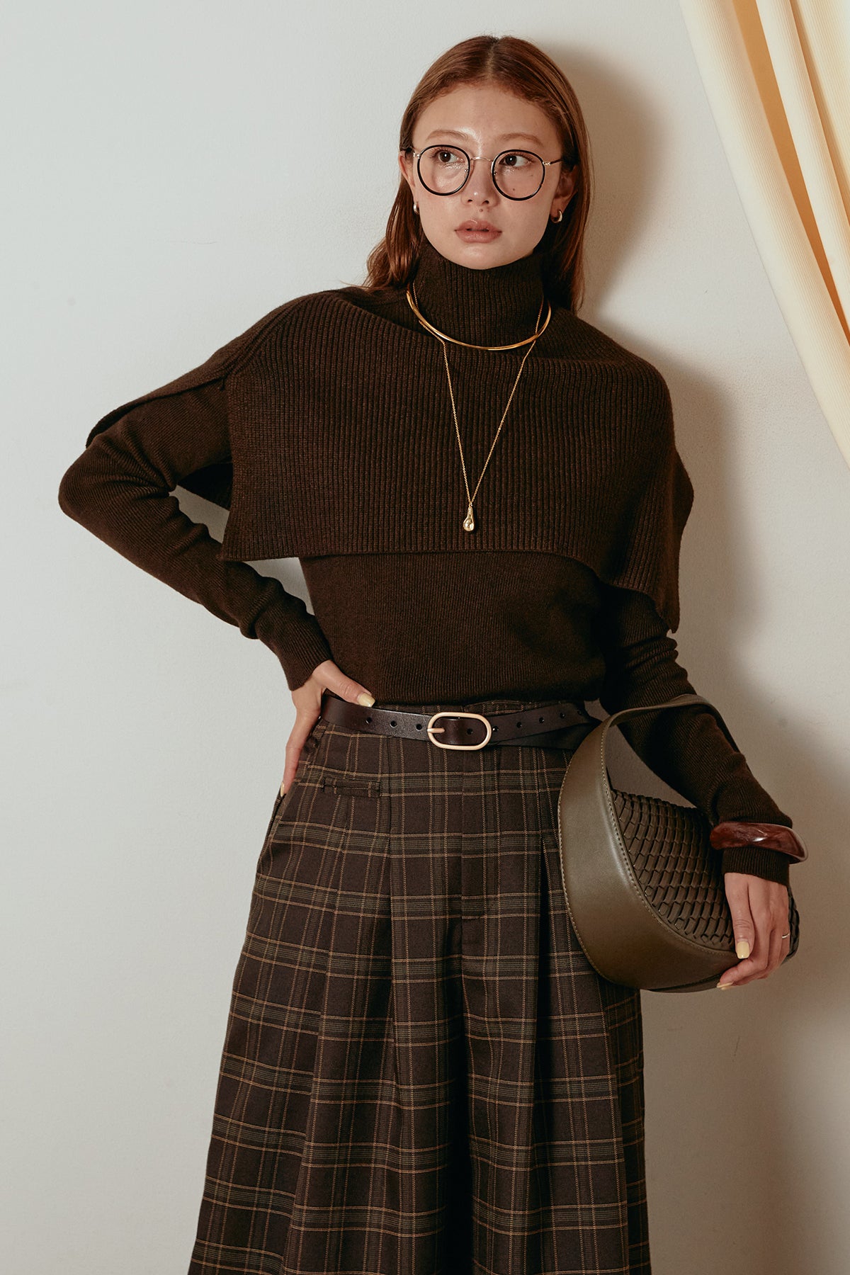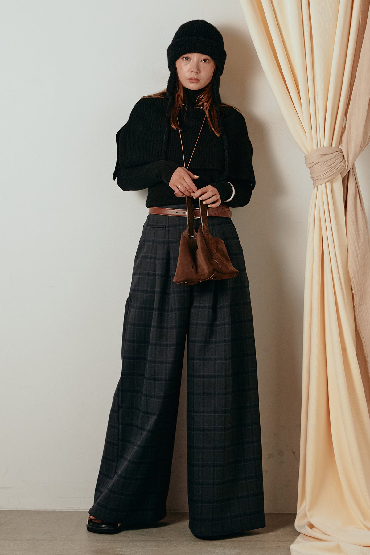 [SET]ケープデザインニットトップス+タータンチェック柄くすみワイドパンツ(2set)