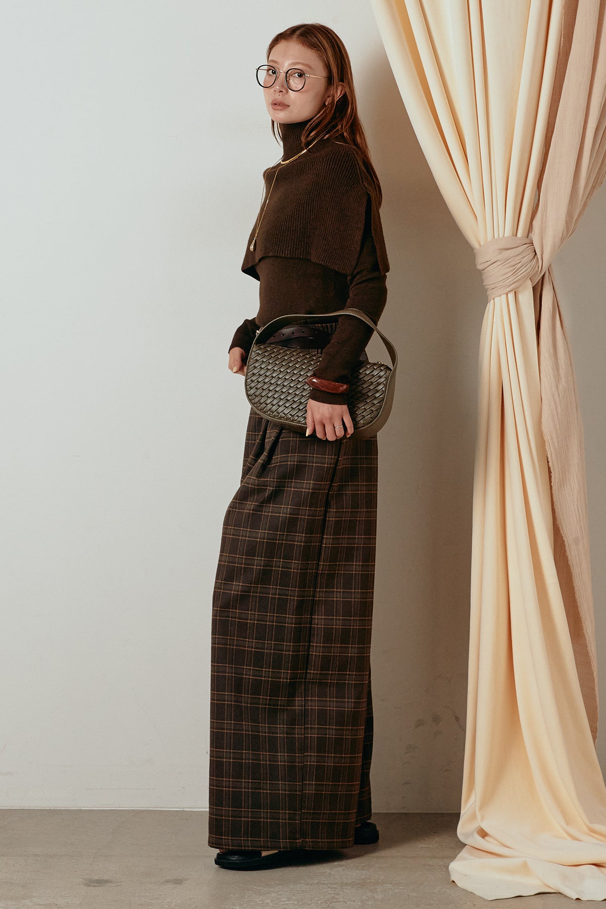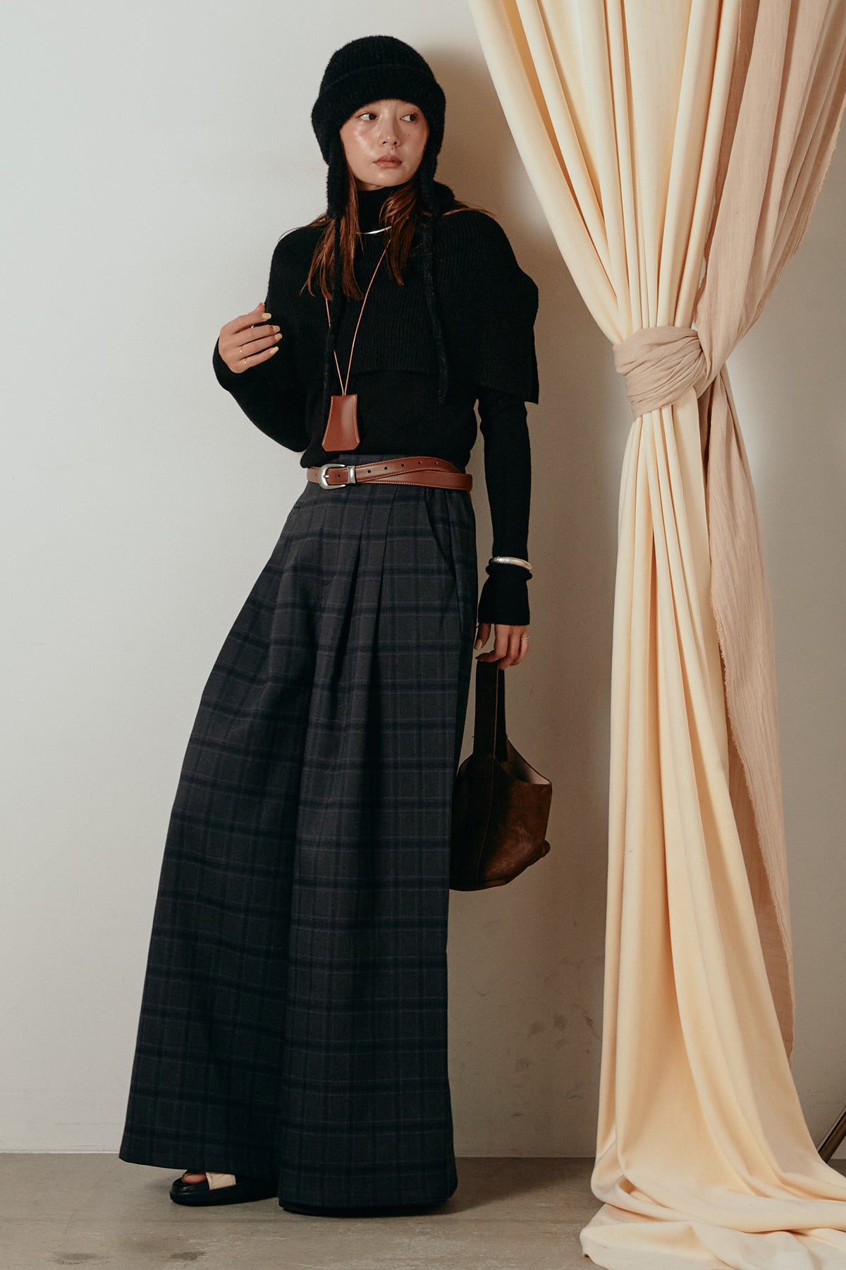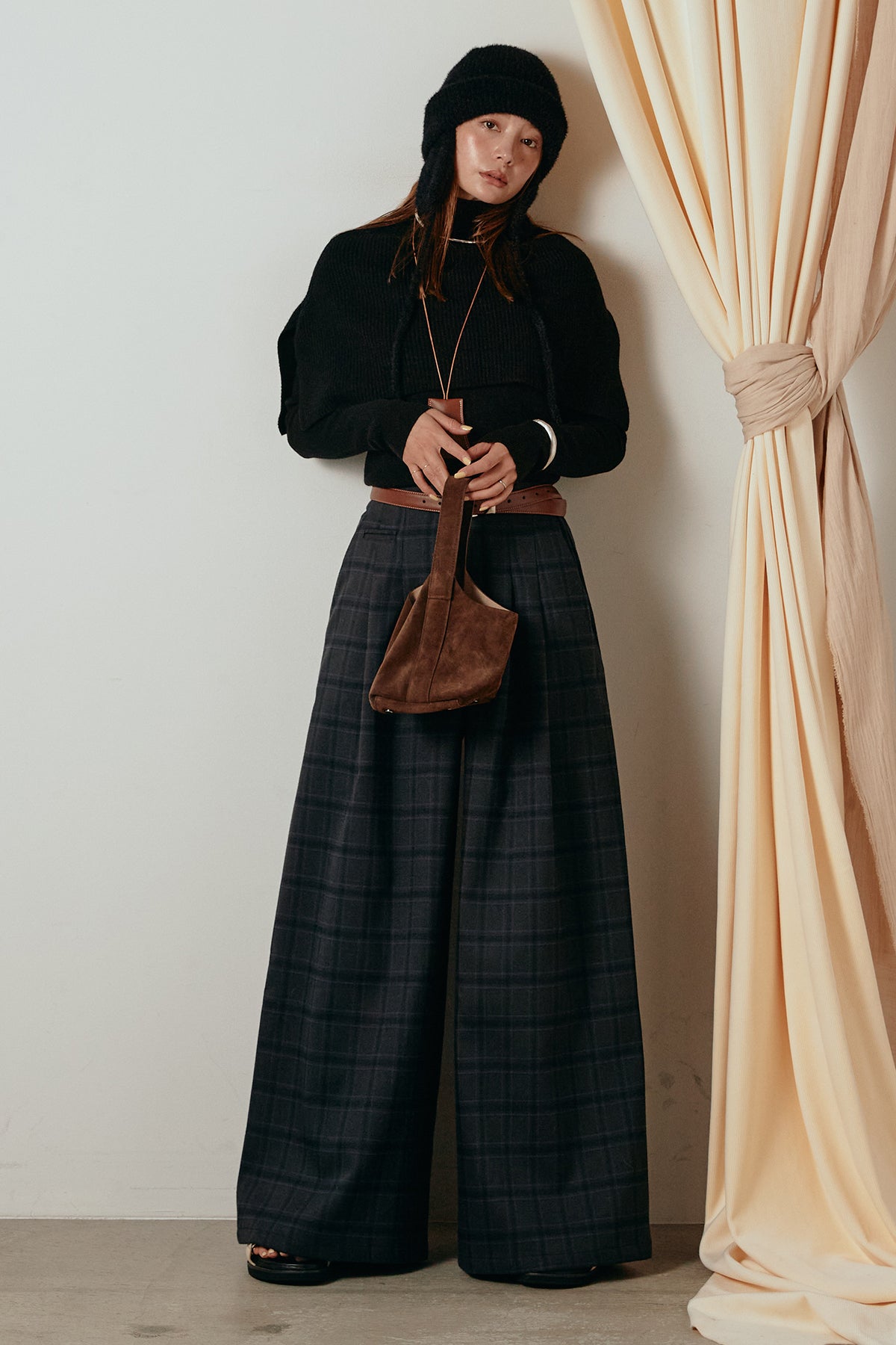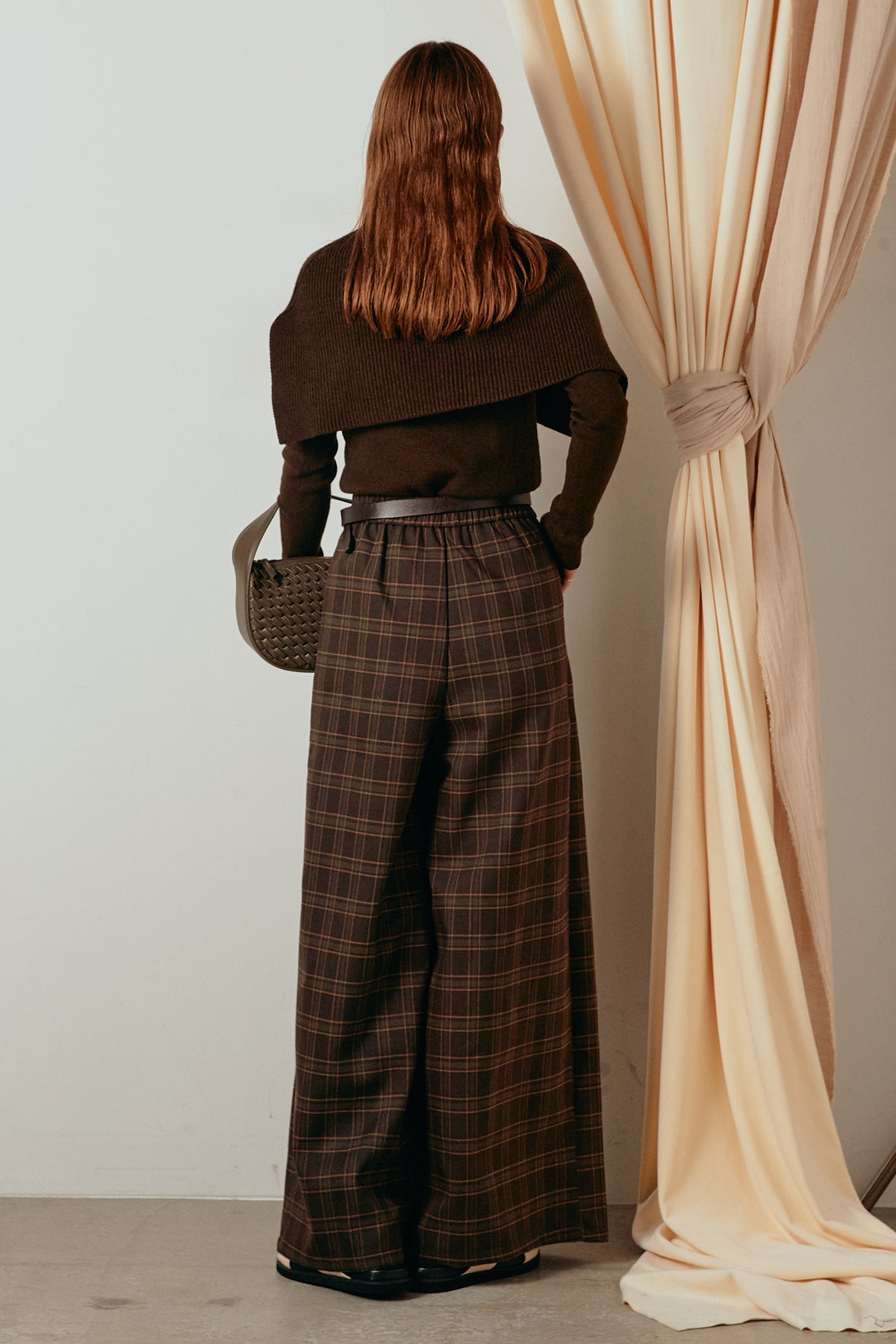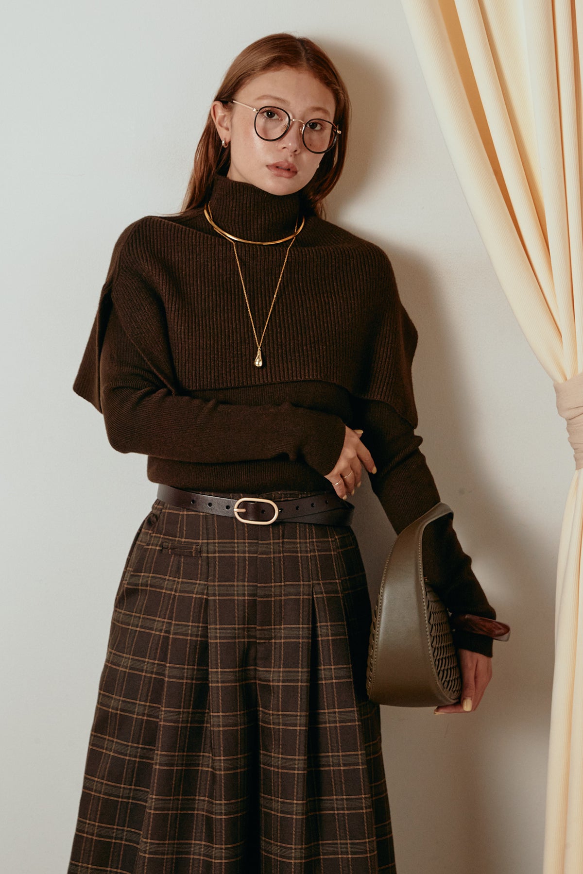 [SET]ケープデザインニットトップス+タータンチェック柄くすみワイドパンツ(2set)
