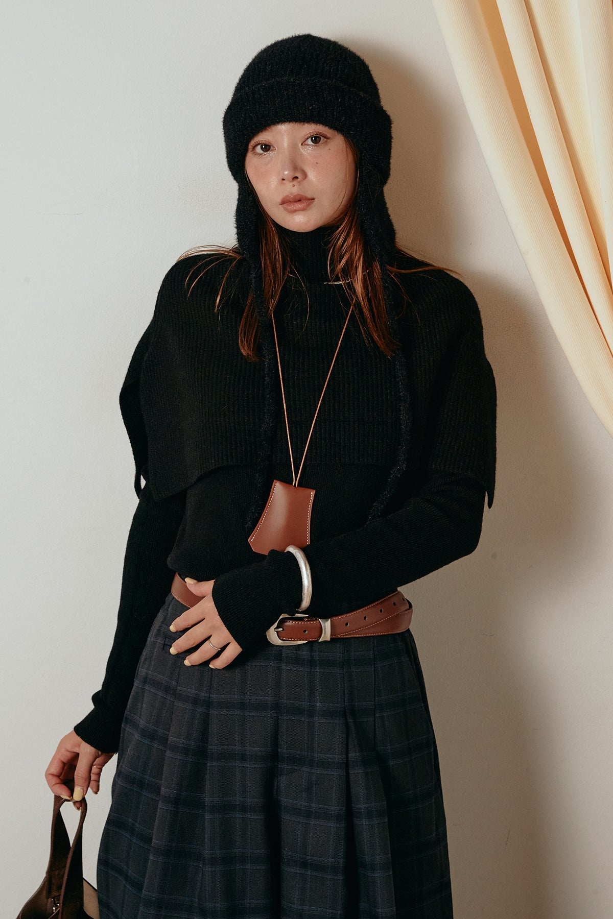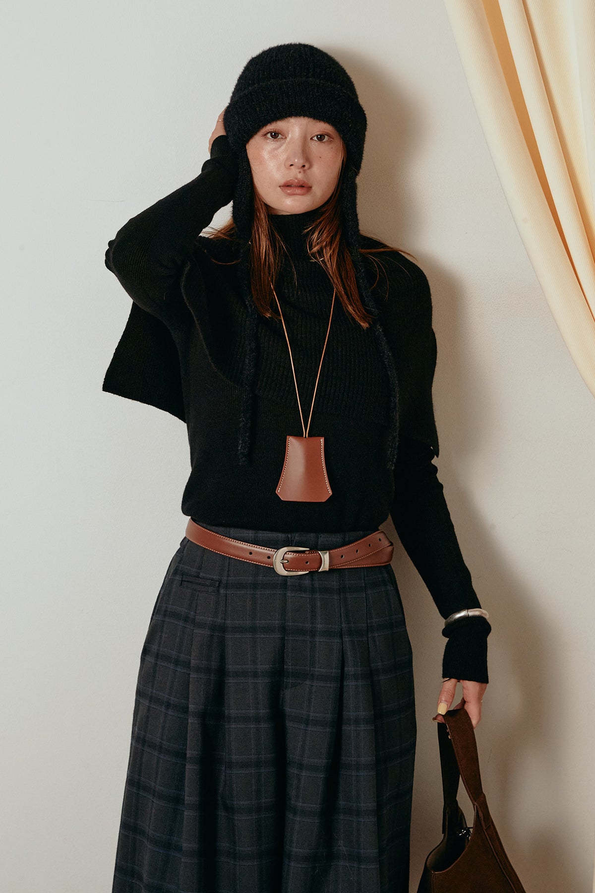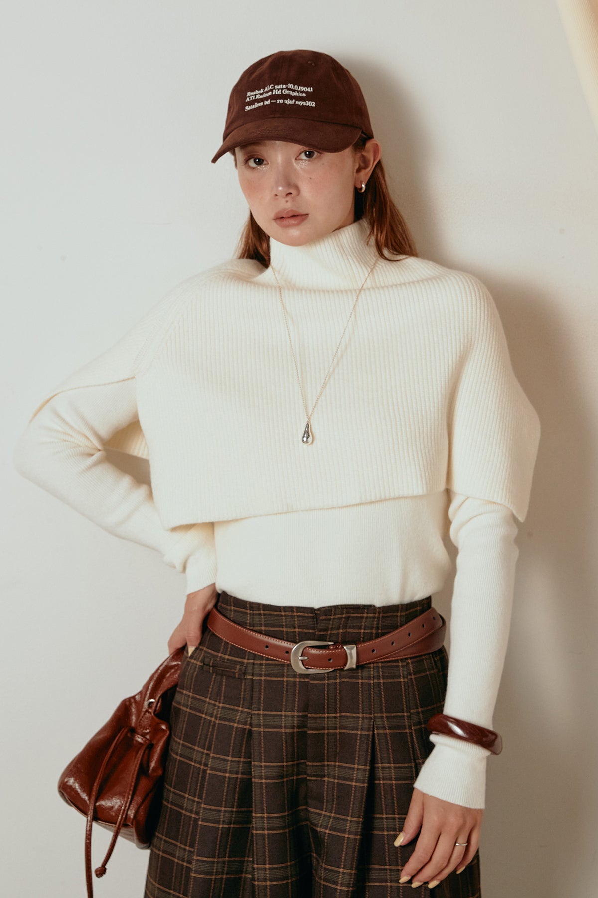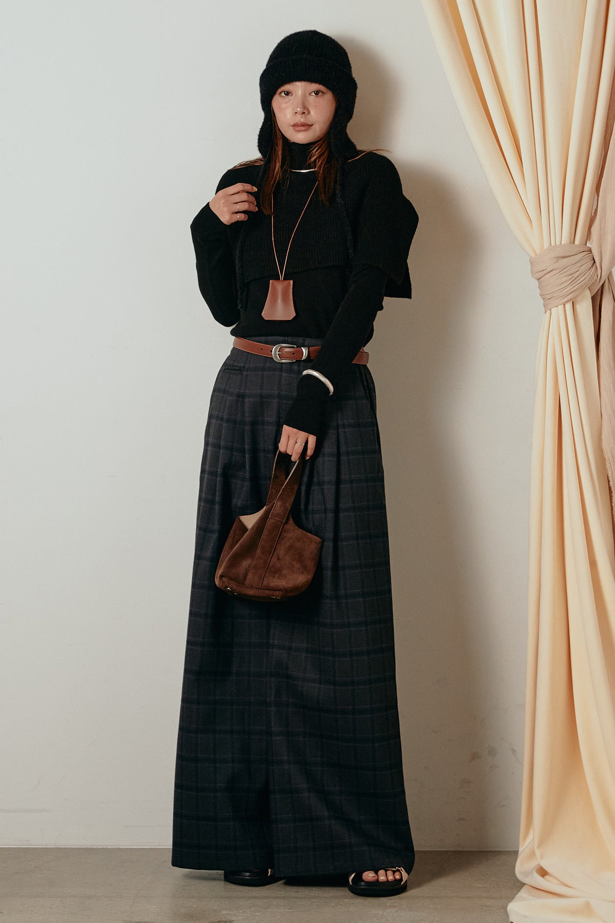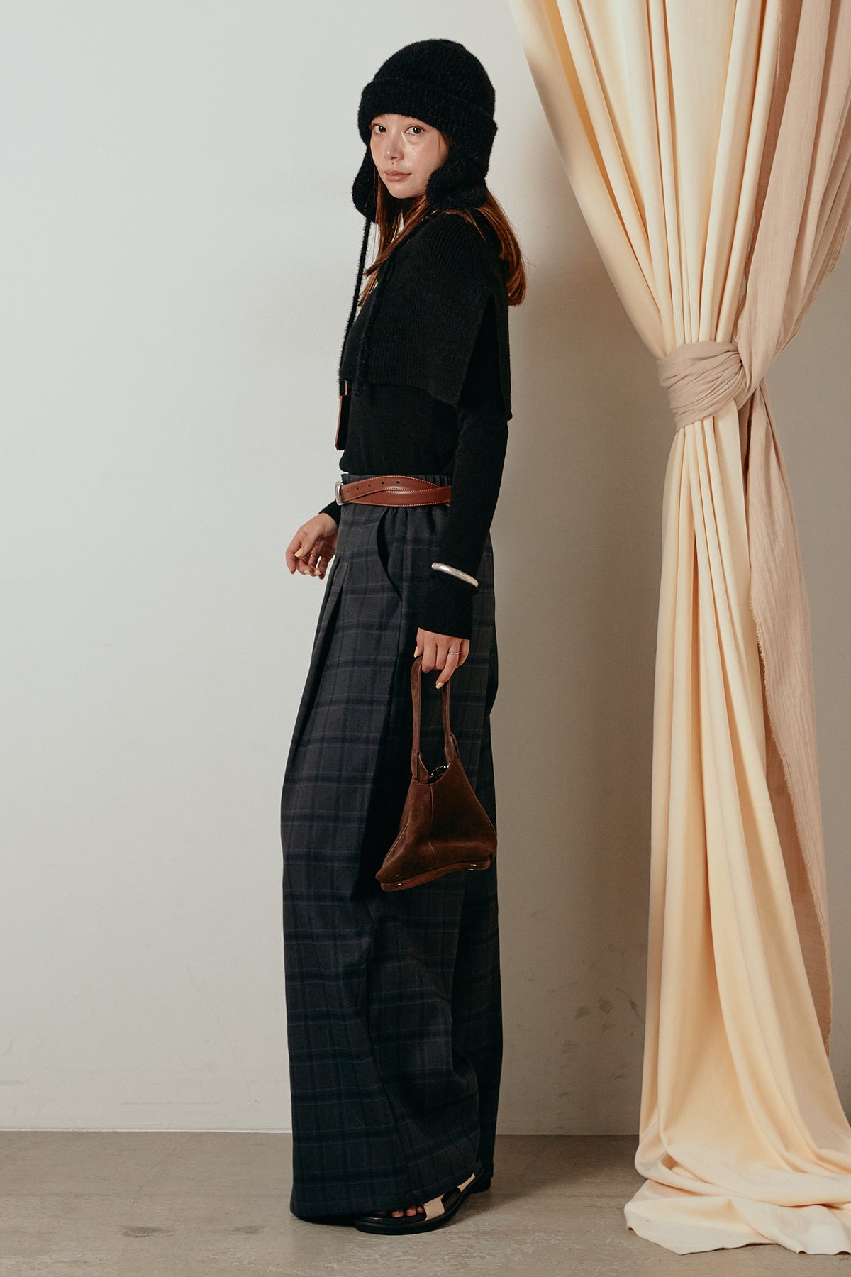 [SET]ケープデザインニットトップス+タータンチェック柄くすみワイドパンツ(2set)