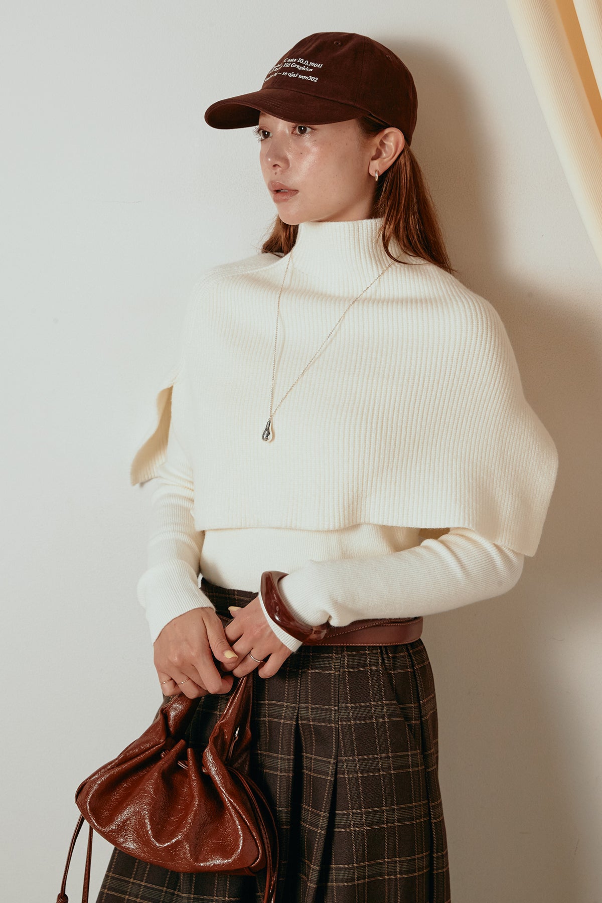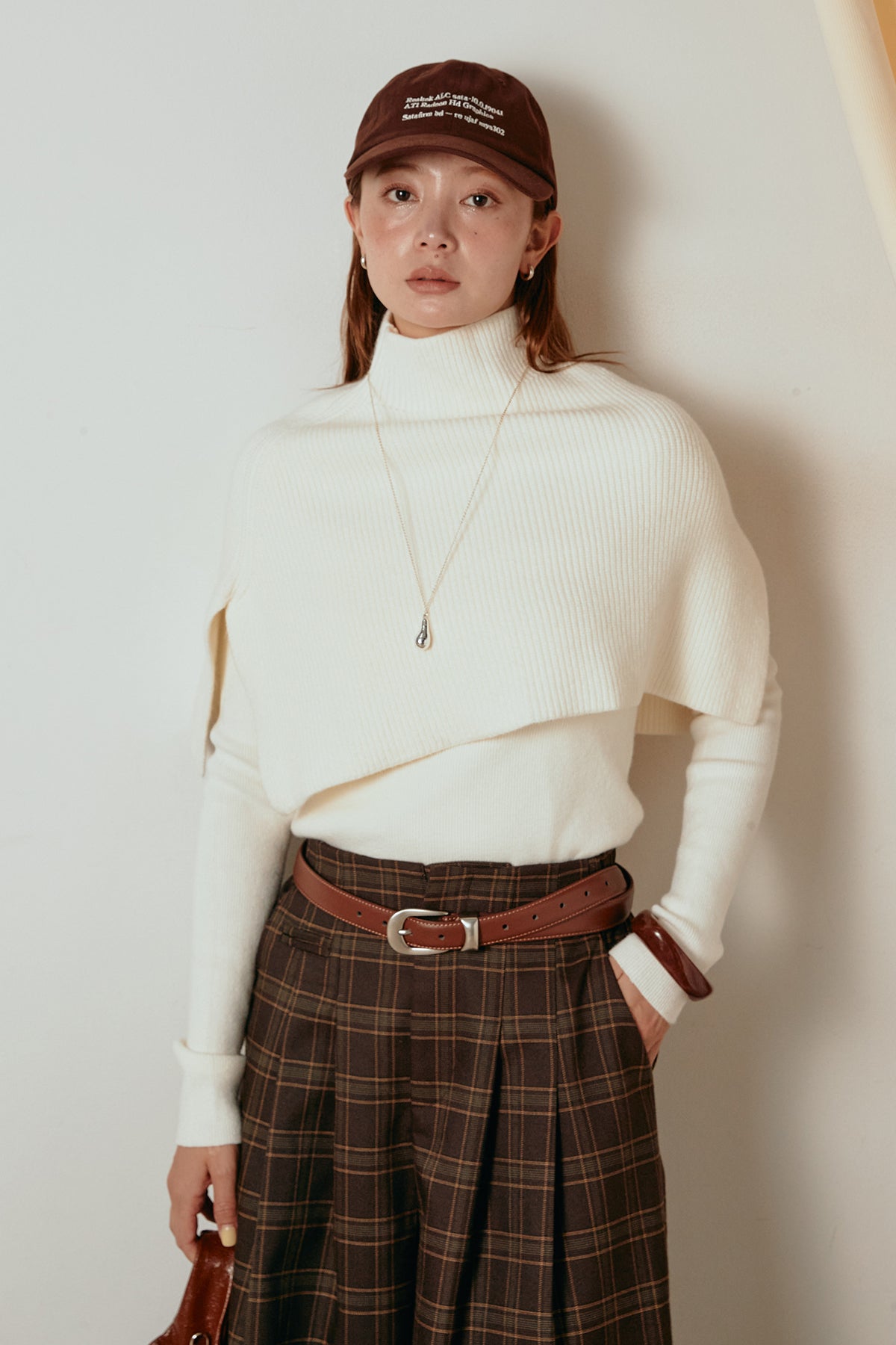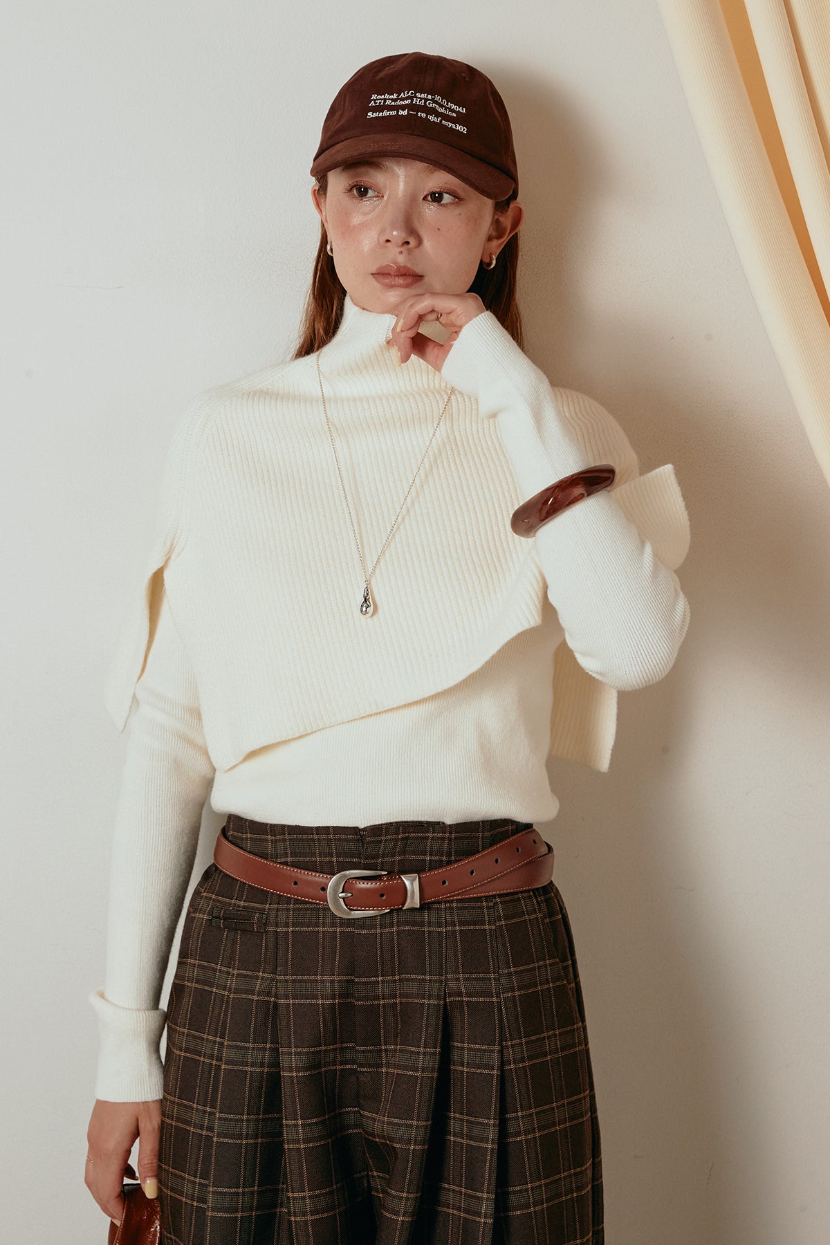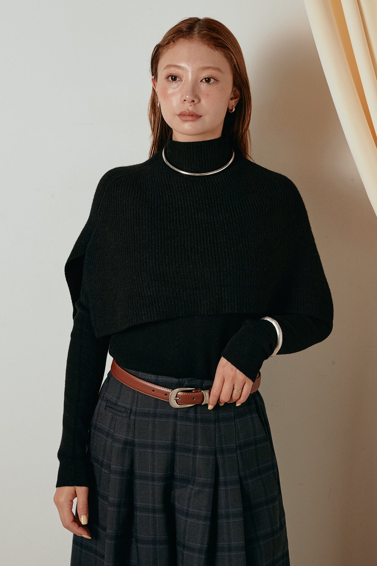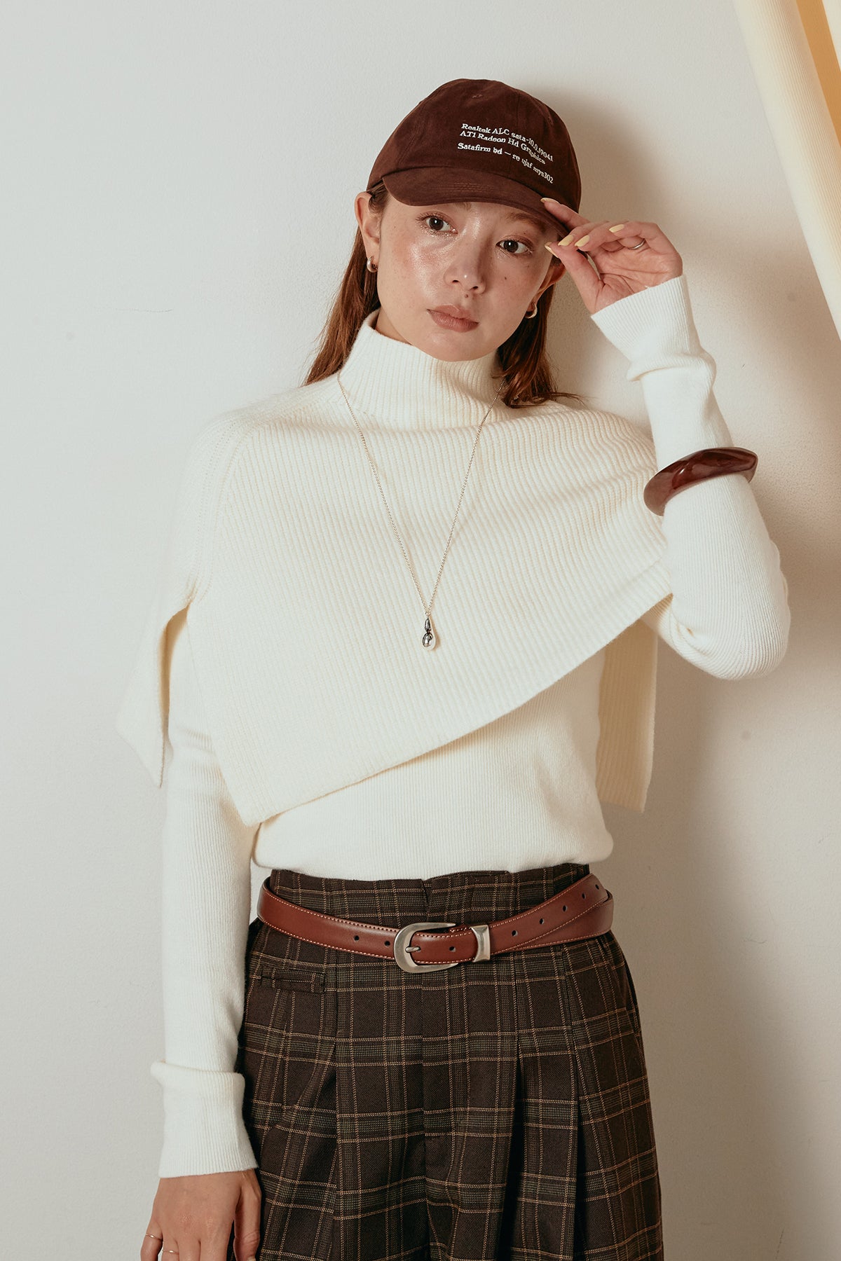 ケープのように肩を包み込むデザインが印象的なニットトップス。上品なリブ編みの切り替えが立体感を生み、動くたびに美しいドレープを描きます。柔らかな素材で着心地も良く、シンプルなボトムスを合わせるだけで洗練されたスタイルが完成する一枚です。