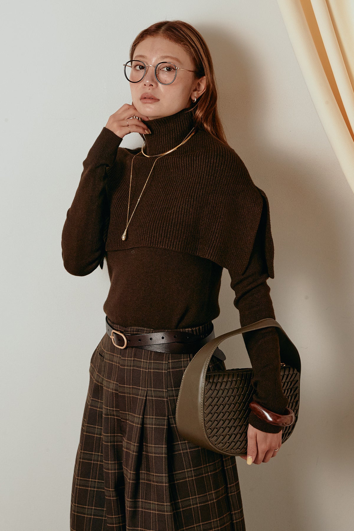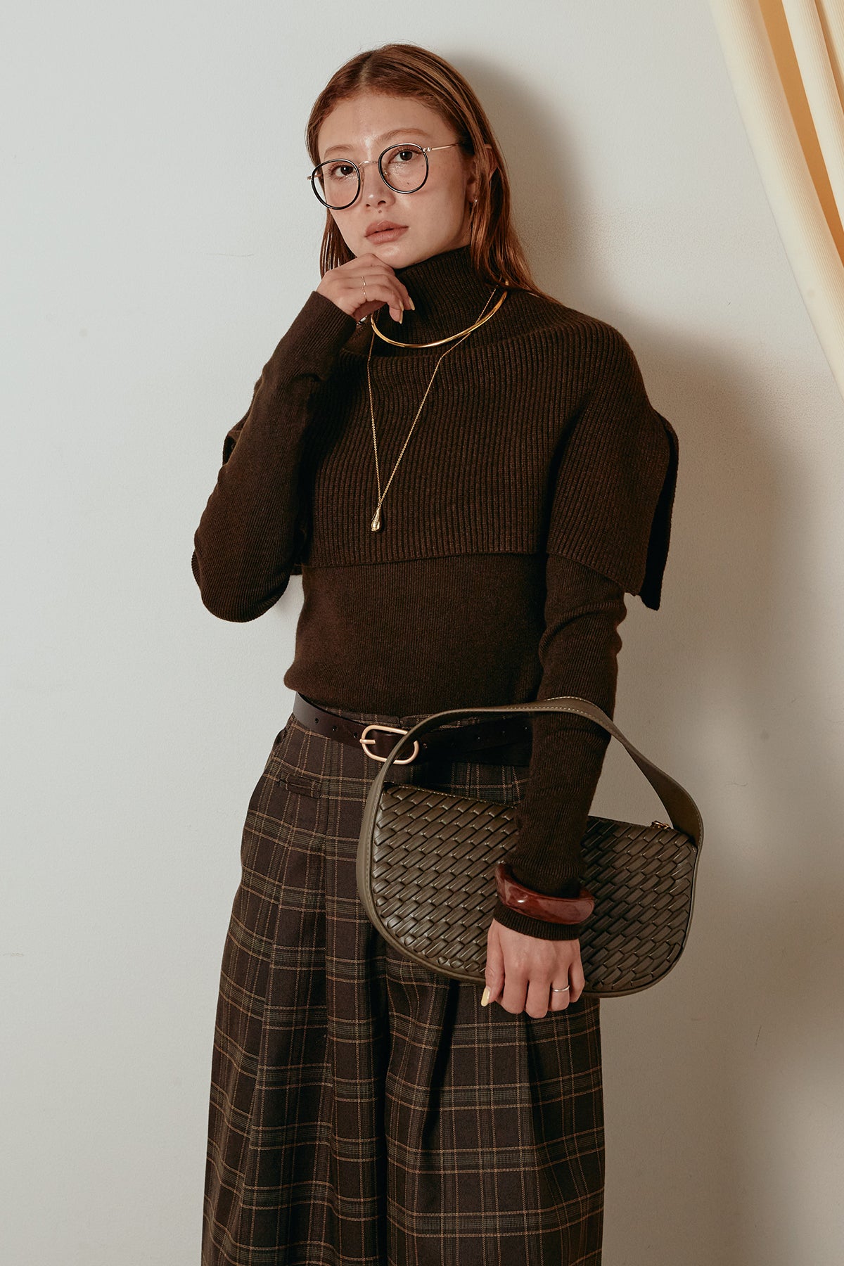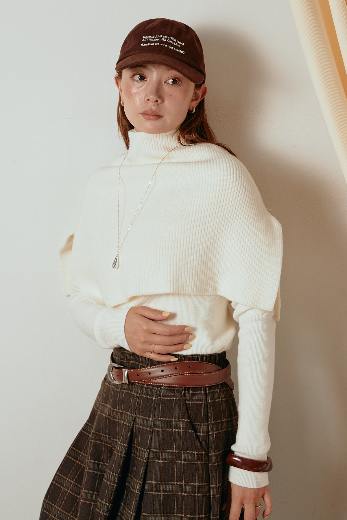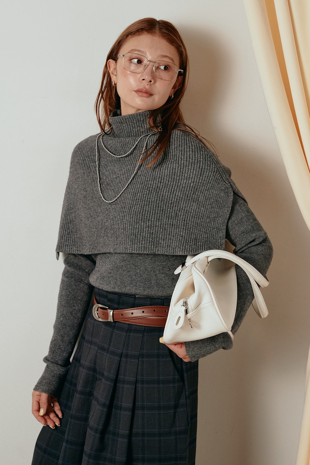 ケープのように肩を包み込むデザインが印象的なニットトップス。上品なリブ編みの切り替えが立体感を生み、動くたびに美しいドレープを描きます。柔らかな素材で着心地も良く、シンプルなボトムスを合わせるだけで洗練されたスタイルが完成する一枚です。