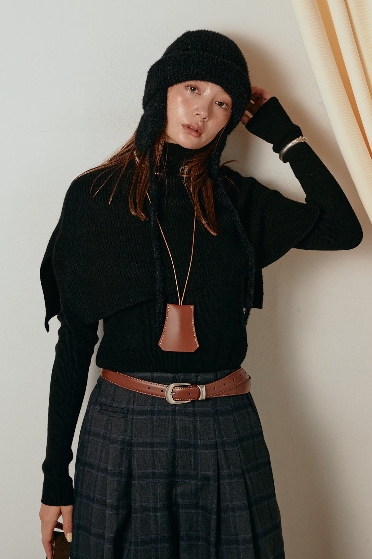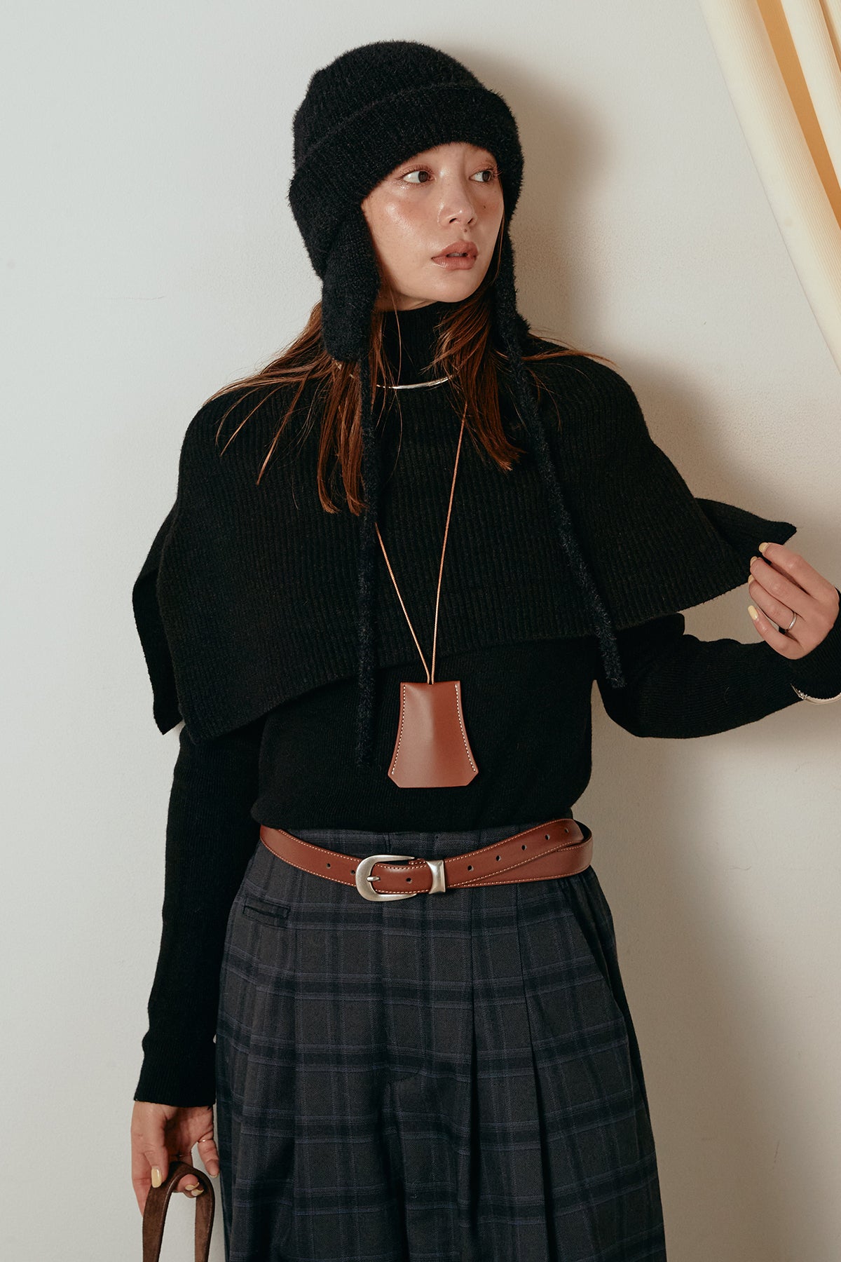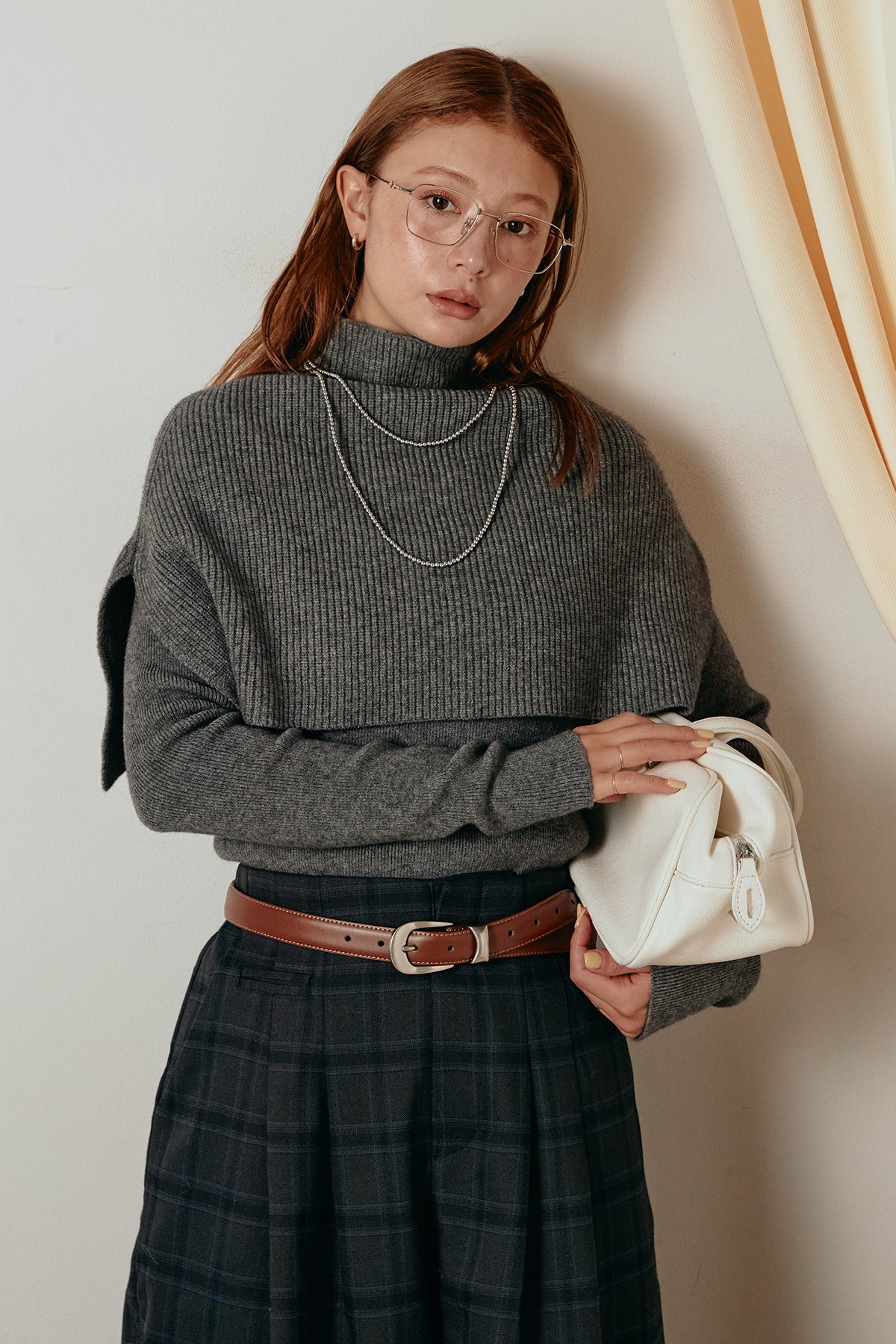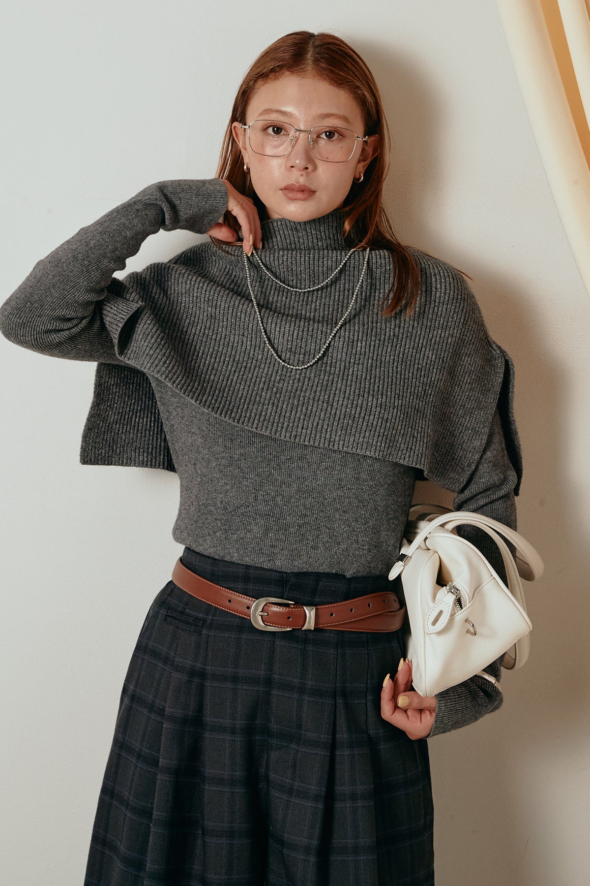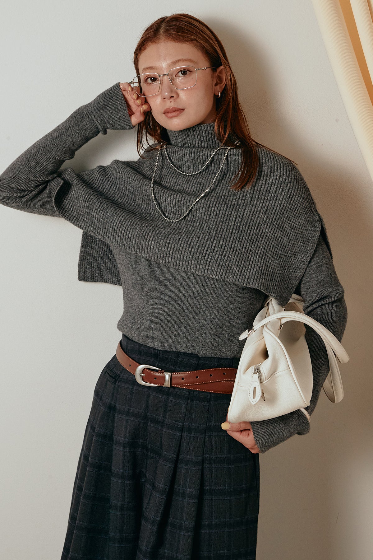 ケープのように肩を包み込むデザインが印象的なニットトップス。上品なリブ編みの切り替えが立体感を生み、動くたびに美しいドレープを描きます。柔らかな素材で着心地も良く、シンプルなボトムスを合わせるだけで洗練されたスタイルが完成する一枚です。