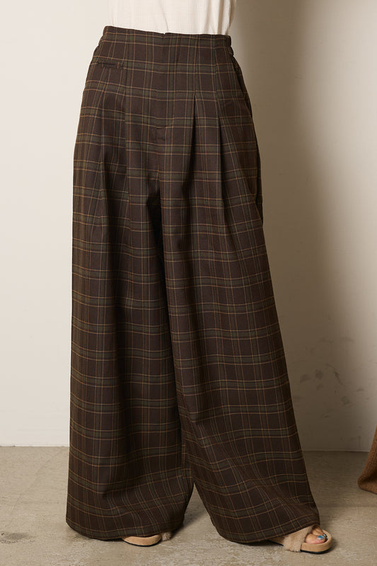 落ち着いた色味のタータンチェックが印象的なくすみワイドパンツ。深めのタックが立体感を生み、動きに合わせて美しいシルエットを描きます。ゆとりのある履き心地ながらも上品さを備え、シンプルなトップスを合わせるだけでシーズンムード漂うスタイルが完成する一本です。