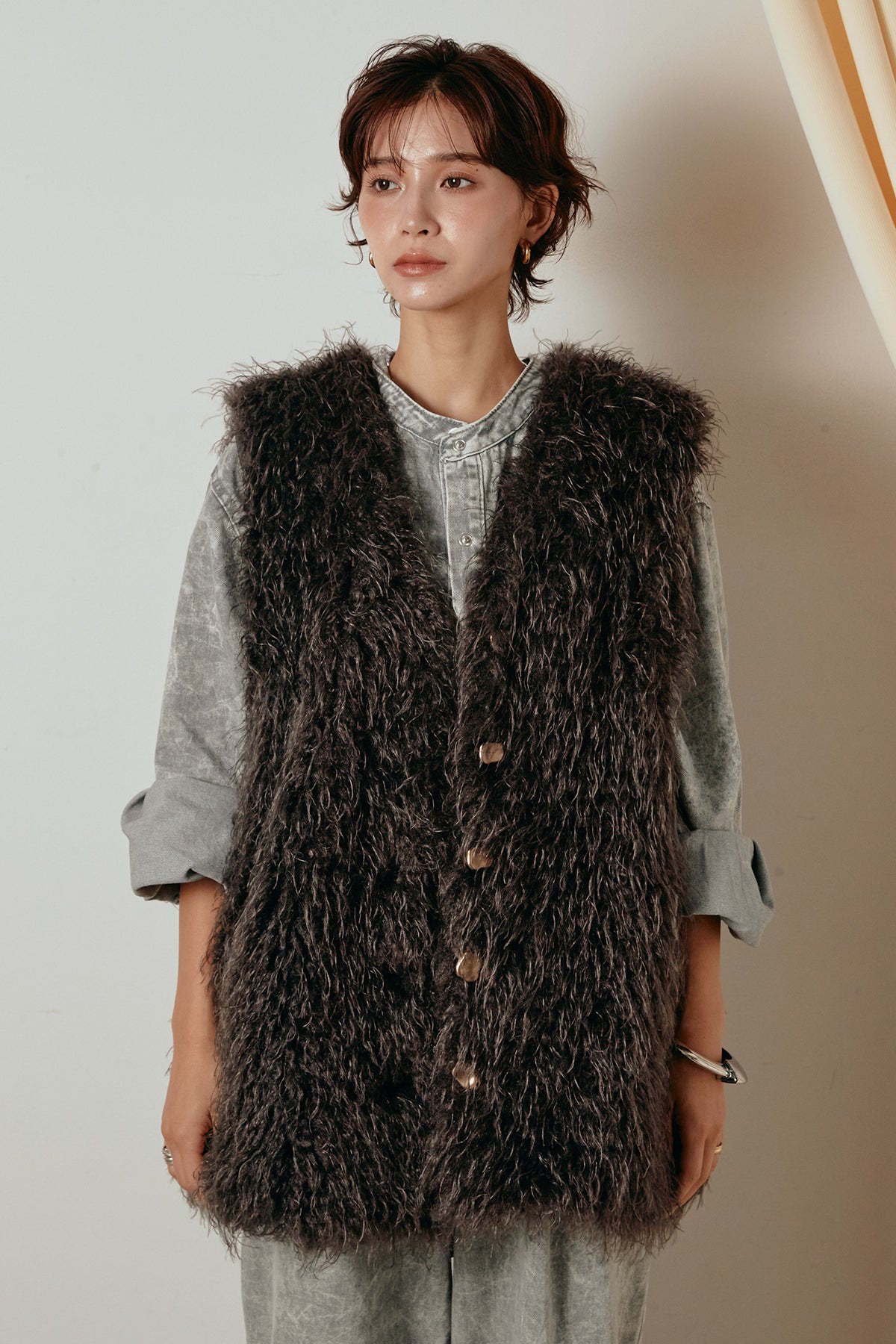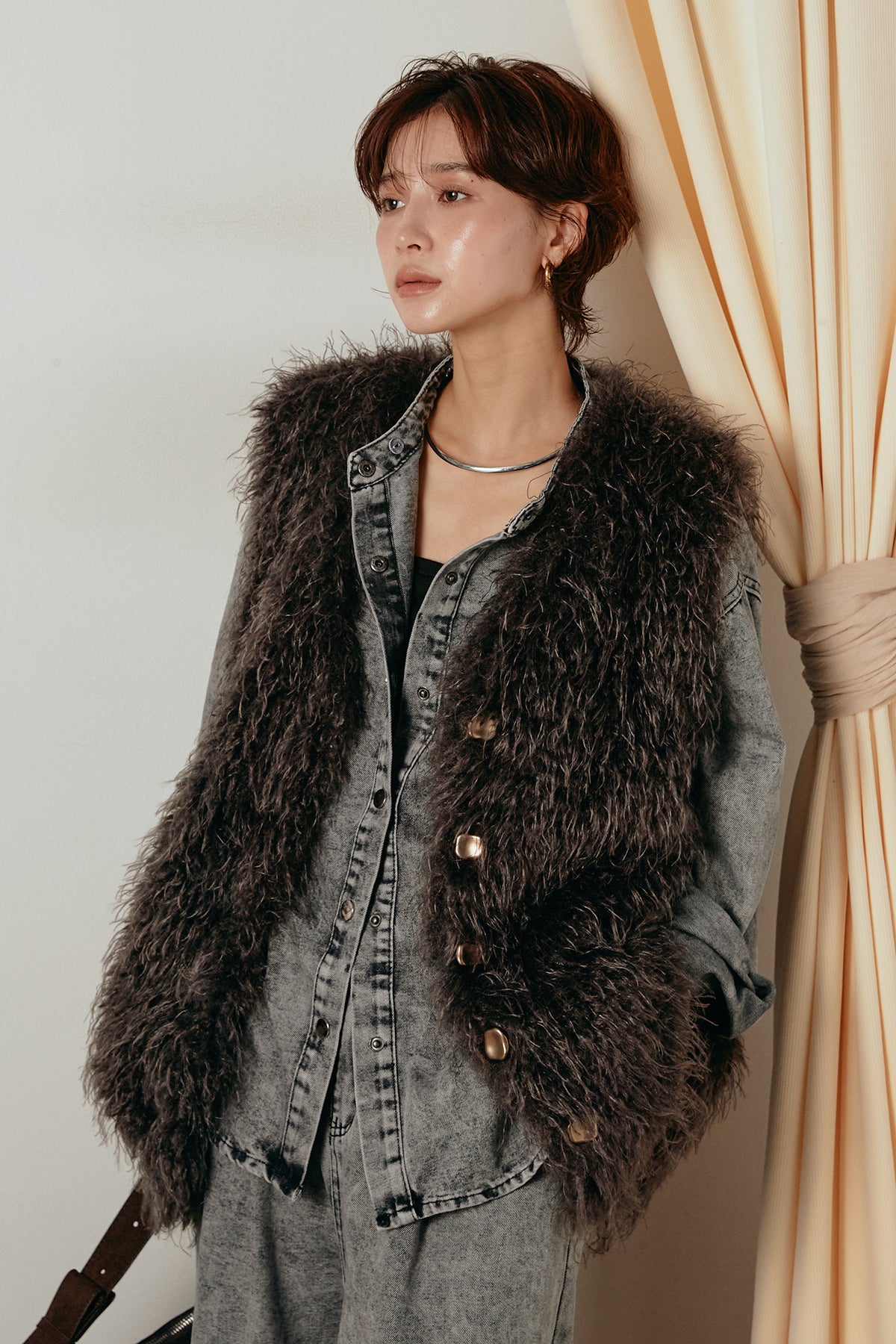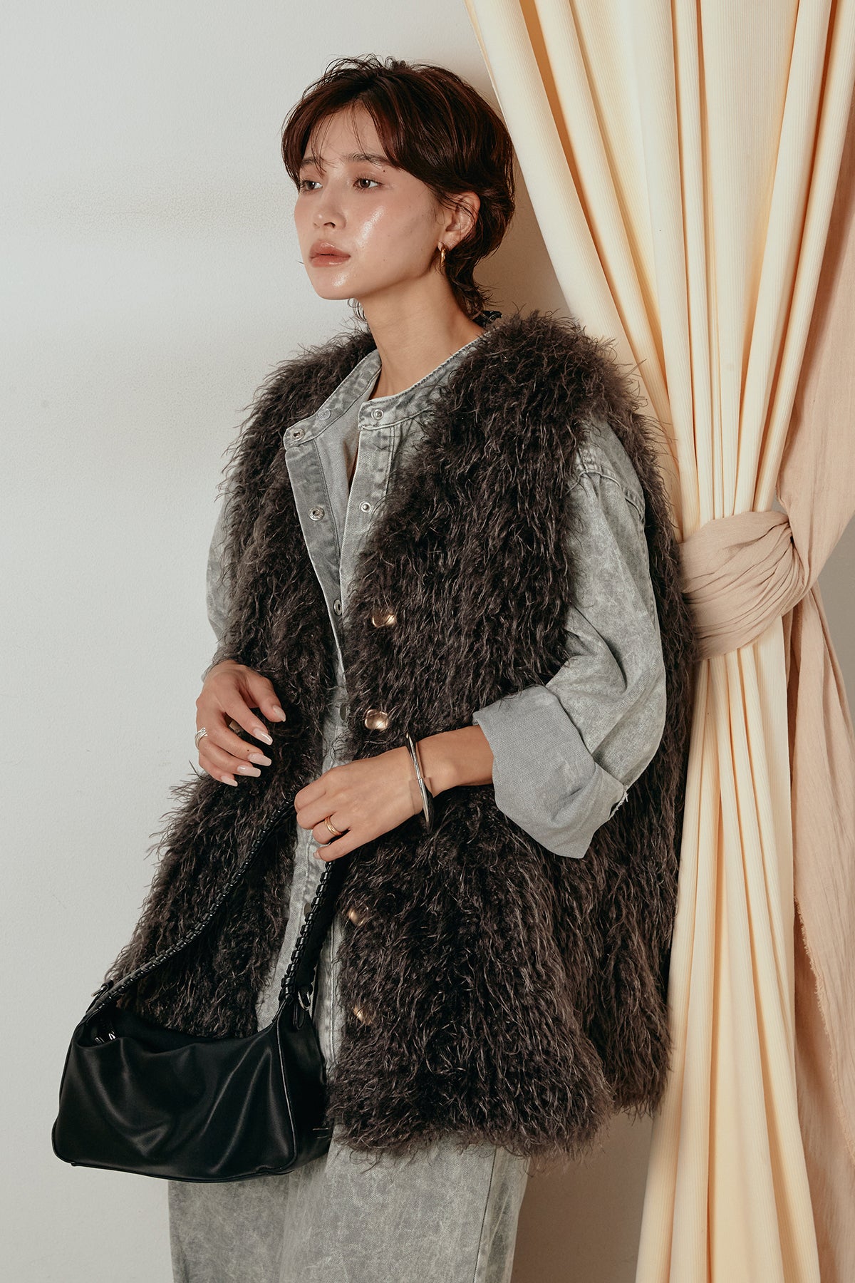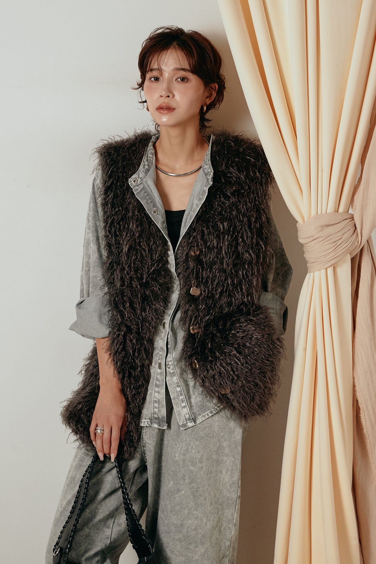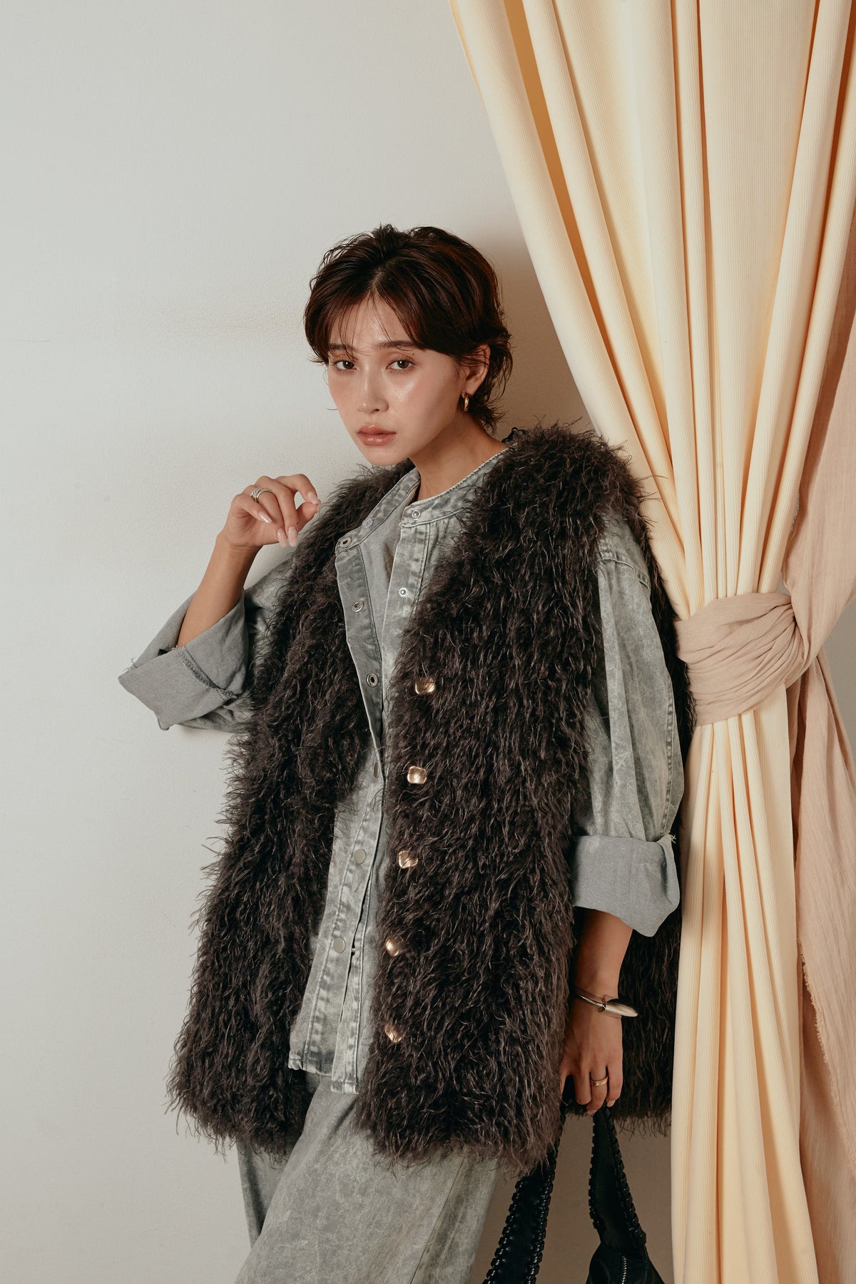 ふんわりとしたシャギーファーがシーズンムードを高めるボタン付きベスト。柔らかな質感と程よいボリュームが存在感を放ち、羽織るだけでスタイリングをアップデート。中はすっきりとした裏地仕様で着心地も快適。ニットやシャツに重ねて、秋冬らしいレイヤードを楽しめる一枚です。