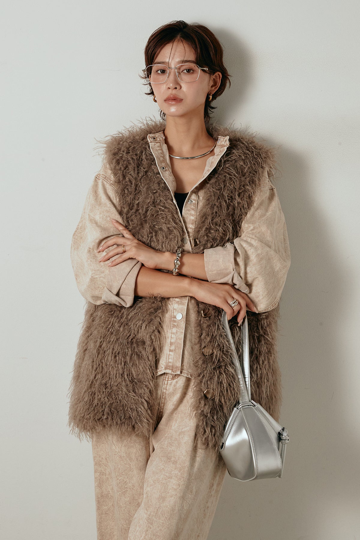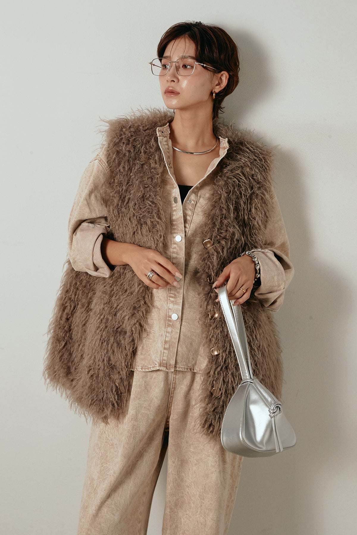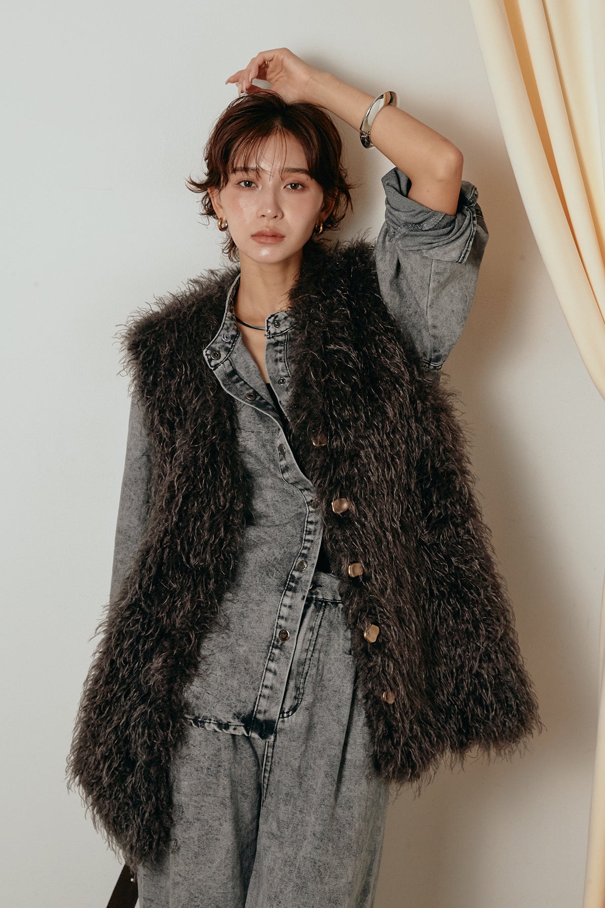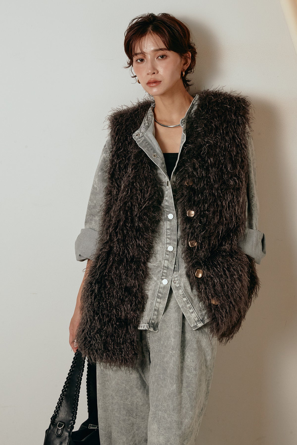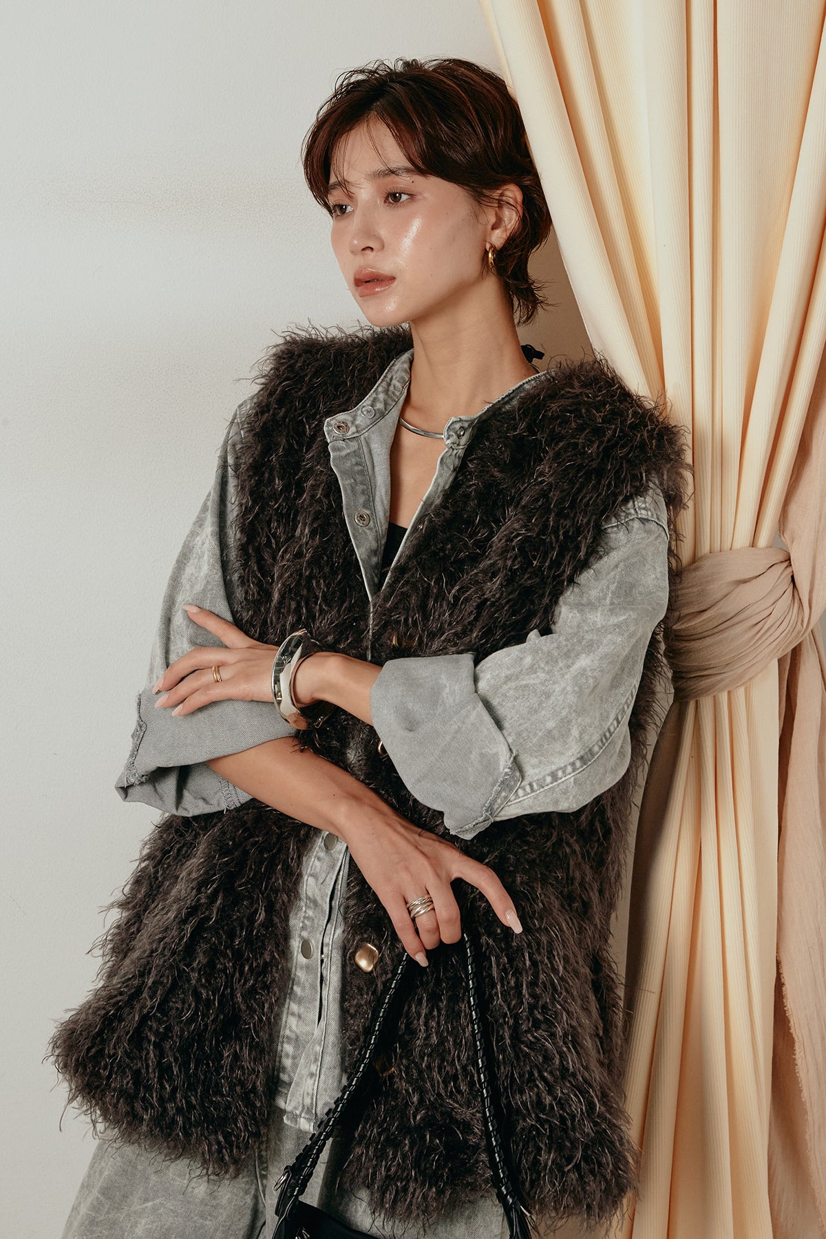 ふんわりとしたシャギーファーがシーズンムードを高めるボタン付きベスト。柔らかな質感と程よいボリュームが存在感を放ち、羽織るだけでスタイリングをアップデート。中はすっきりとした裏地仕様で着心地も快適。ニットやシャツに重ねて、秋冬らしいレイヤードを楽しめる一枚です。