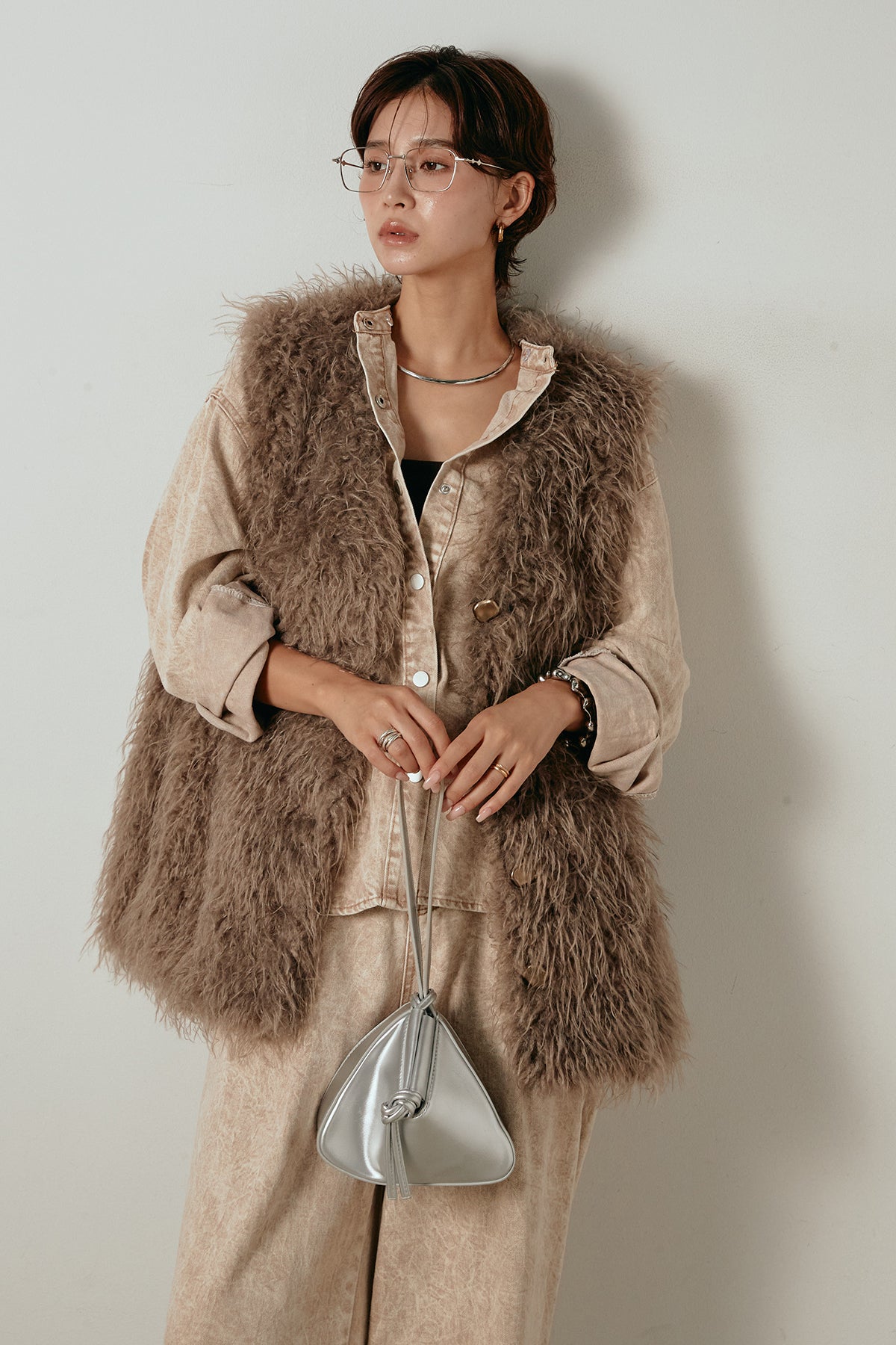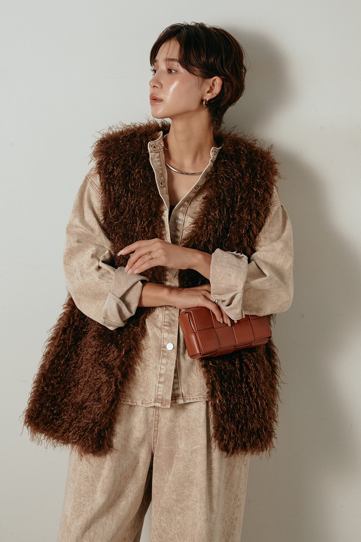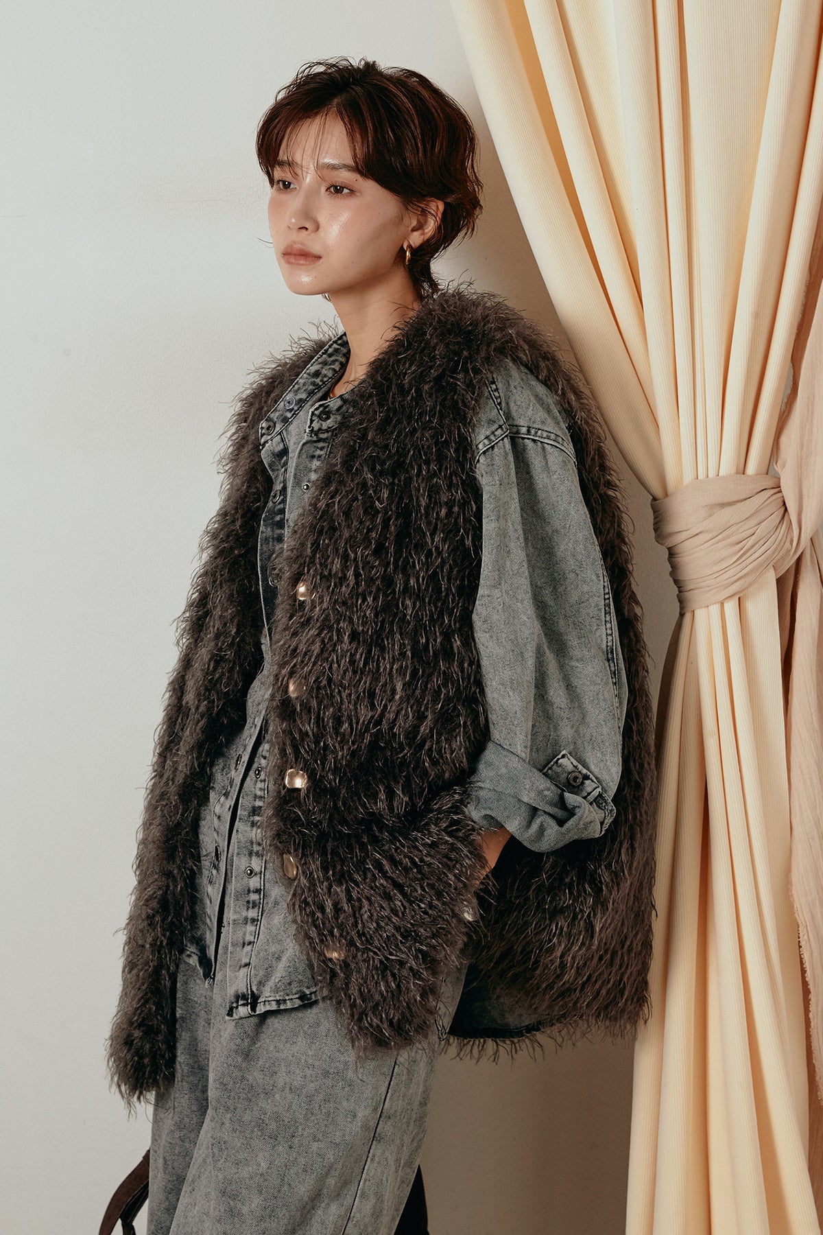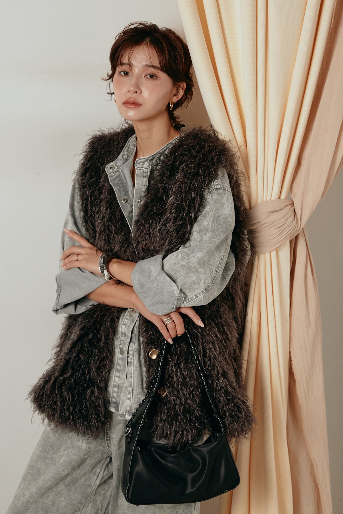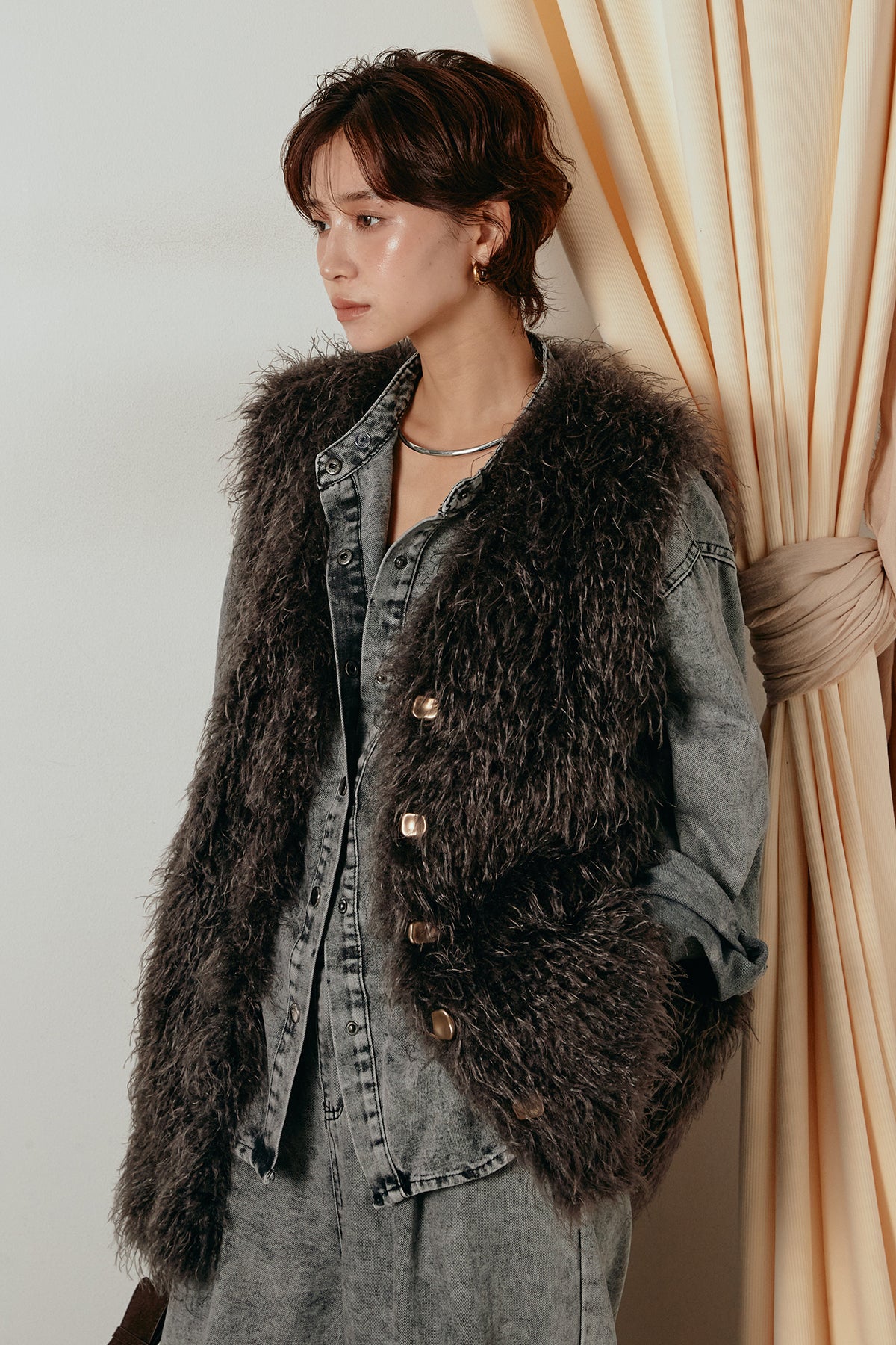 ふんわりとしたシャギーファーがシーズンムードを高めるボタン付きベスト。柔らかな質感と程よいボリュームが存在感を放ち、羽織るだけでスタイリングをアップデート。中はすっきりとした裏地仕様で着心地も快適。ニットやシャツに重ねて、秋冬らしいレイヤードを楽しめる一枚です。