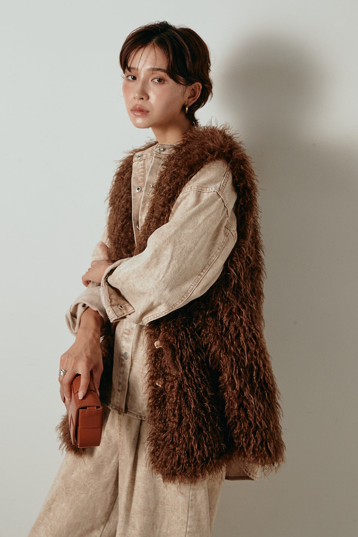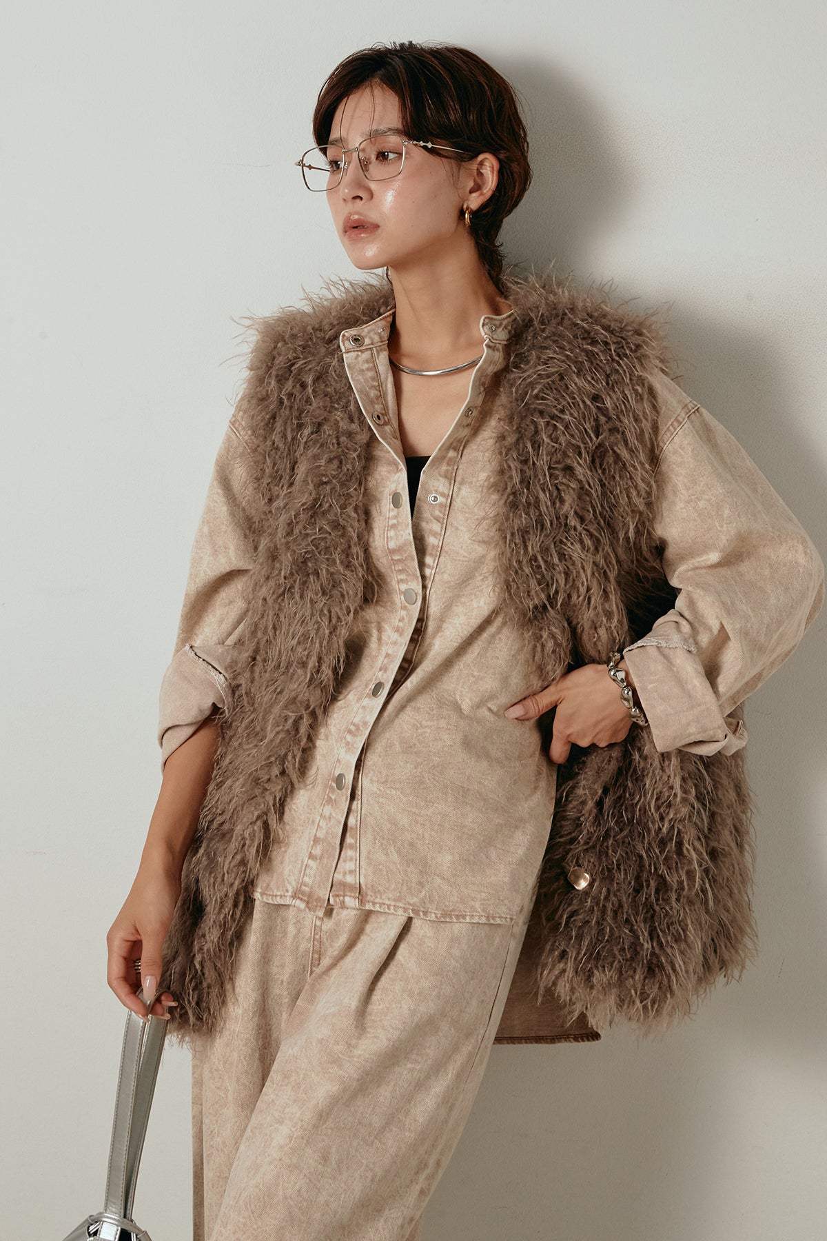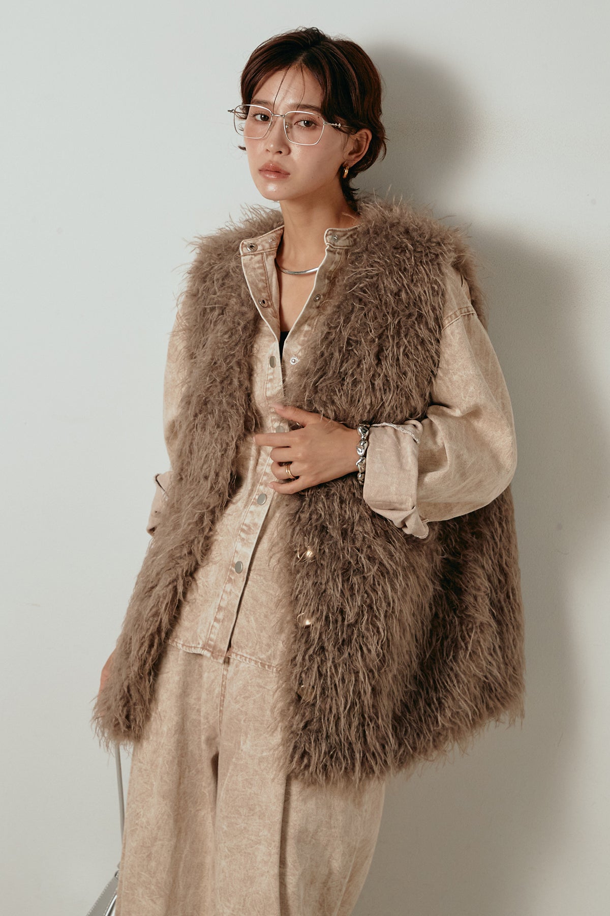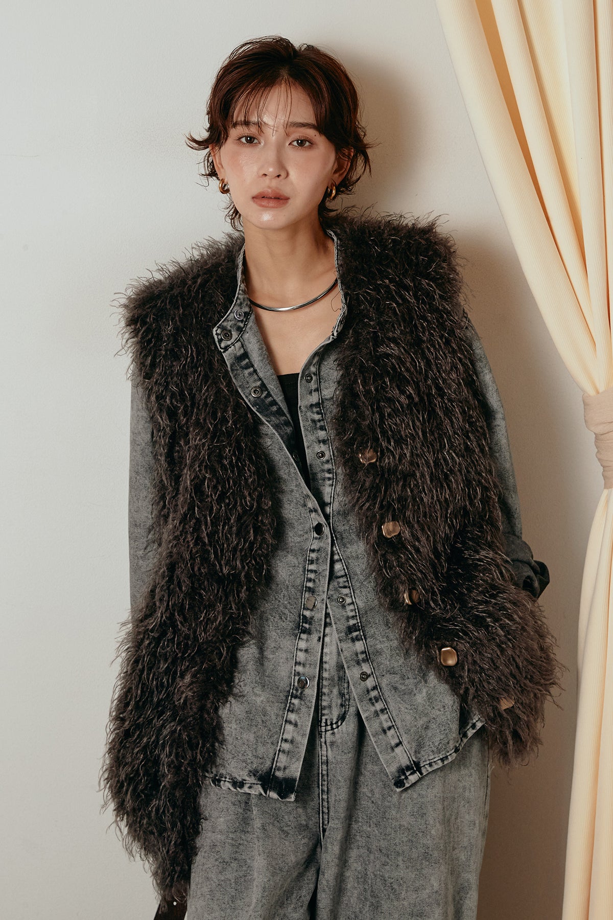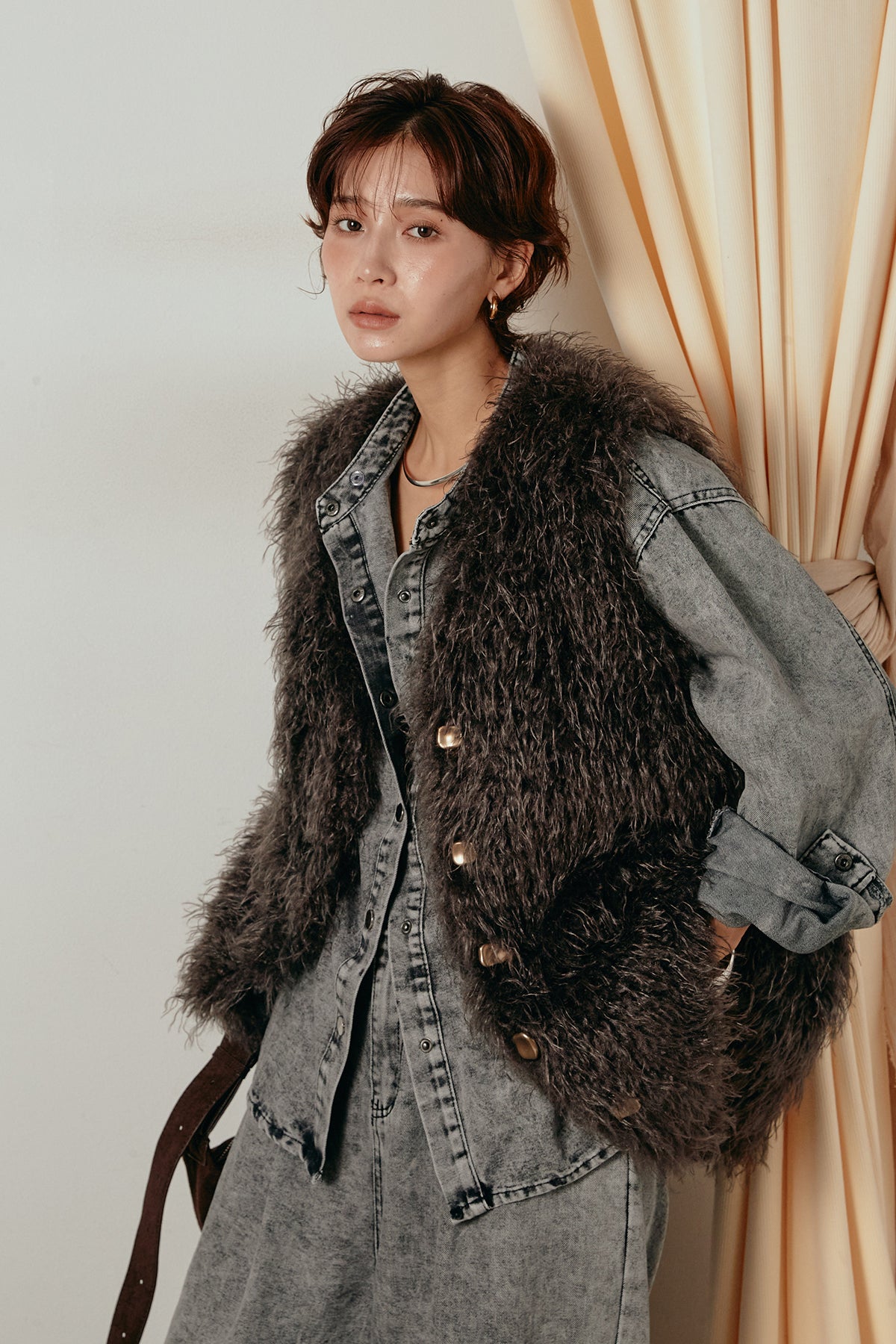 ふんわりとしたシャギーファーがシーズンムードを高めるボタン付きベスト。柔らかな質感と程よいボリュームが存在感を放ち、羽織るだけでスタイリングをアップデート。中はすっきりとした裏地仕様で着心地も快適。ニットやシャツに重ねて、秋冬らしいレイヤードを楽しめる一枚です。