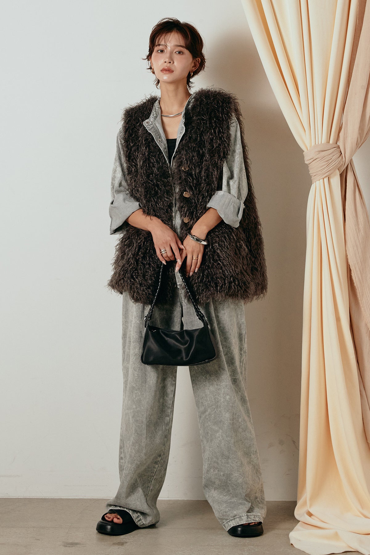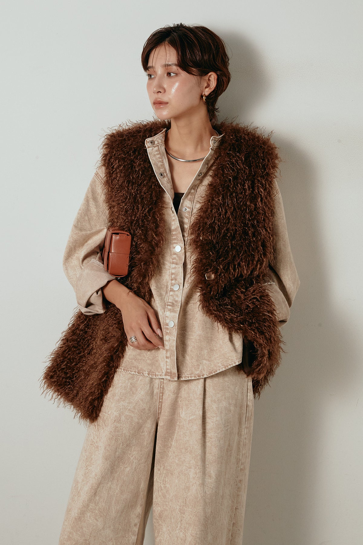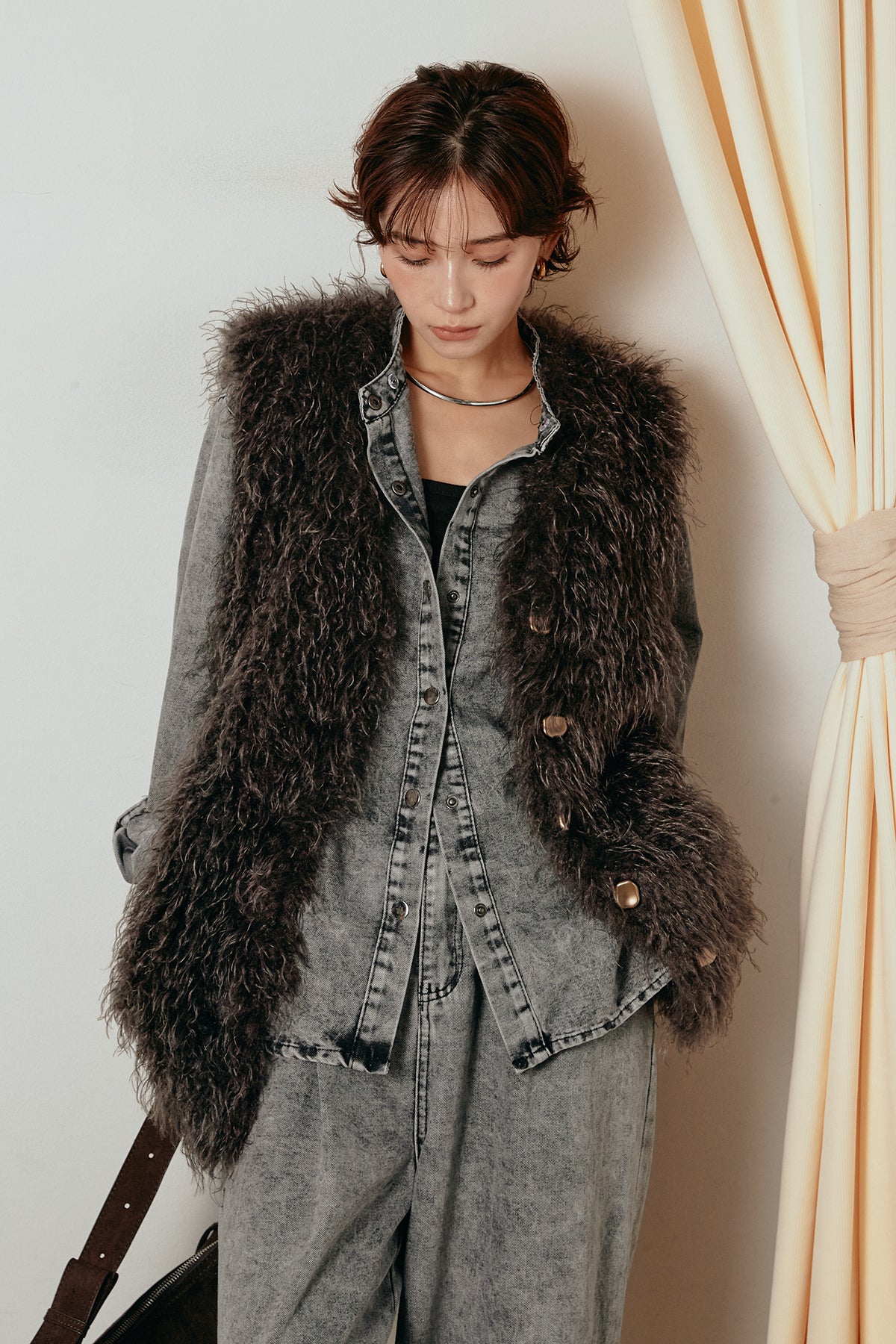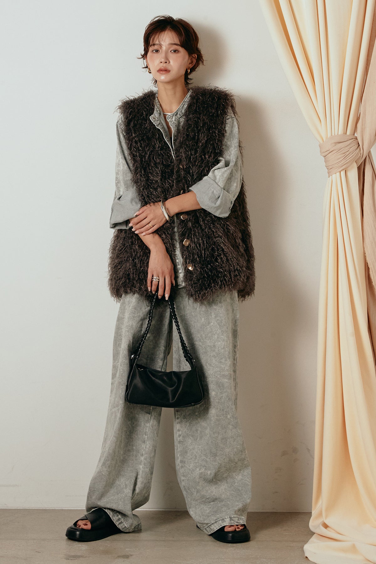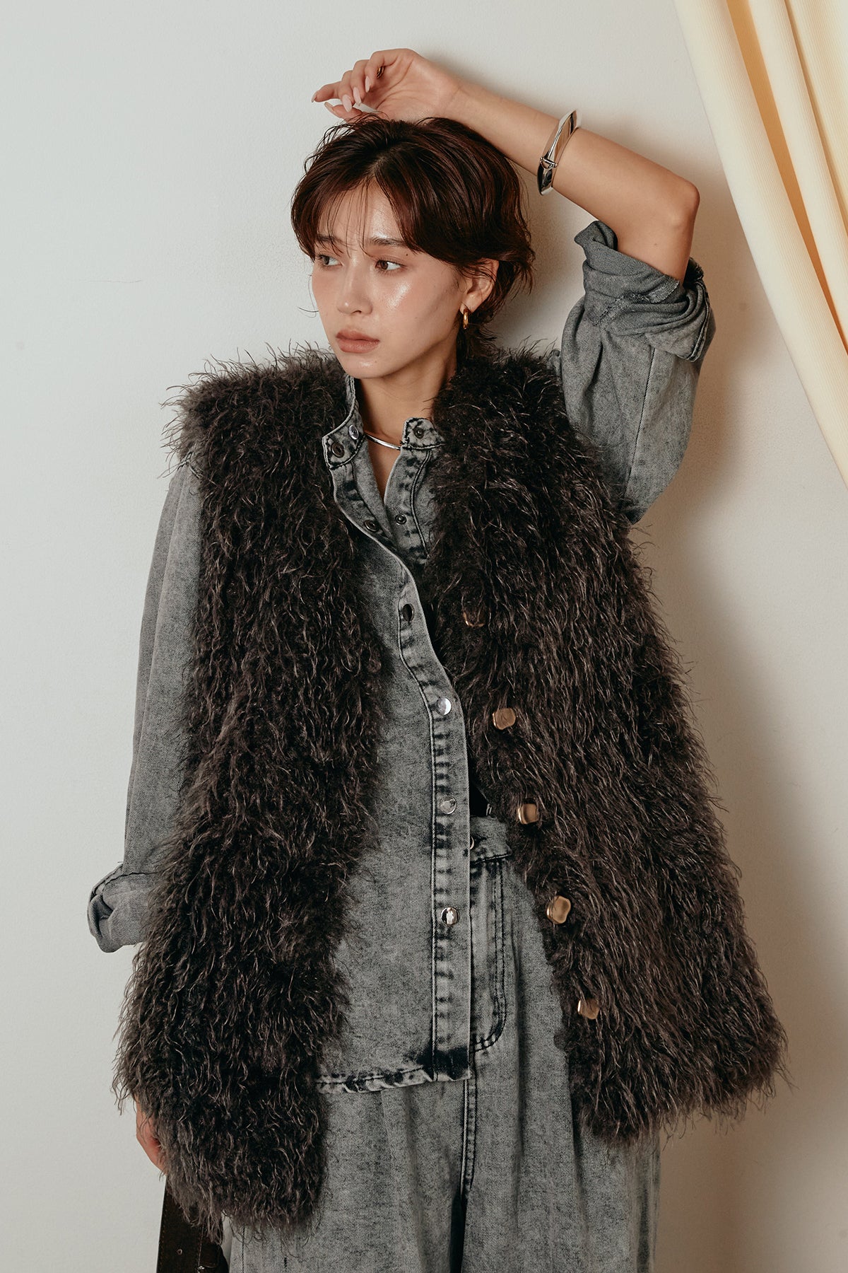 ふんわりとしたシャギーファーがシーズンムードを高めるボタン付きベスト。柔らかな質感と程よいボリュームが存在感を放ち、羽織るだけでスタイリングをアップデート。中はすっきりとした裏地仕様で着心地も快適。ニットやシャツに重ねて、秋冬らしいレイヤードを楽しめる一枚です。