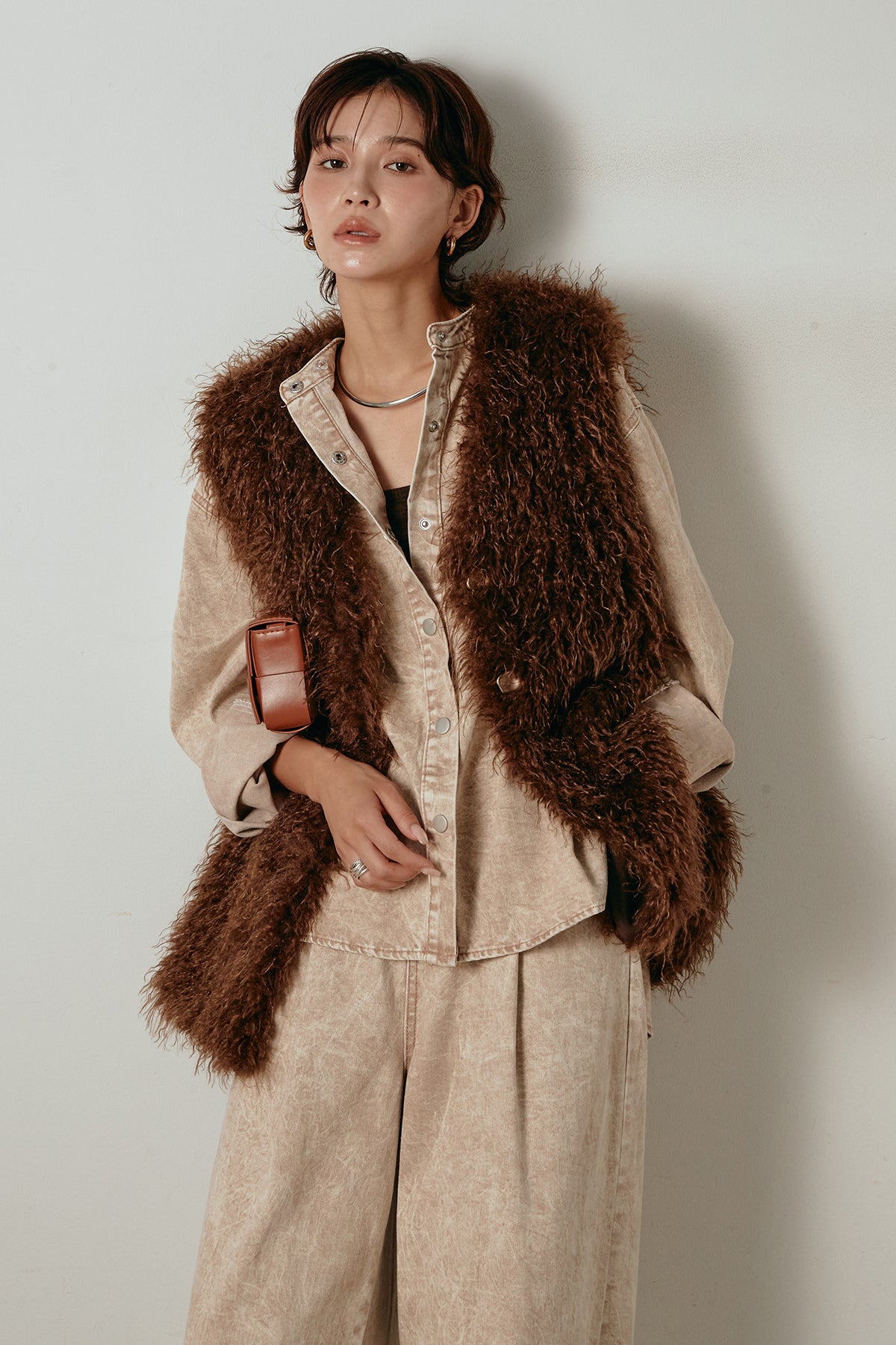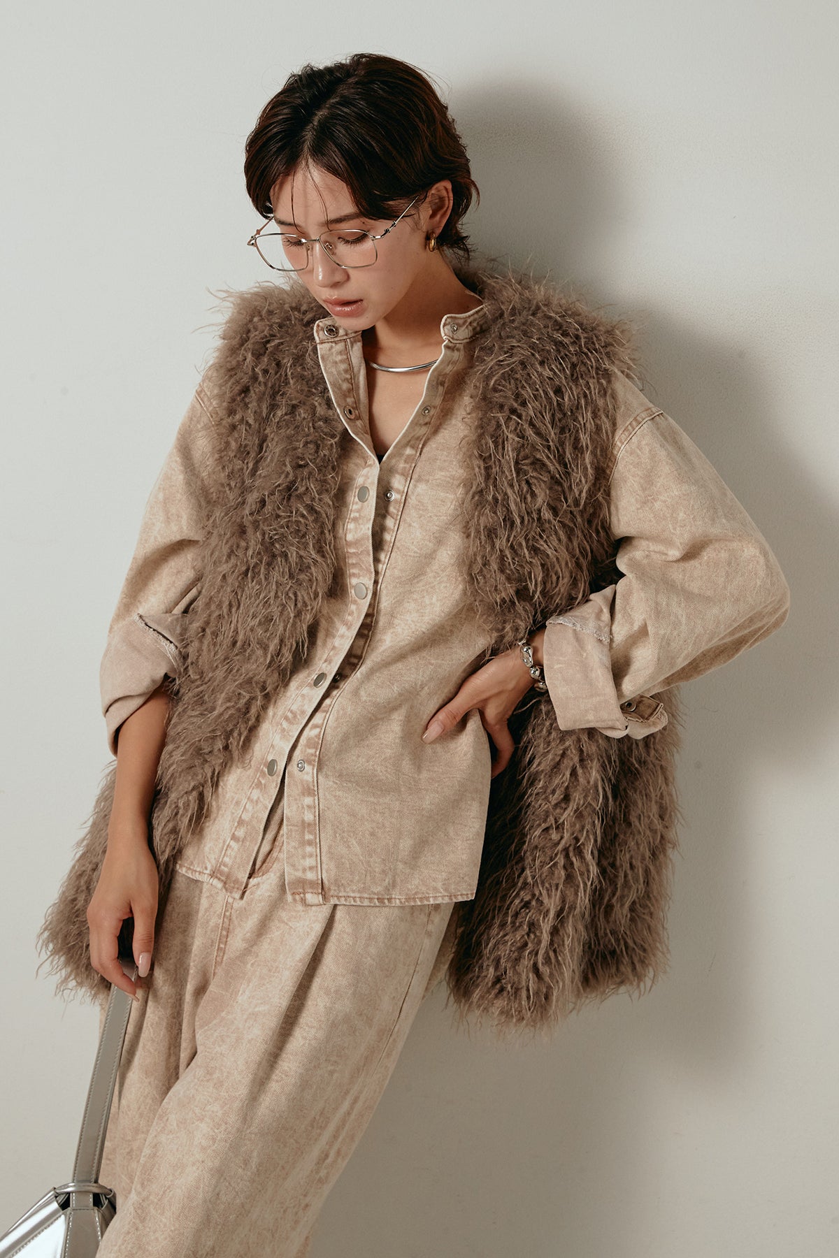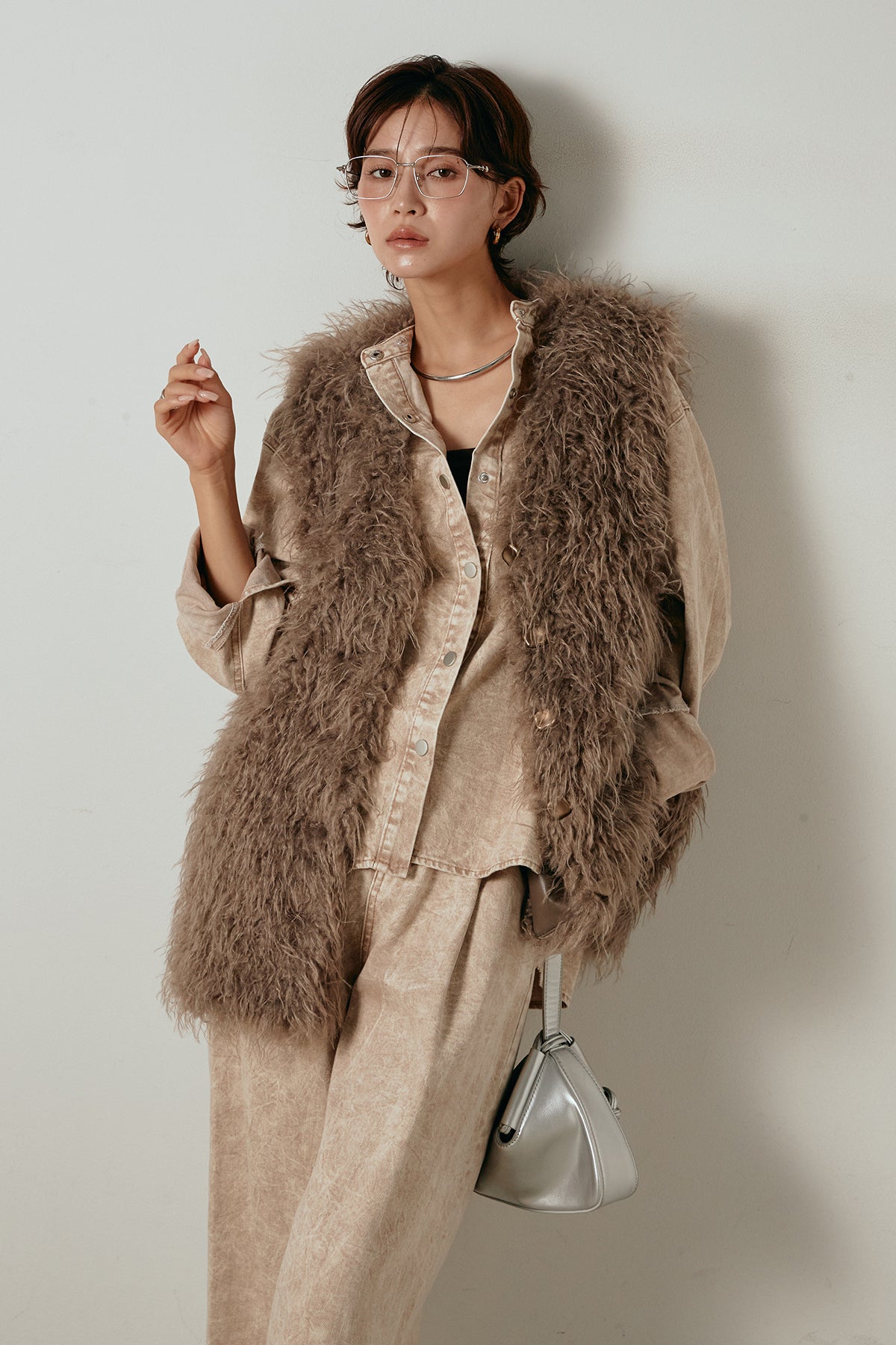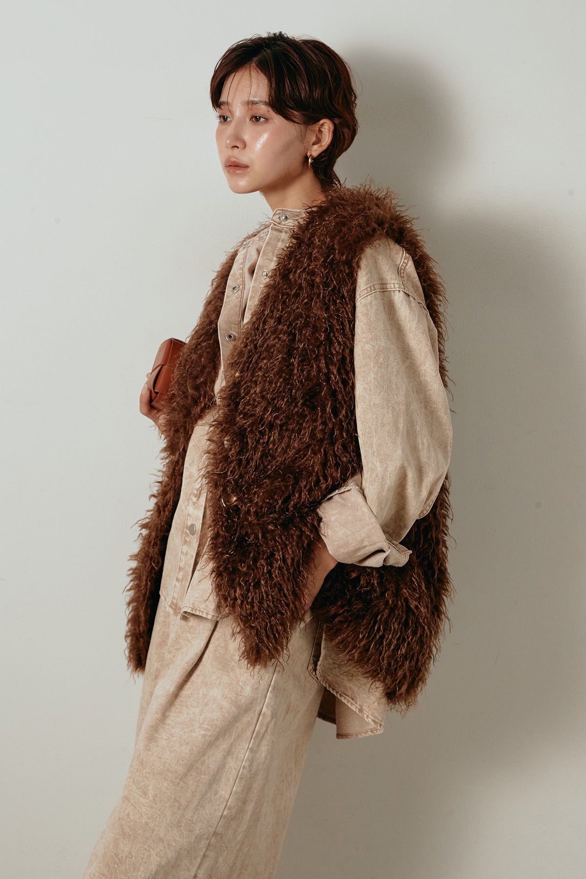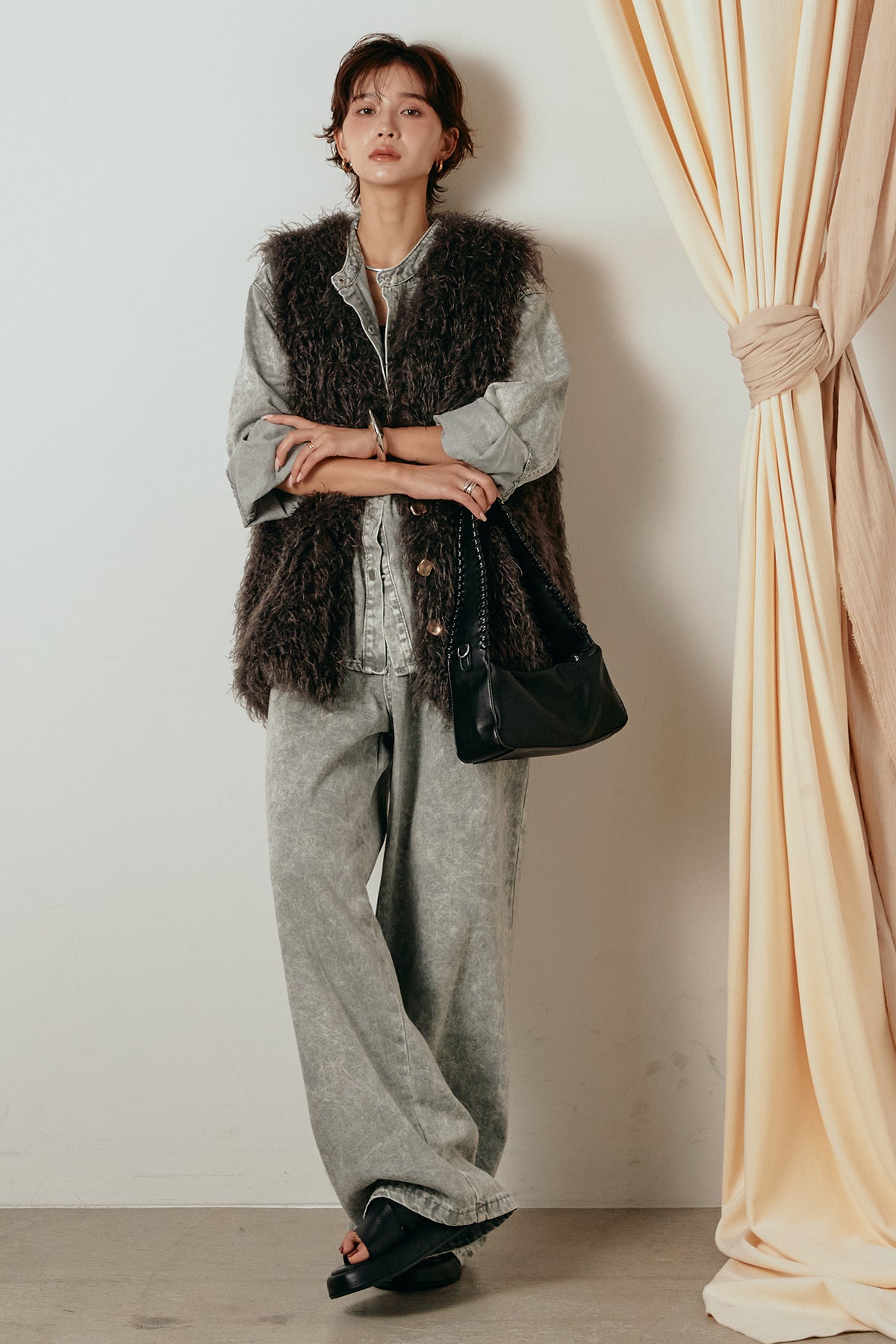 ふんわりとしたシャギーファーがシーズンムードを高めるボタン付きベスト。柔らかな質感と程よいボリュームが存在感を放ち、羽織るだけでスタイリングをアップデート。中はすっきりとした裏地仕様で着心地も快適。ニットやシャツに重ねて、秋冬らしいレイヤードを楽しめる一枚です。