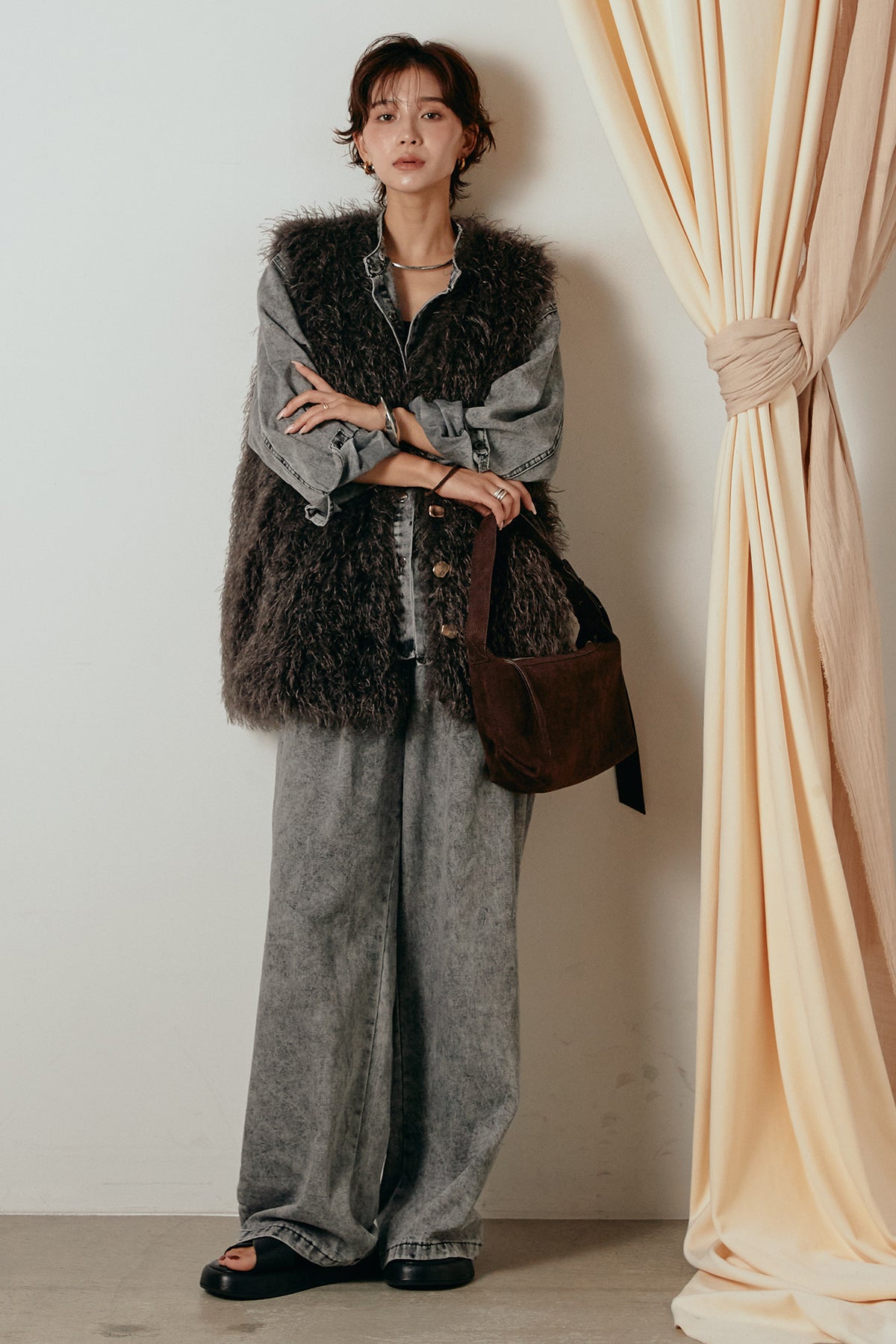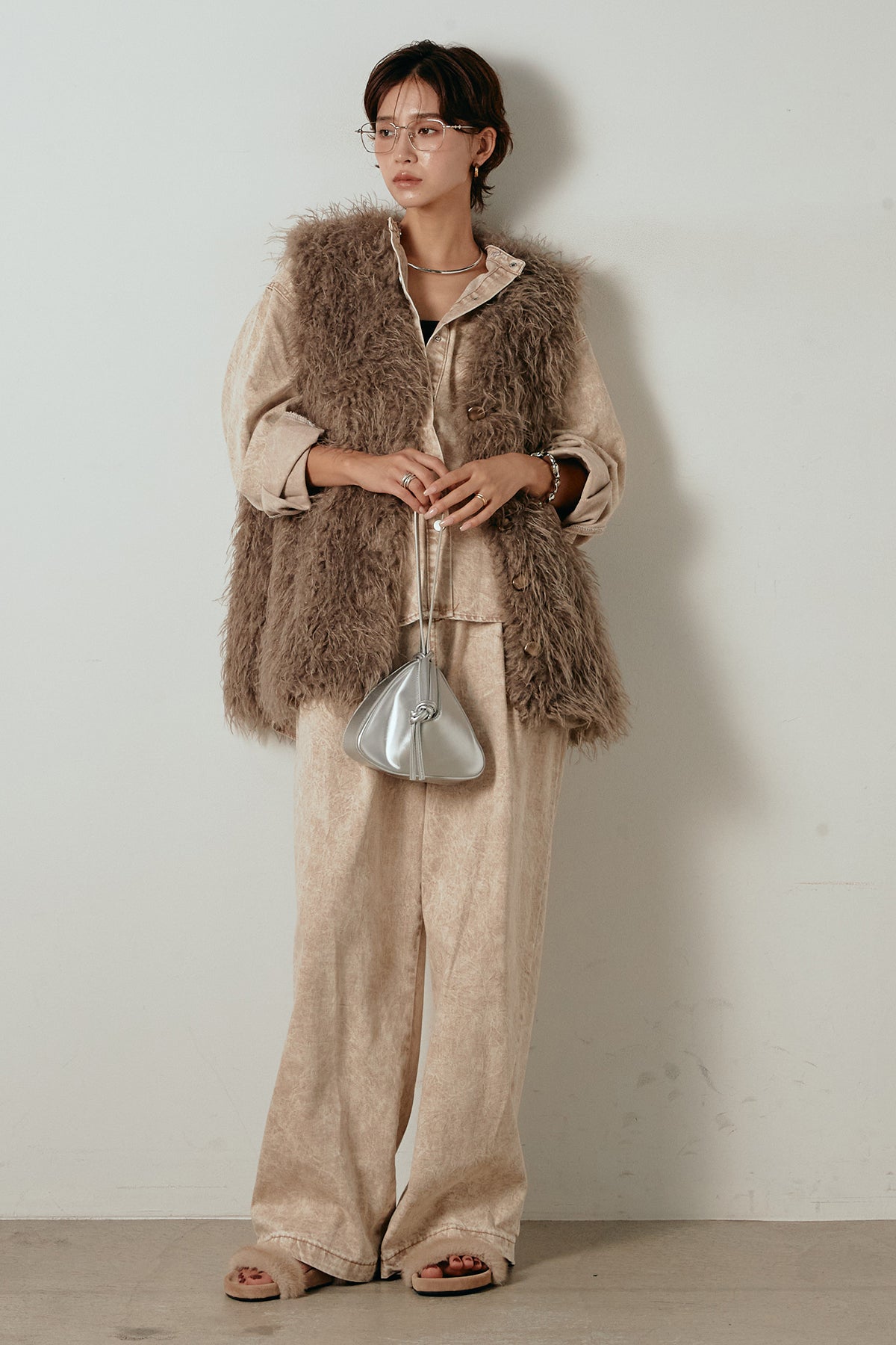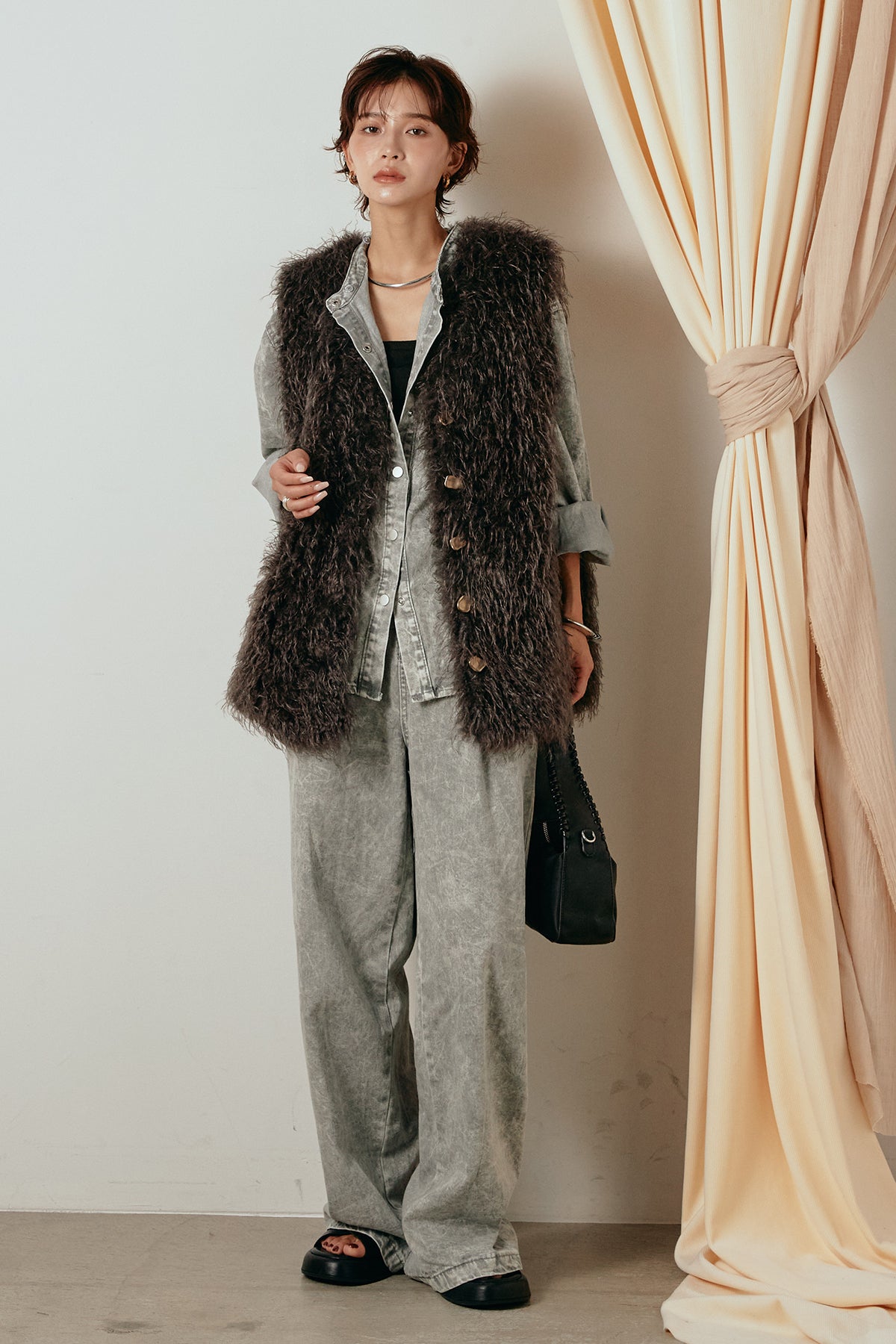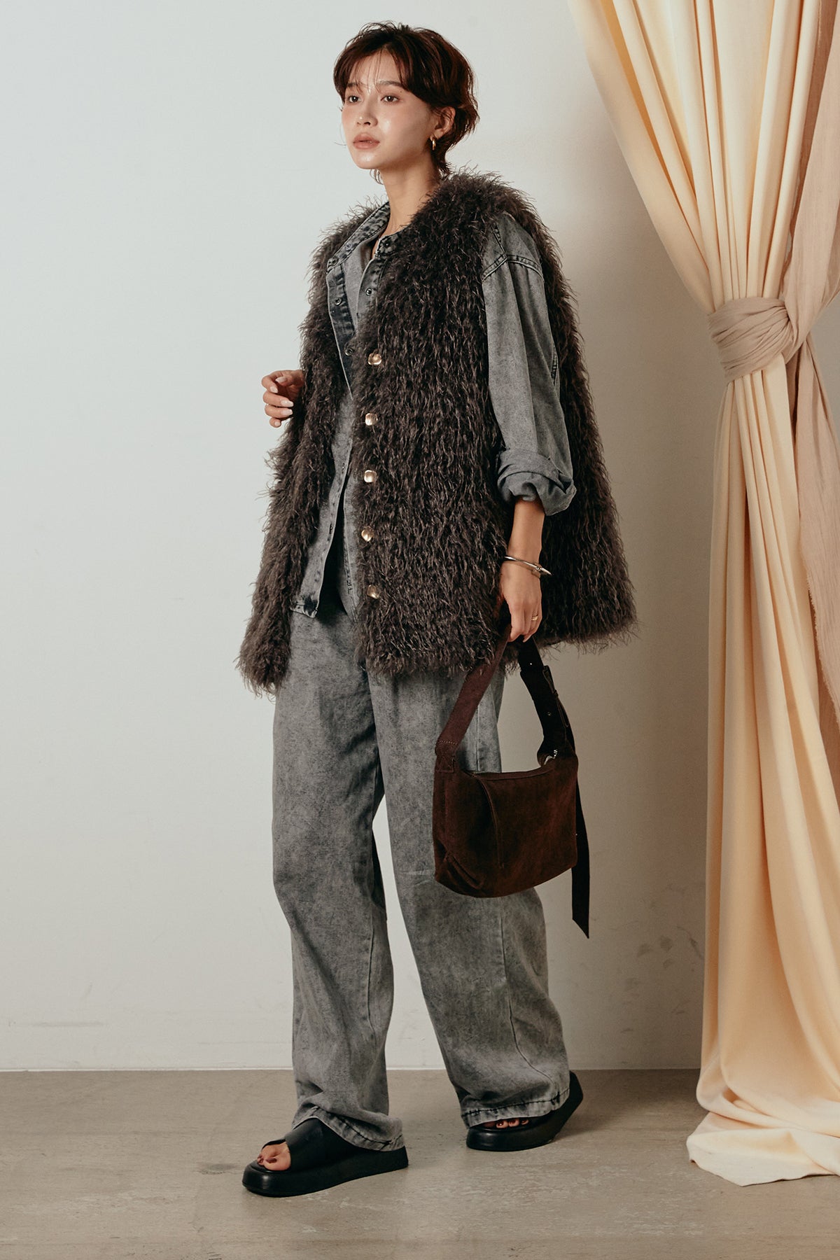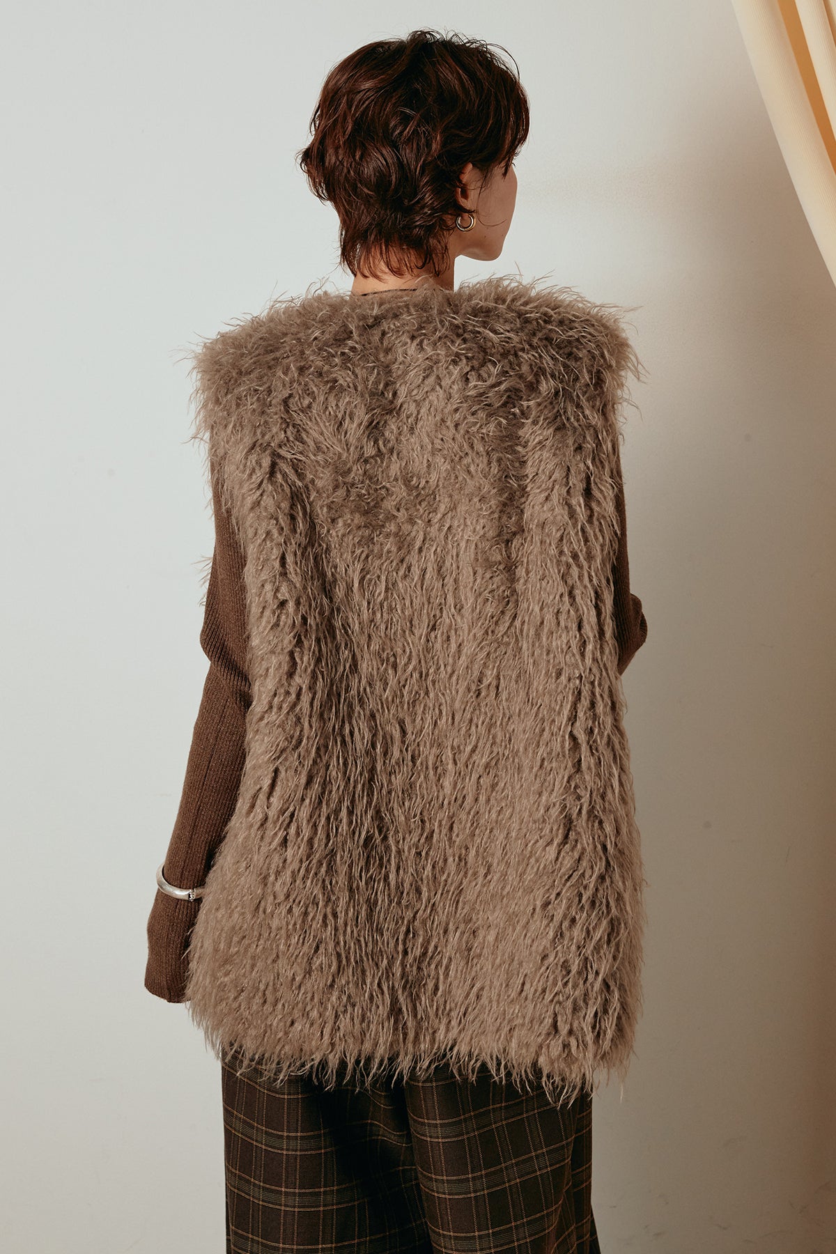 ふんわりとしたシャギーファーがシーズンムードを高めるボタン付きベスト。柔らかな質感と程よいボリュームが存在感を放ち、羽織るだけでスタイリングをアップデート。中はすっきりとした裏地仕様で着心地も快適。ニットやシャツに重ねて、秋冬らしいレイヤードを楽しめる一枚です。