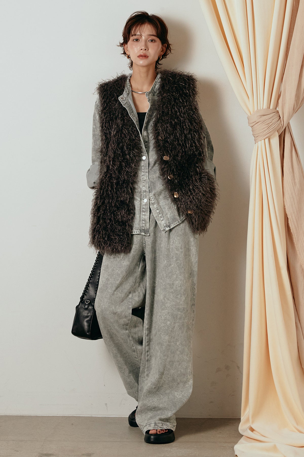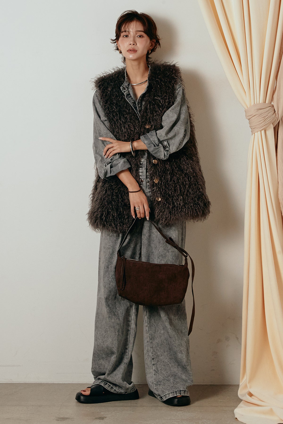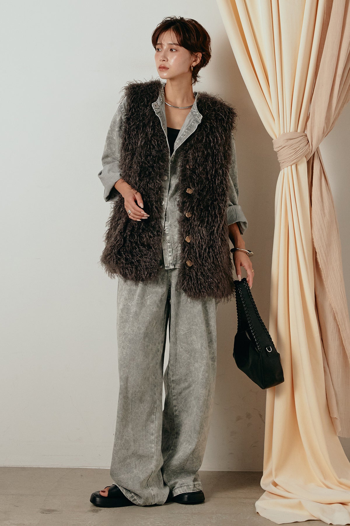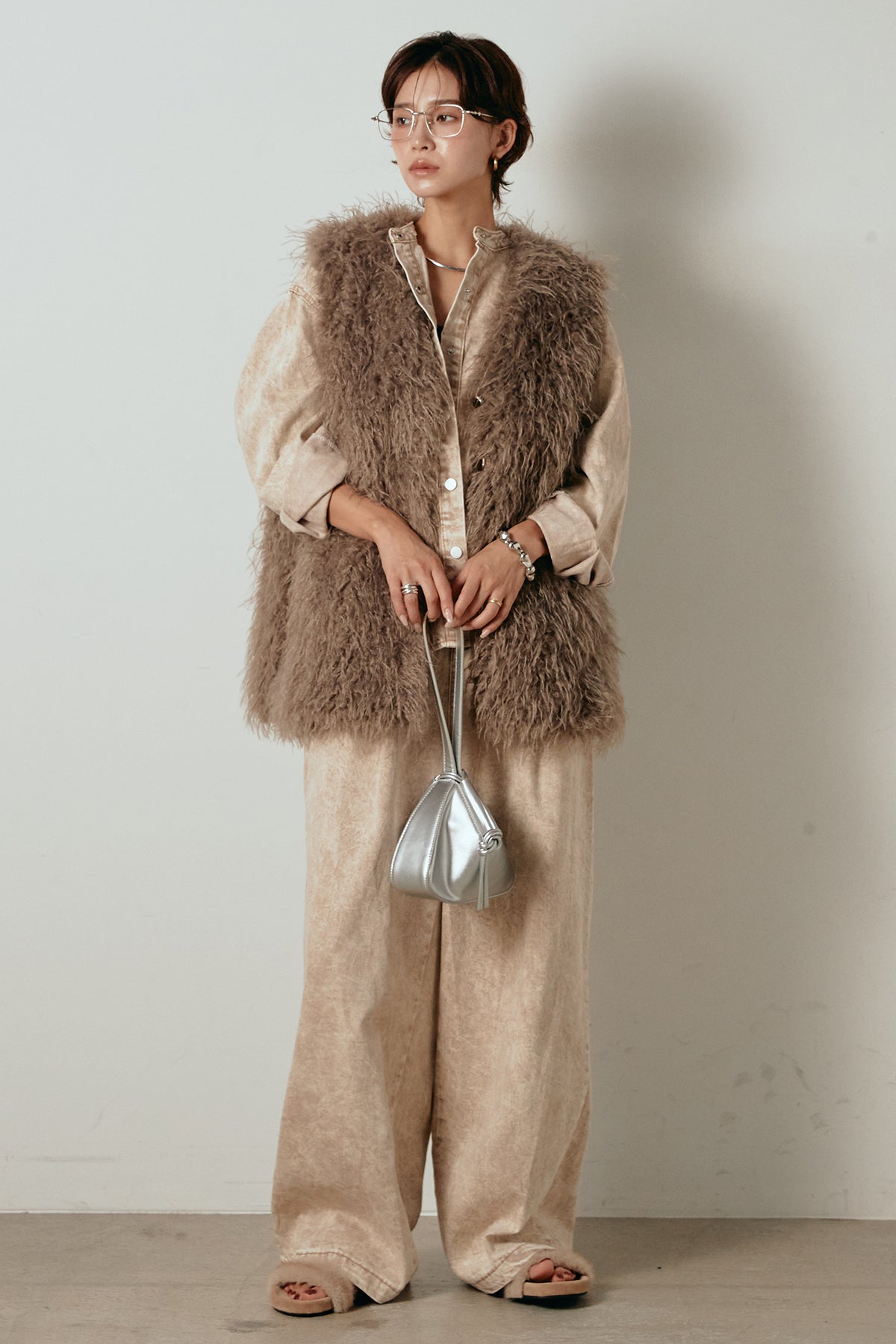 ふんわりとしたシャギーファーがシーズンムードを高めるボタン付きベスト。柔らかな質感と程よいボリュームが存在感を放ち、羽織るだけでスタイリングをアップデート。中はすっきりとした裏地仕様で着心地も快適。ニットやシャツに重ねて、秋冬らしいレイヤードを楽しめる一枚です。