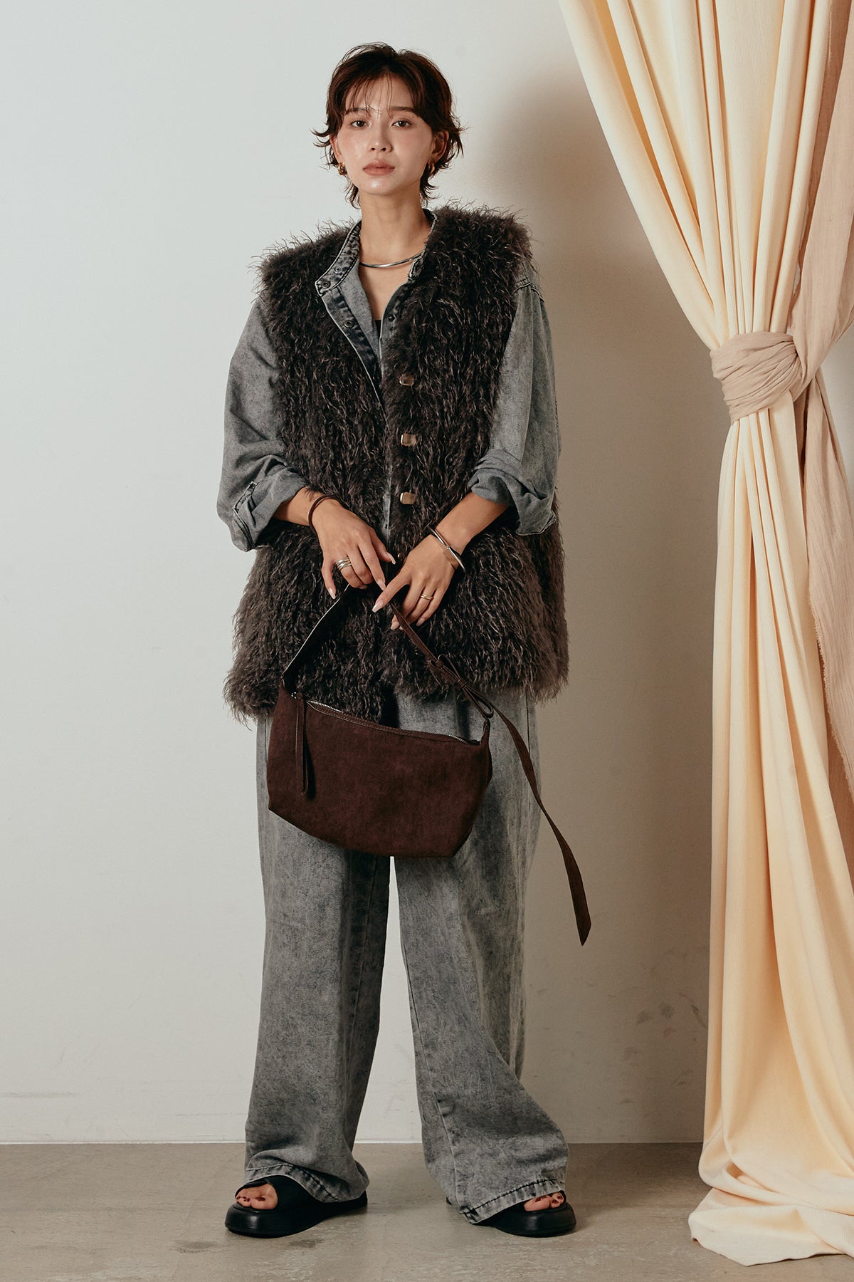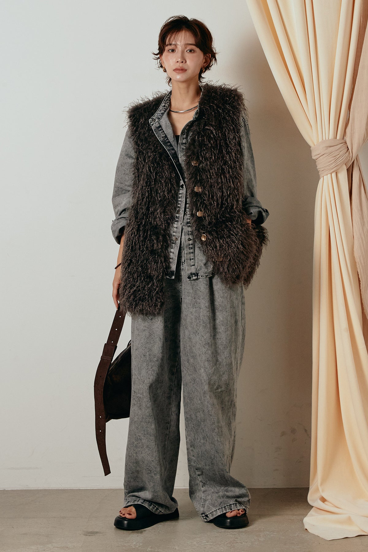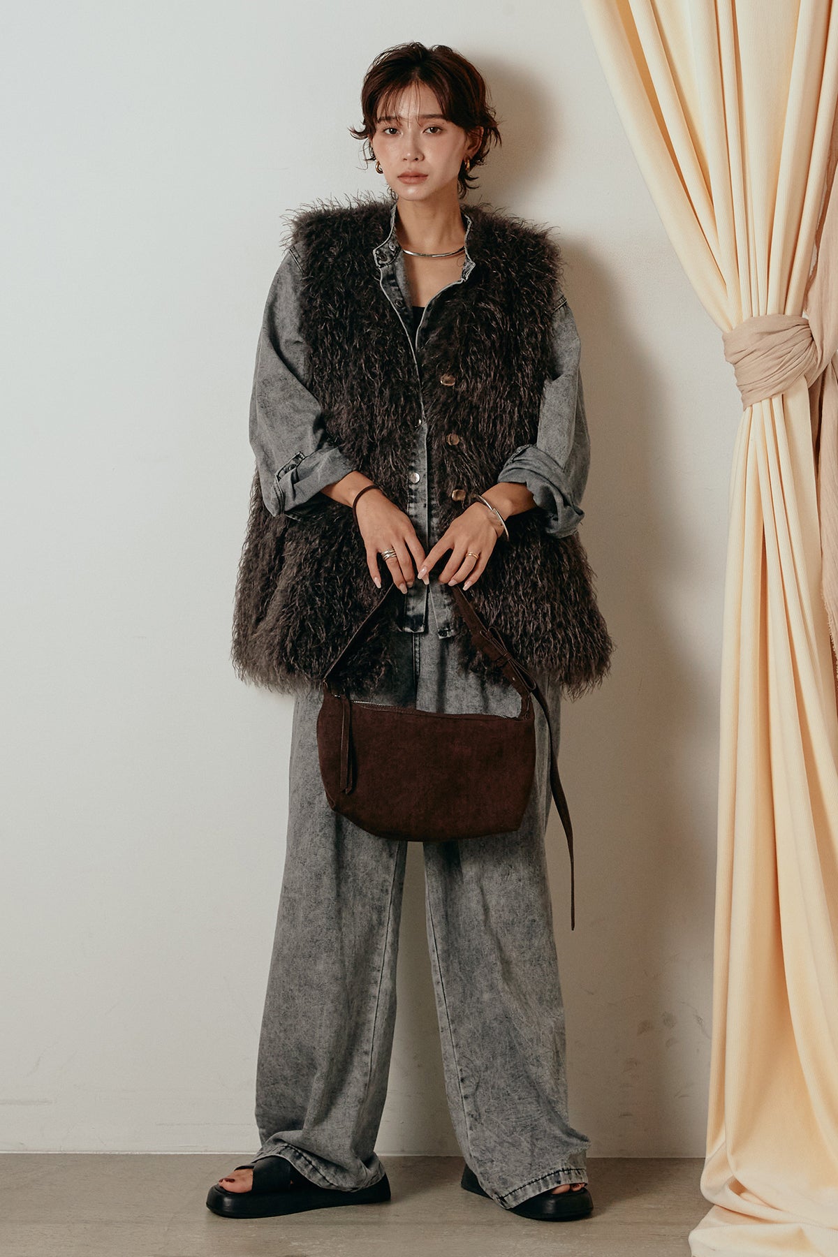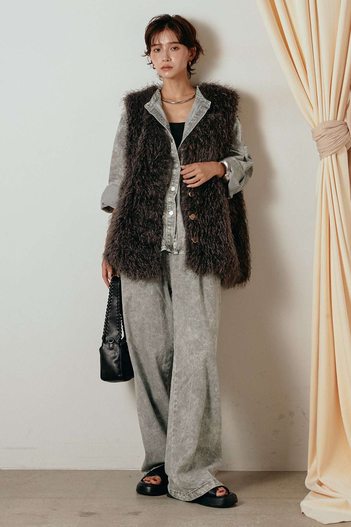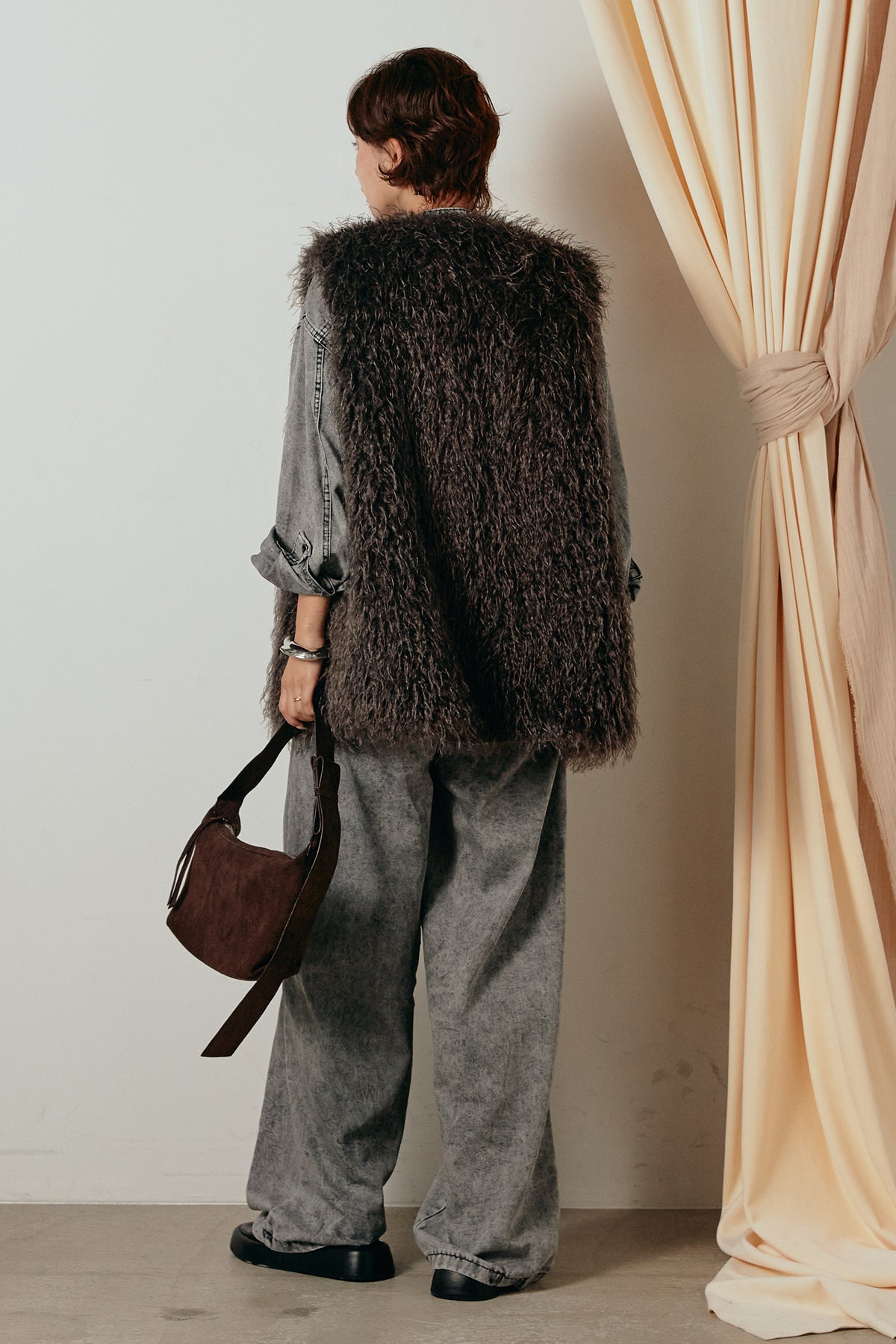 ふんわりとしたシャギーファーがシーズンムードを高めるボタン付きベスト。柔らかな質感と程よいボリュームが存在感を放ち、羽織るだけでスタイリングをアップデート。中はすっきりとした裏地仕様で着心地も快適。ニットやシャツに重ねて、秋冬らしいレイヤードを楽しめる一枚です。