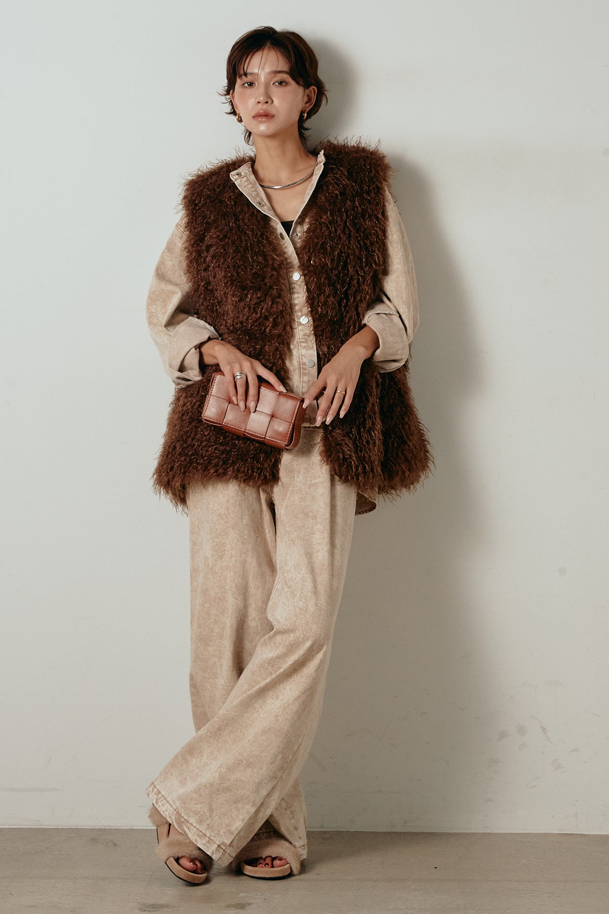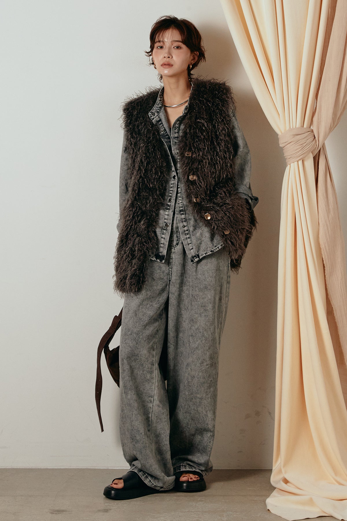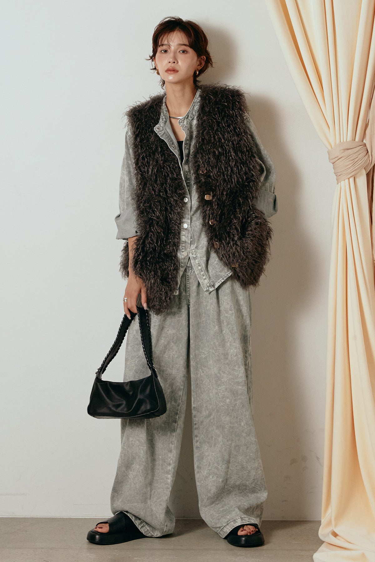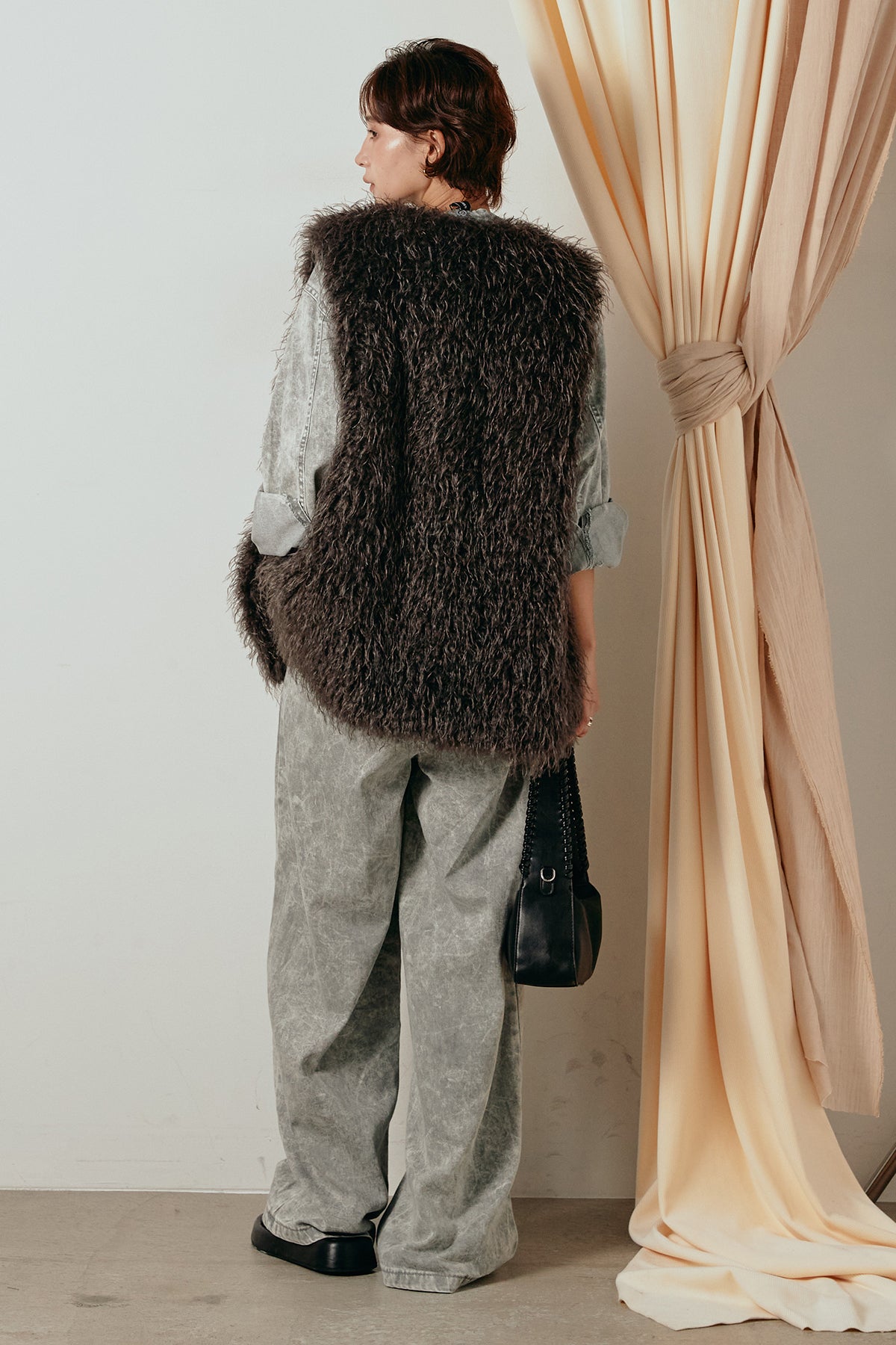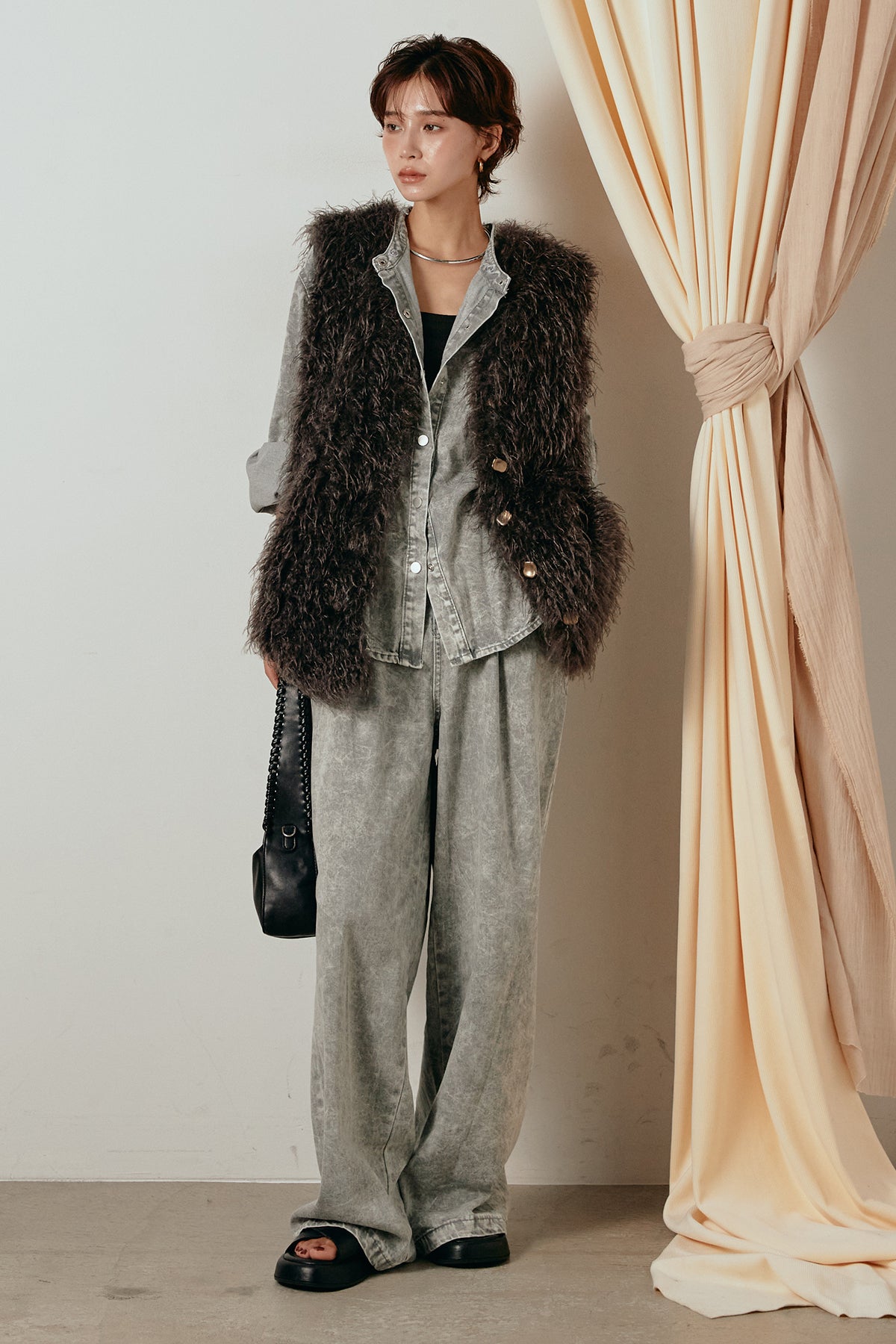 ふんわりとしたシャギーファーがシーズンムードを高めるボタン付きベスト。柔らかな質感と程よいボリュームが存在感を放ち、羽織るだけでスタイリングをアップデート。中はすっきりとした裏地仕様で着心地も快適。ニットやシャツに重ねて、秋冬らしいレイヤードを楽しめる一枚です。