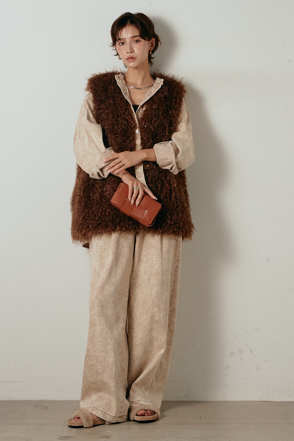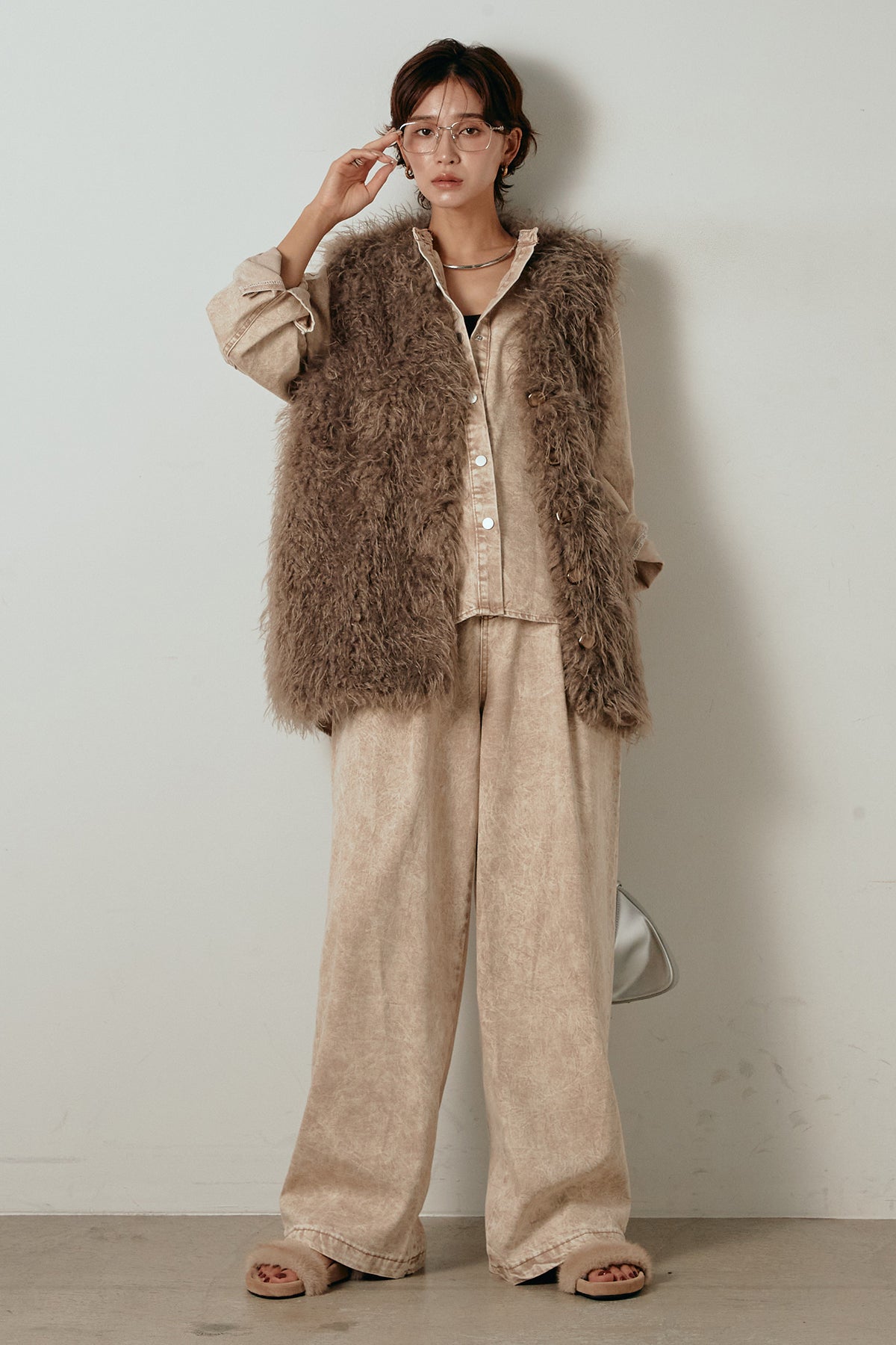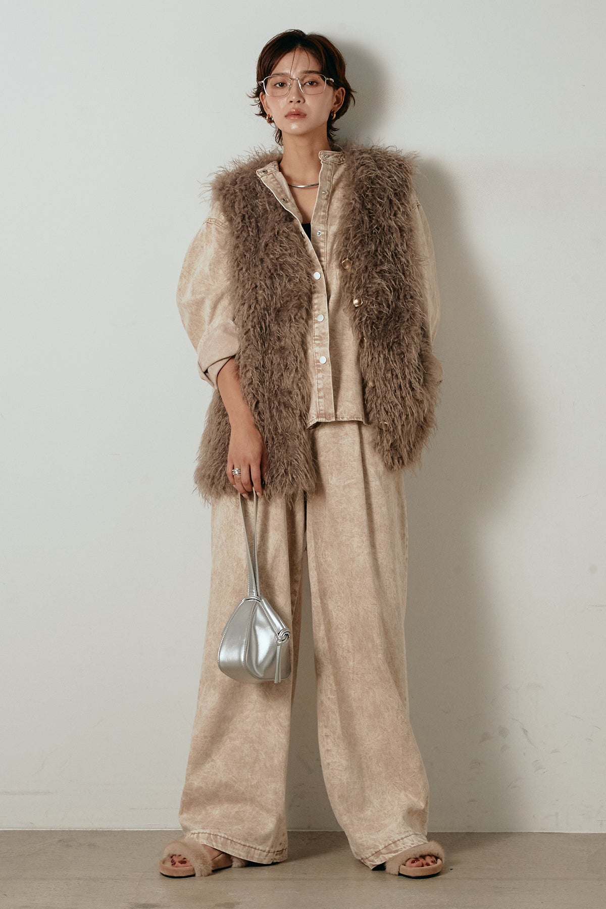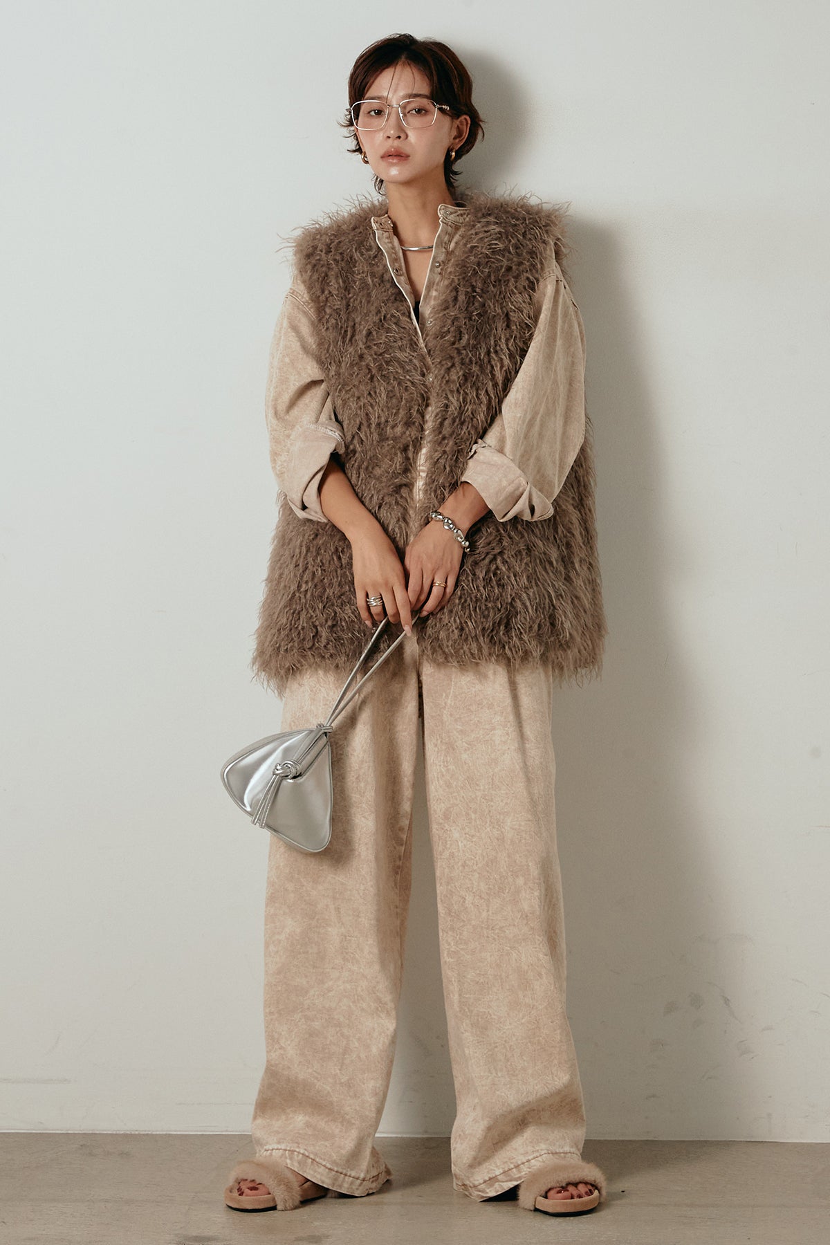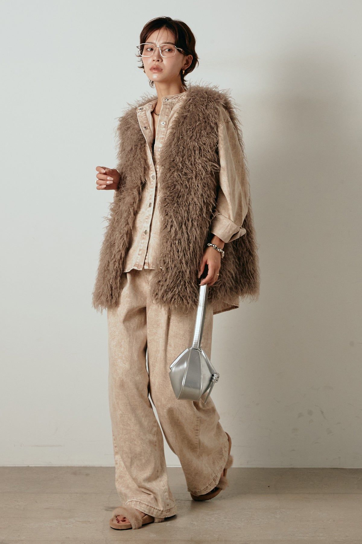 ふんわりとしたシャギーファーがシーズンムードを高めるボタン付きベスト。柔らかな質感と程よいボリュームが存在感を放ち、羽織るだけでスタイリングをアップデート。中はすっきりとした裏地仕様で着心地も快適。ニットやシャツに重ねて、秋冬らしいレイヤードを楽しめる一枚です。