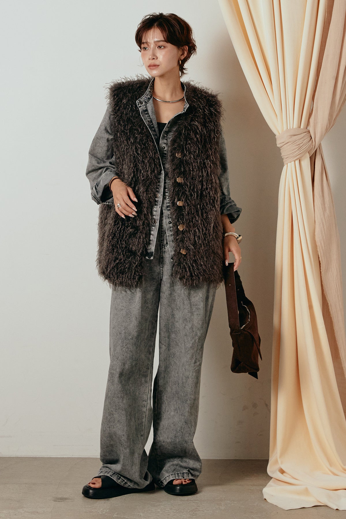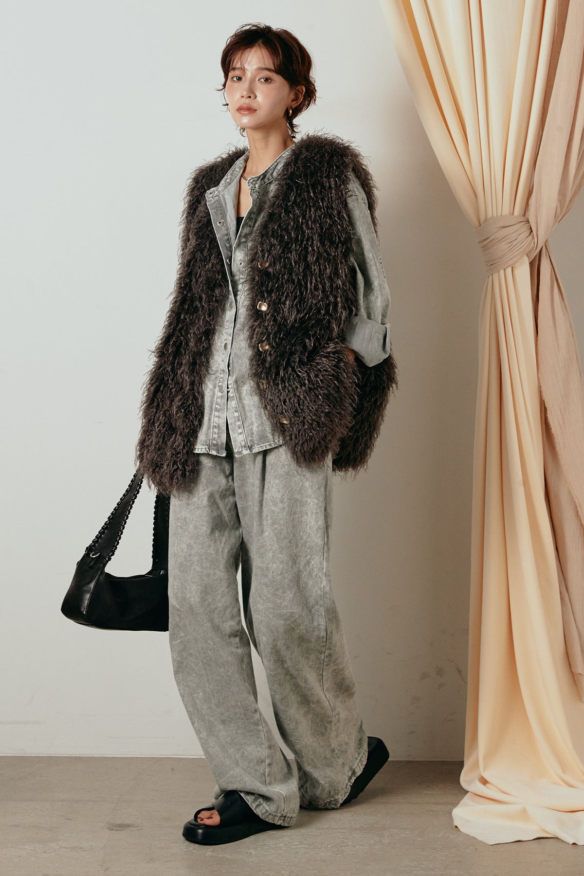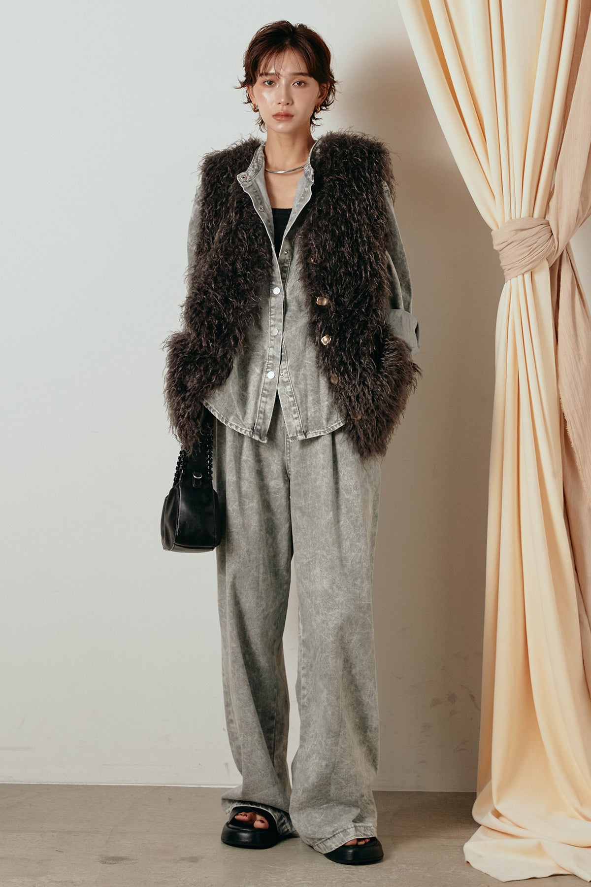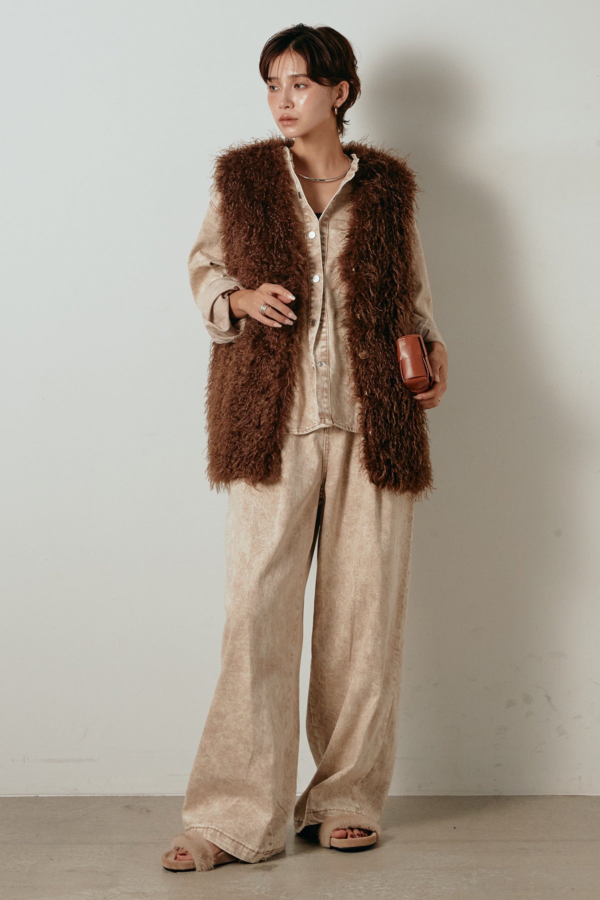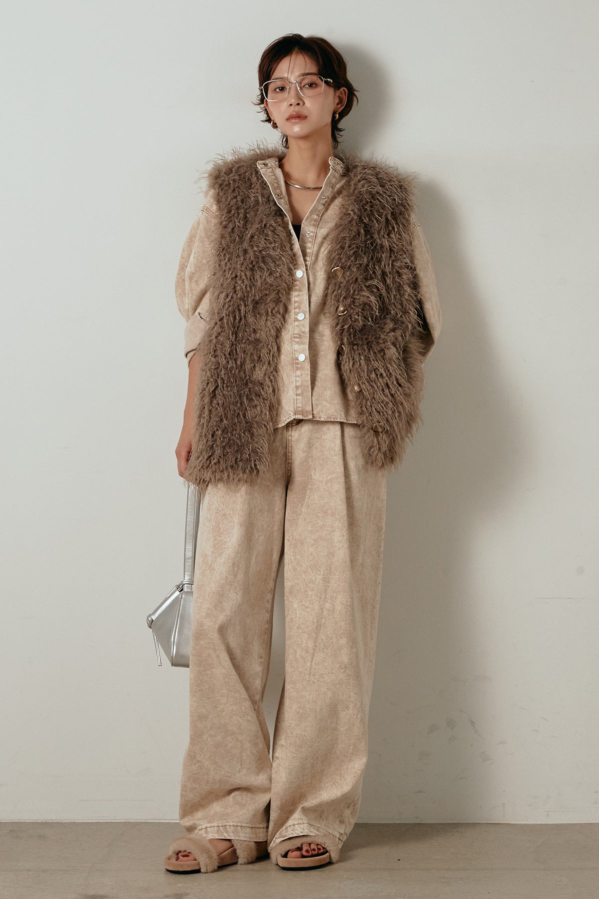 ふんわりとしたシャギーファーがシーズンムードを高めるボタン付きベスト。柔らかな質感と程よいボリュームが存在感を放ち、羽織るだけでスタイリングをアップデート。中はすっきりとした裏地仕様で着心地も快適。ニットやシャツに重ねて、秋冬らしいレイヤードを楽しめる一枚です。