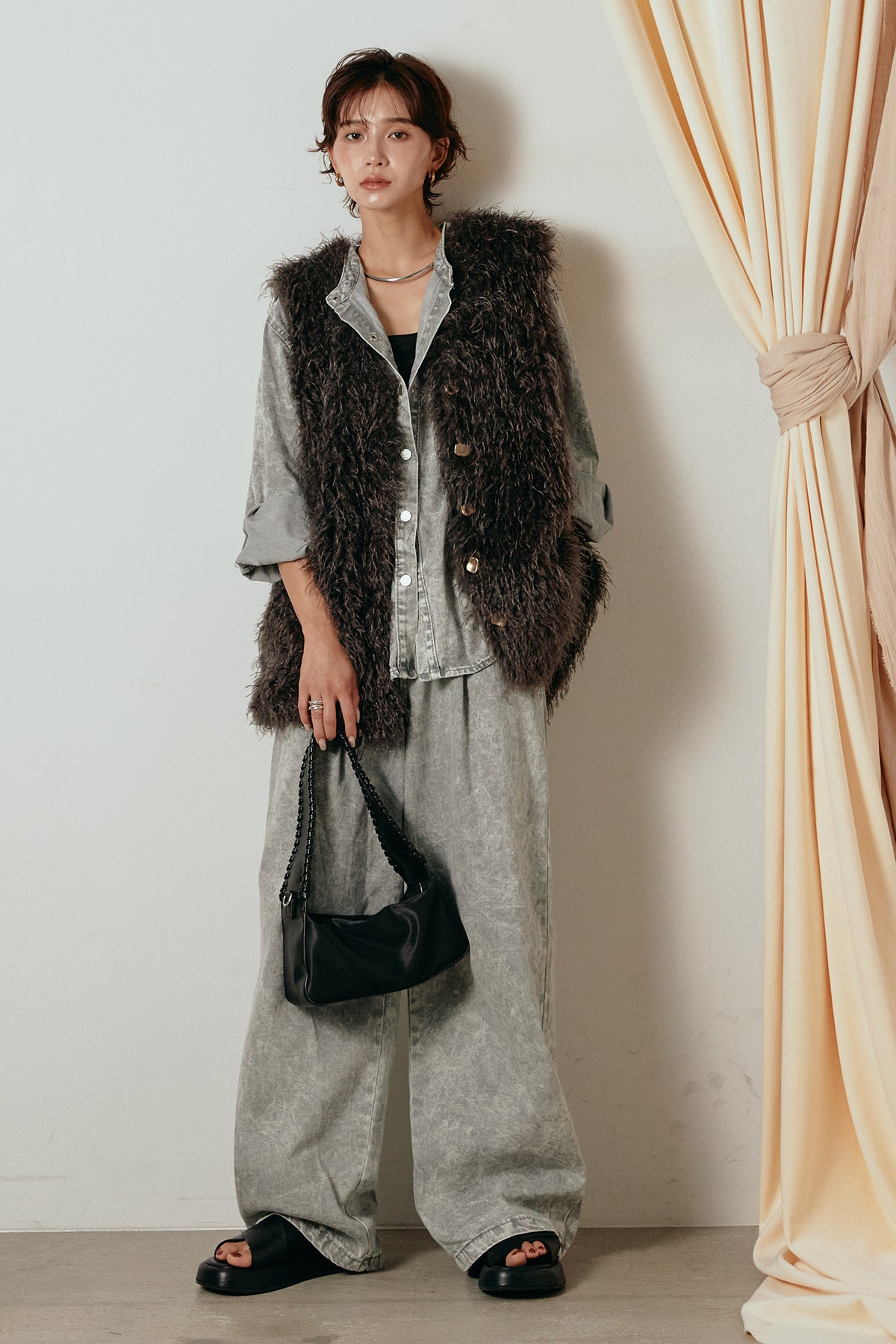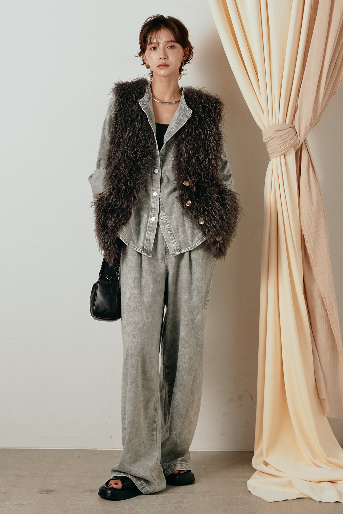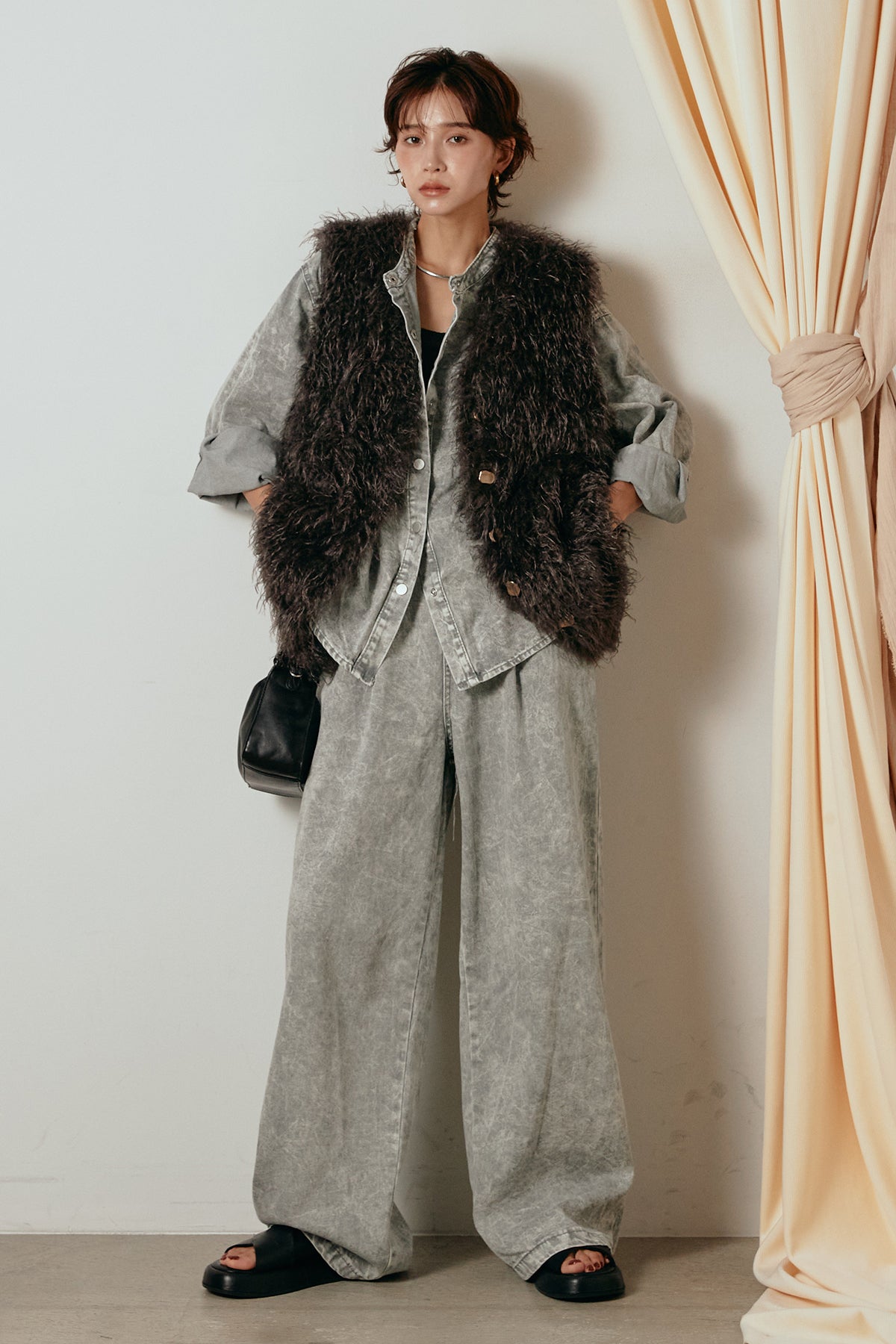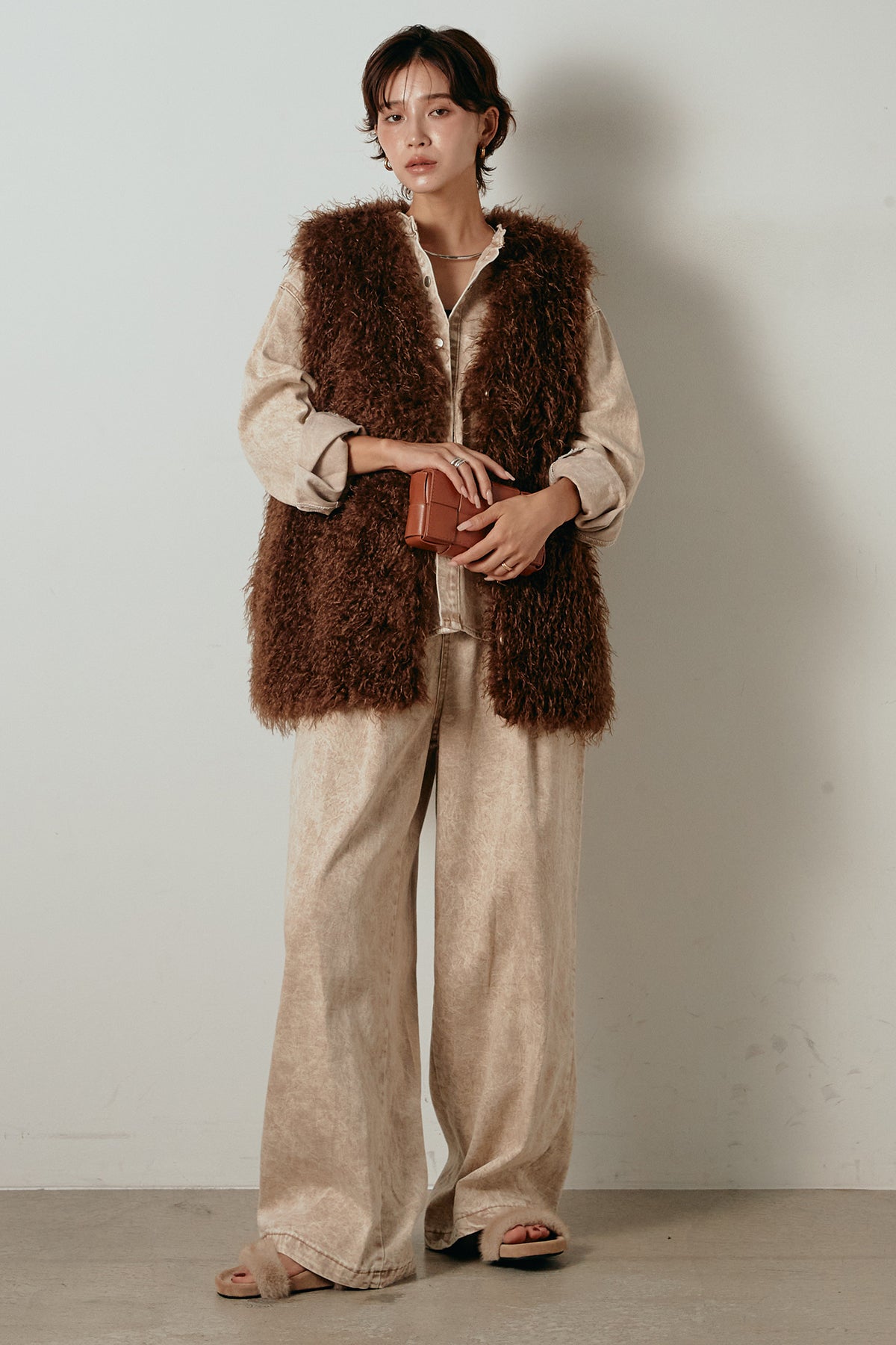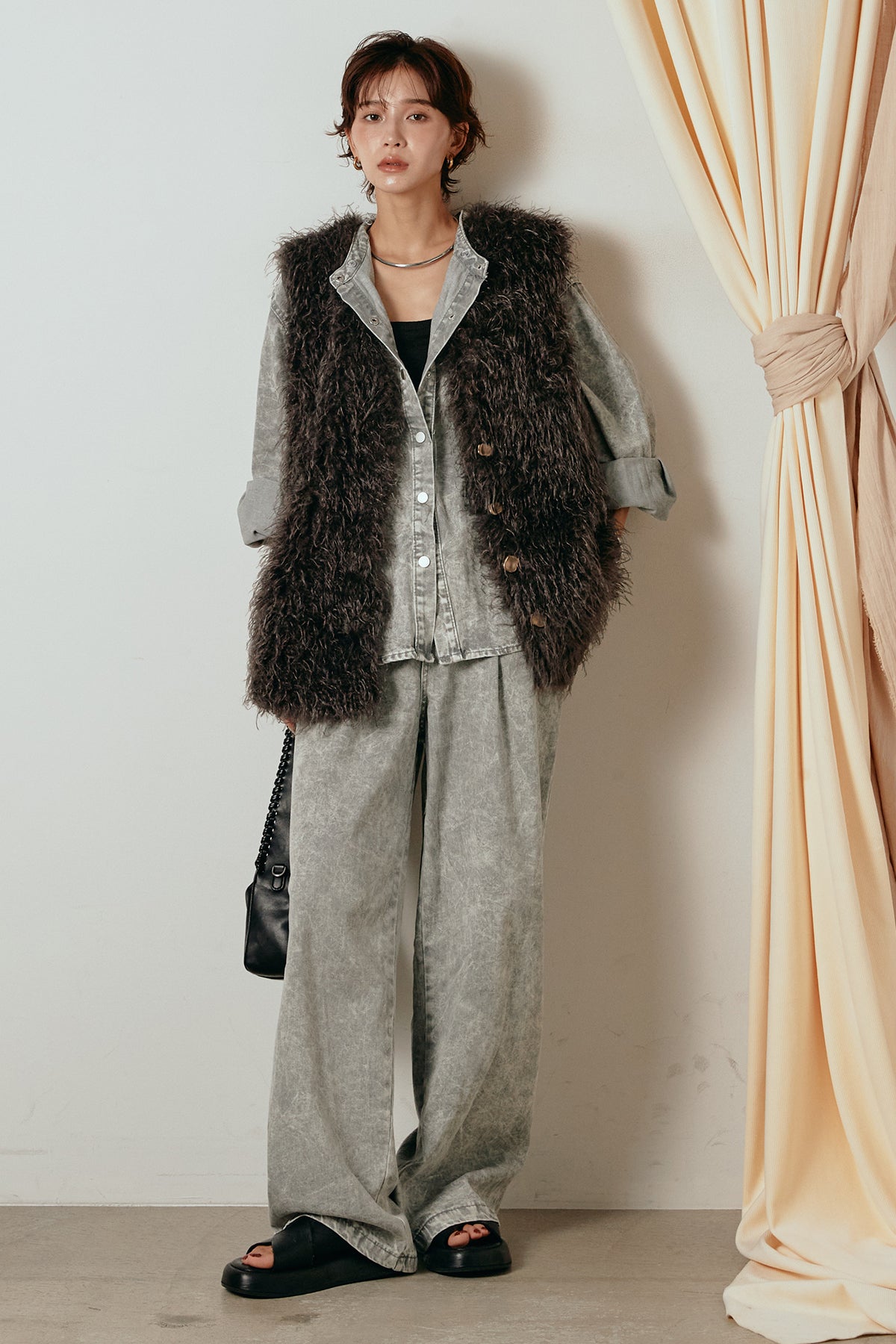 ふんわりとしたシャギーファーがシーズンムードを高めるボタン付きベスト。柔らかな質感と程よいボリュームが存在感を放ち、羽織るだけでスタイリングをアップデート。中はすっきりとした裏地仕様で着心地も快適。ニットやシャツに重ねて、秋冬らしいレイヤードを楽しめる一枚です。