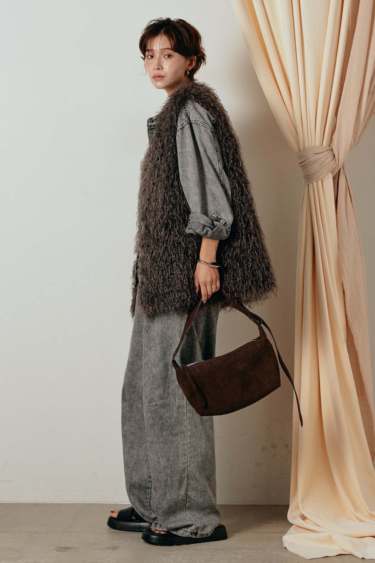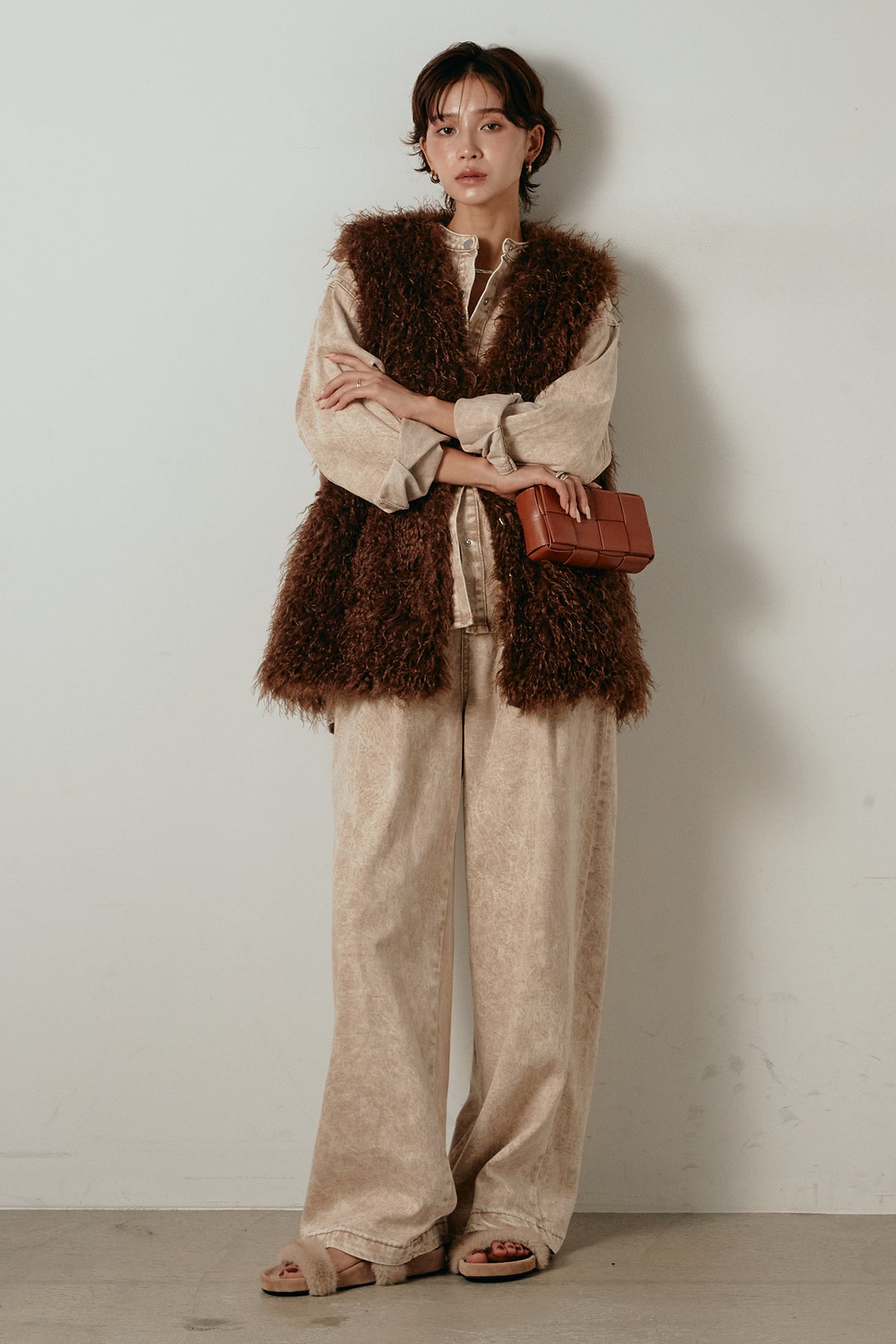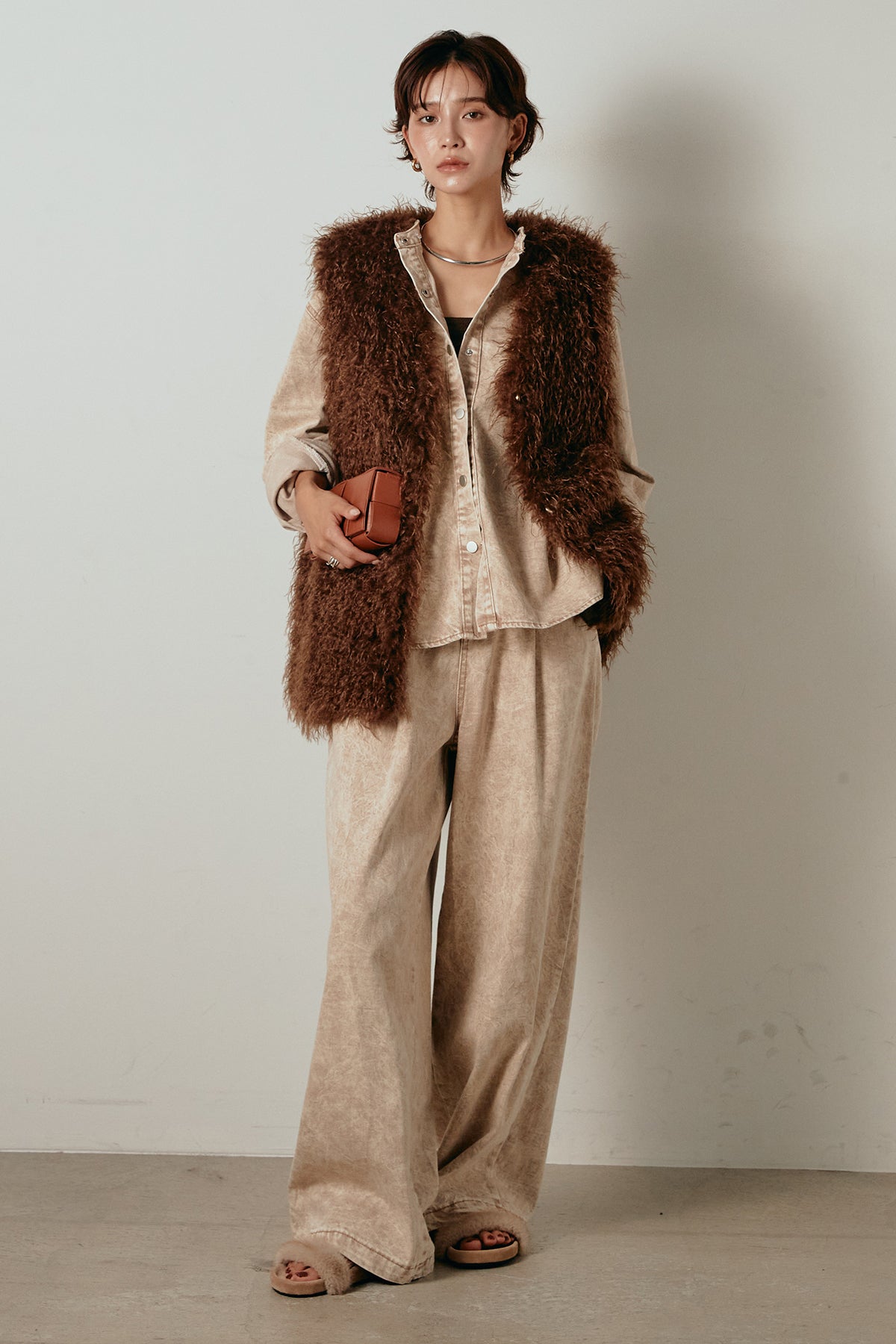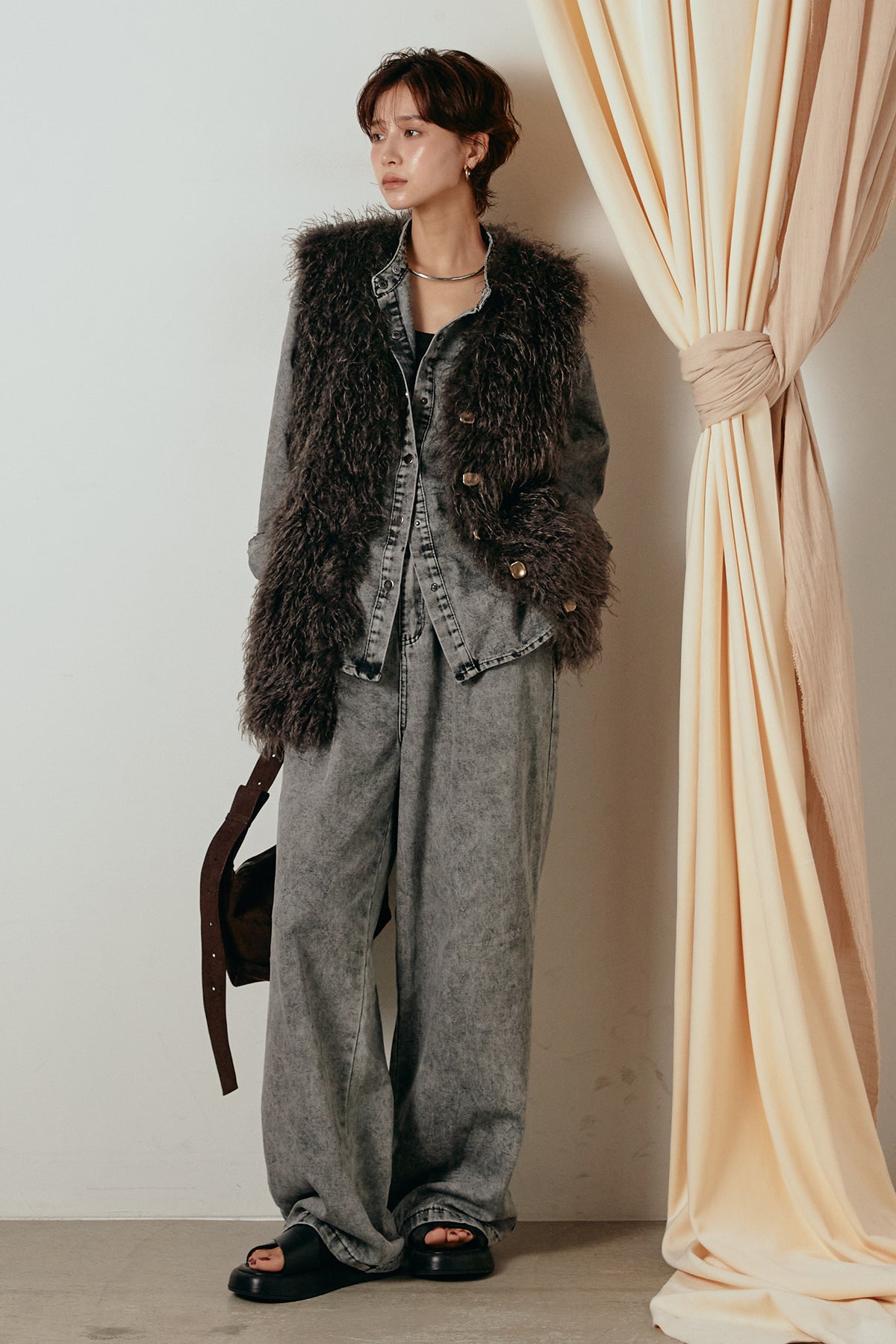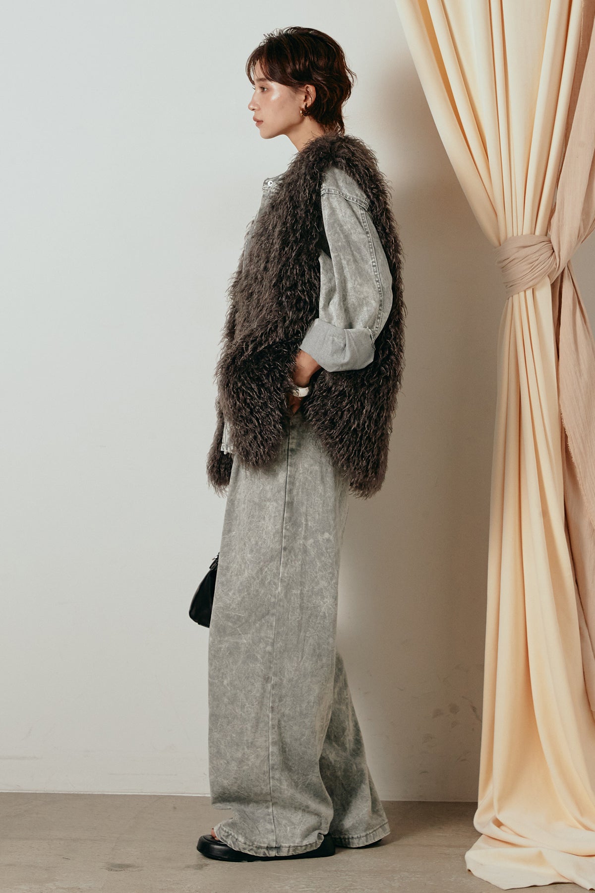 ふんわりとしたシャギーファーがシーズンムードを高めるボタン付きベスト。柔らかな質感と程よいボリュームが存在感を放ち、羽織るだけでスタイリングをアップデート。中はすっきりとした裏地仕様で着心地も快適。ニットやシャツに重ねて、秋冬らしいレイヤードを楽しめる一枚です。