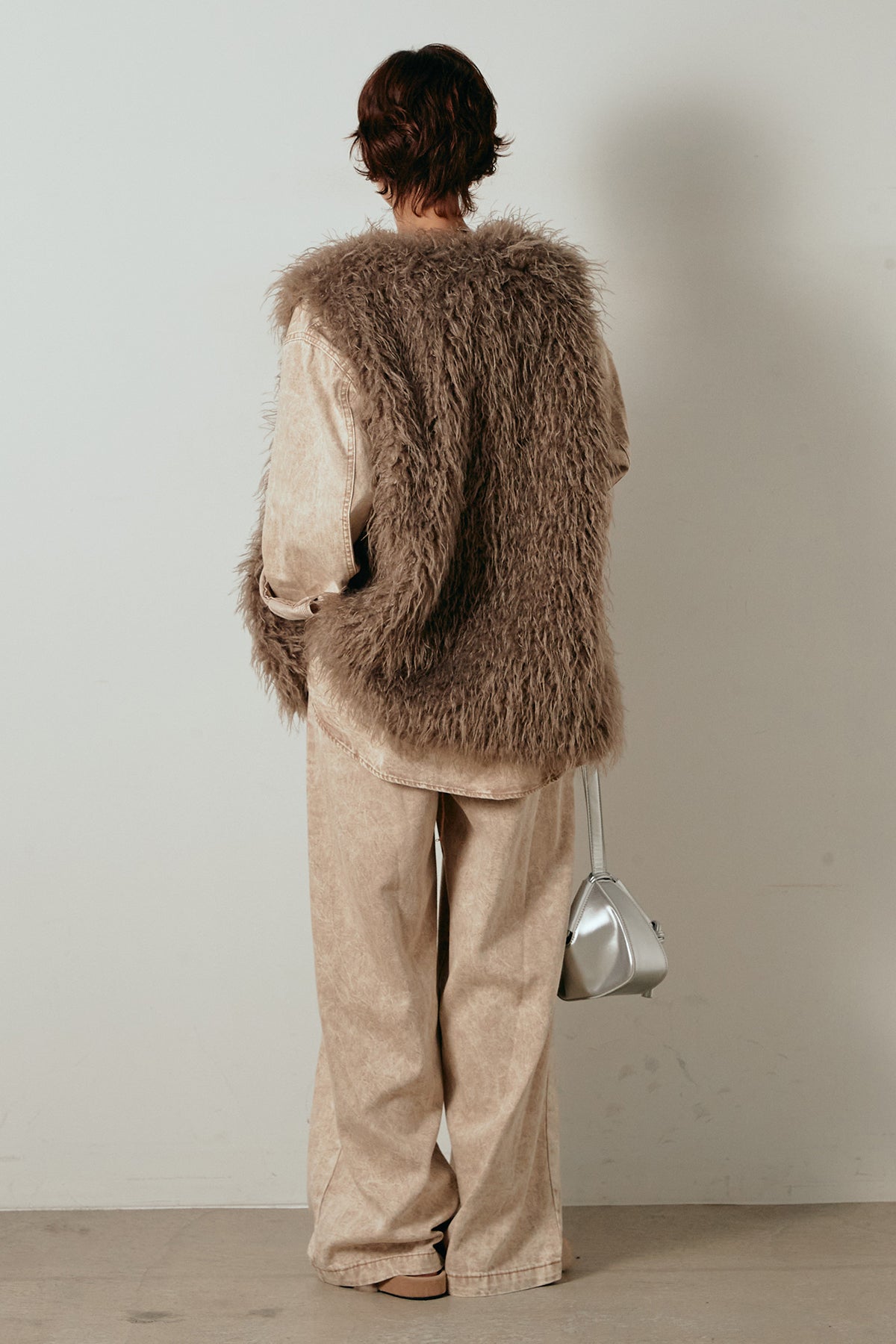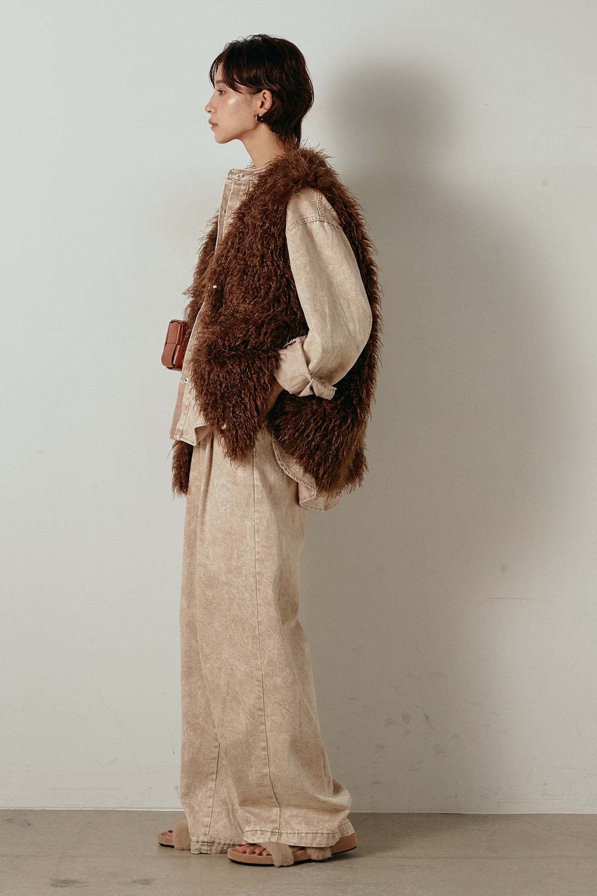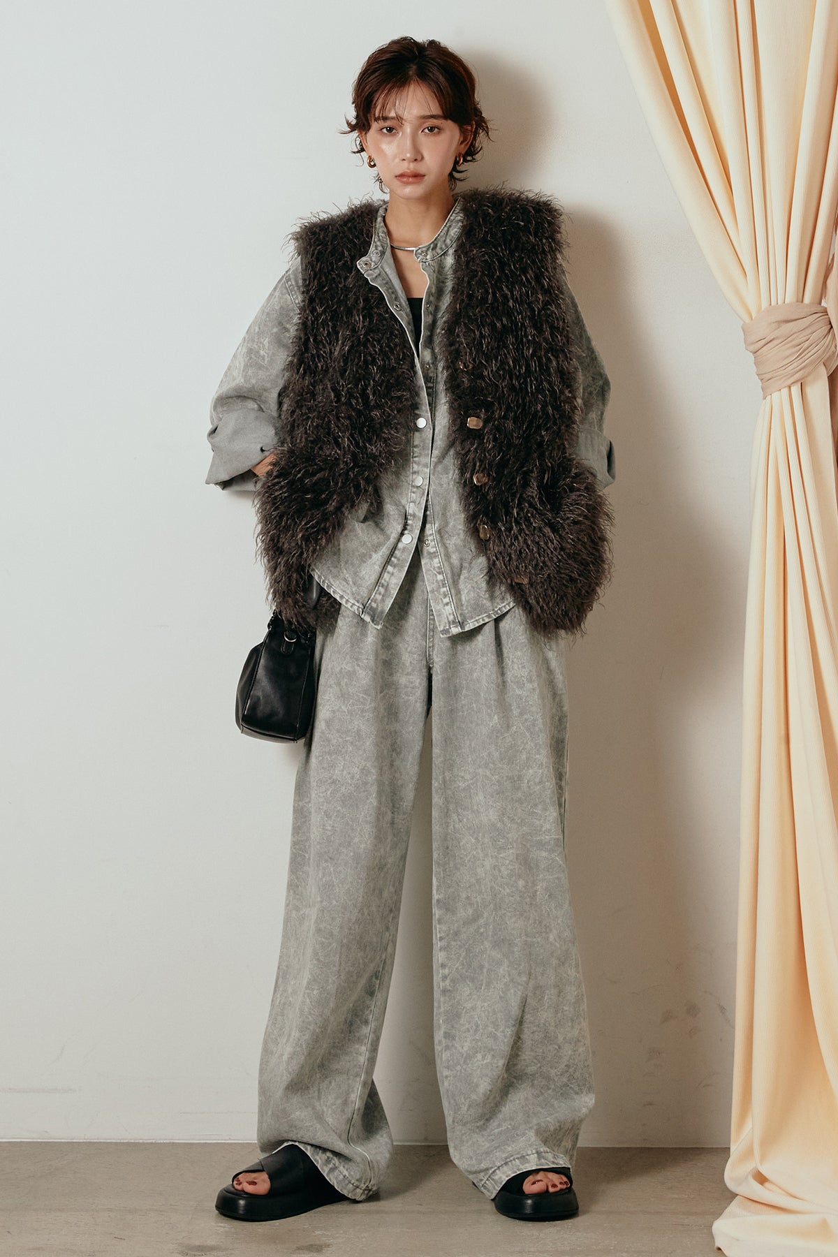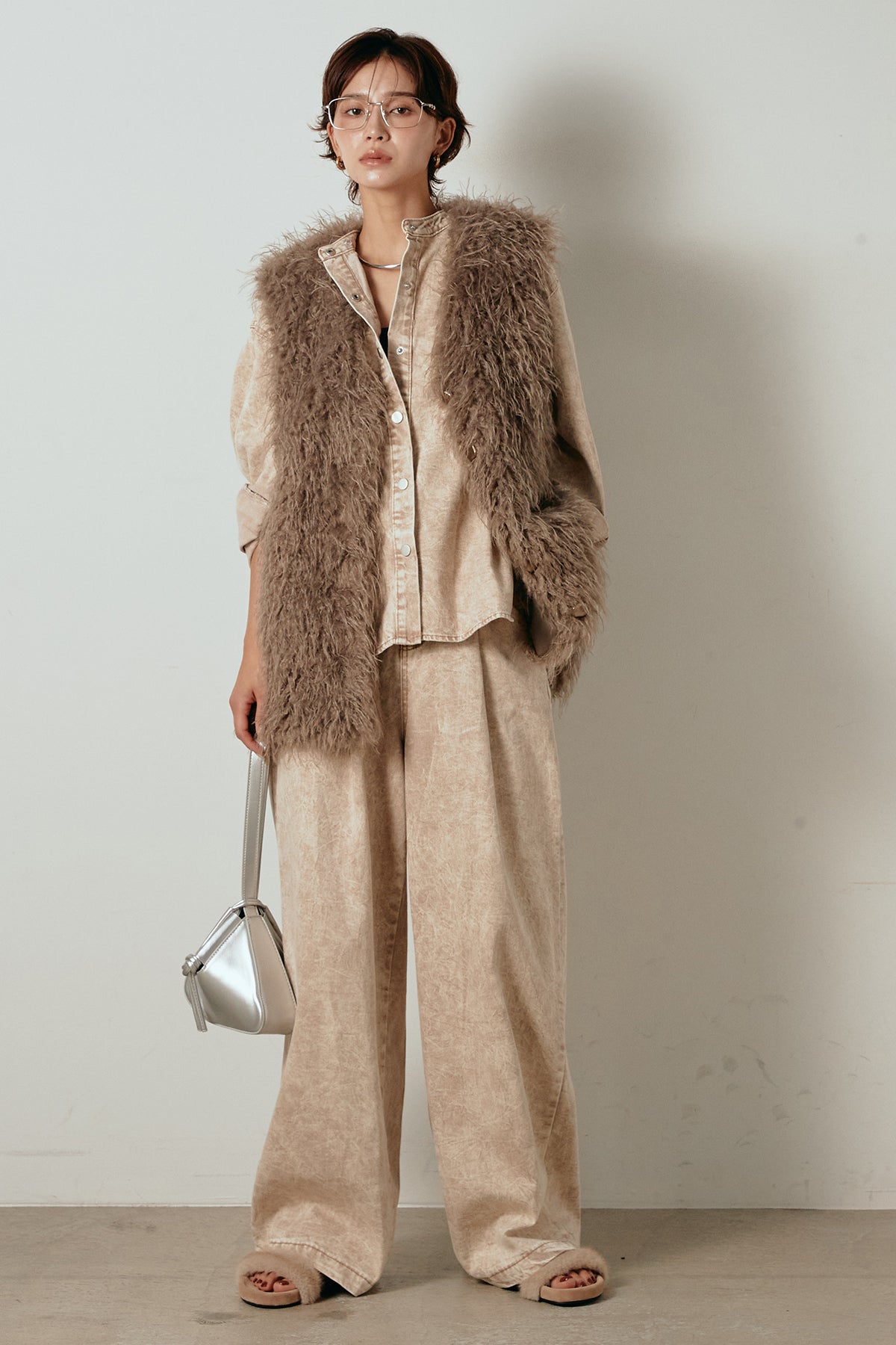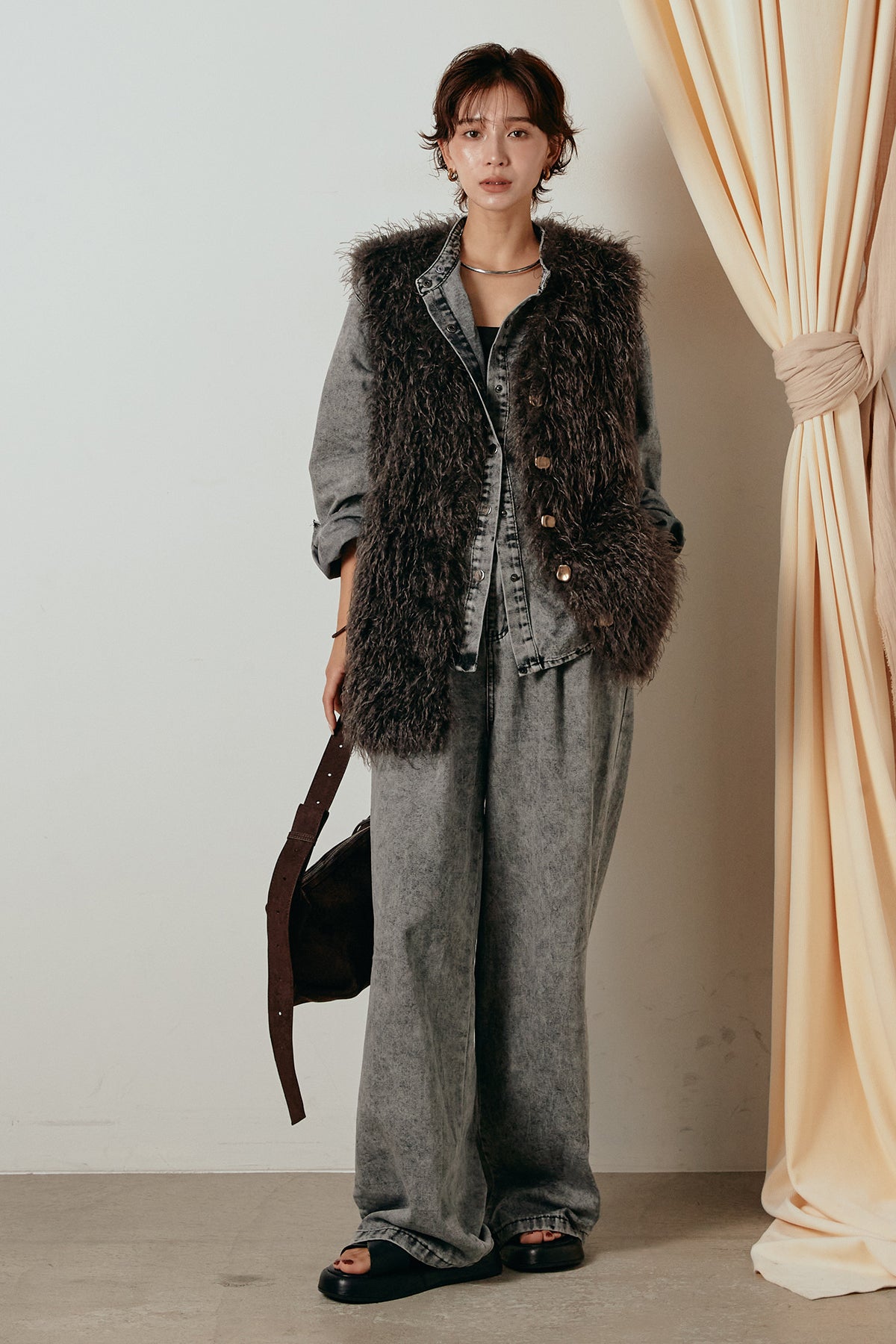 ふんわりとしたシャギーファーがシーズンムードを高めるボタン付きベスト。柔らかな質感と程よいボリュームが存在感を放ち、羽織るだけでスタイリングをアップデート。中はすっきりとした裏地仕様で着心地も快適。ニットやシャツに重ねて、秋冬らしいレイヤードを楽しめる一枚です。