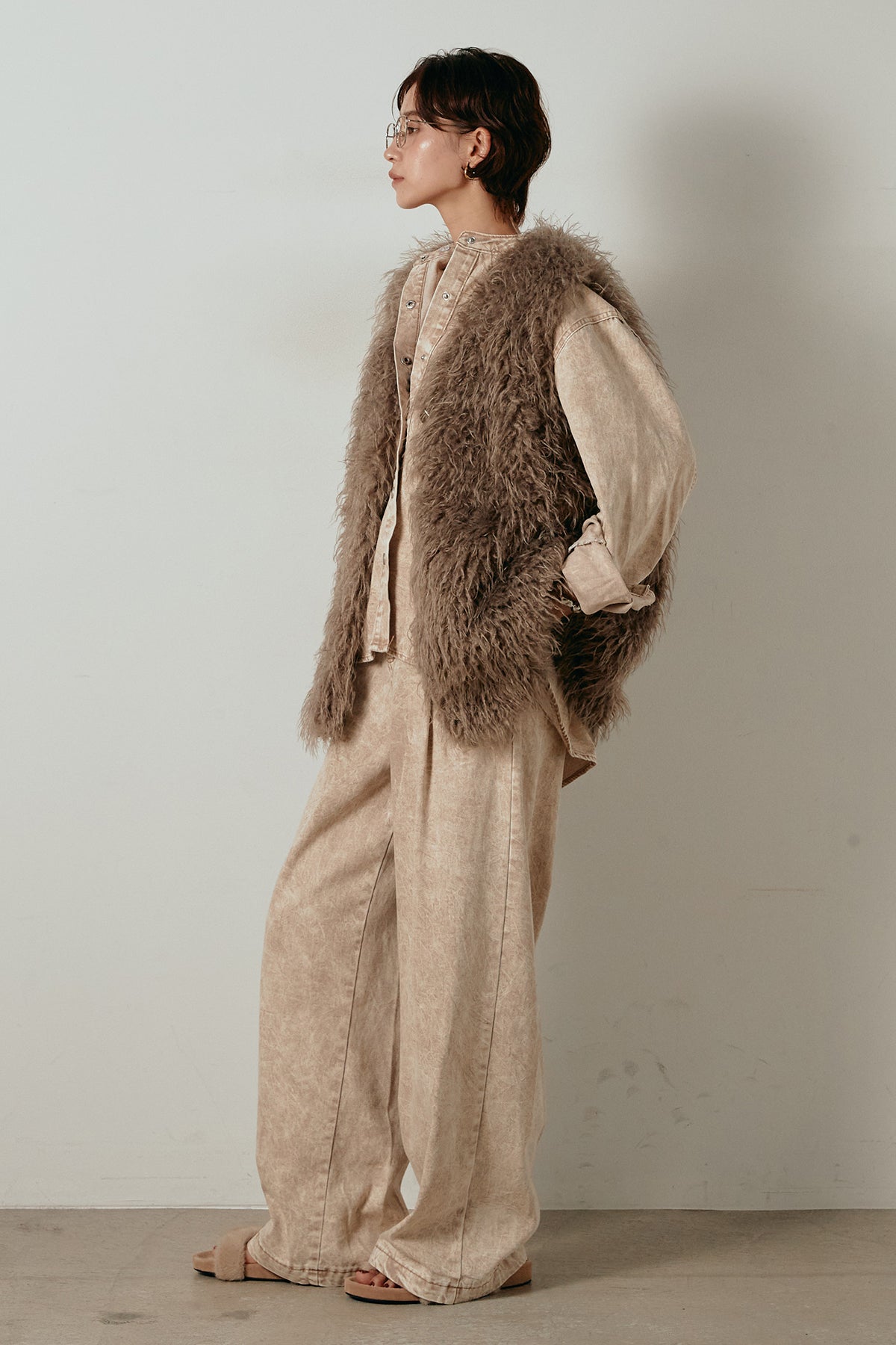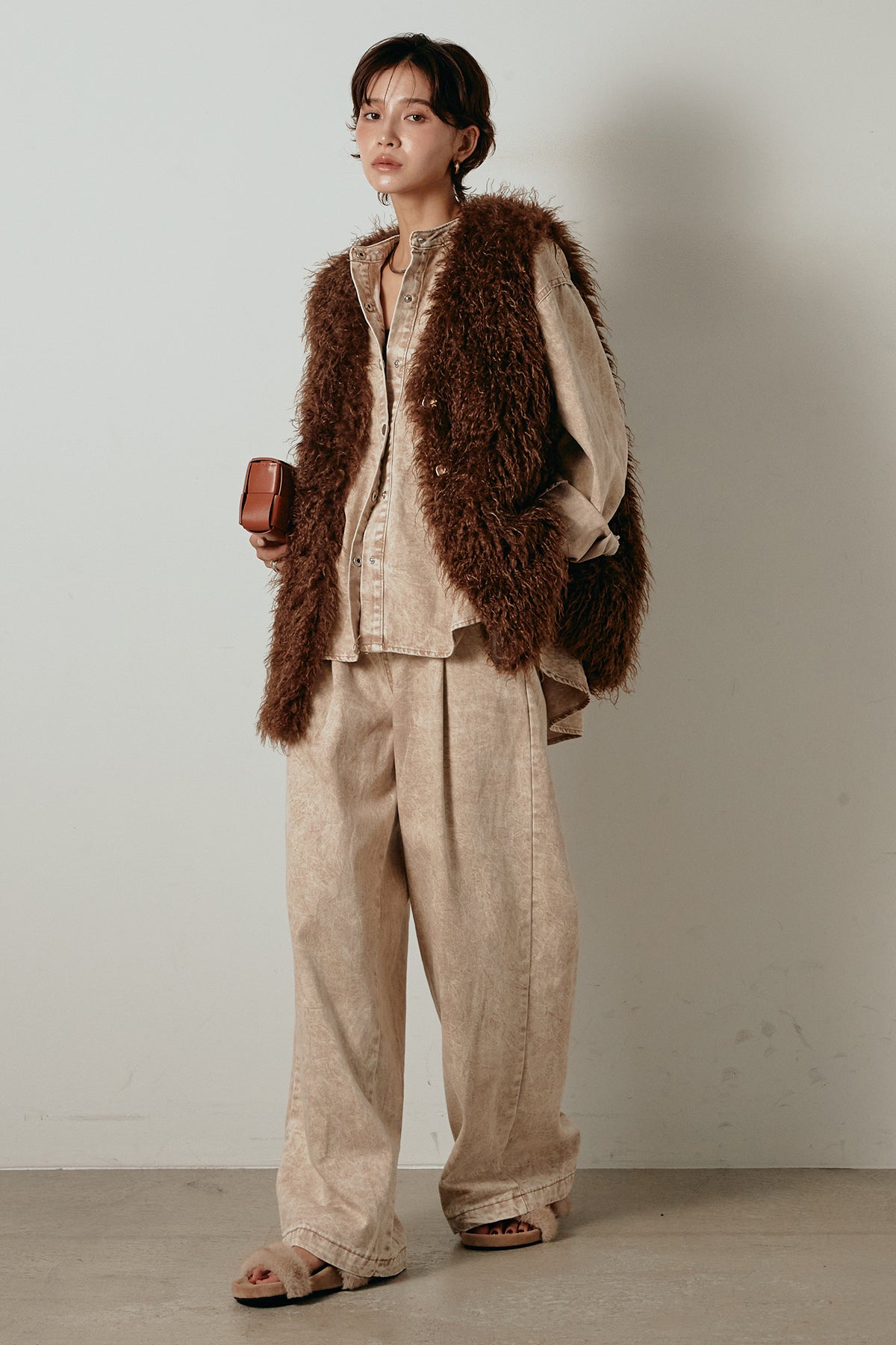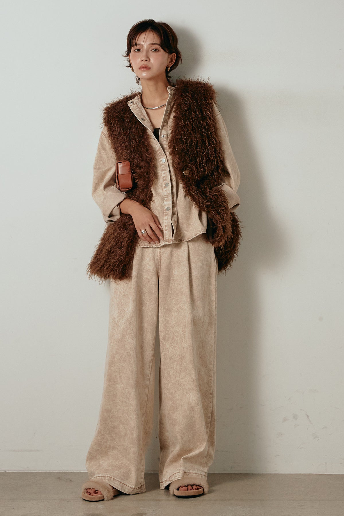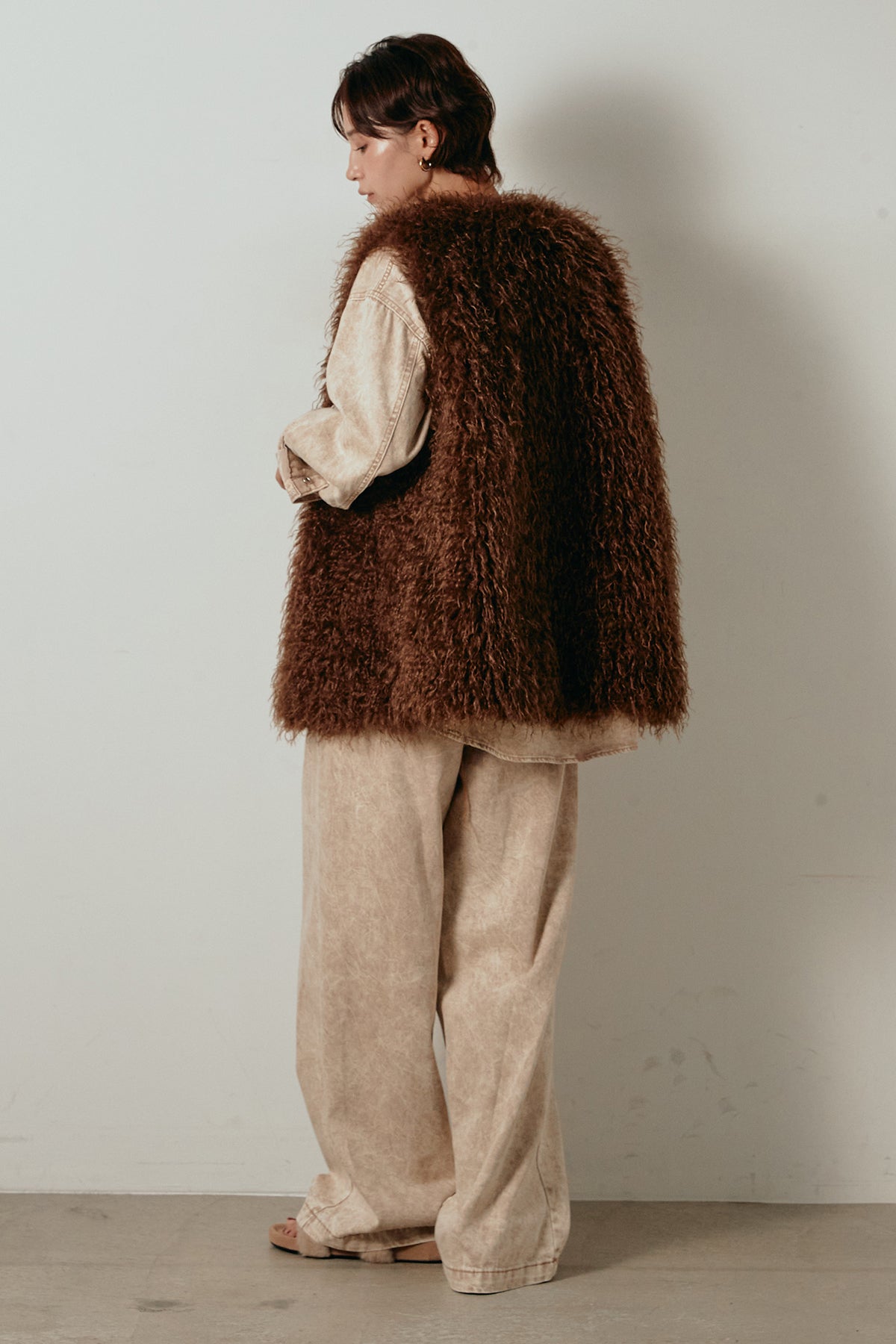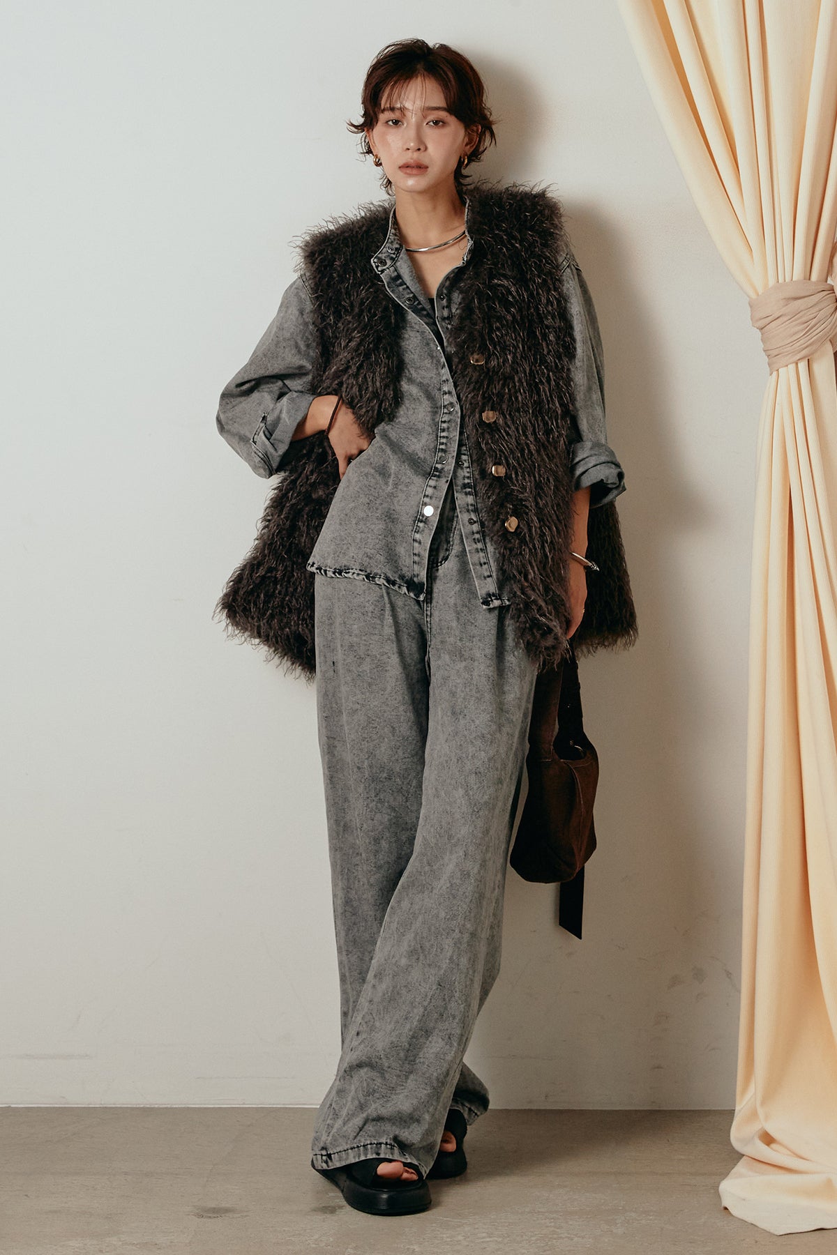 ふんわりとしたシャギーファーがシーズンムードを高めるボタン付きベスト。柔らかな質感と程よいボリュームが存在感を放ち、羽織るだけでスタイリングをアップデート。中はすっきりとした裏地仕様で着心地も快適。ニットやシャツに重ねて、秋冬らしいレイヤードを楽しめる一枚です。