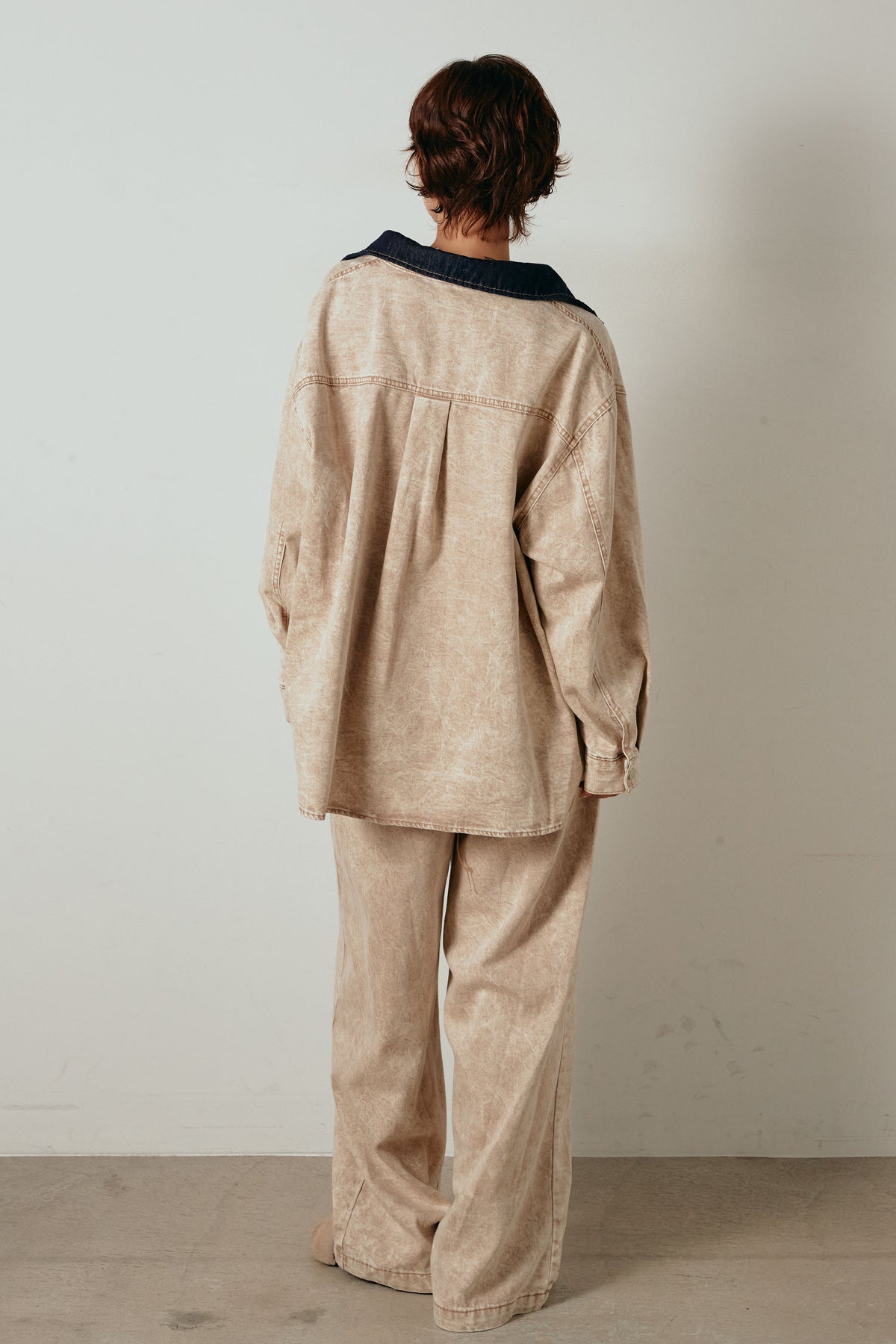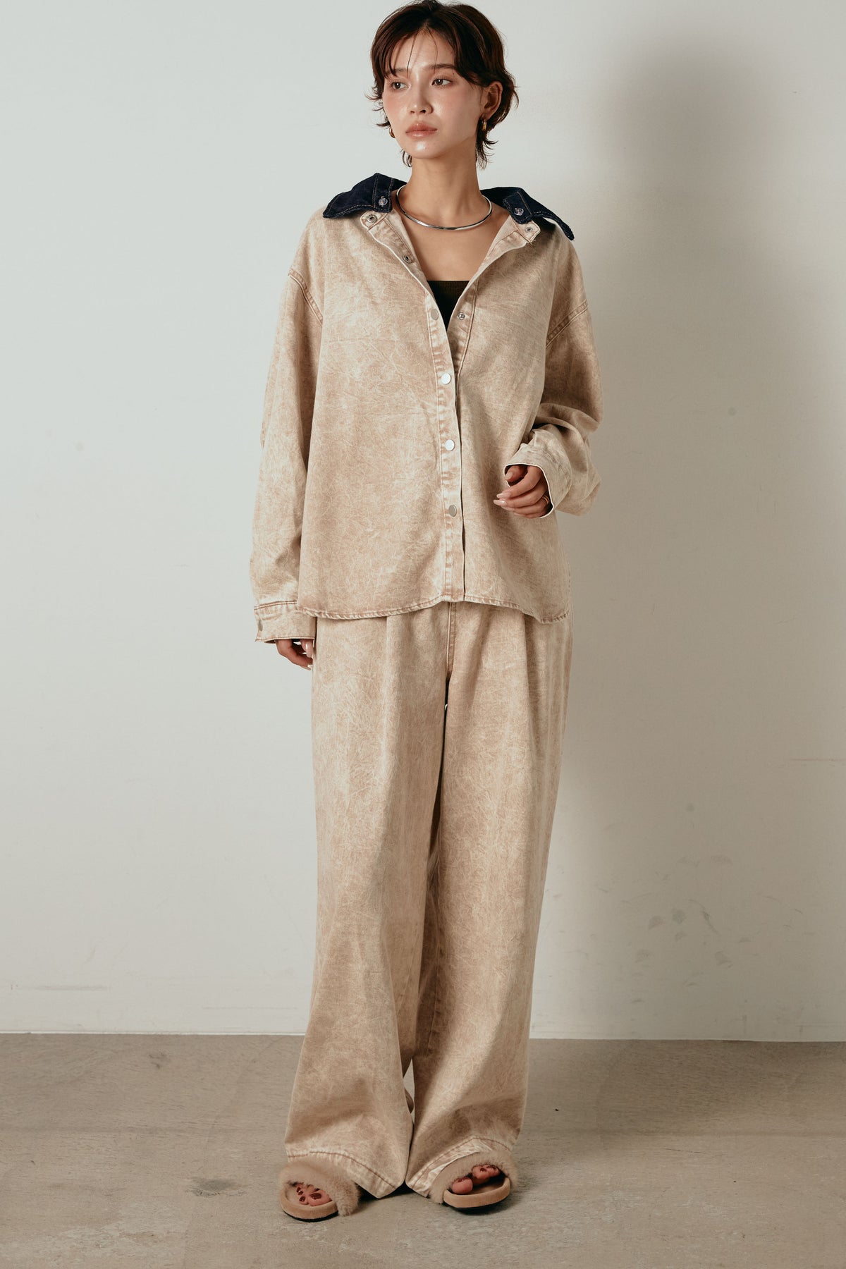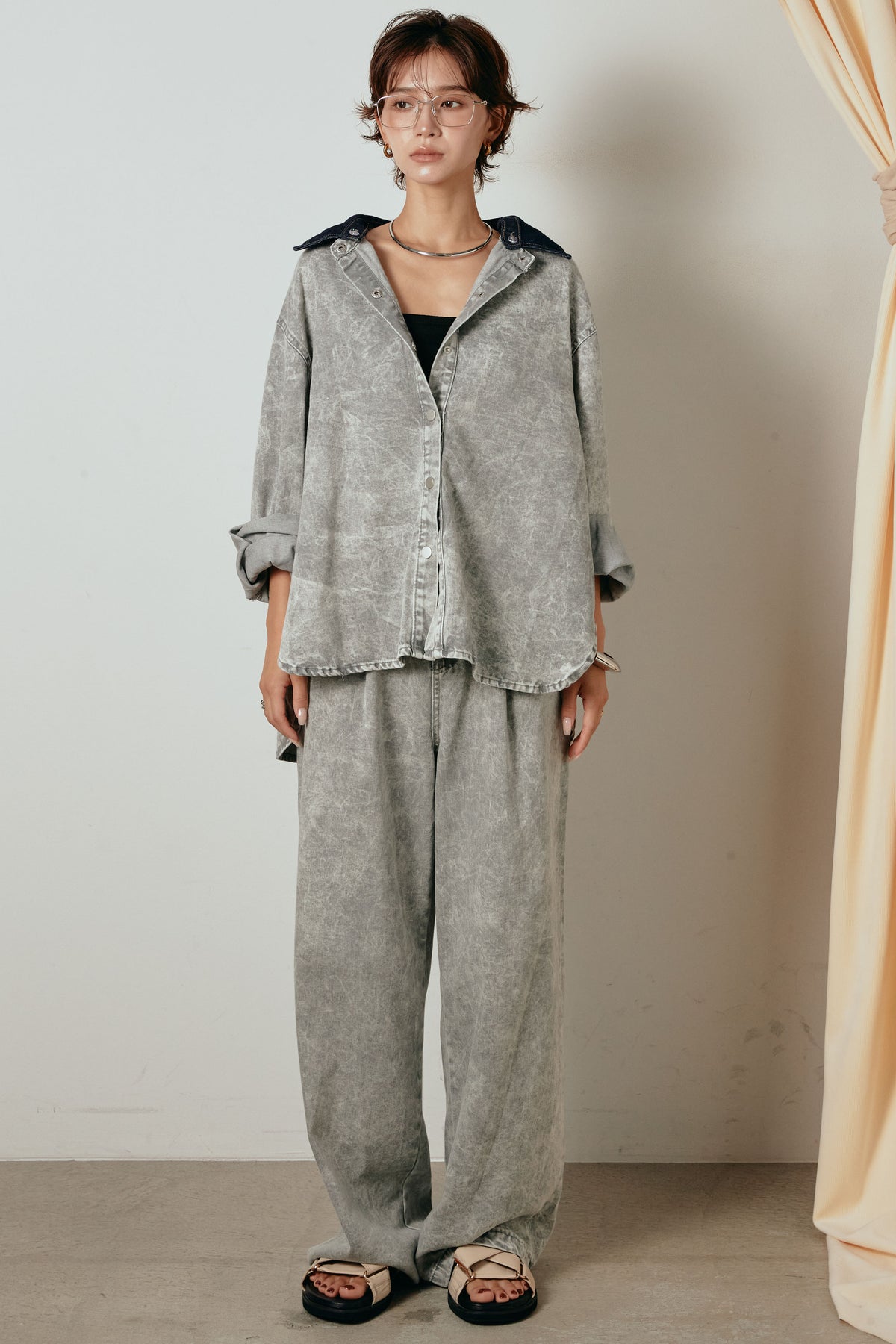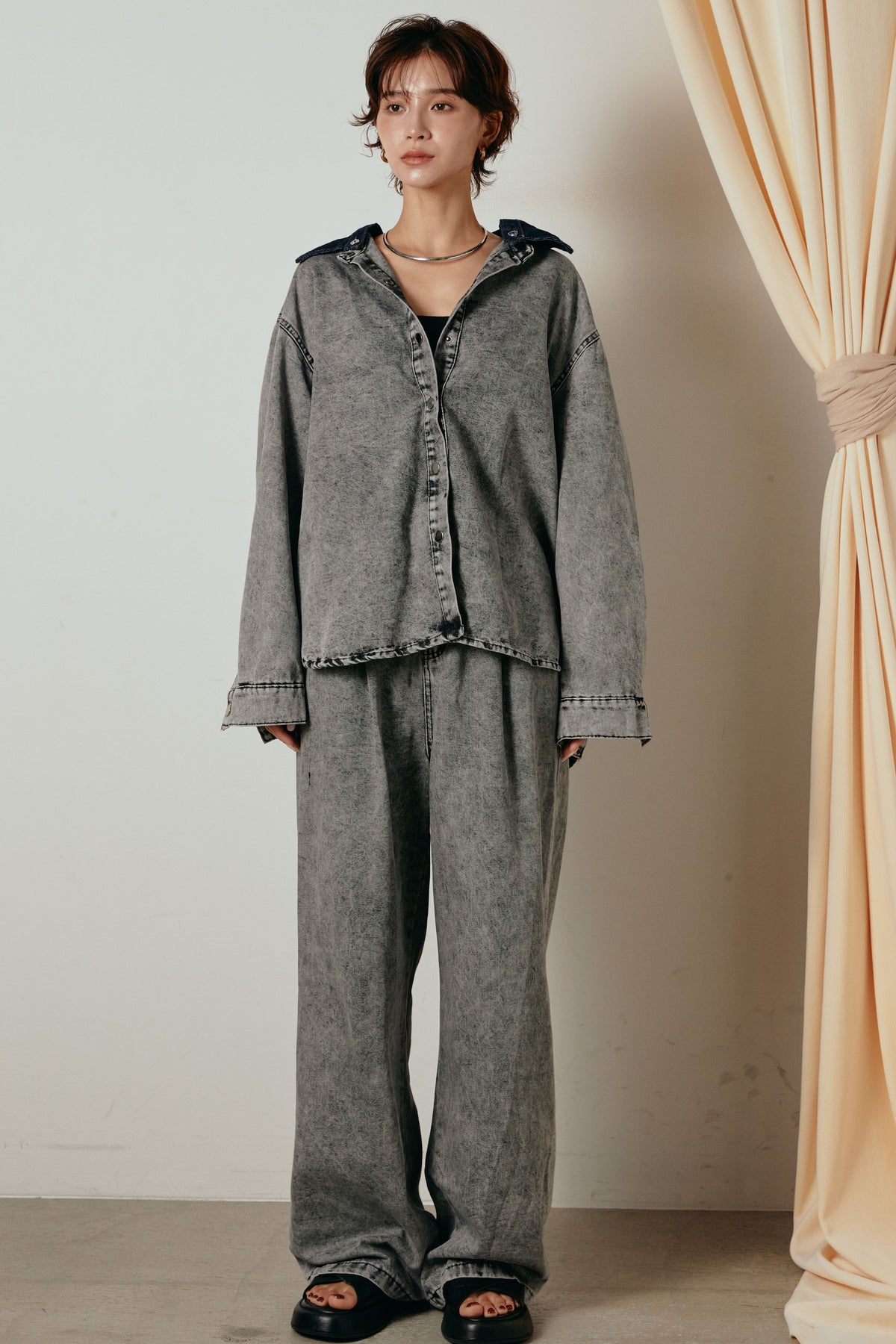 ヴィンテージライクな風合いが魅力のデニムセットアップ。洗いをかけた柔らかな素材感で、ラフさの中にこなれた雰囲気を演出します。ジャケットは程よくゆとりのあるシルエットで羽織りやすく、パンツはウエストコード仕様で快適な履き心地。単品使いもできる汎用性の高いアイテムで、カジュアルながらも洗練されたスタイルを楽しめます。