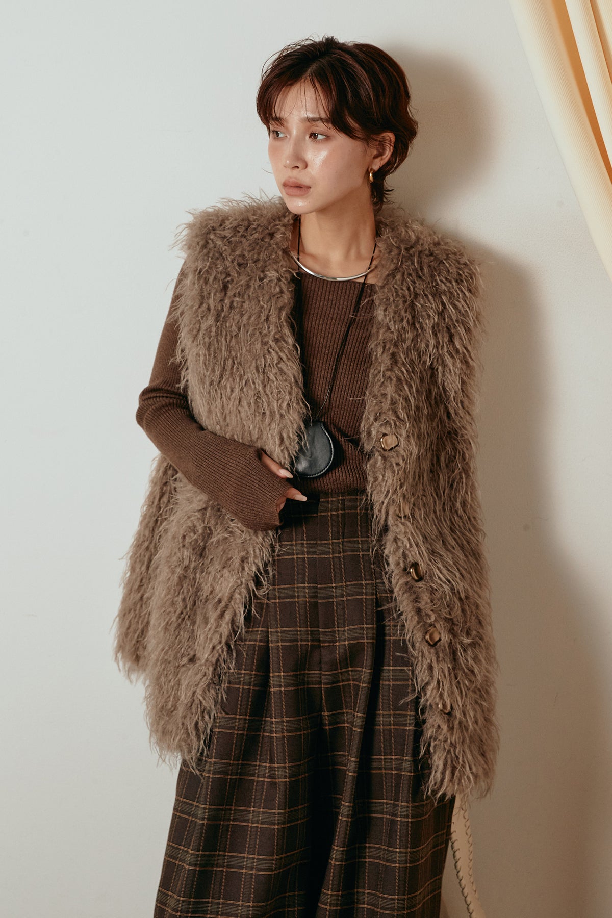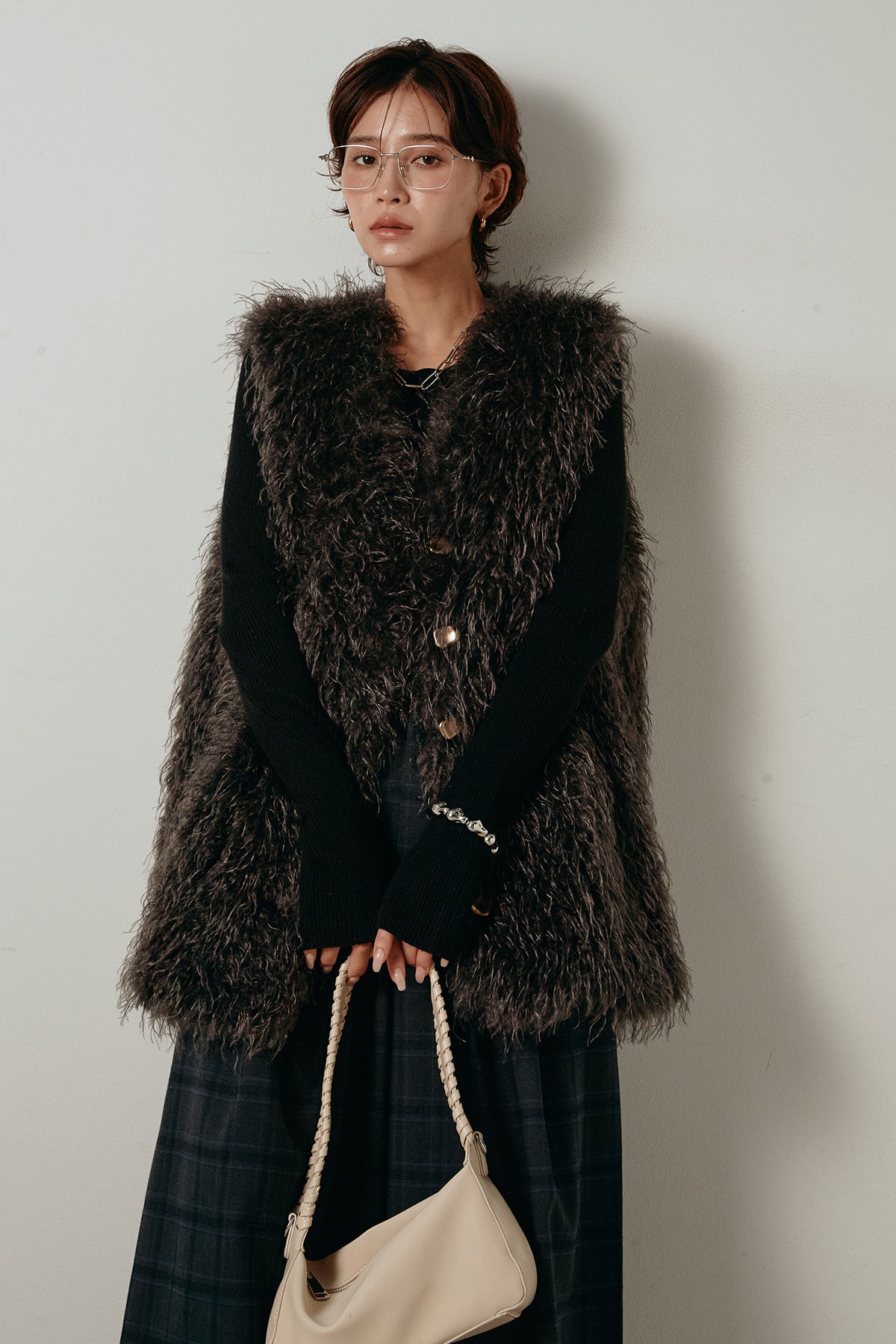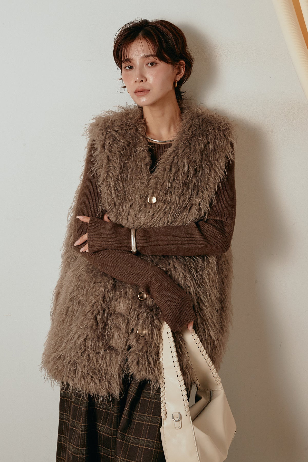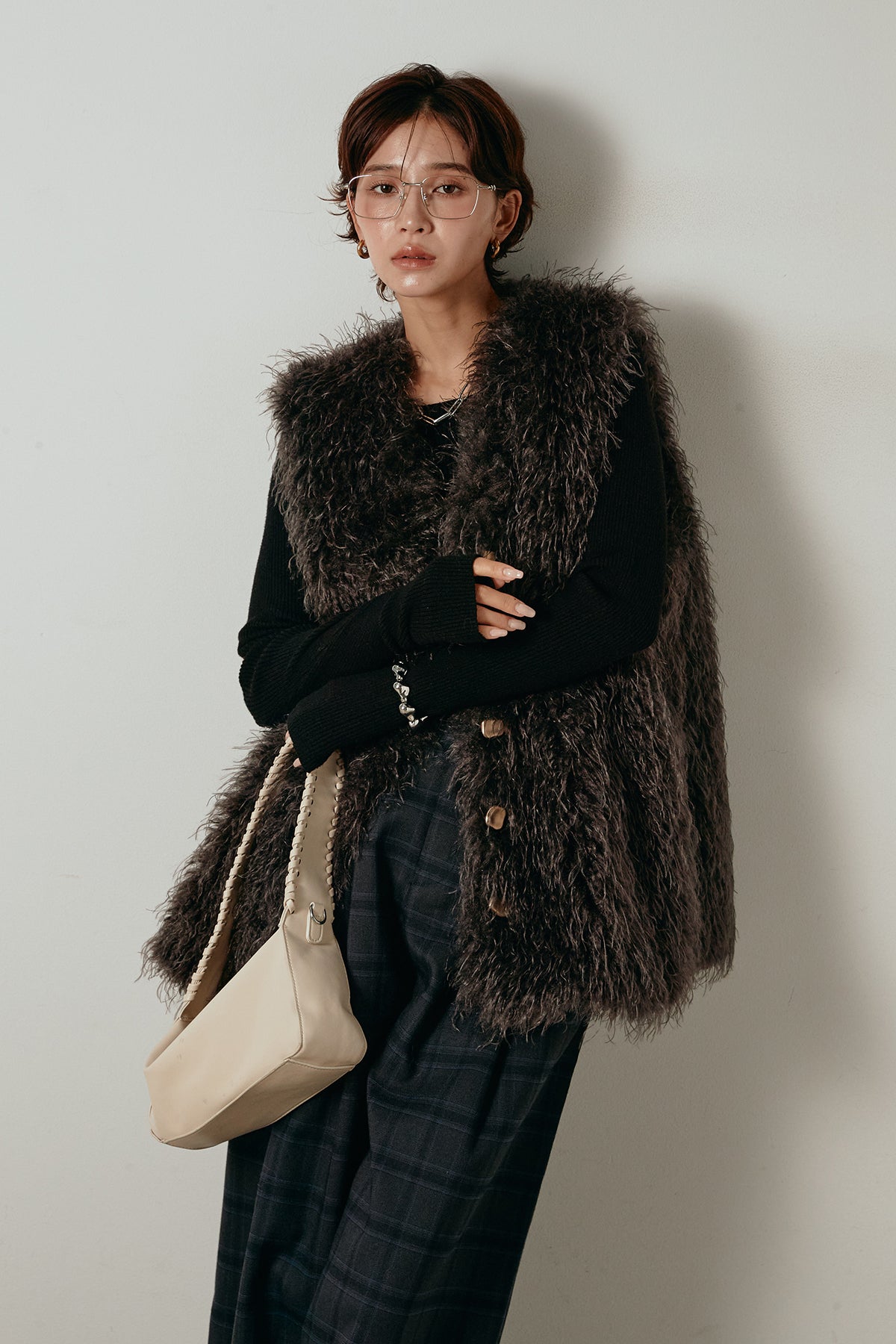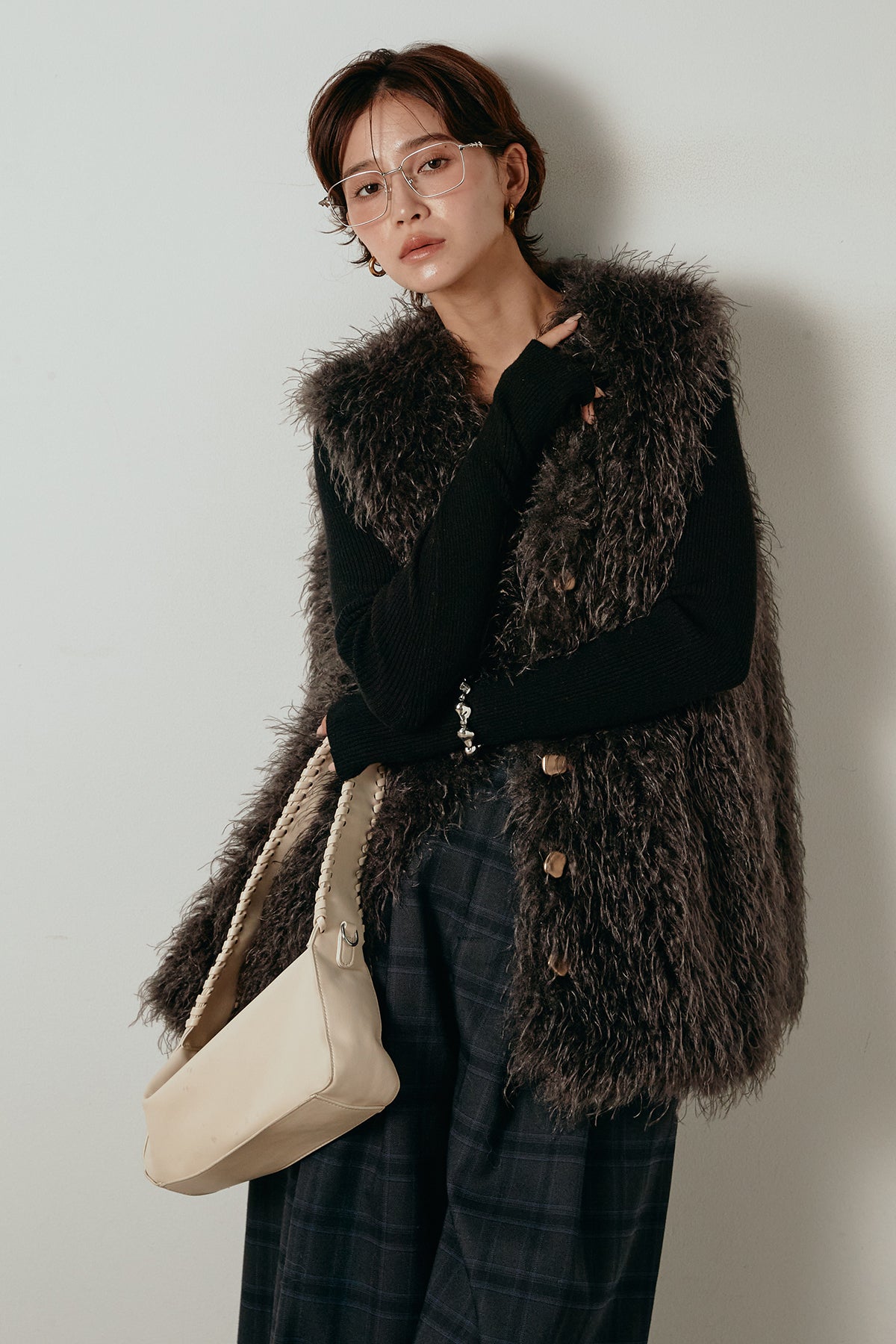 ふんわりとしたシャギーファーがシーズンムードを高めるボタン付きベスト。柔らかな質感と程よいボリュームが存在感を放ち、羽織るだけでスタイリングをアップデート。中はすっきりとした裏地仕様で着心地も快適。ニットやシャツに重ねて、秋冬らしいレイヤードを楽しめる一枚です。